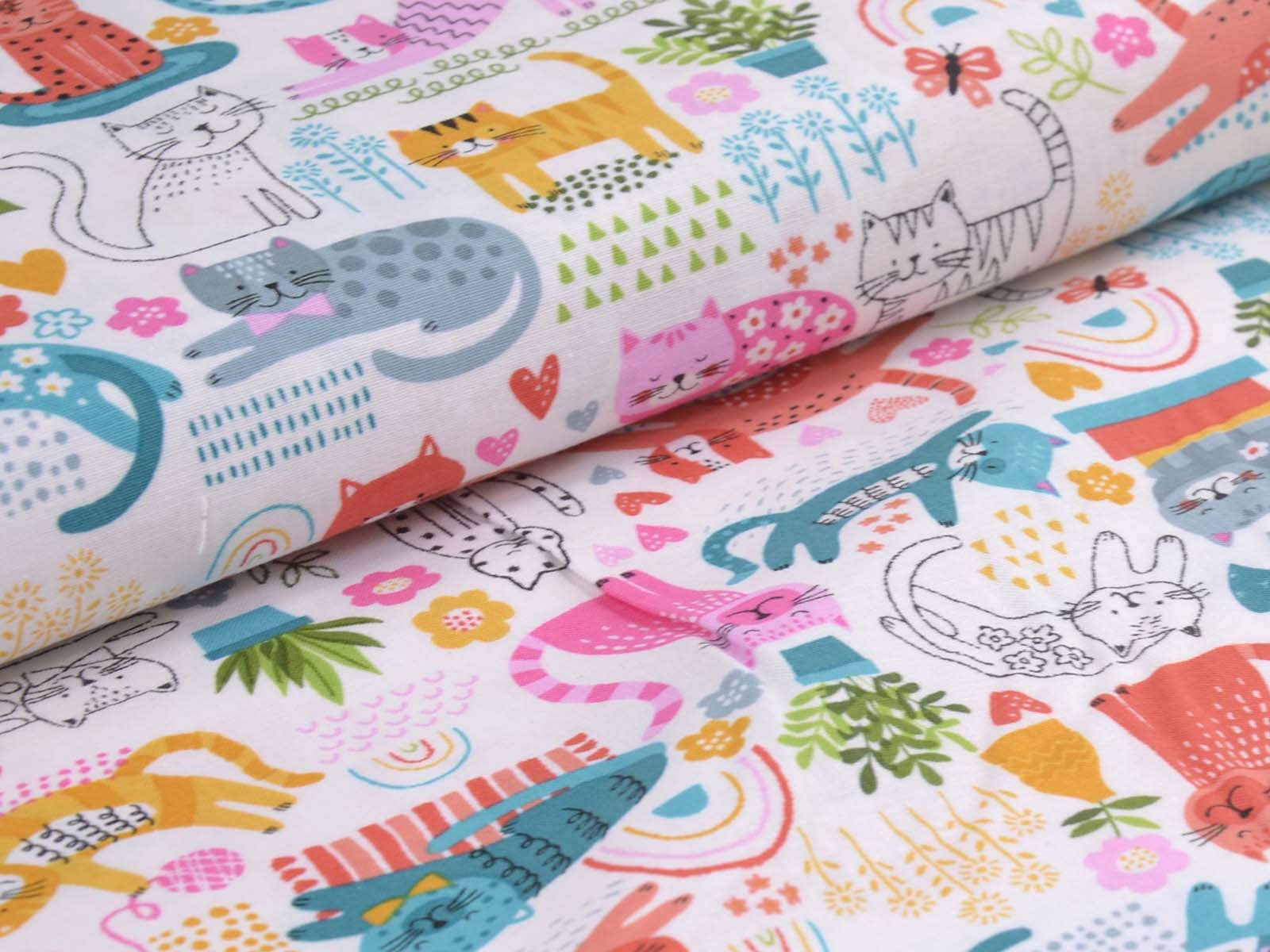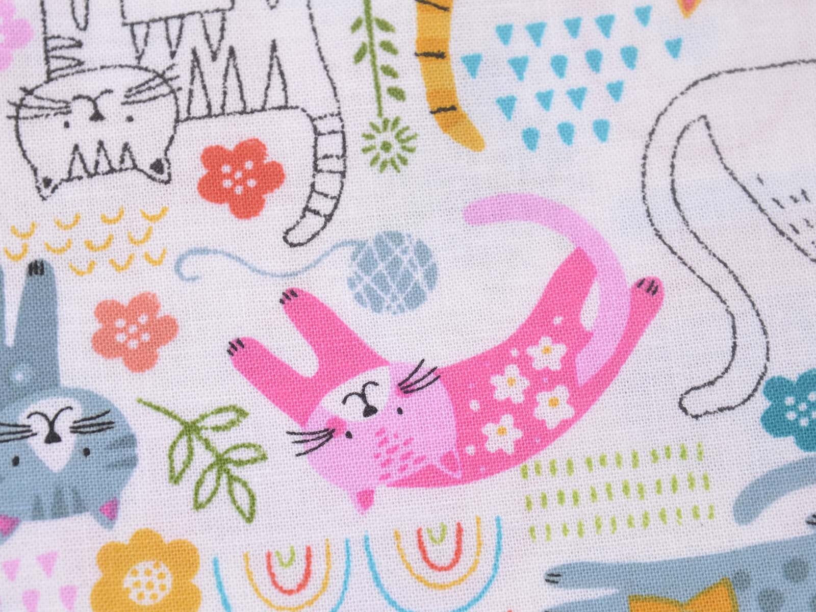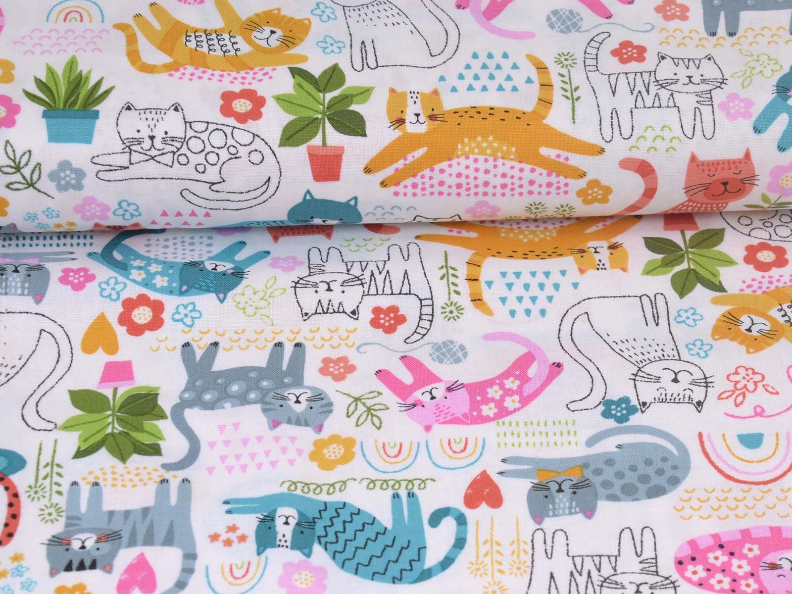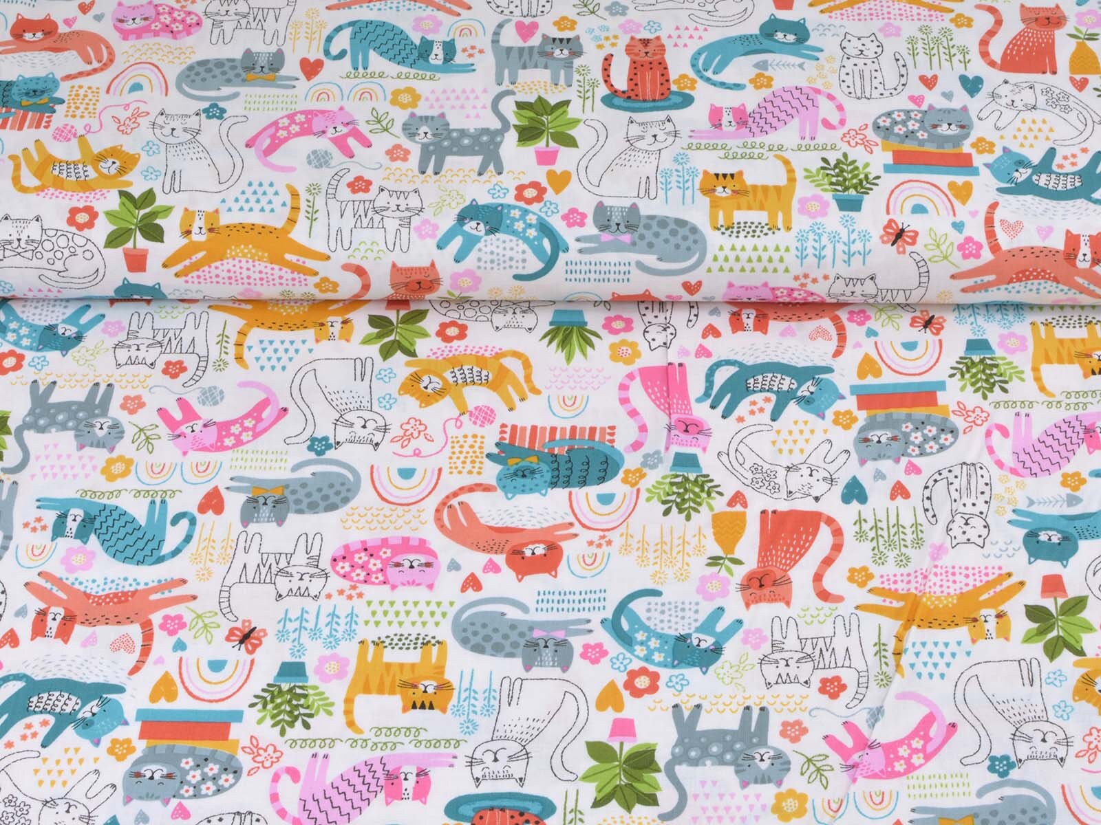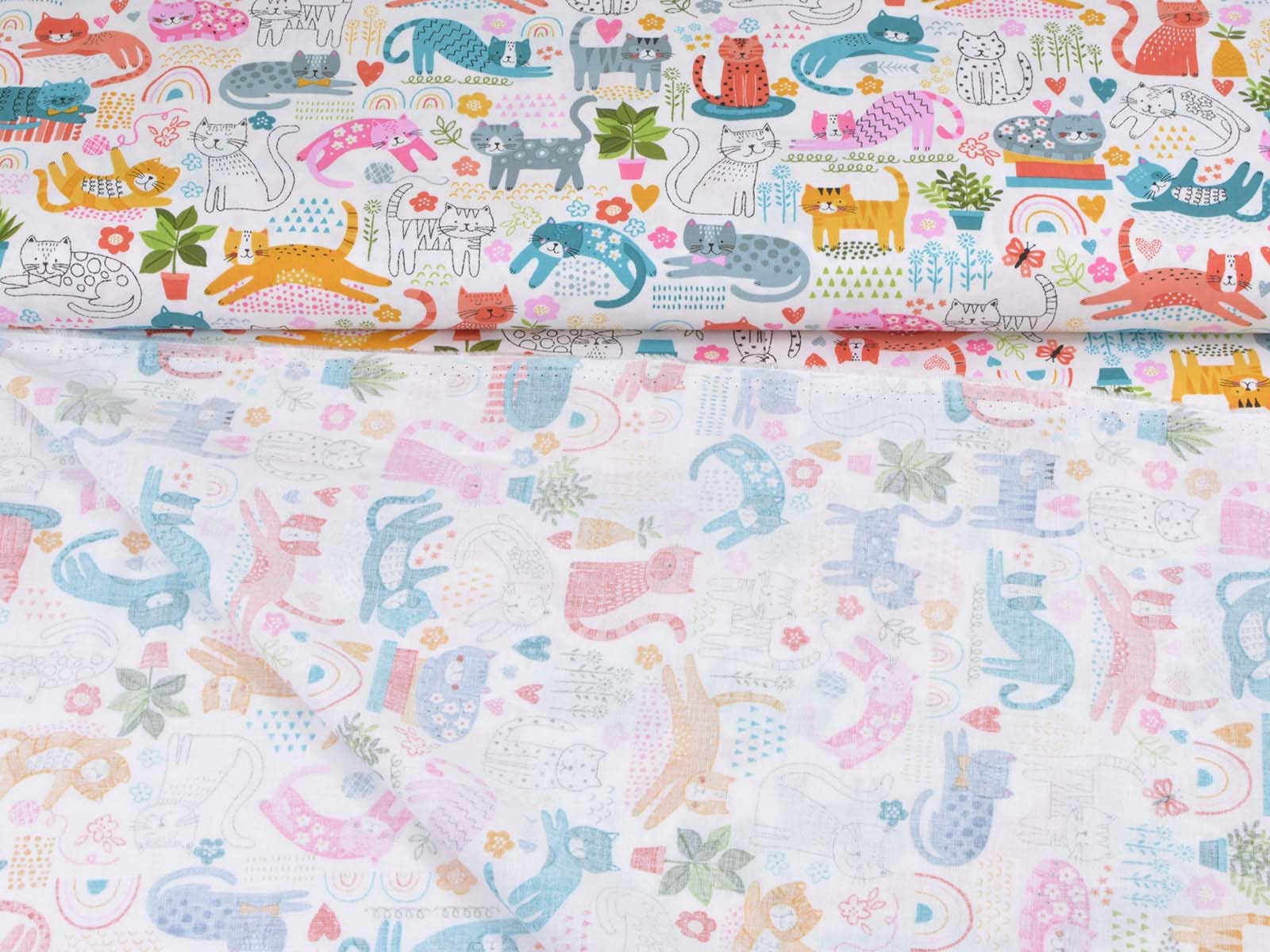 Webware aus Baumwolle von Makower mit spielenden und liegenden Katzen in blau, gelb und rosa. Der Stoff fühlt sich glatt an. Er eignet sich wunderbar zum Nähen von Taschen, Kissen und zum Patchworken.