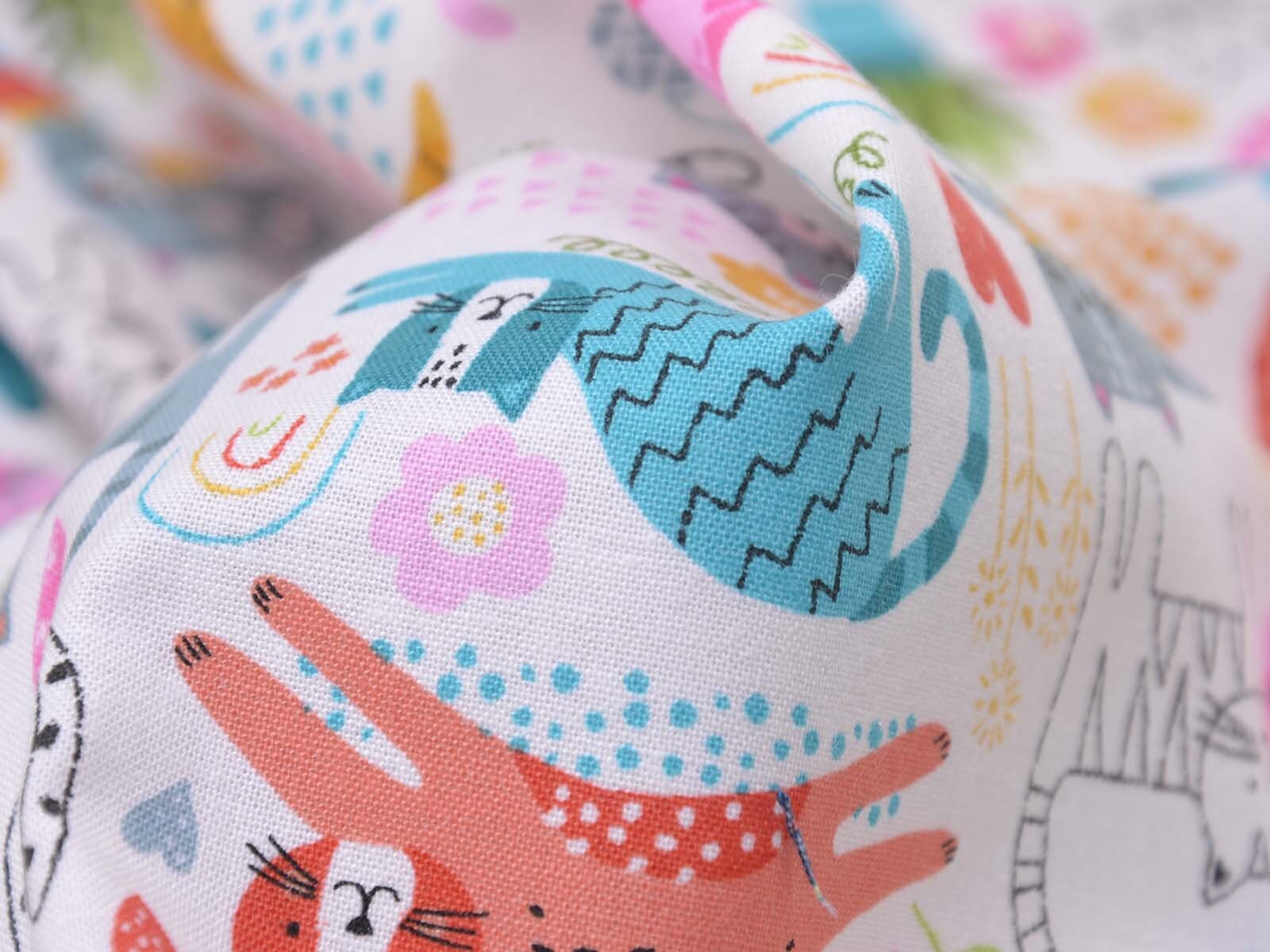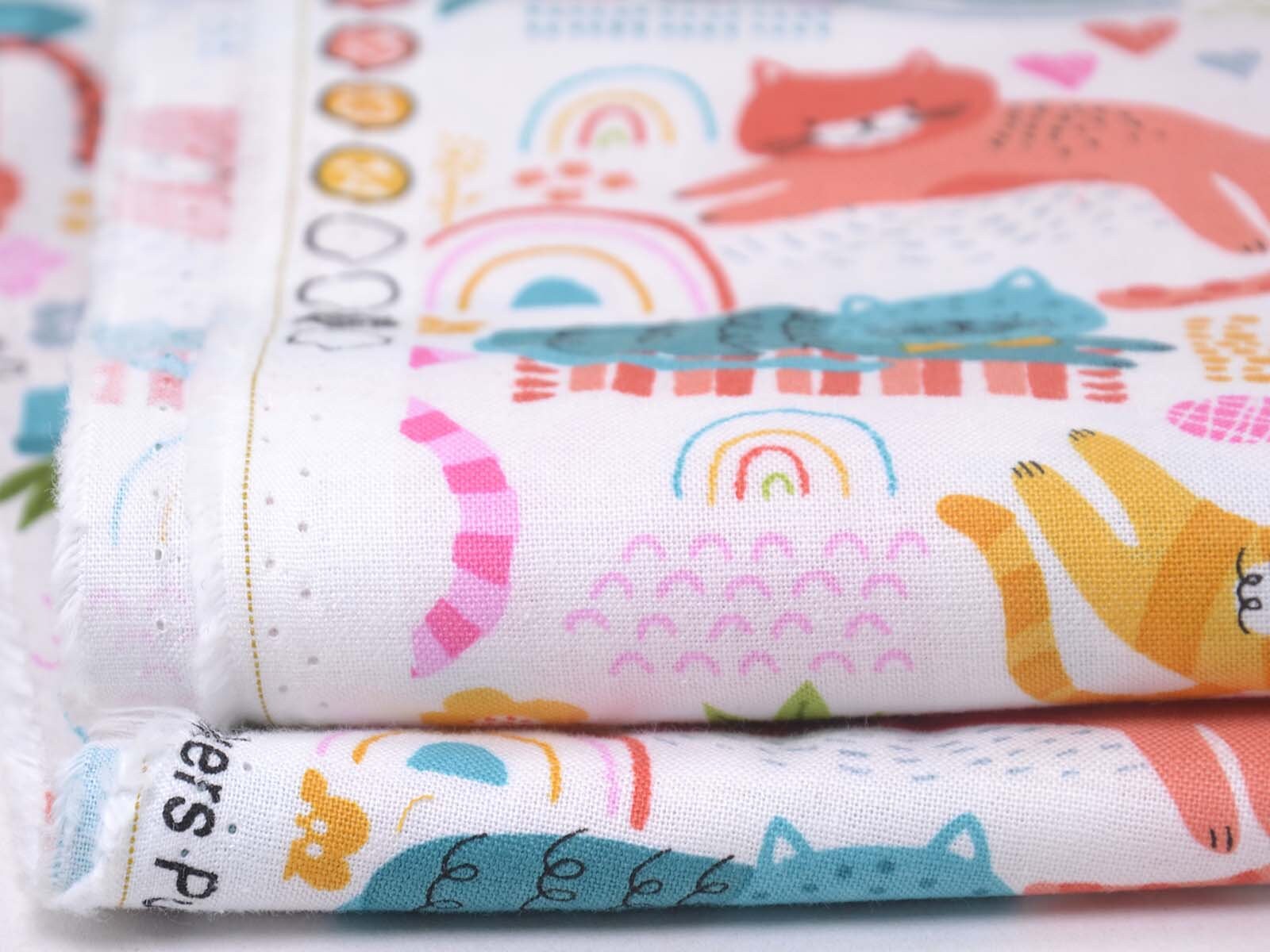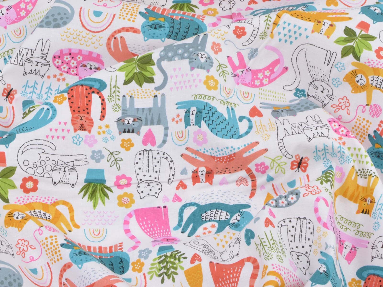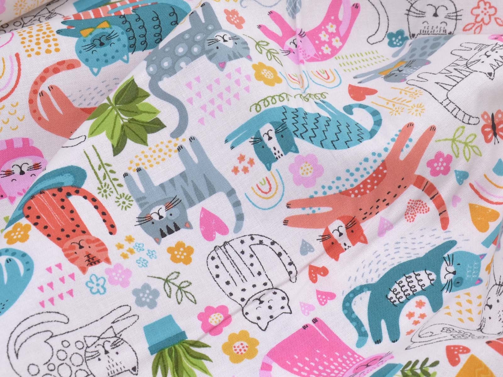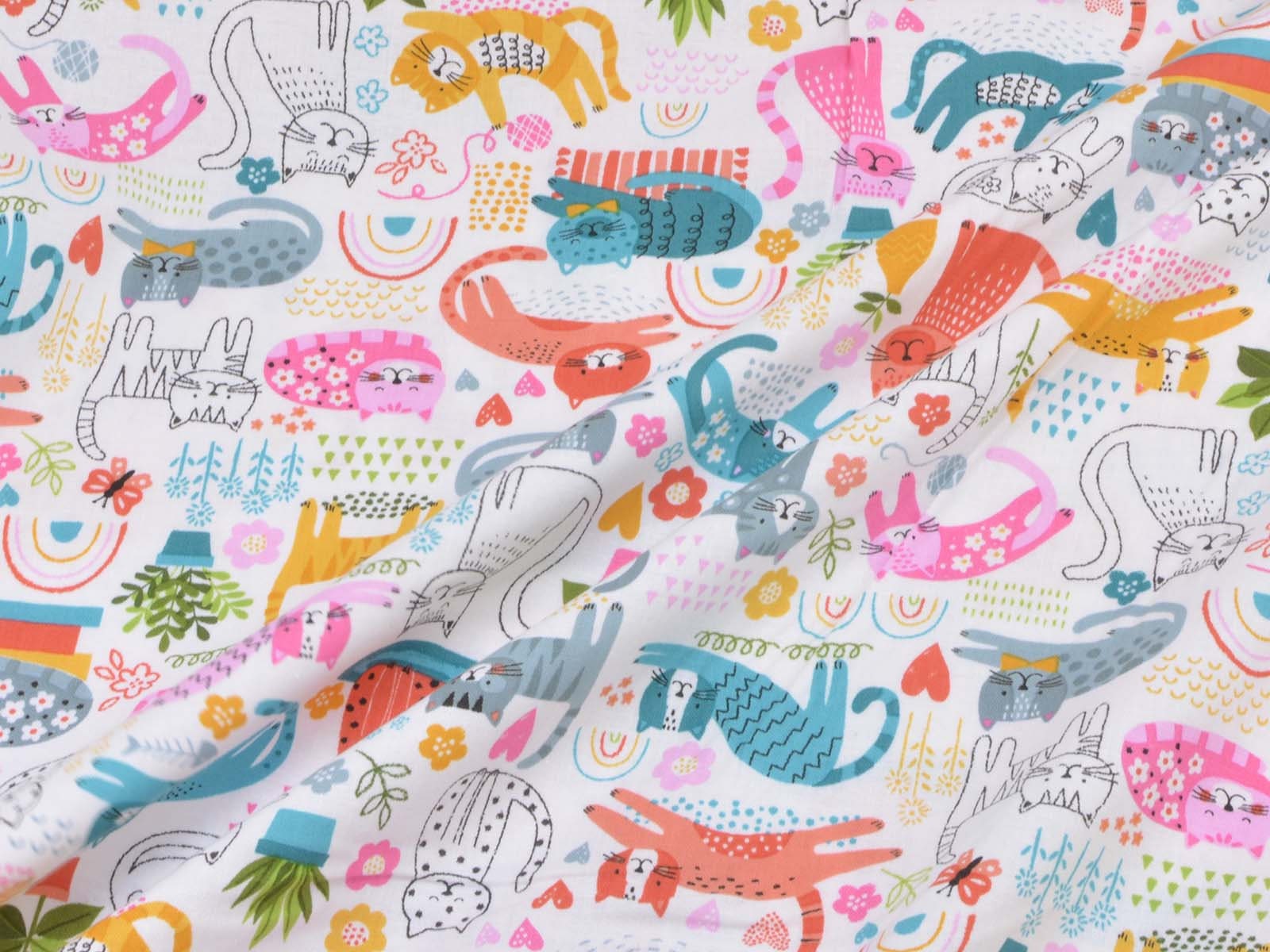 Webware aus Baumwolle von Makower mit spielenden und liegenden Katzen in blau, gelb und rosa. Der Stoff fühlt sich glatt an. Er eignet sich wunderbar zum Nähen von Taschen, Kissen und zum Patchworken.