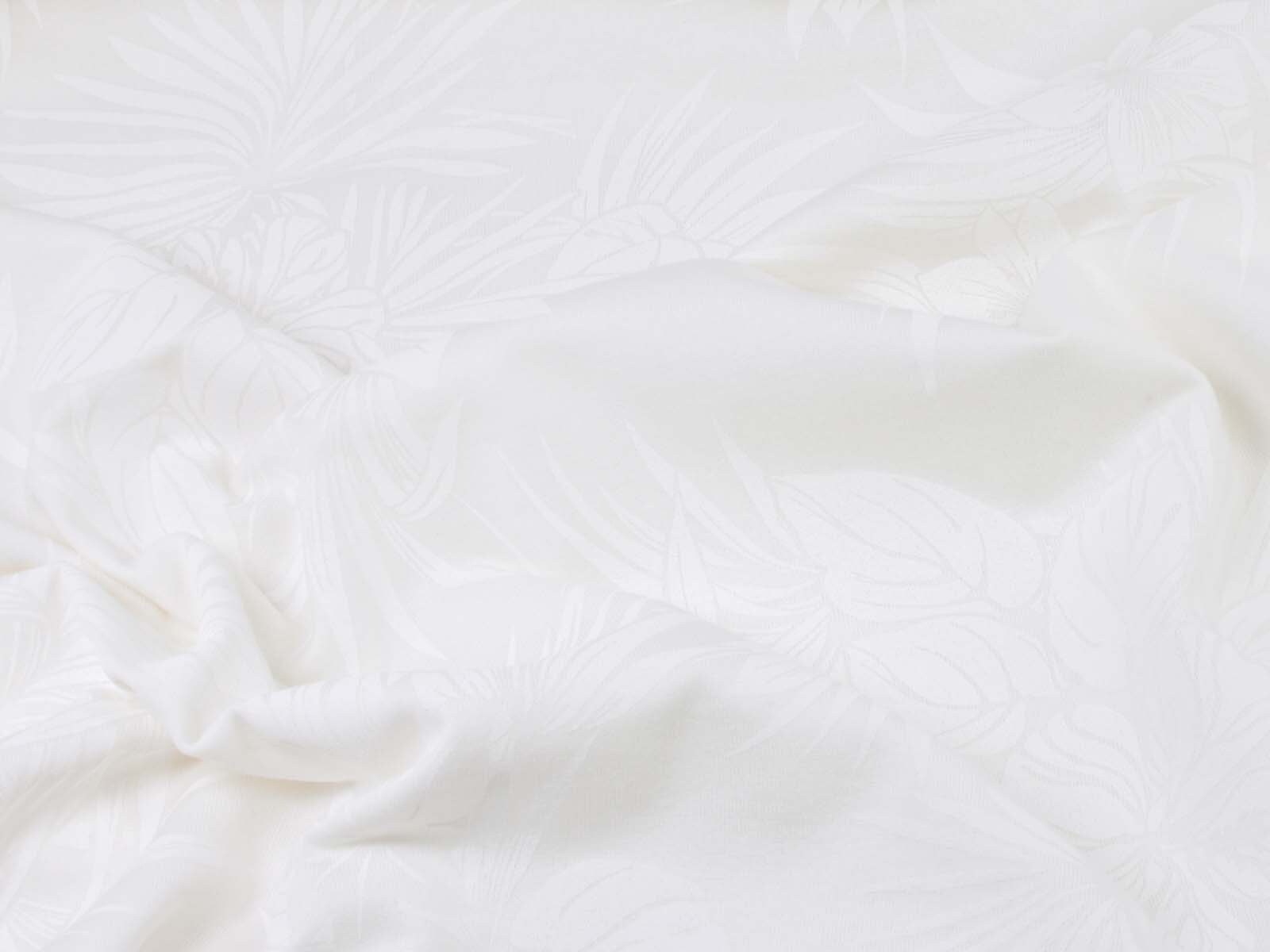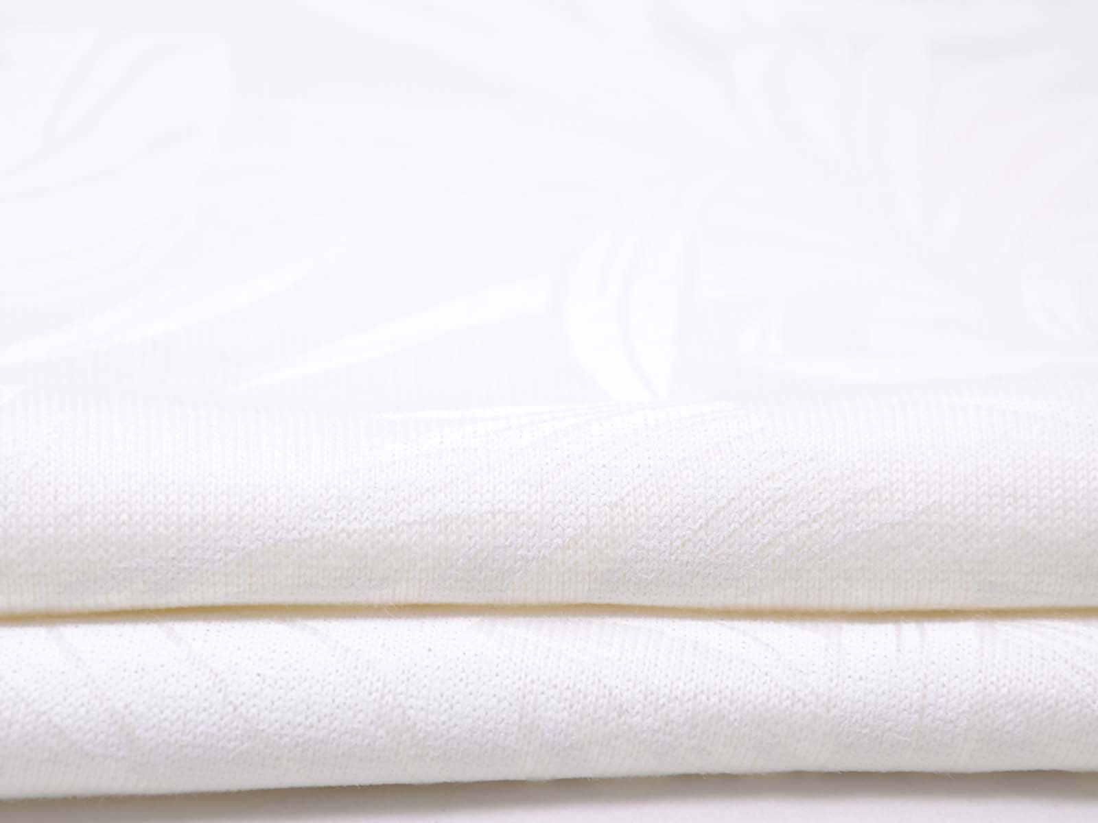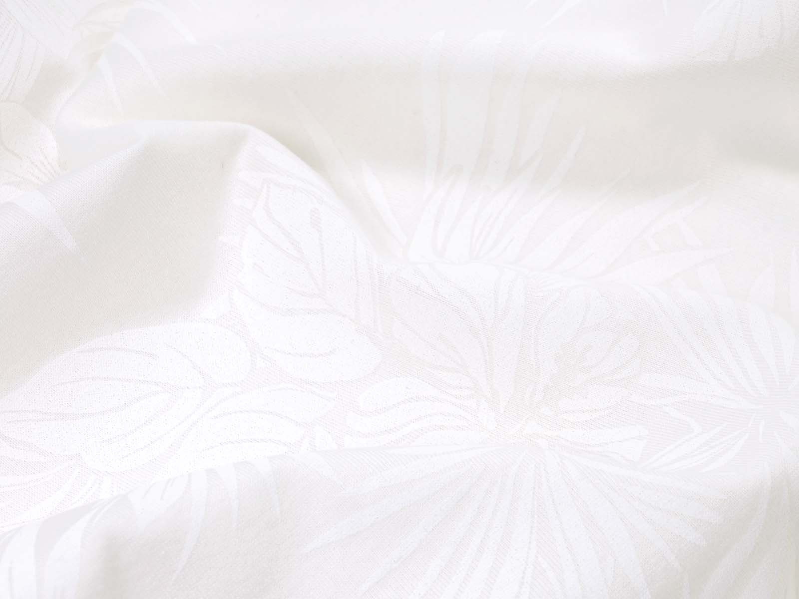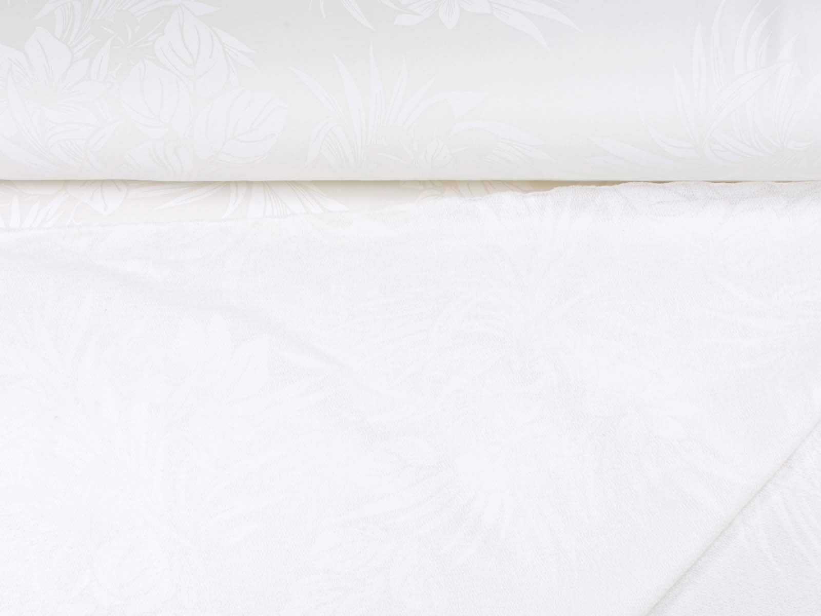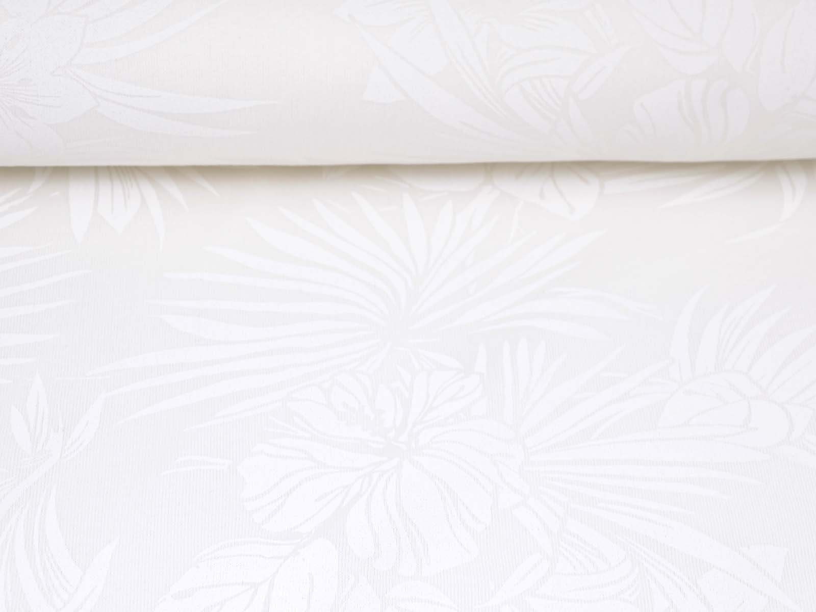 Sweat aus Baumwolle mit weißen Blumen und Blättern made in Italy. Der Stoff ist creme-weiß mit Blumen und Blättern in der gleichen Farbe. Die line Stoffseite zeigt Schlingen. Der Sommersweat ist mittelschwer und eignet sich zum Nähen von Pullovern, Hoodies, Sweatkleidern und vielem mehr.