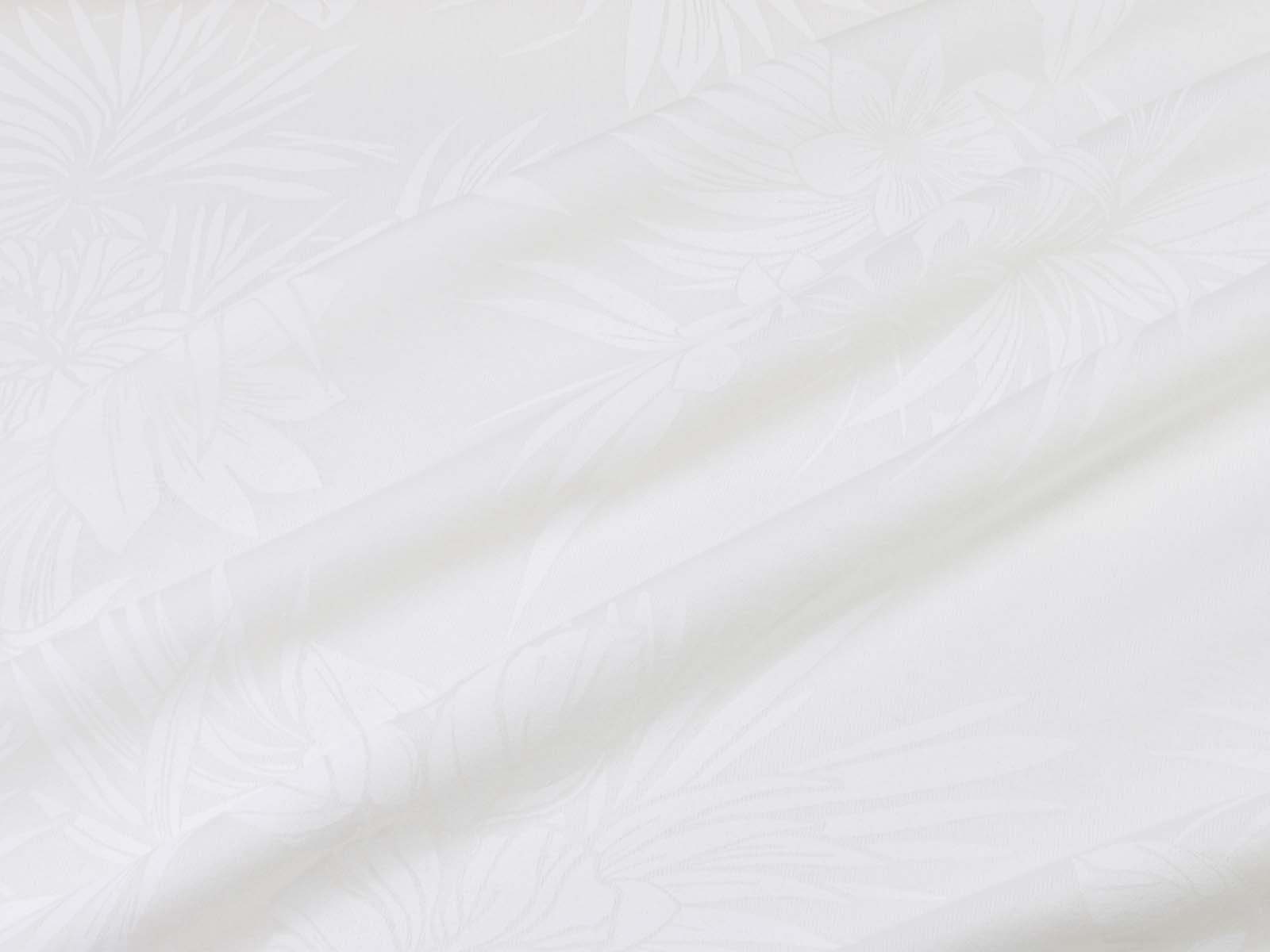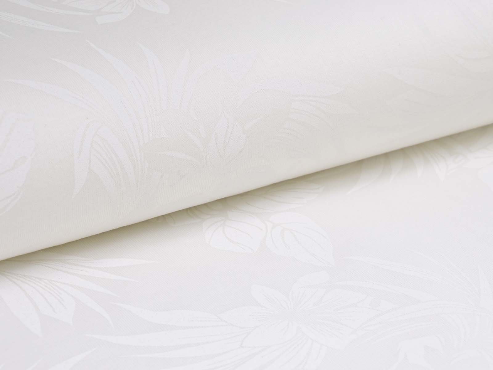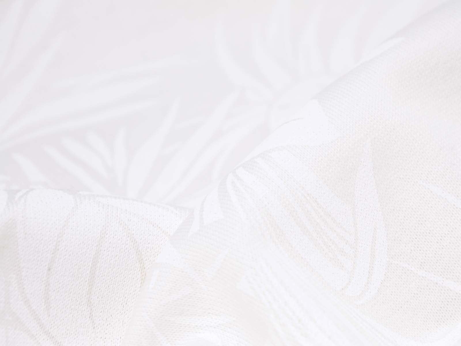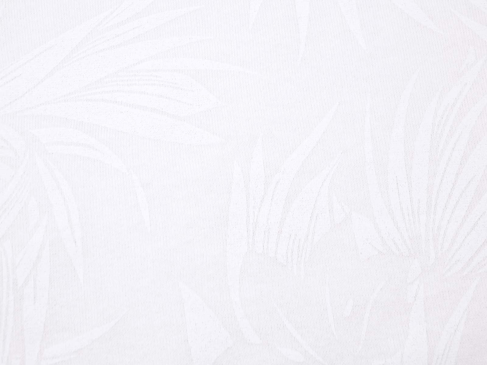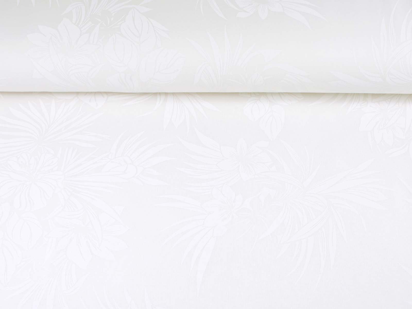 Sweat aus Baumwolle mit weißen Blumen und Blättern made in Italy. Der Stoff ist creme-weiß mit Blumen und Blättern in der gleichen Farbe. Die line Stoffseite zeigt Schlingen. Der Sommersweat ist mittelschwer und eignet sich zum Nähen von Pullovern, Hoodies, Sweatkleidern und vielem mehr.
