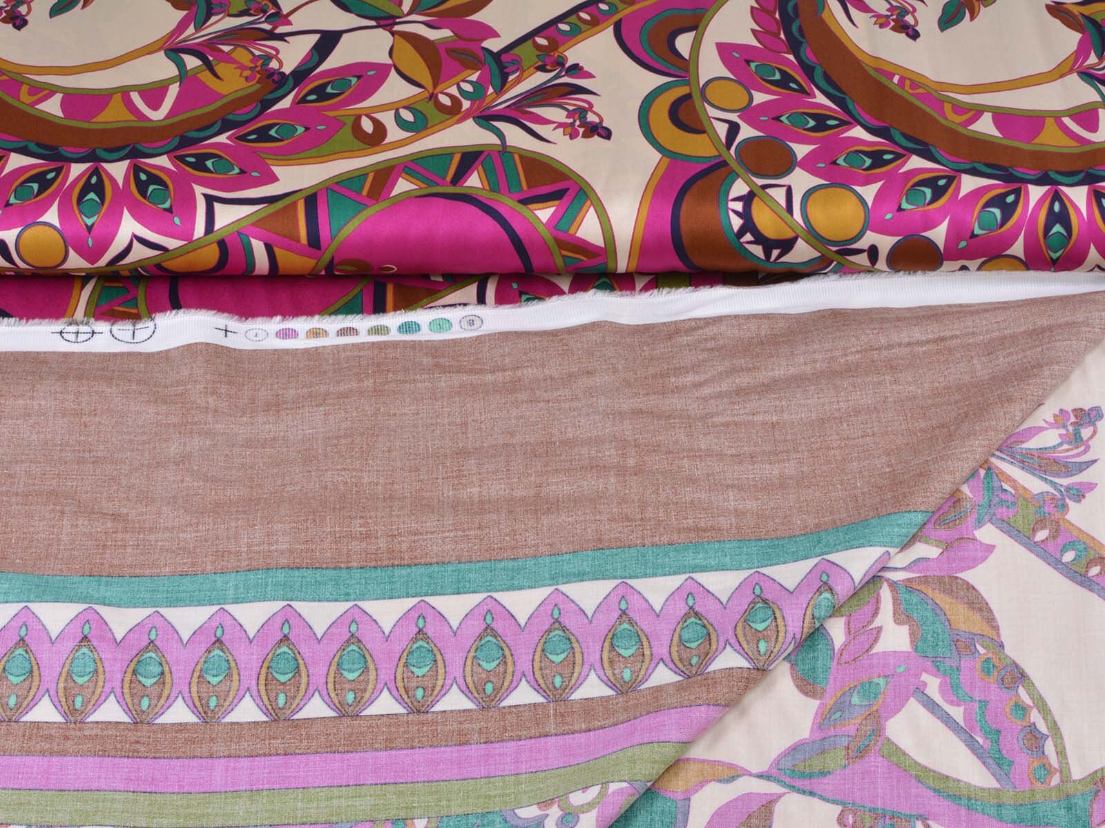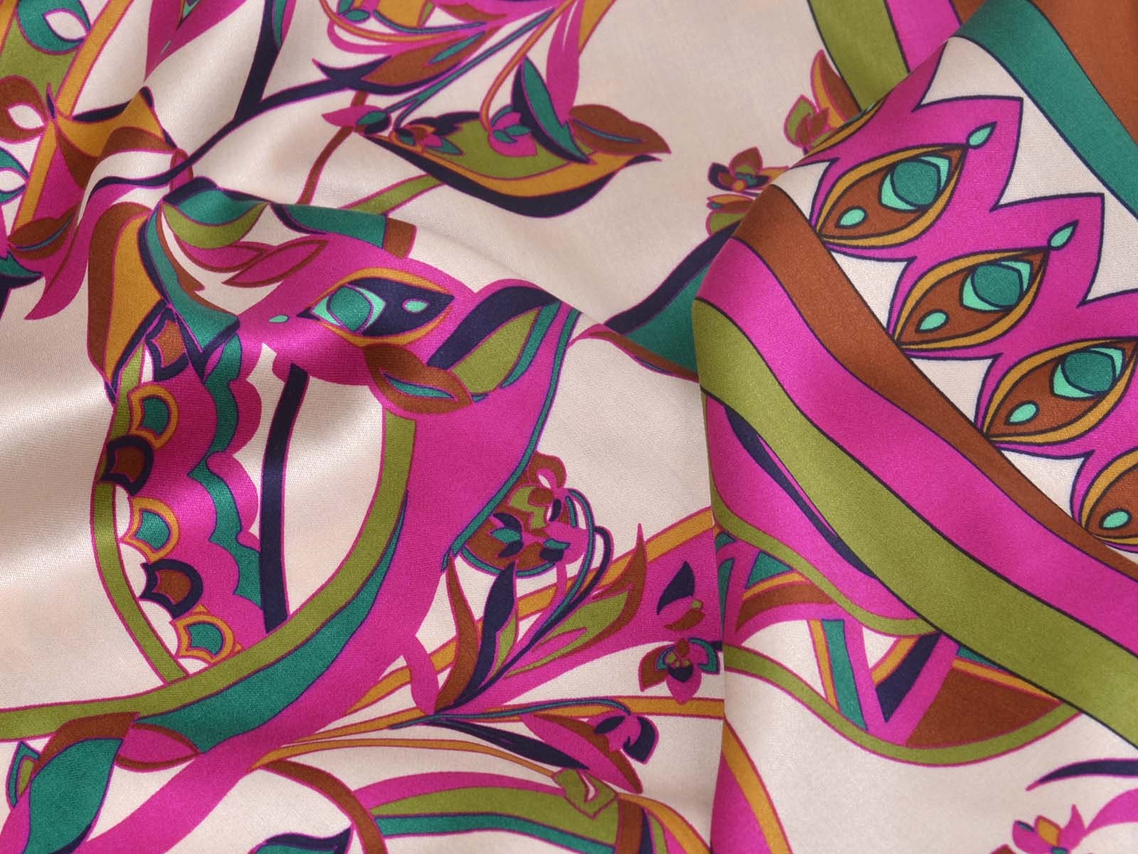 Blusenstoff aus Viskose, Satin, glänzend mit Blumen, Blättern, lila, beige - 145cm breit - Stoff leicht glänzend, gemustert