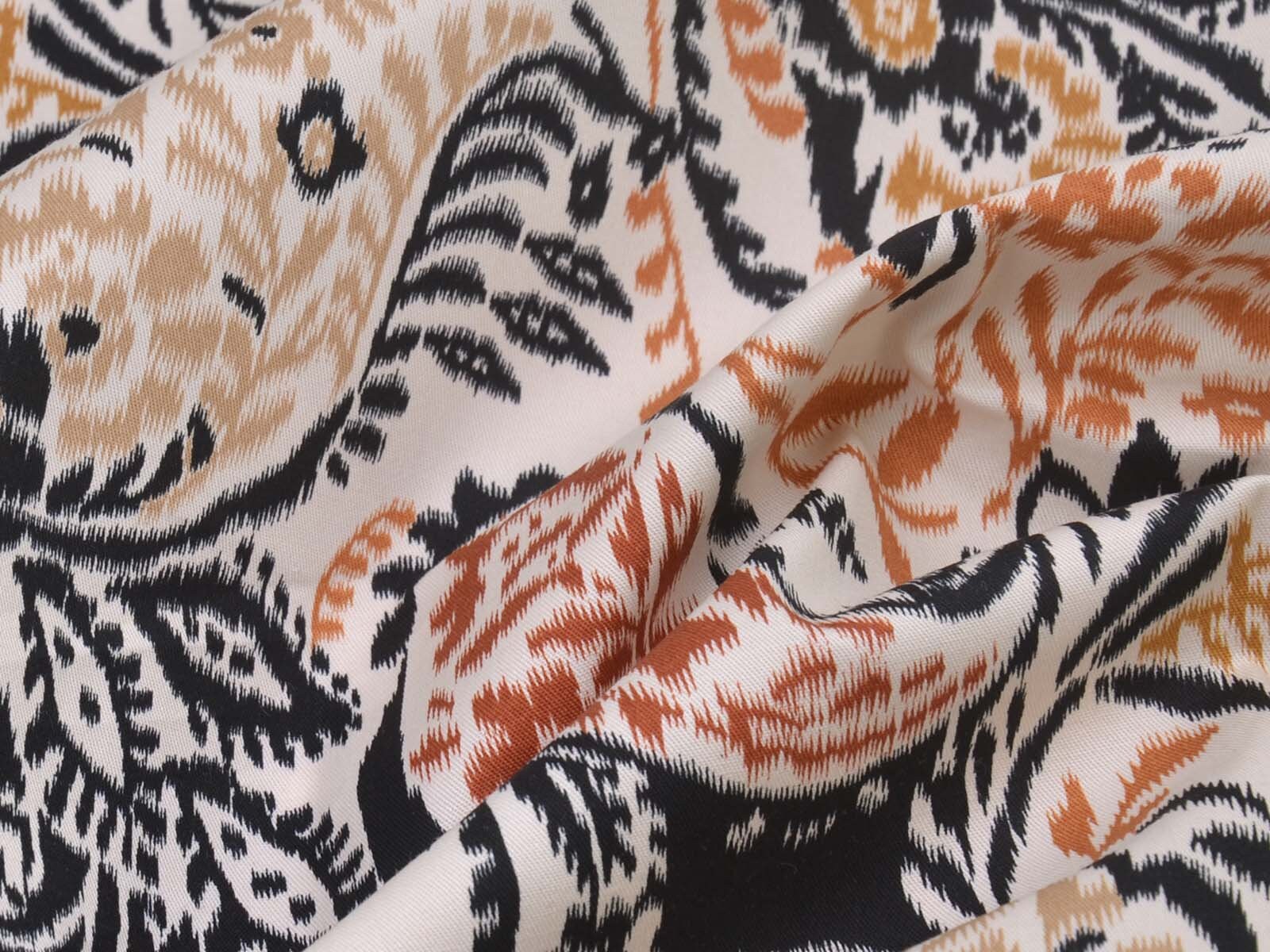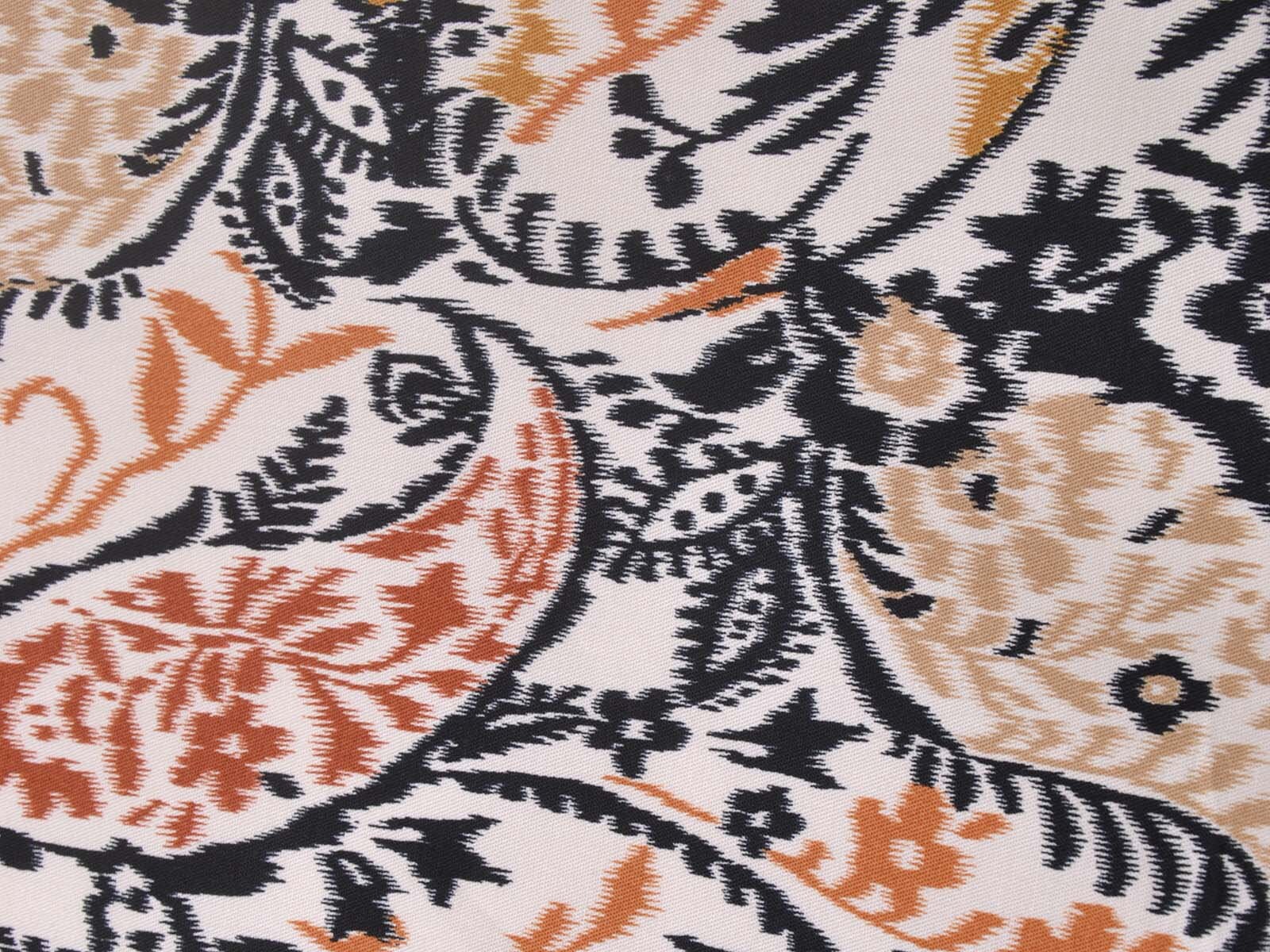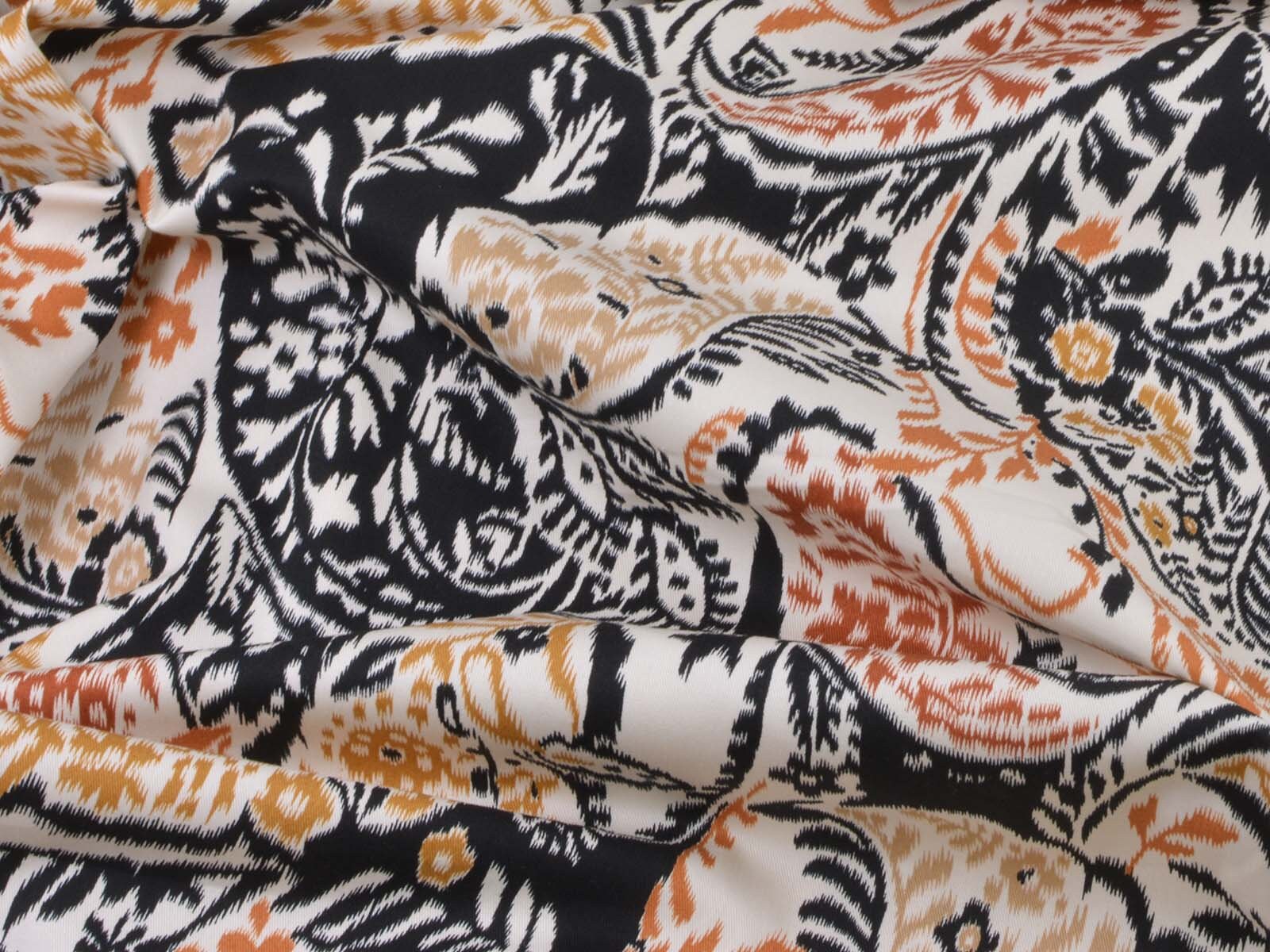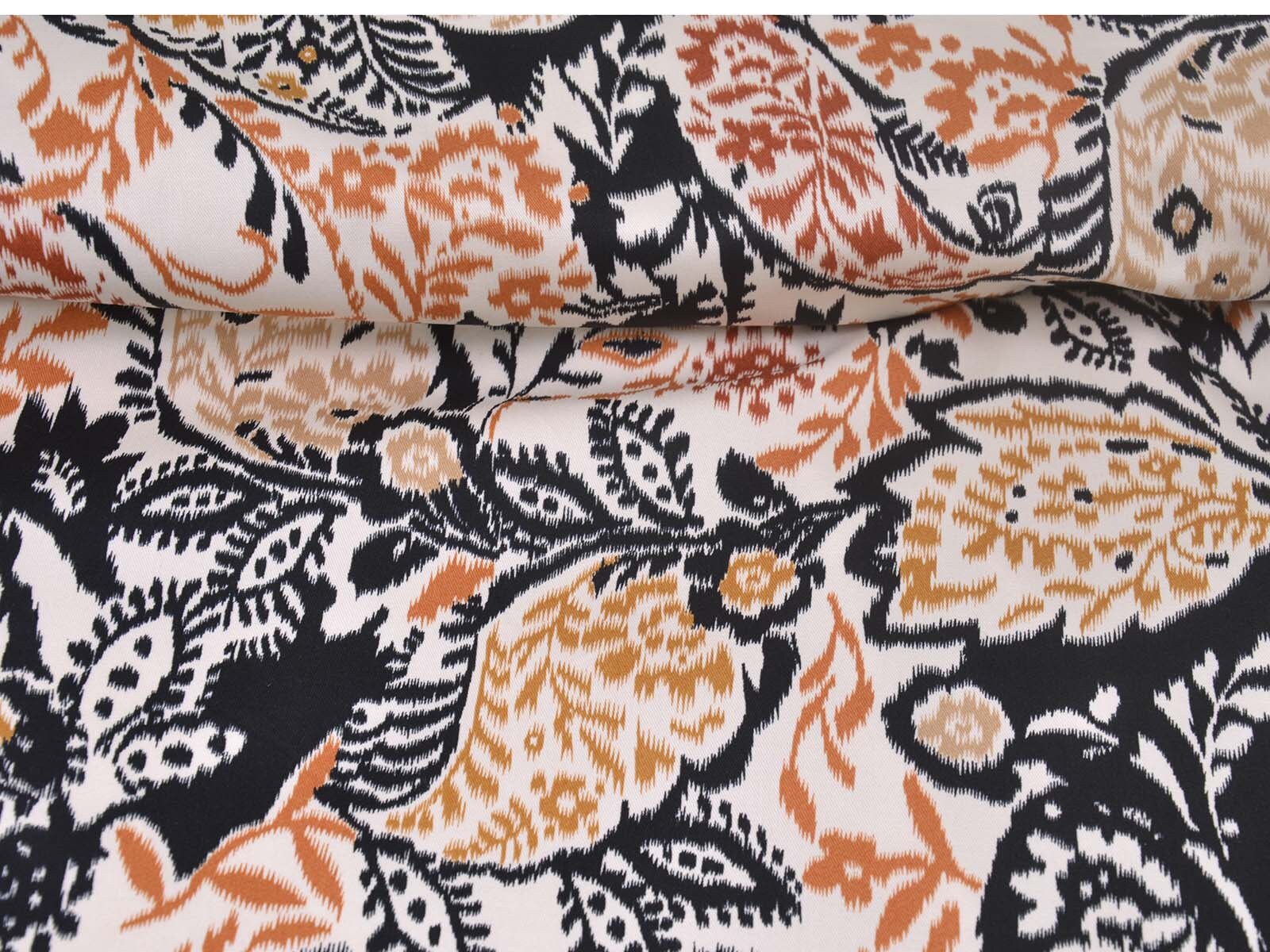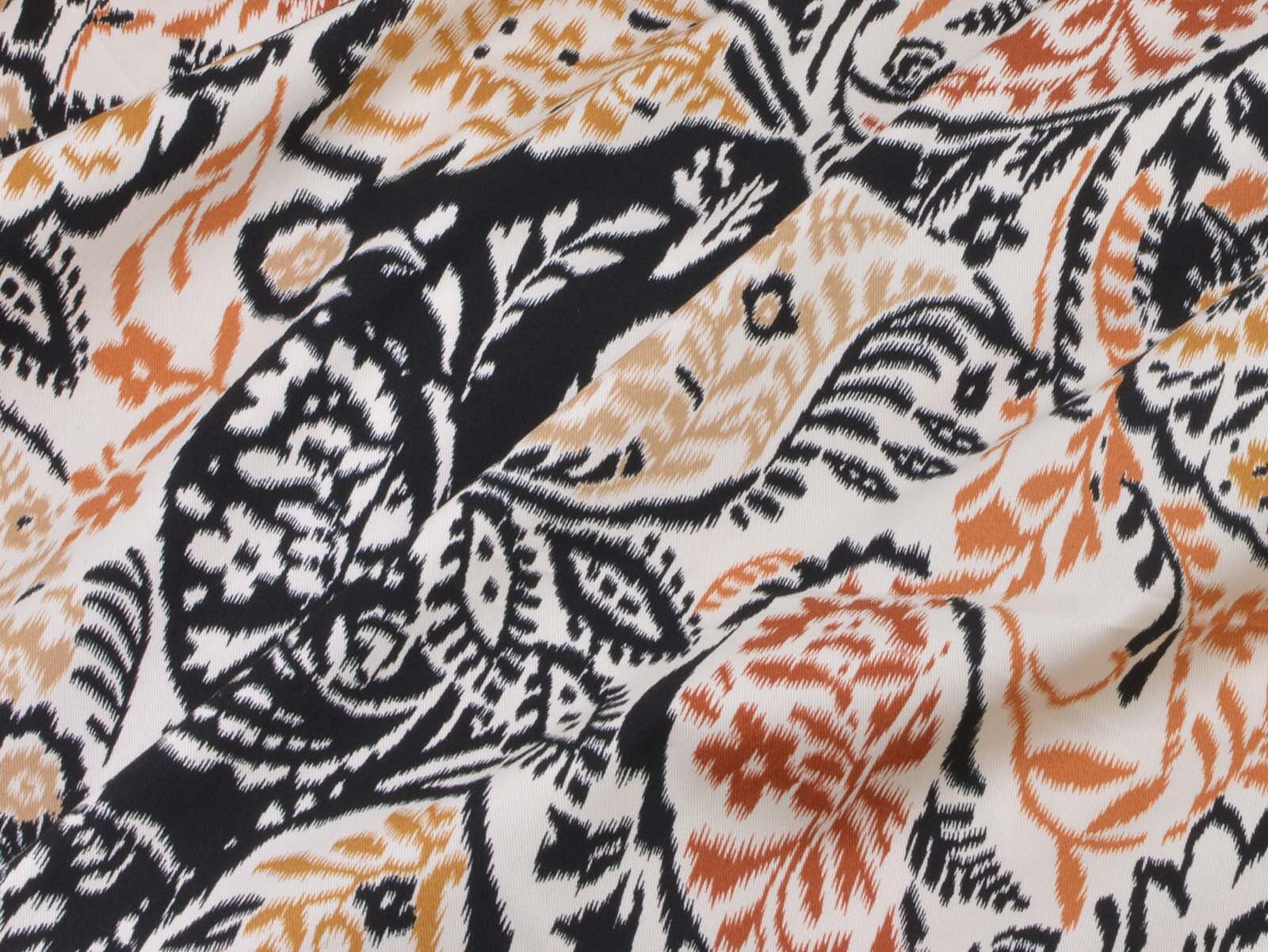 Stretch cotton fabric from Italy. The fabric is beige with a black and brown pattern. It is smooth, thin, and slightly shiny. The fabric is suitable for sewing trousers, dresses, skirts, and much more.