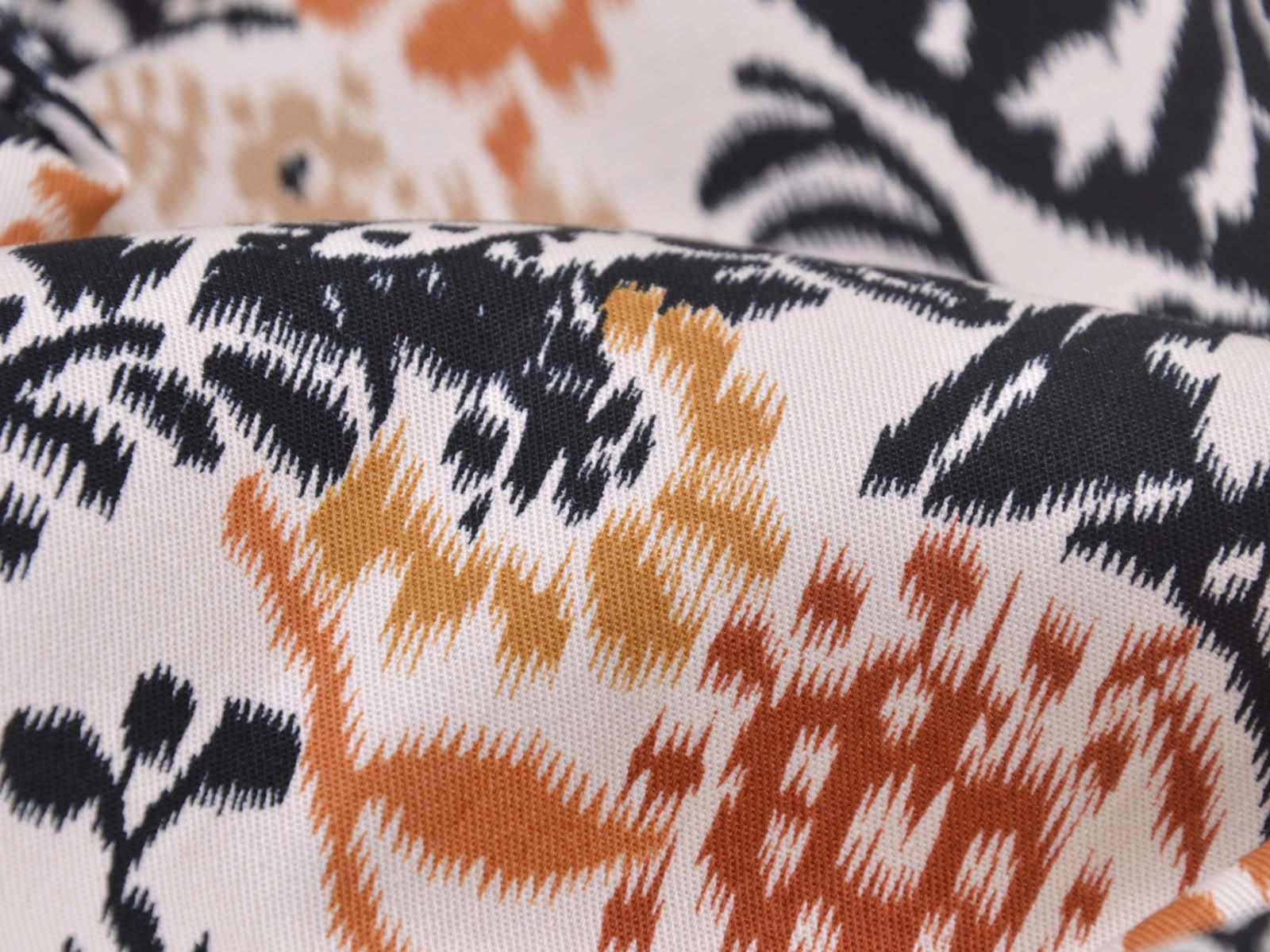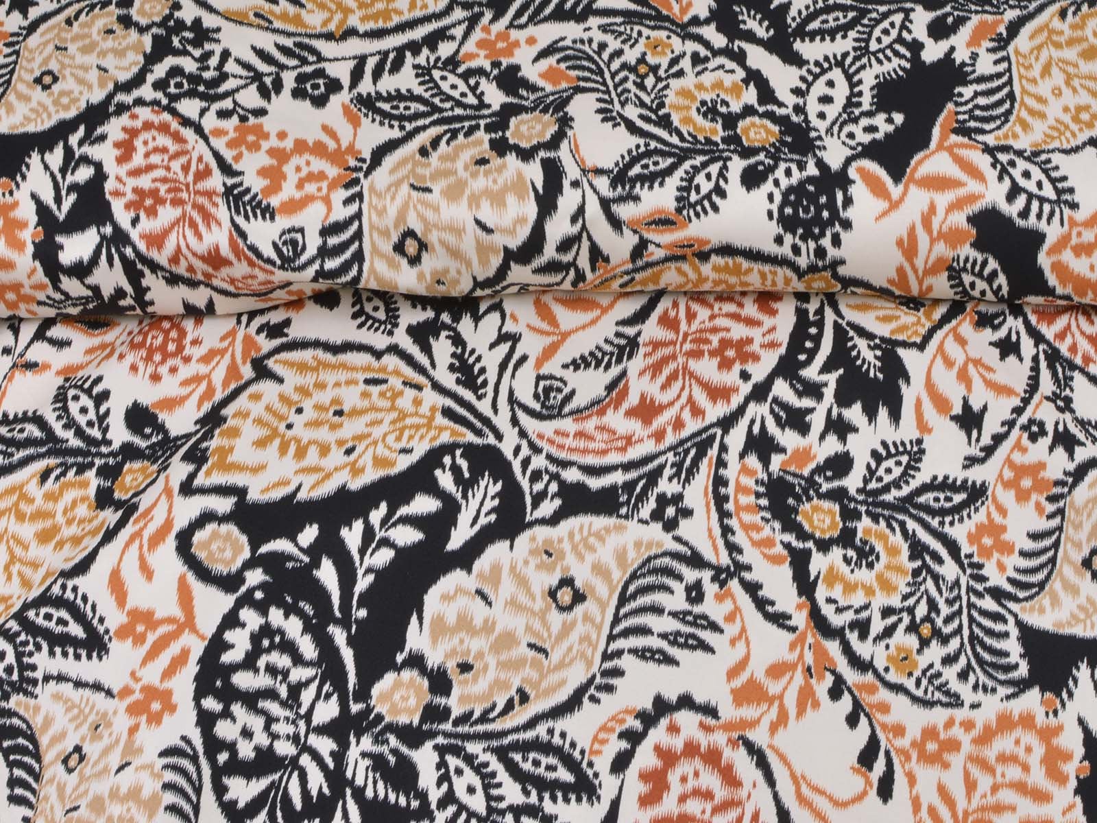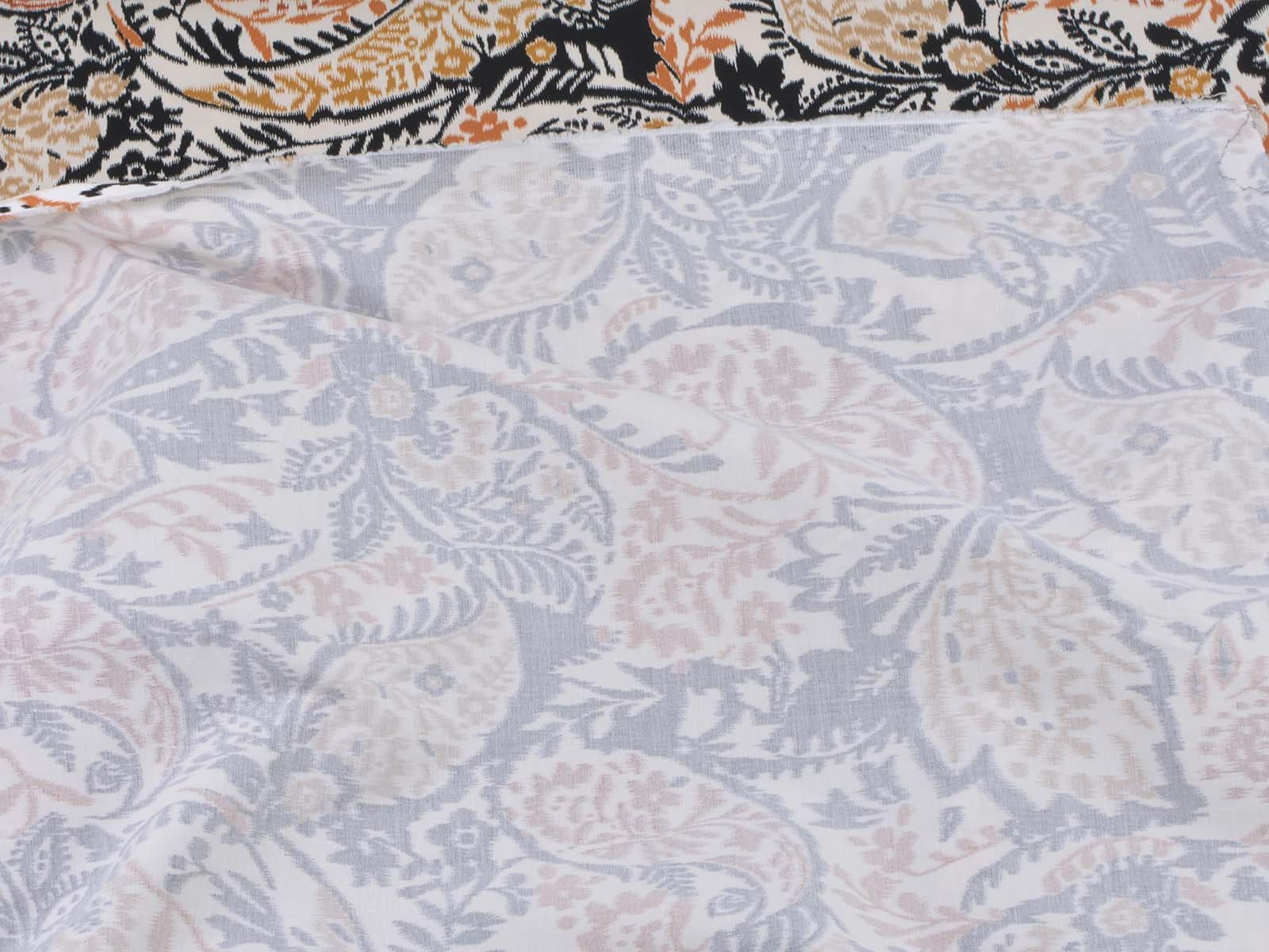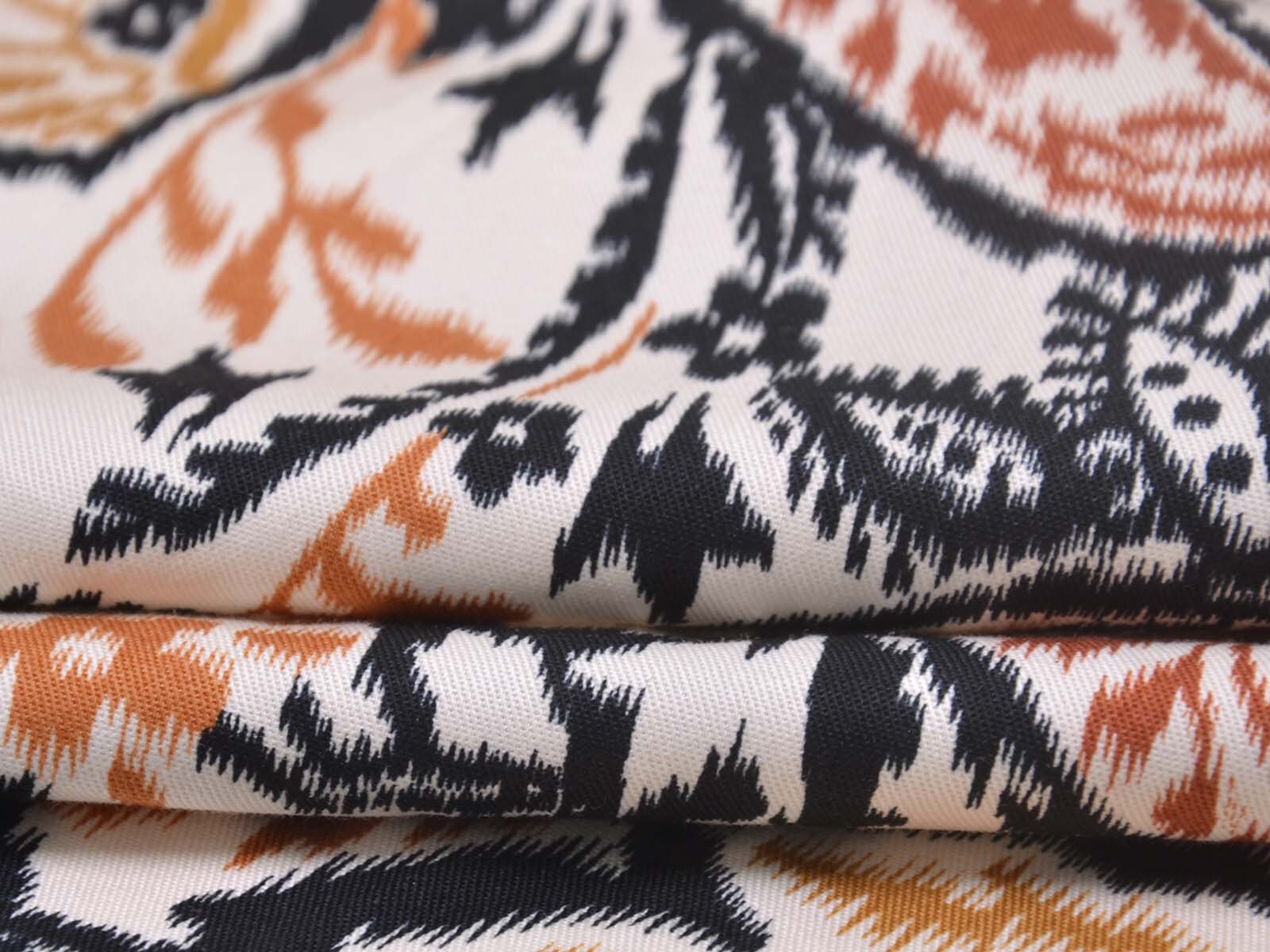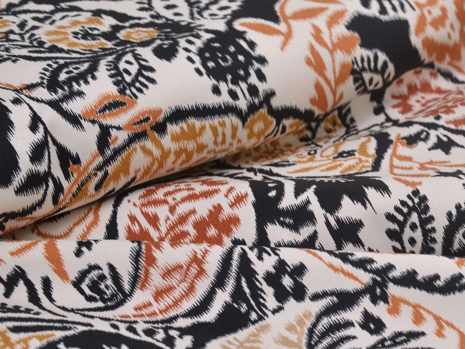 Stretch cotton fabric from Italy. The fabric is beige with a black and brown pattern. It is smooth, thin, and slightly shiny. The fabric is suitable for sewing trousers, dresses, skirts, and much more.