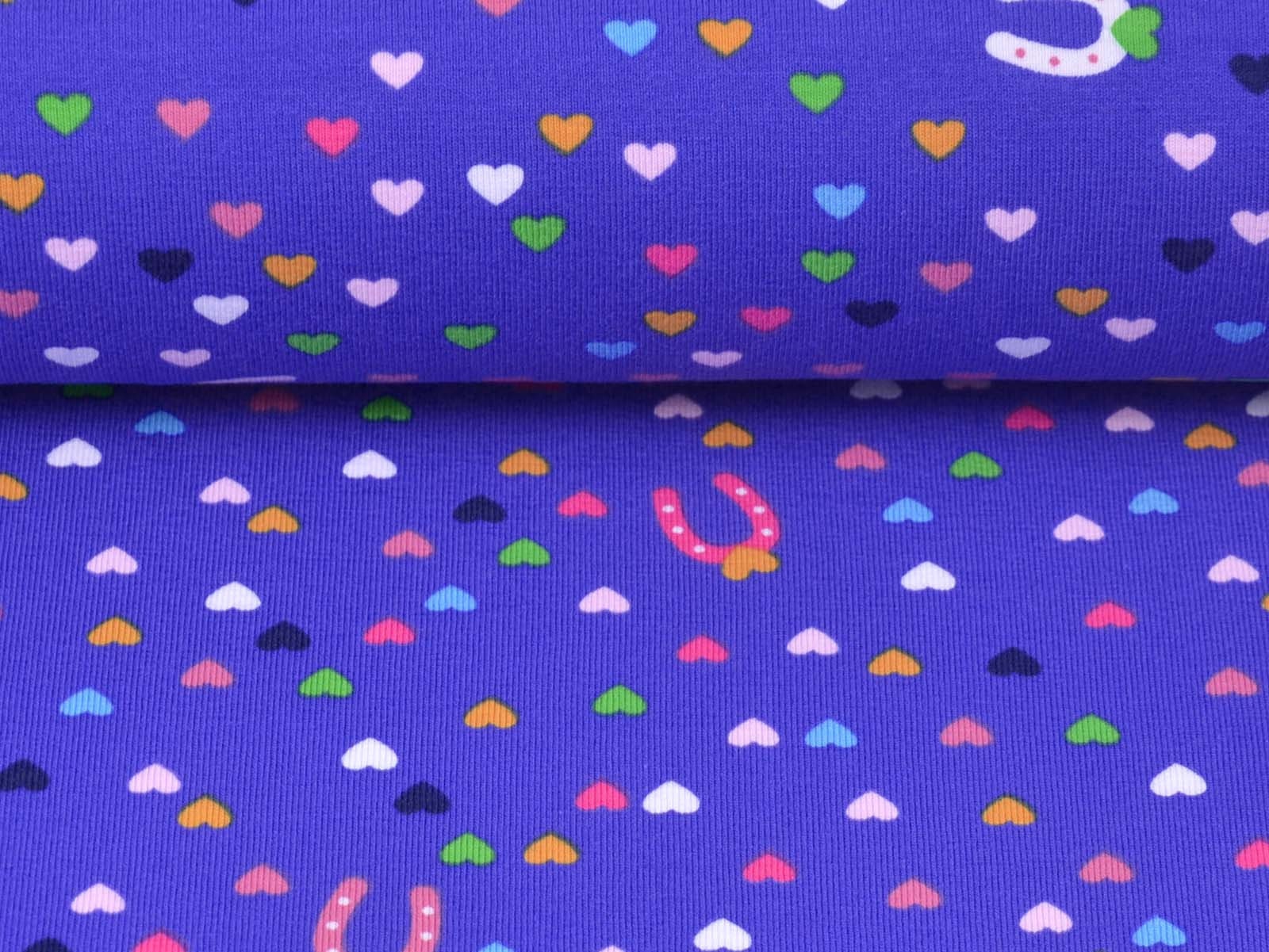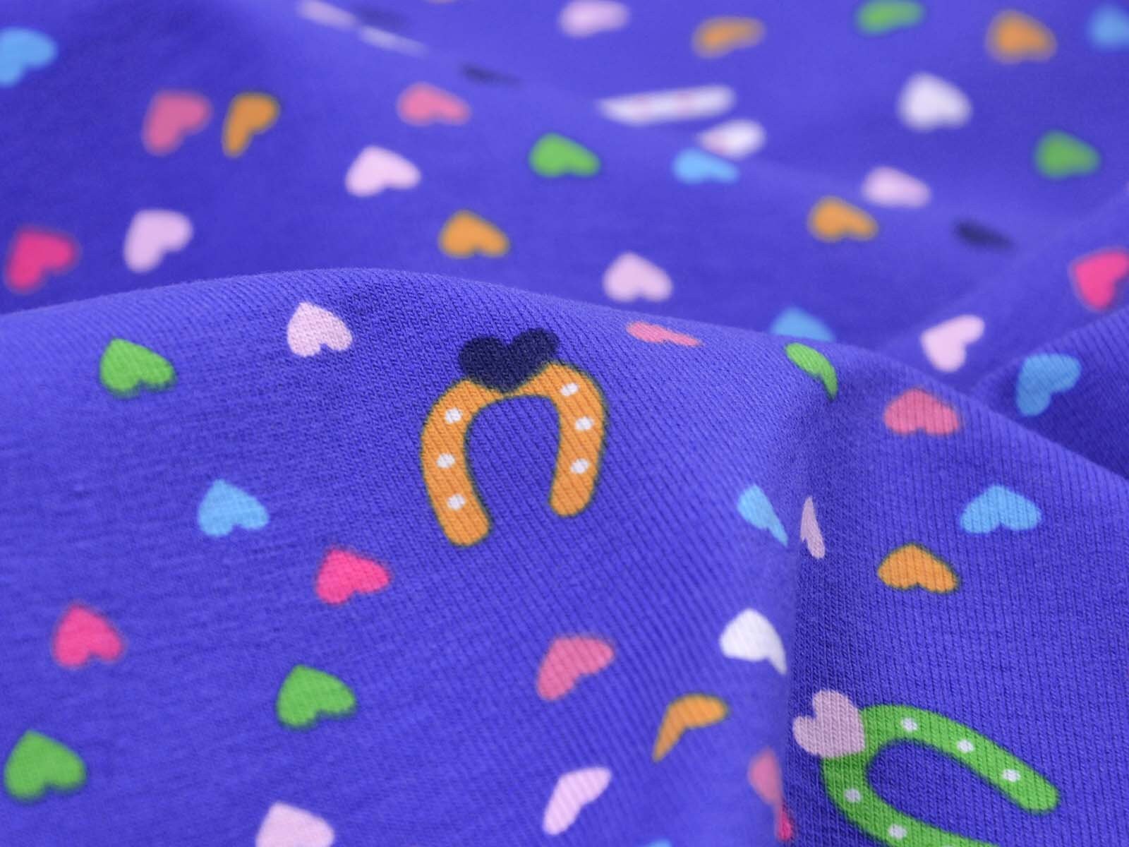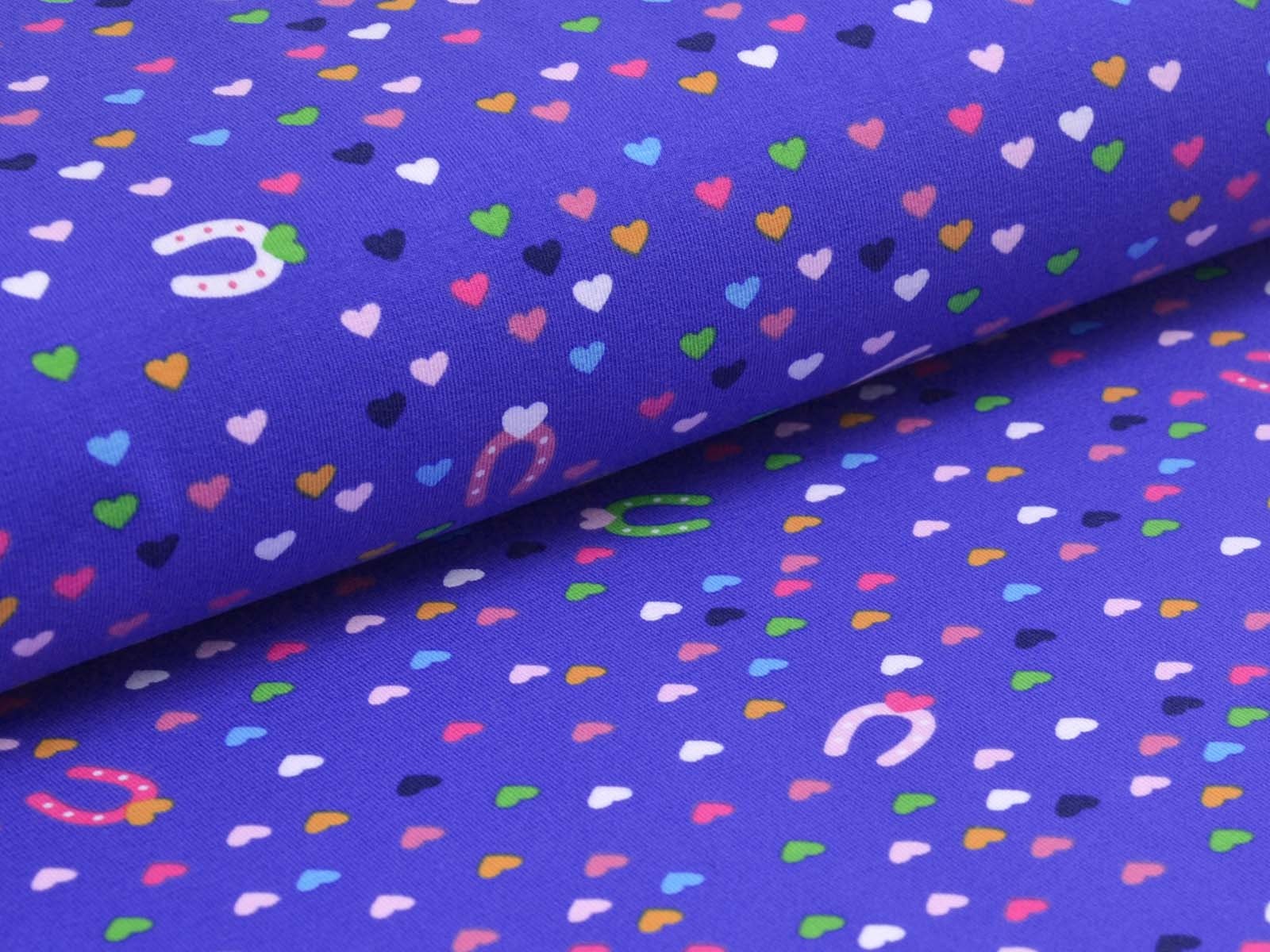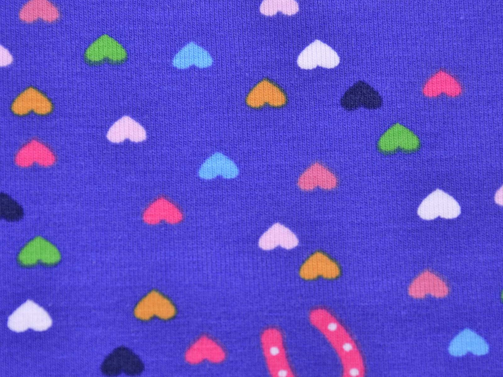 Jersey für Kinder aus Baumwolle made in Italy. Der Stoff mit Herzen ist dünn, glatt, matt und gemustert. Nähe daraus T-Shirts, Leggings, Kleider, Pumphosen und so vieles mehr.