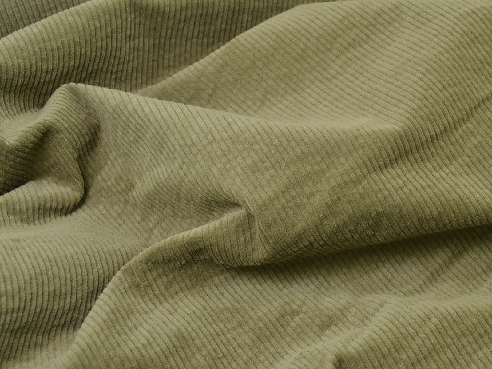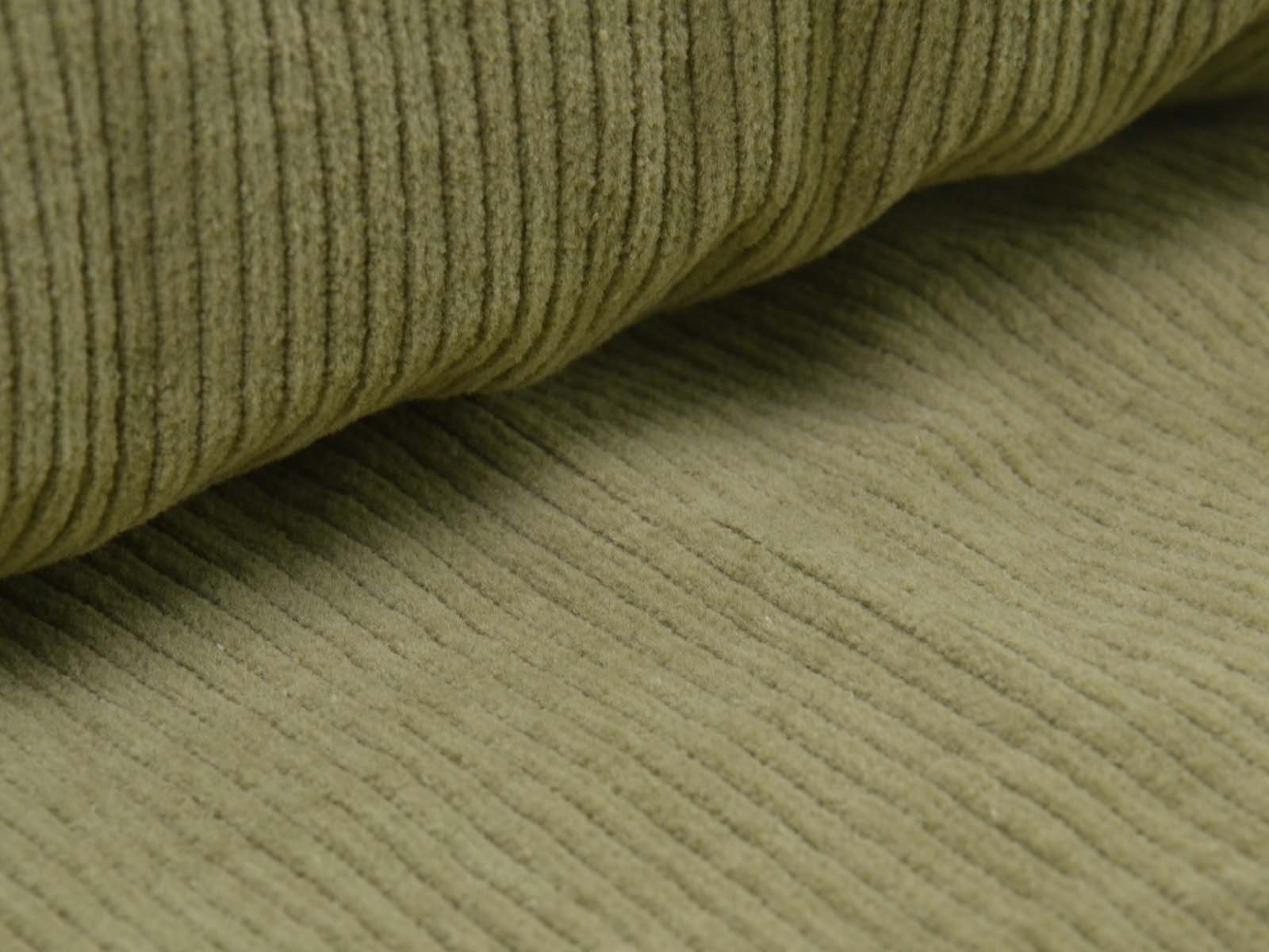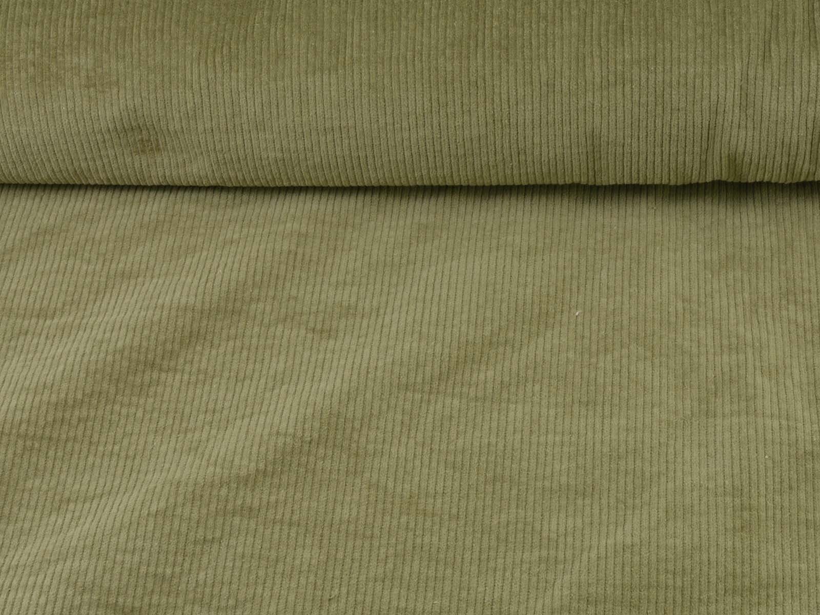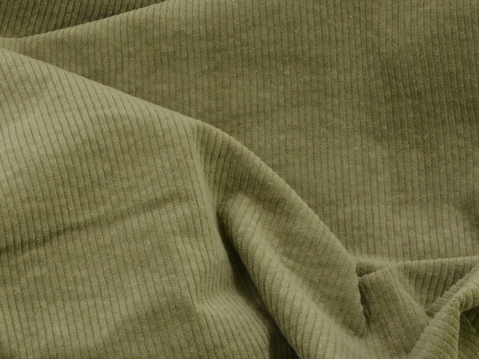 Stretch cotton corduroy in plain olive green. The fabric has a slightly velvety feel, and the stretch provides a great wearing comfort. It's perfect for sewing dresses, trousers, skirts, and much more.