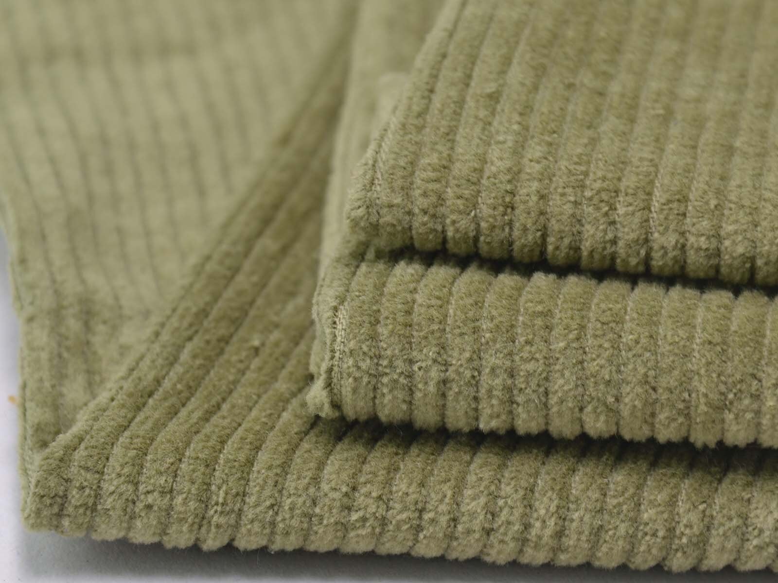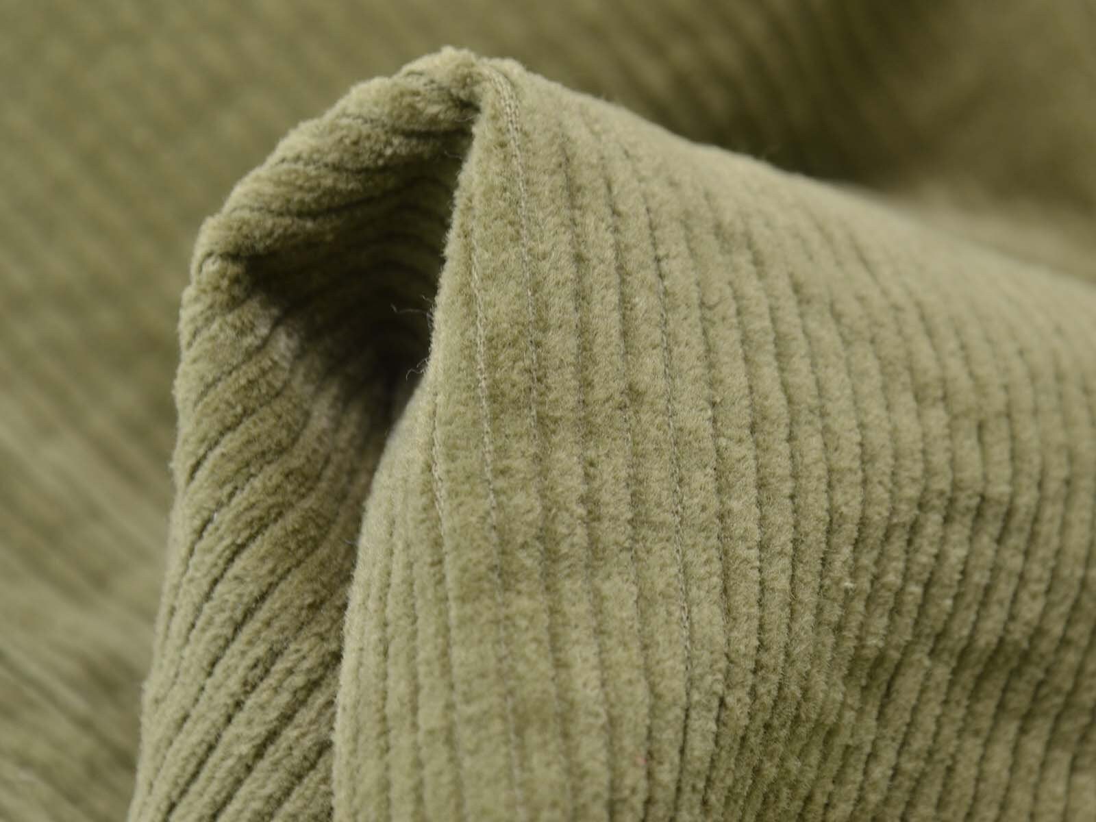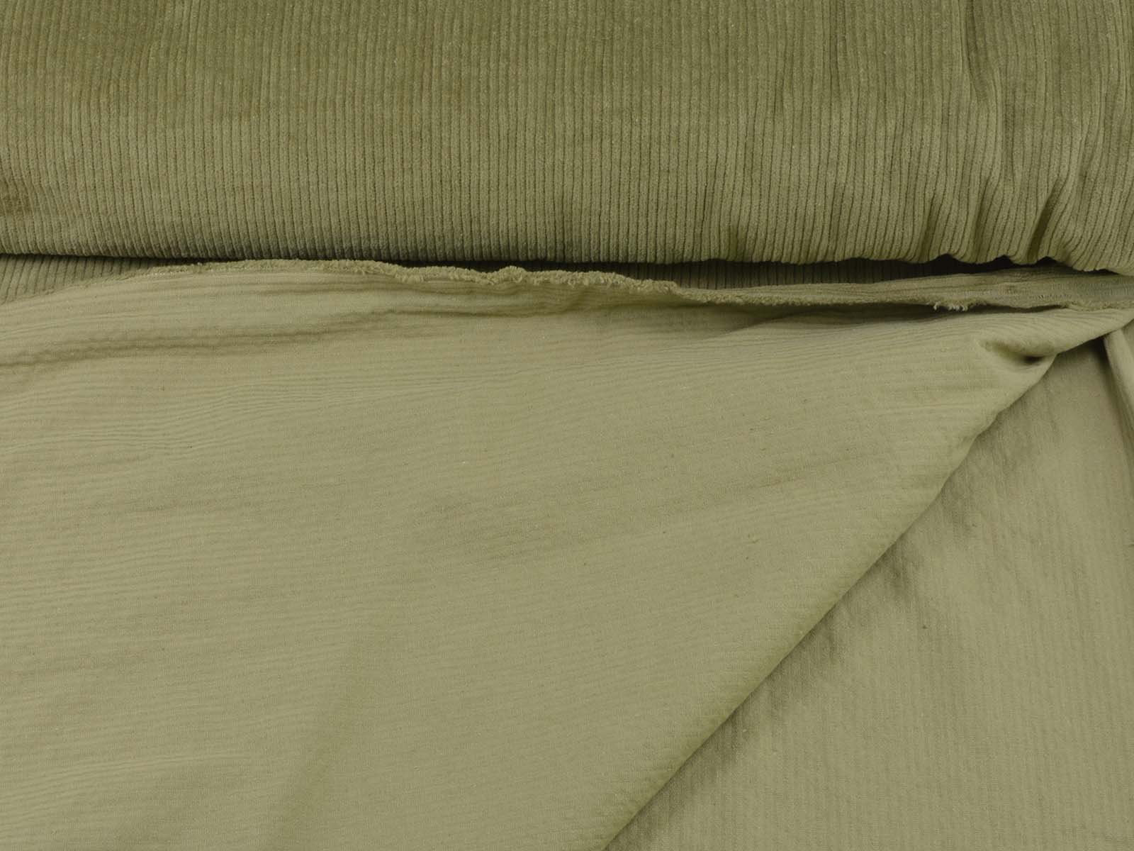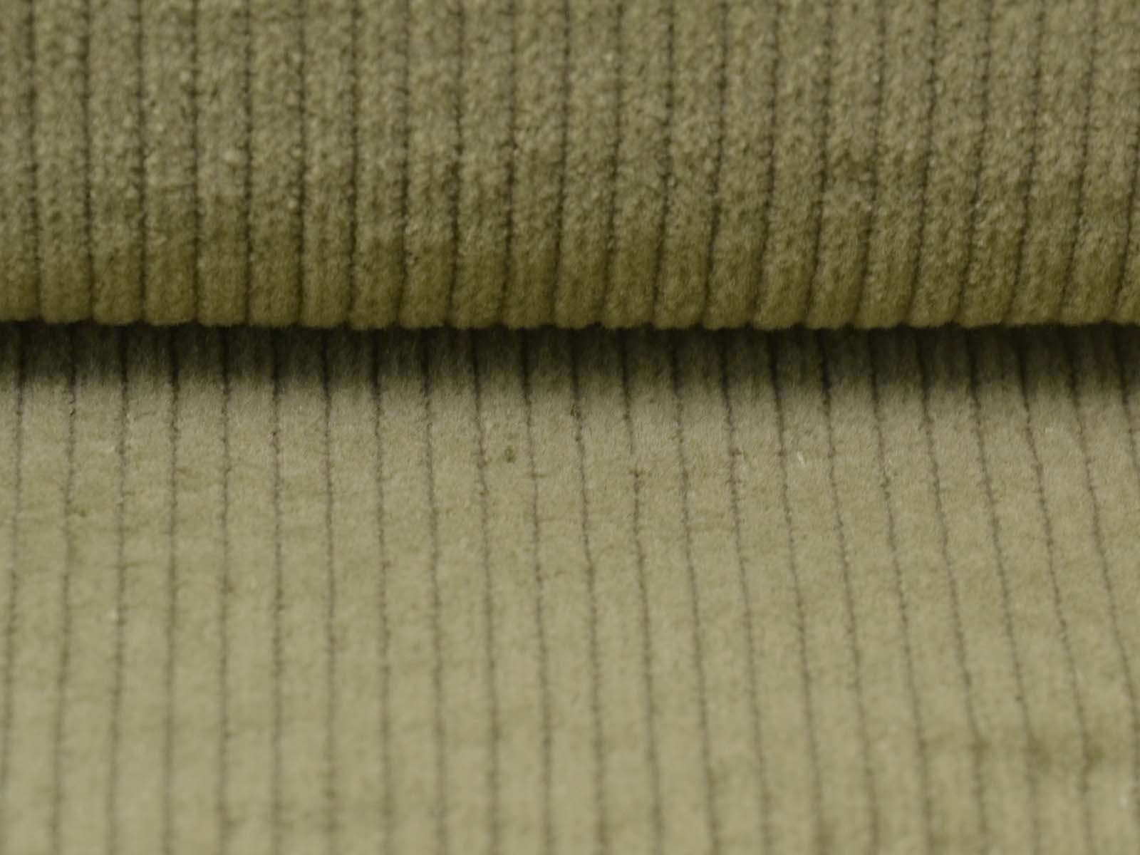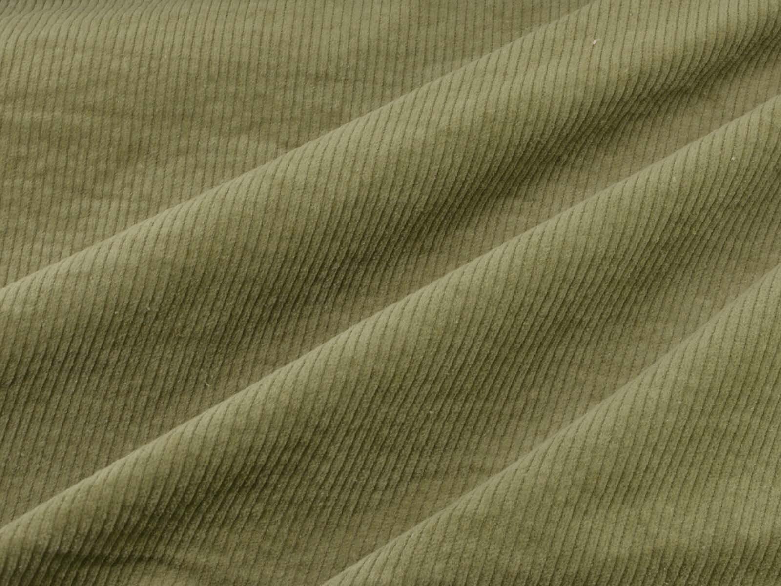 Stretch cotton corduroy in plain olive green. The fabric has a slightly velvety feel, and the stretch provides a great wearing comfort. It's perfect for sewing dresses, trousers, skirts, and much more.