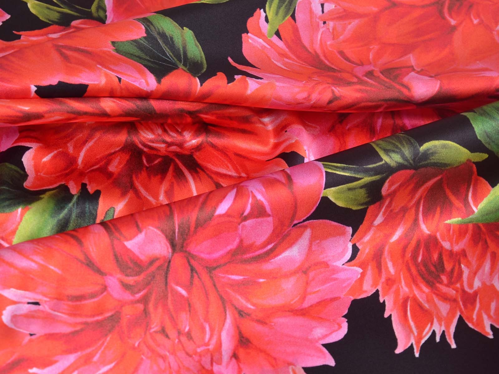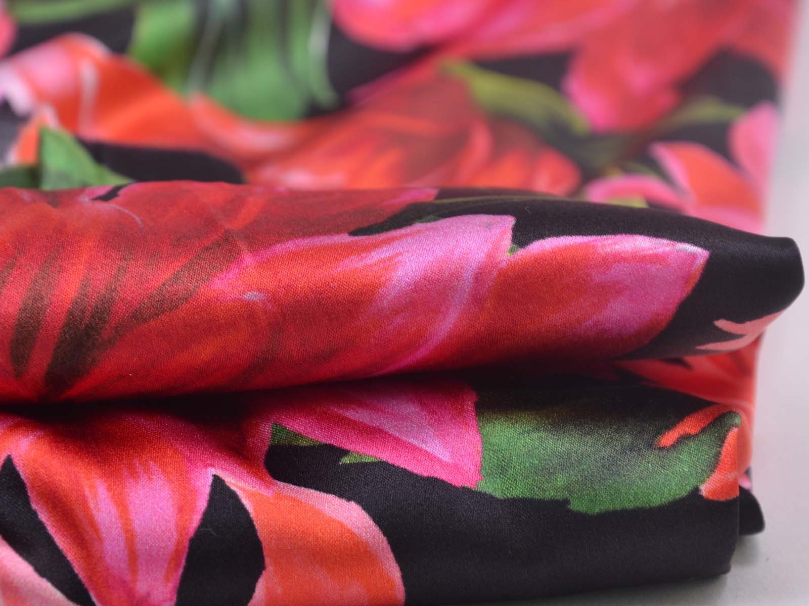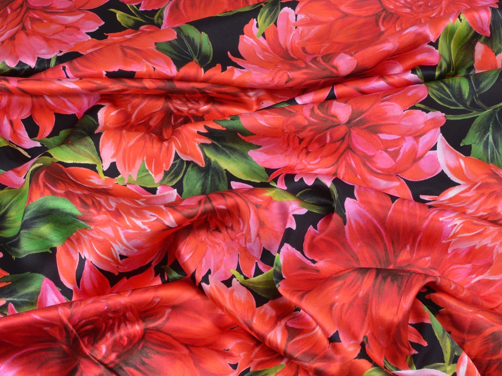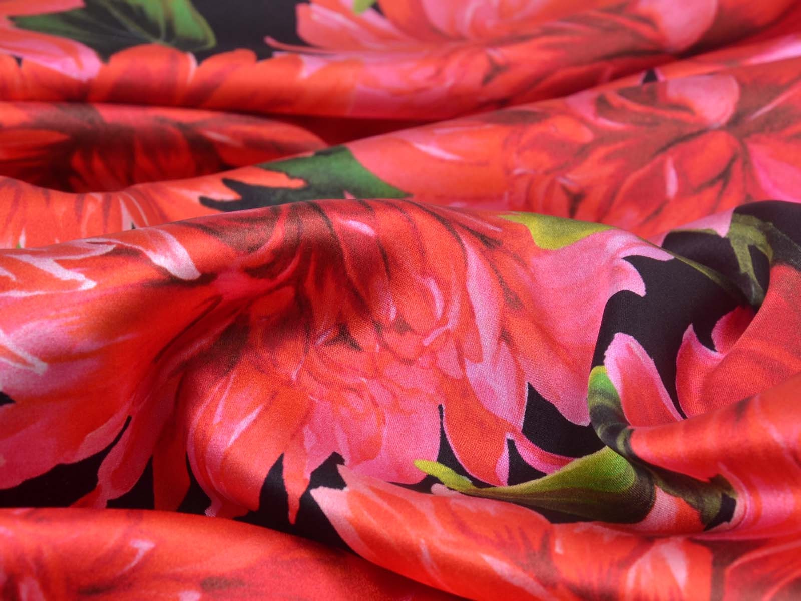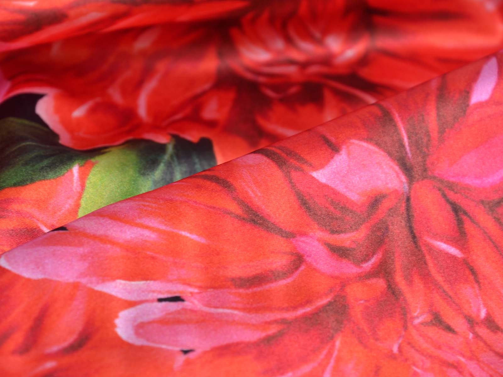 Sehr hochwertiger Seidenstoff mit Elastan aus Italian. Der Stoff zeigt rote Blumen und grüne Blätter auf schwarz. Die Seide glänzt edel, ist glatt und hat einen wunderschönen, fließenden Fall. Nähe dir daraus schicke Blusen, Kleider und Tücher.