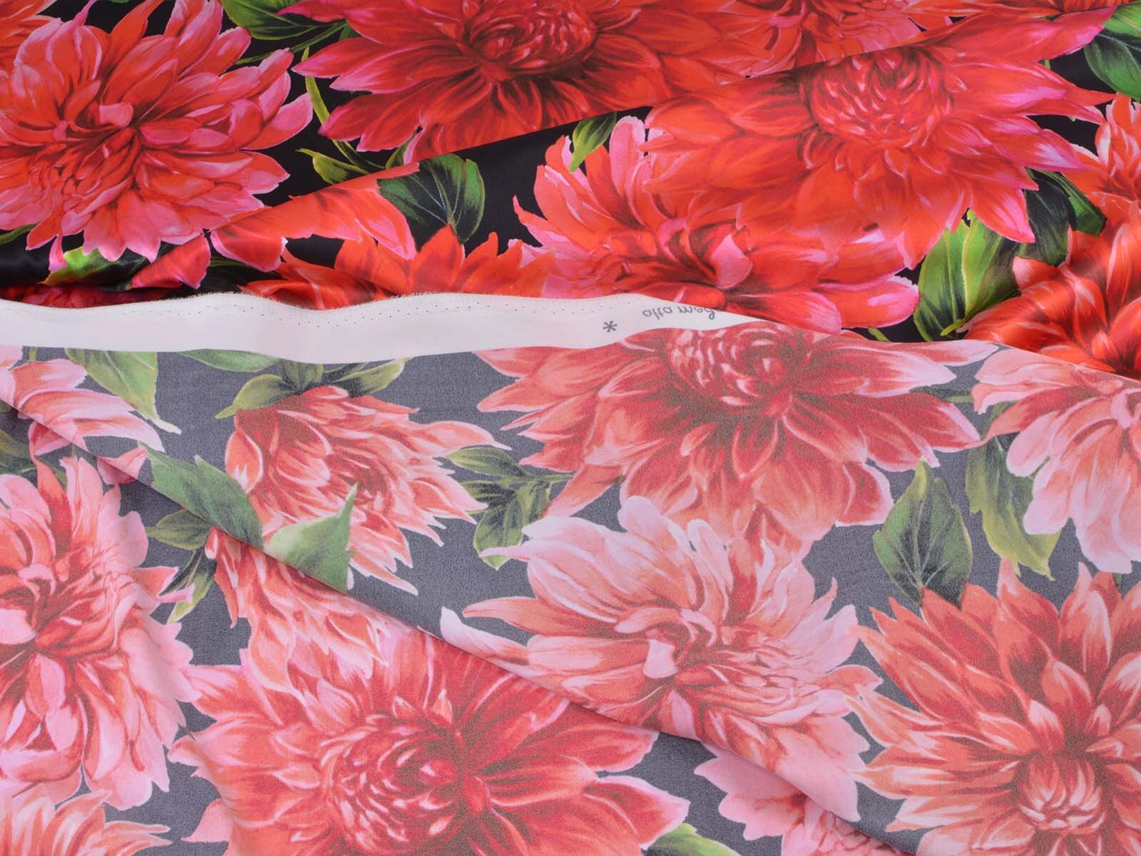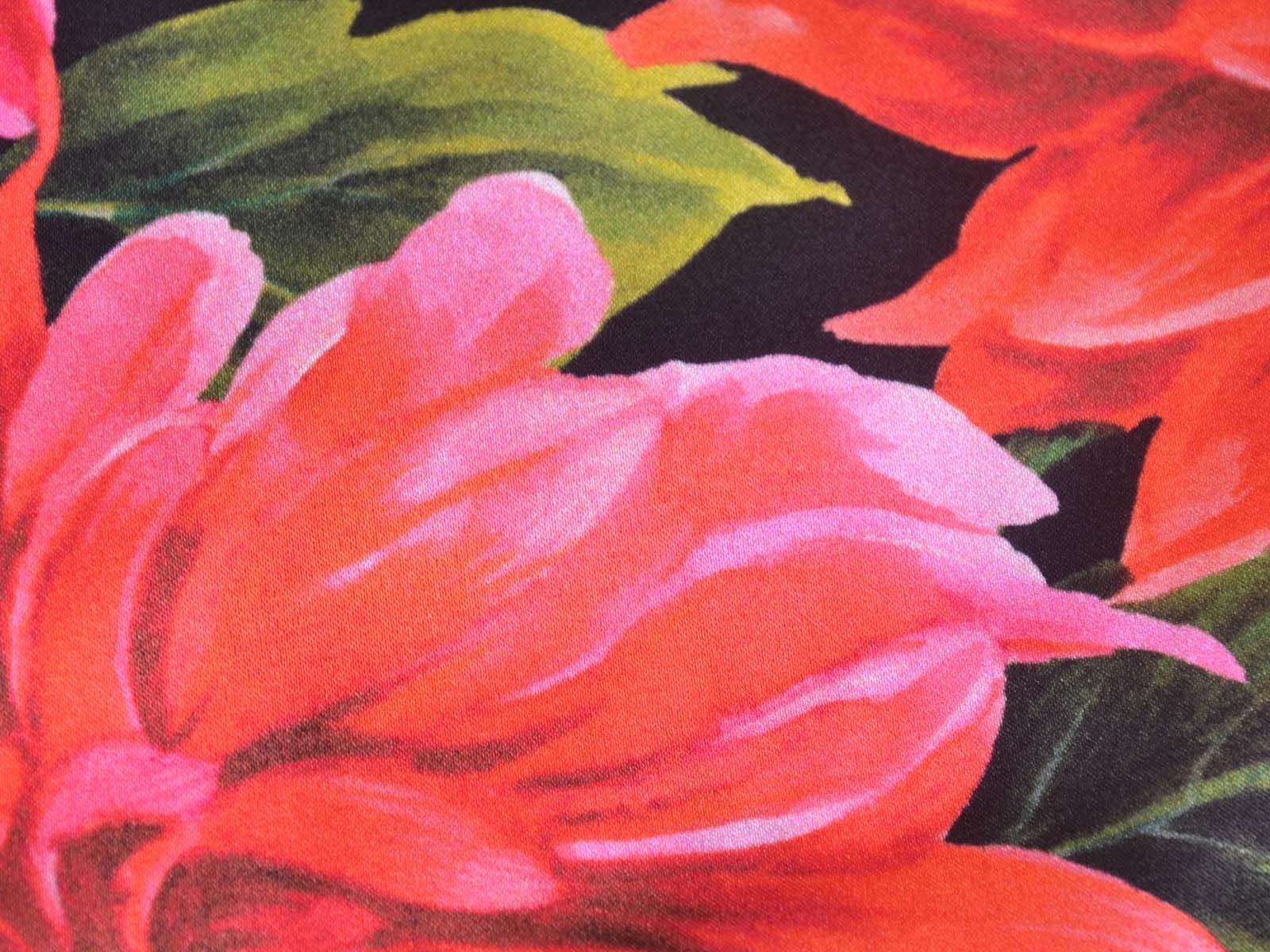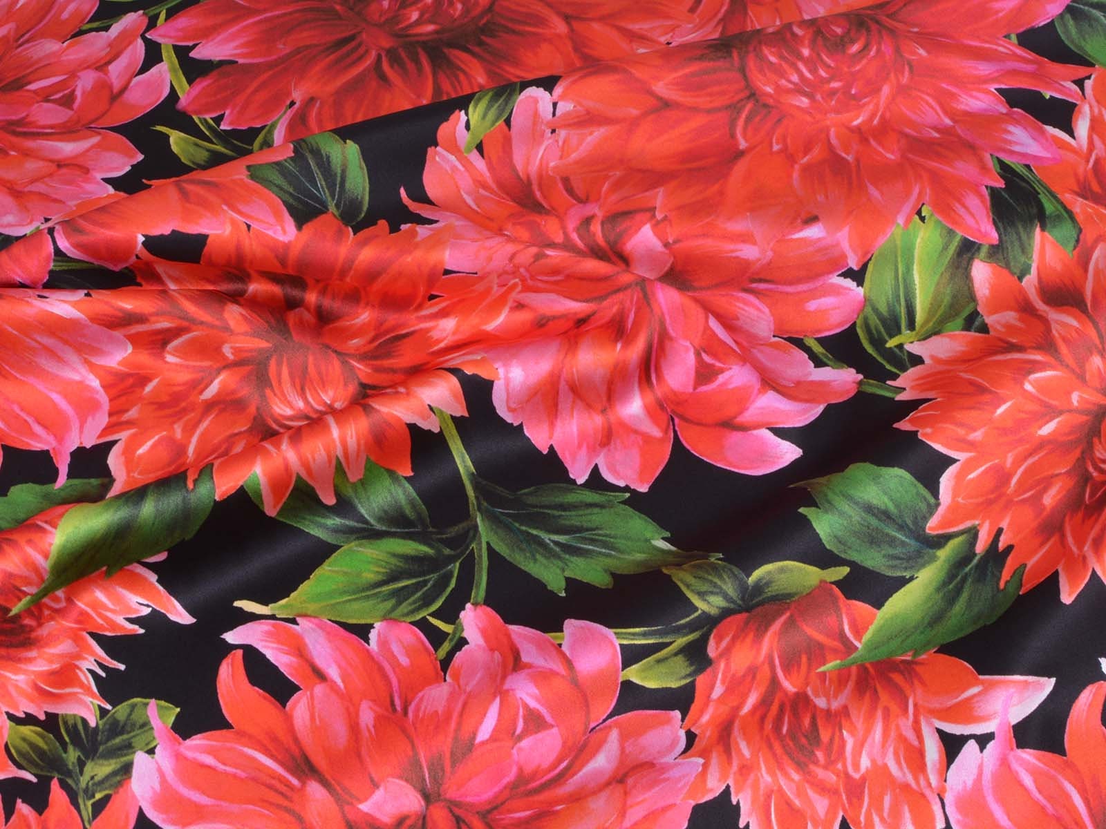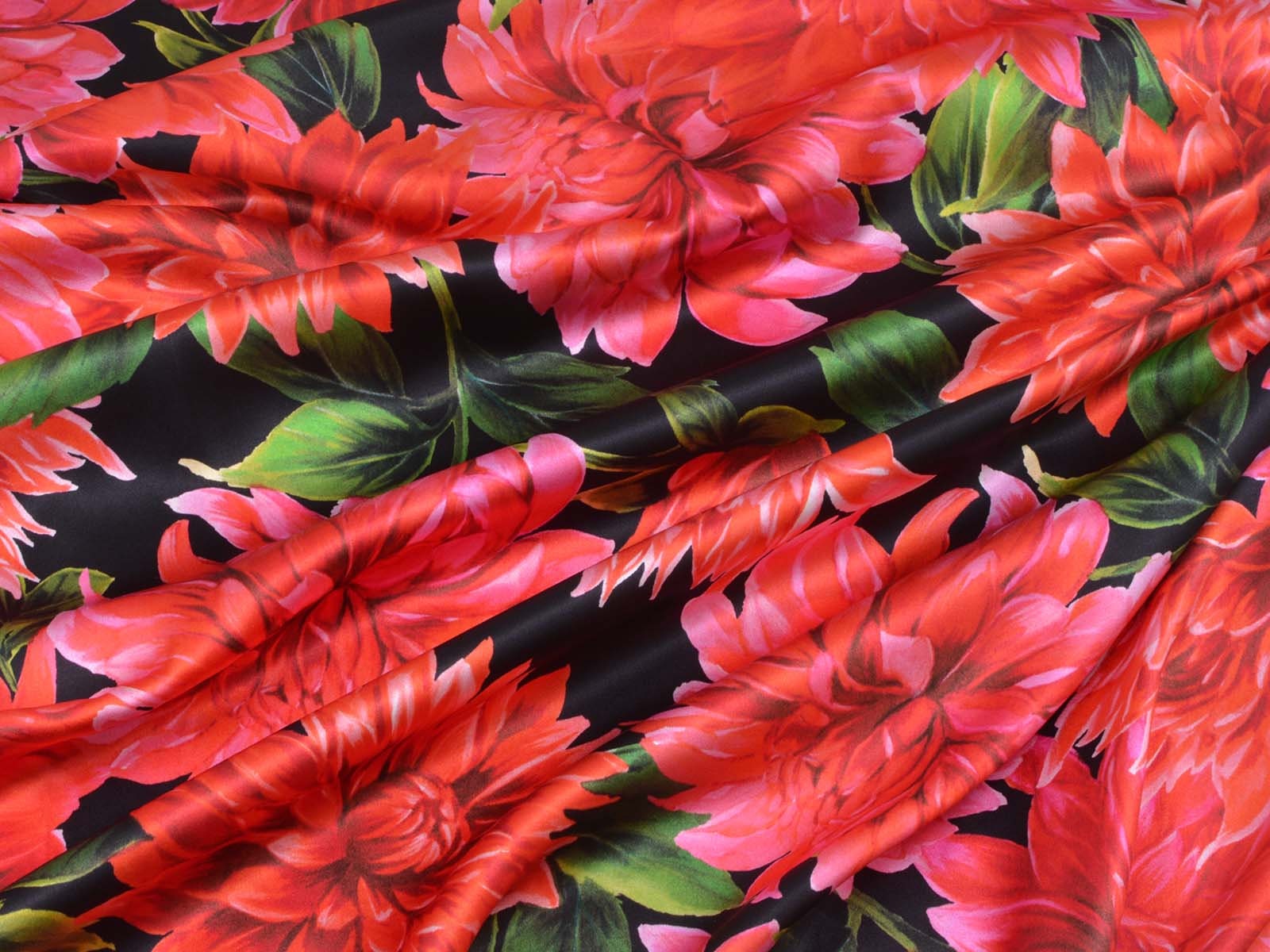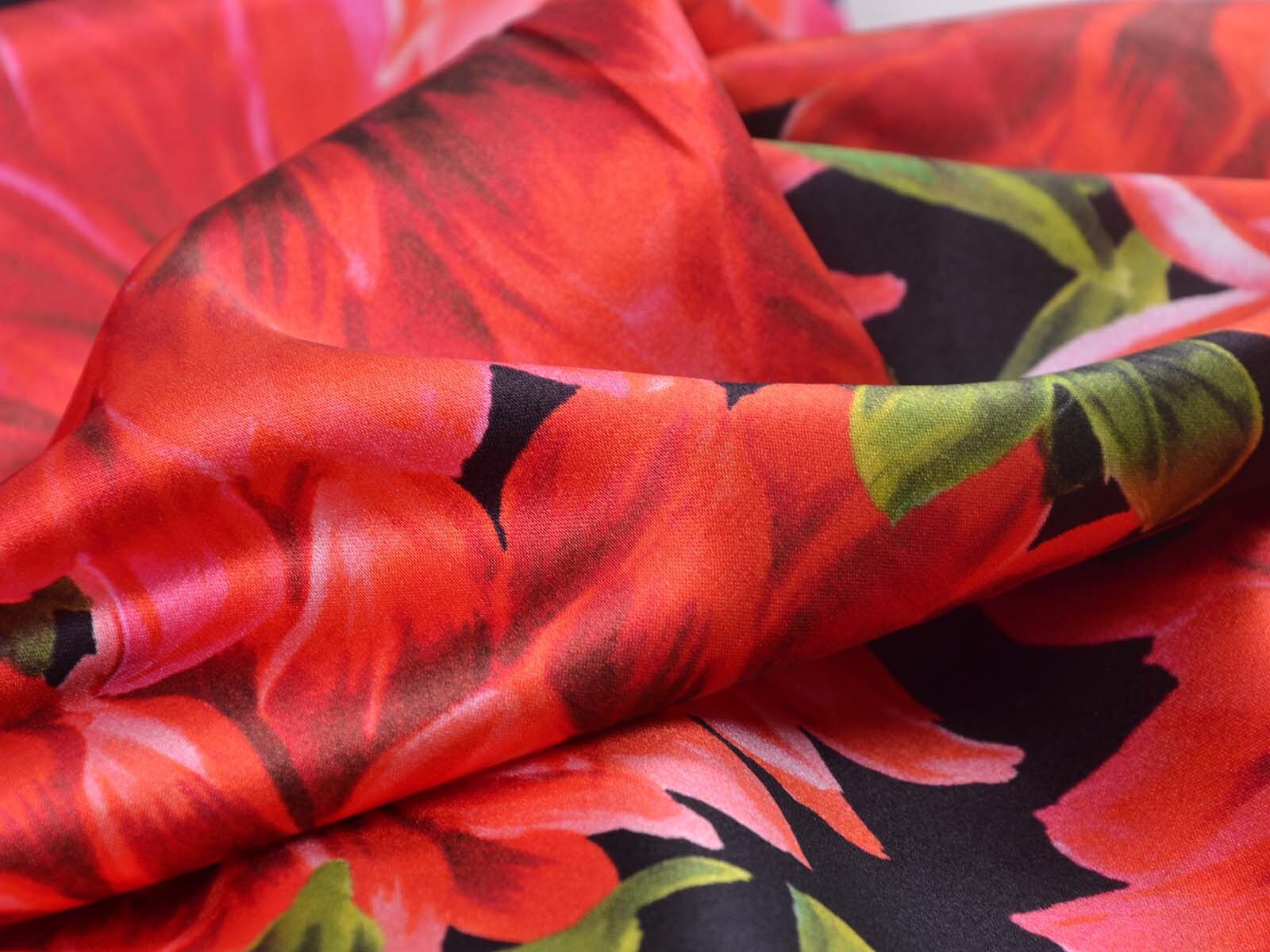 Sehr hochwertiger Seidenstoff mit Elastan aus Italian. Der Stoff zeigt rote Blumen und grüne Blätter auf schwarz. Die Seide glänzt edel, ist glatt und hat einen wunderschönen, fließenden Fall. Nähe dir daraus schicke Blusen, Kleider und Tücher.