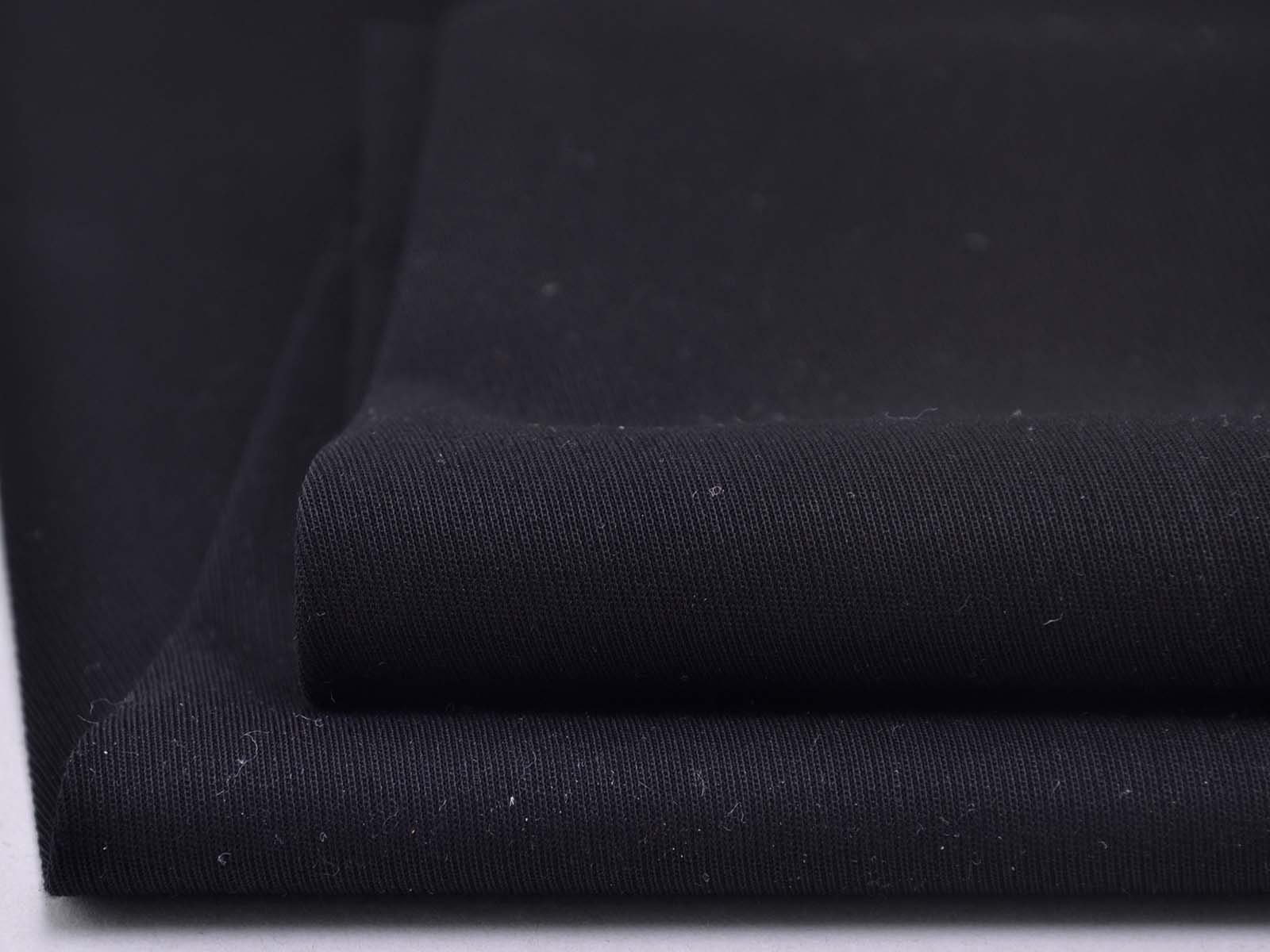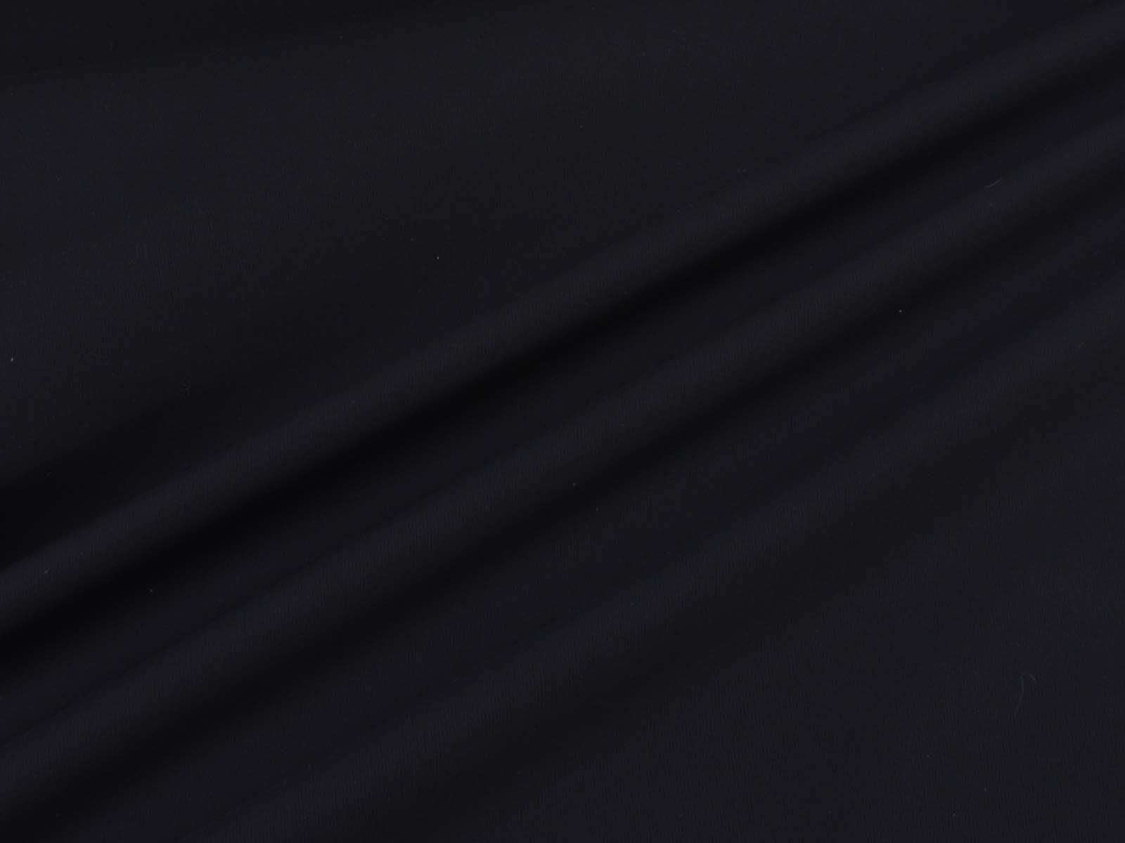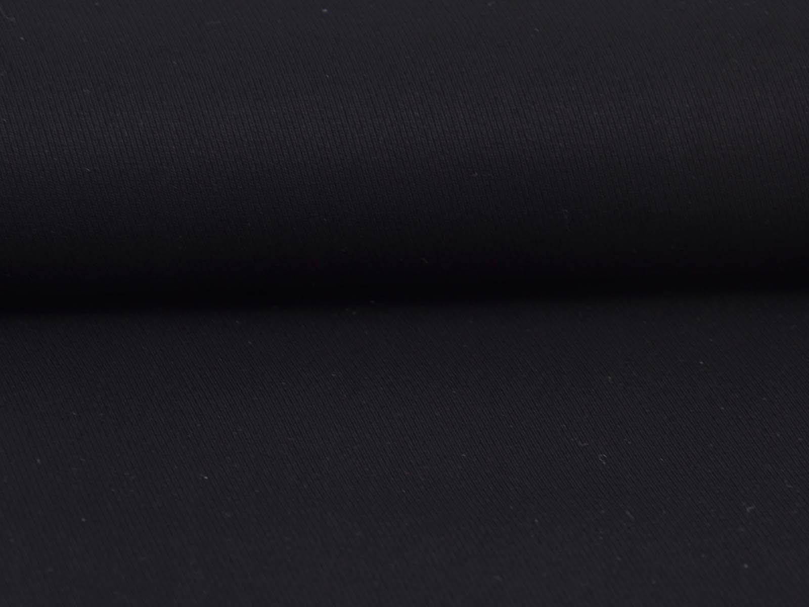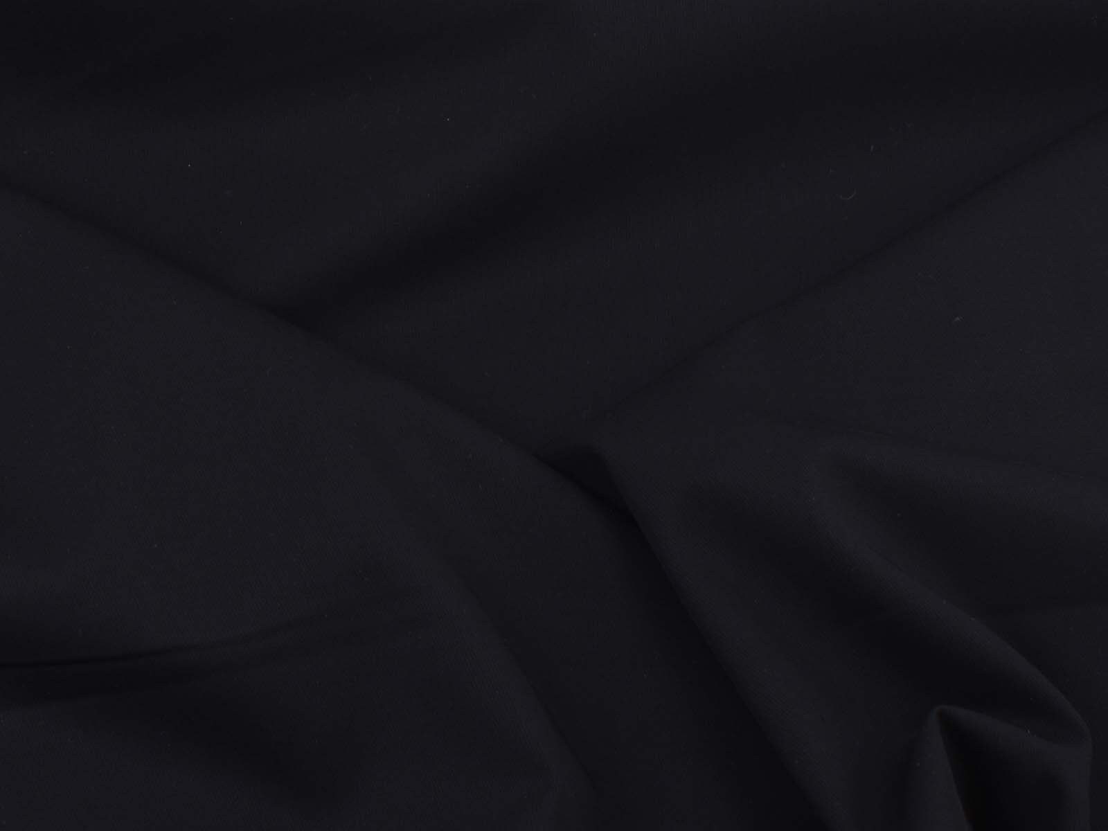 Woven cotton fabric with stretch in plain black. The fabric is smooth, slightly shiny, thin, stretchy, and has a rather flowing drape. It's suitable for sewing trousers, dresses, skirts, and much more.