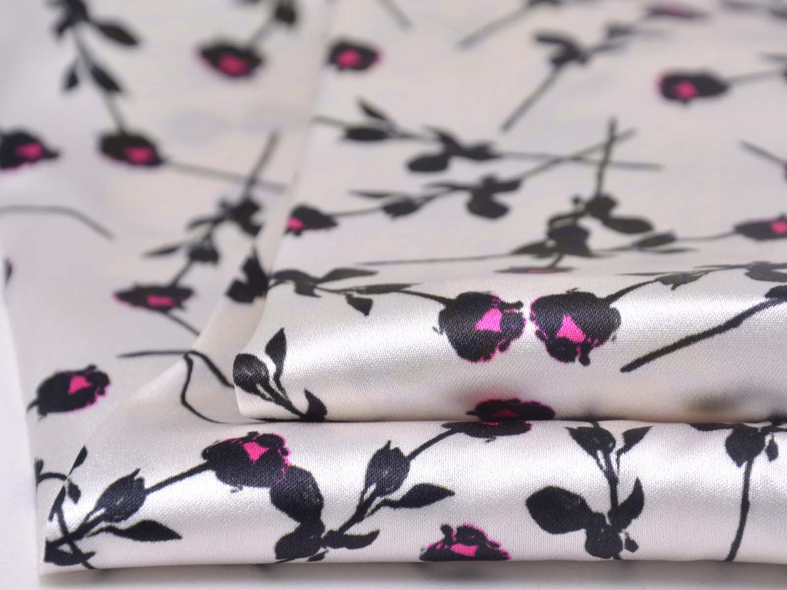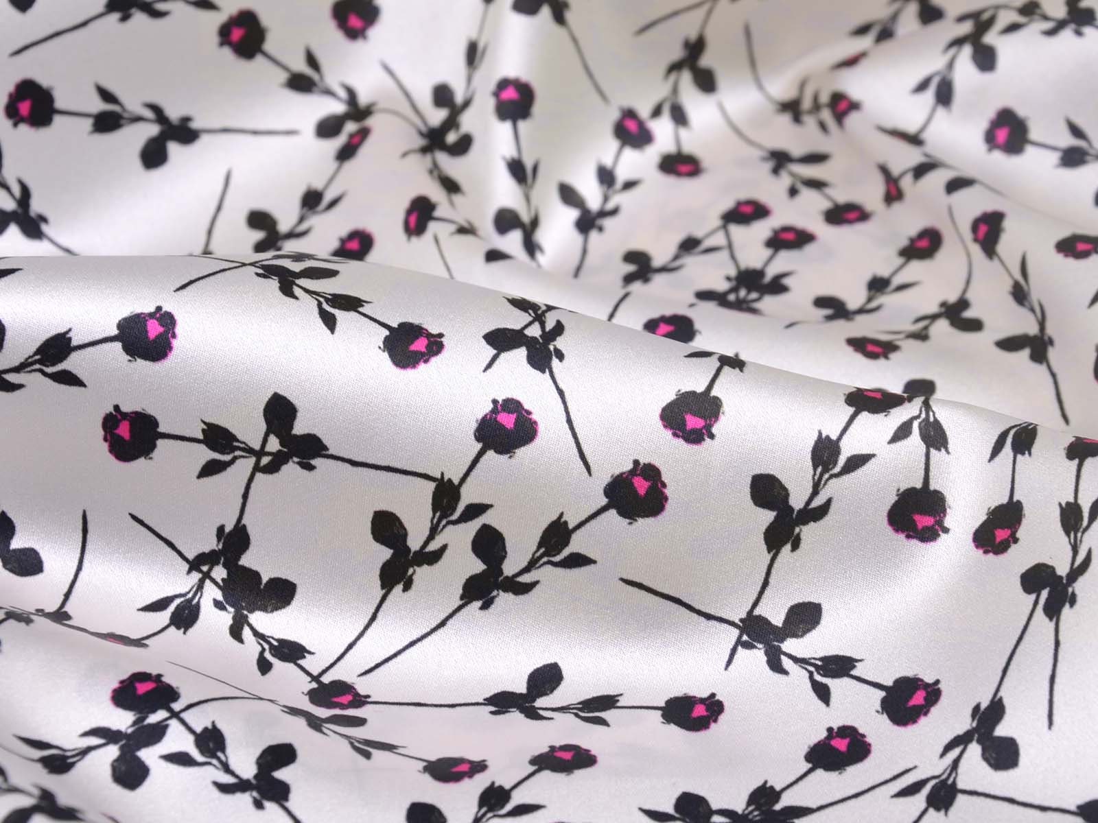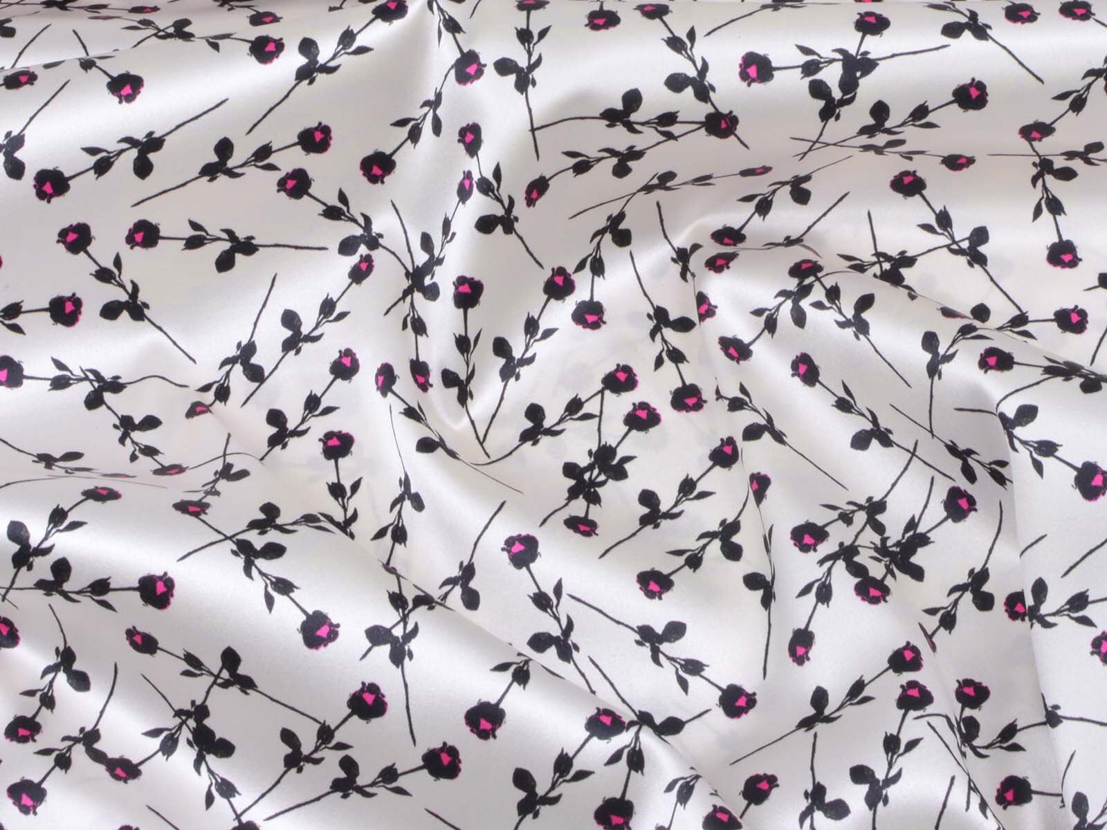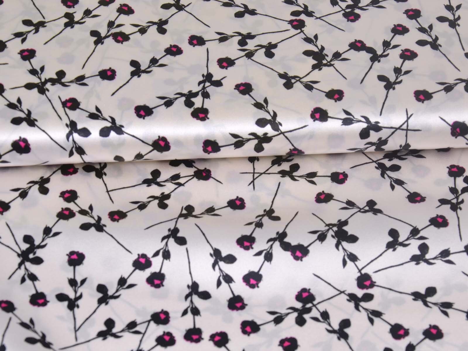 Sehr hochwertige Webware aus Seide mit Stretch. Die Seide ist dünn, glatt, glänzend und hat einen fließenden Fall. Der Stoff ist creme-weiß mit Rosen in schwarz und pink. Nähe dir einzigartige Kleider, Blusen, lange Tops oder Tuniken.