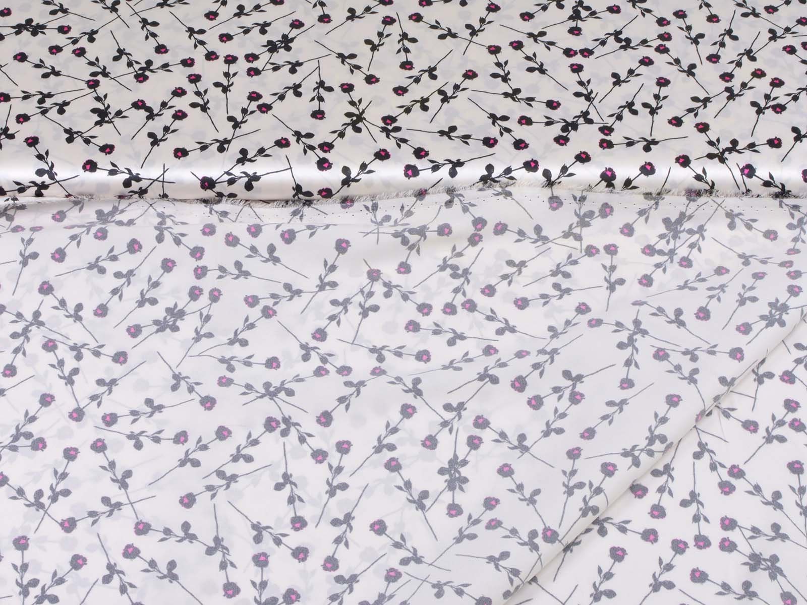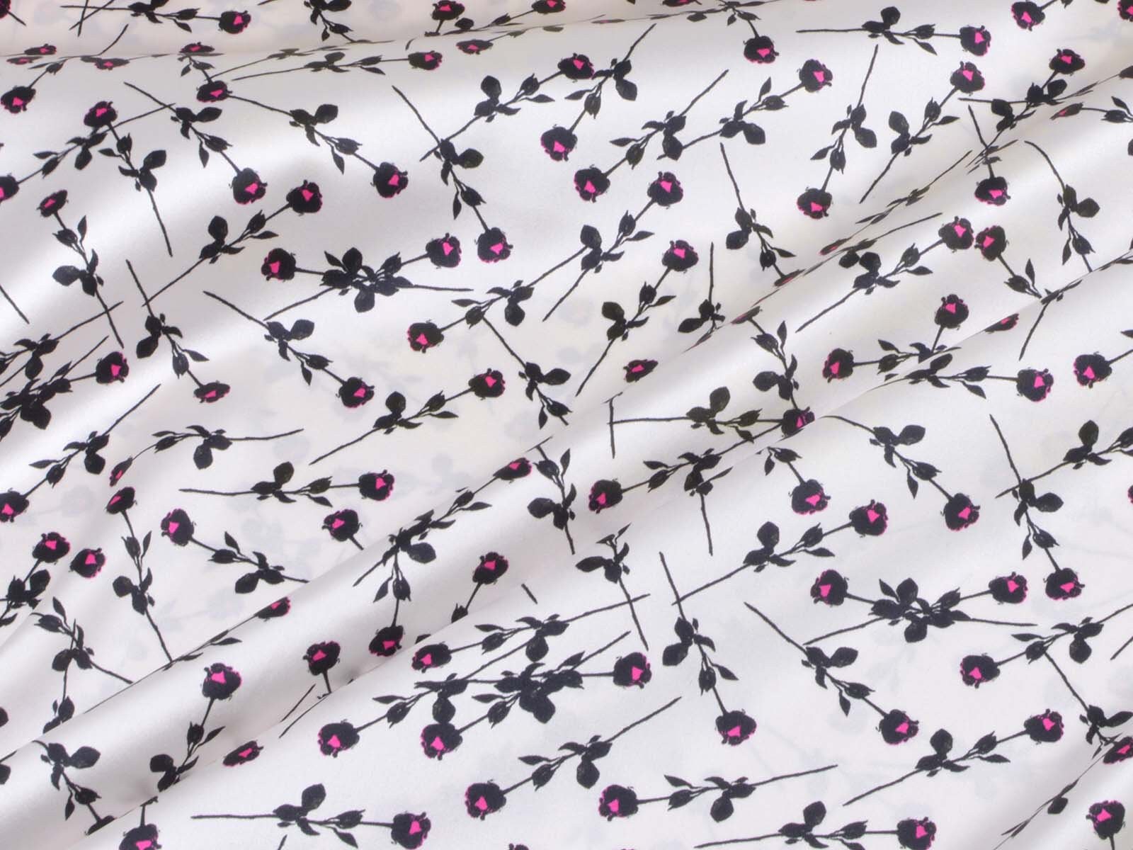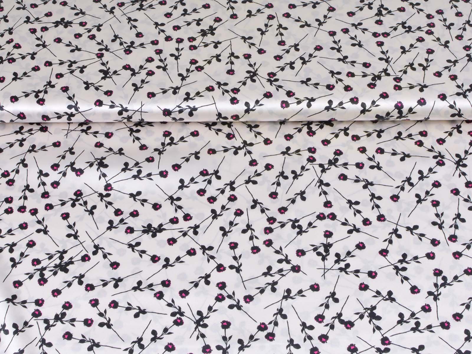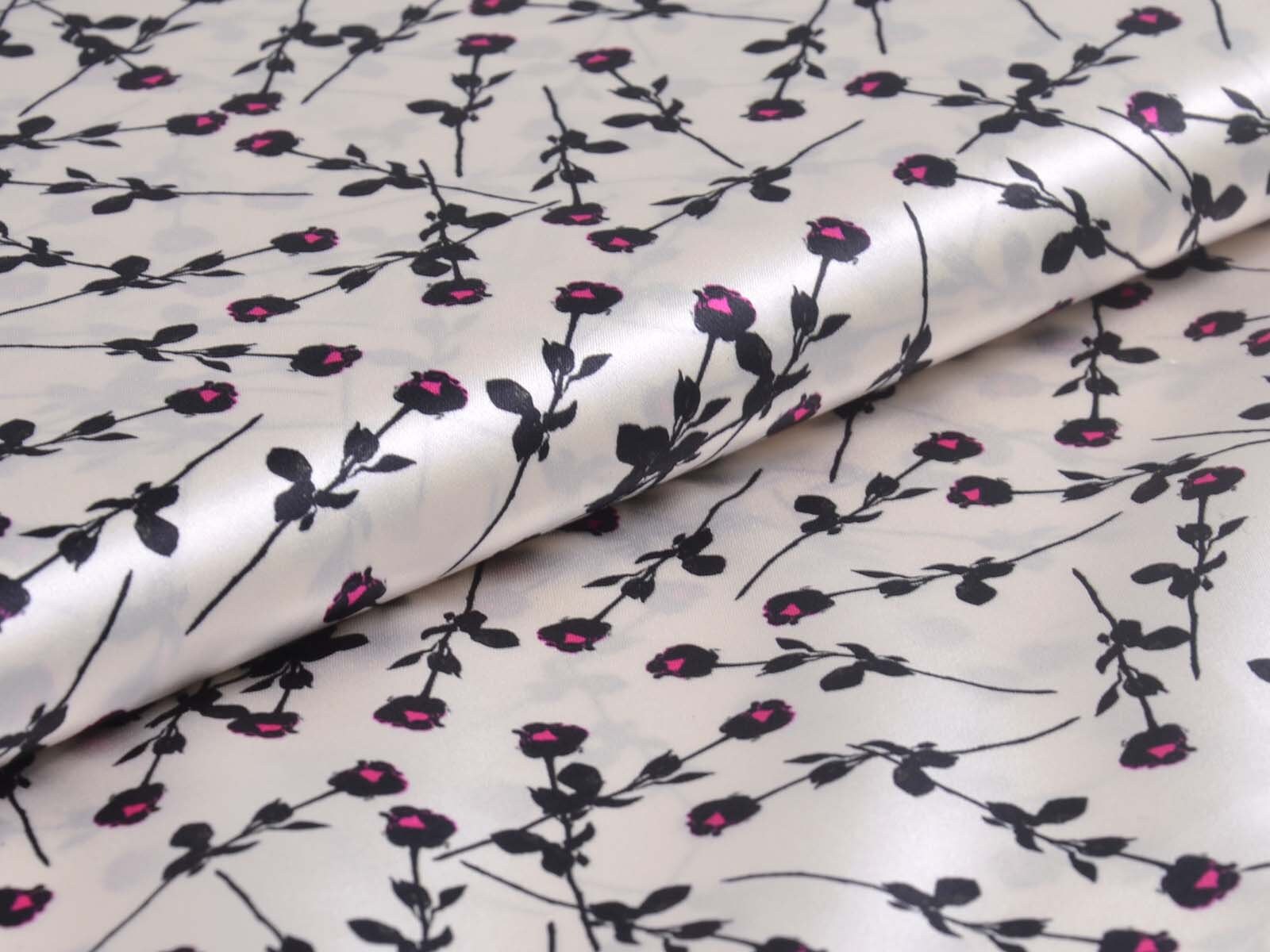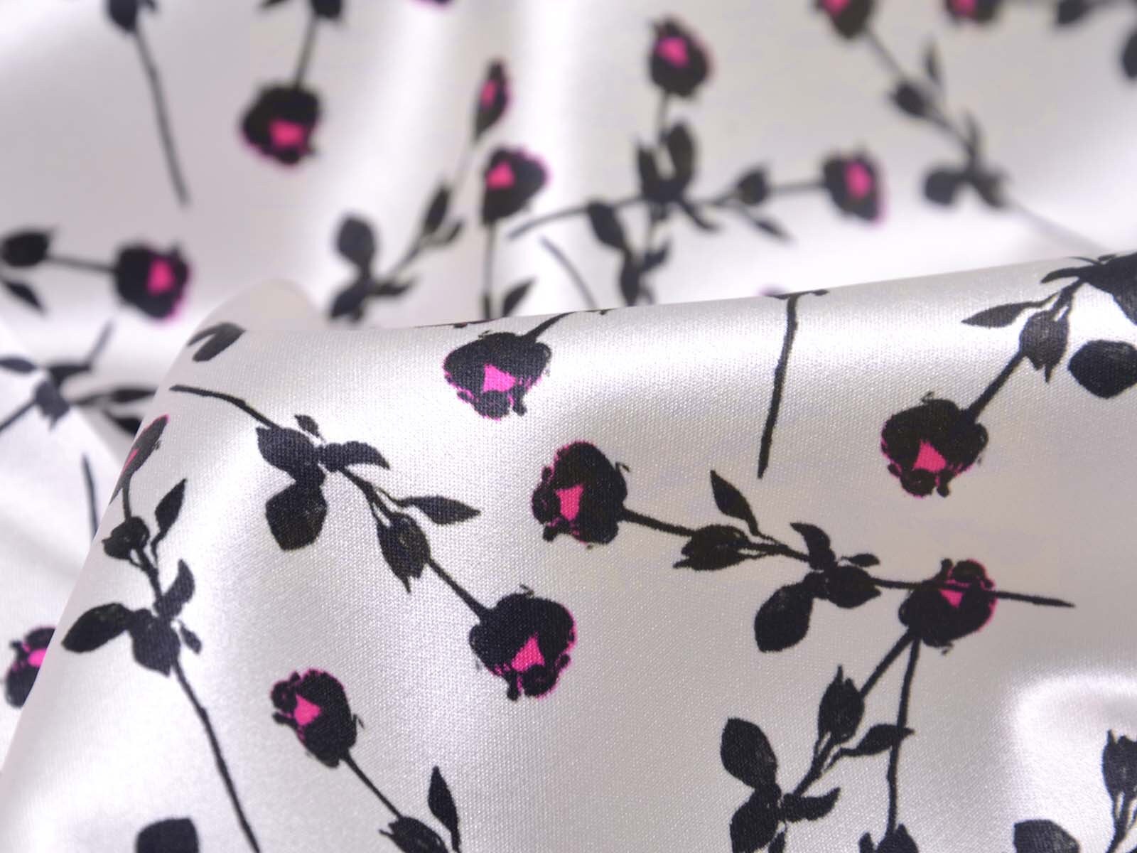Sehr hochwertige Webware aus Seide mit Stretch. Die Seide ist dünn, glatt, glänzend und hat einen fließenden Fall. Der Stoff ist creme-weiß mit Rosen in schwarz und pink. Nähe dir einzigartige Kleider, Blusen, lange Tops oder Tuniken.