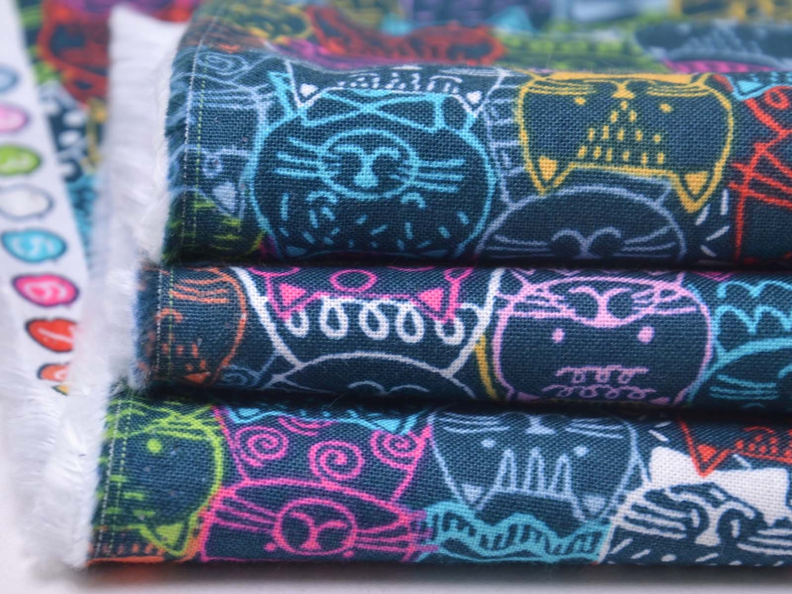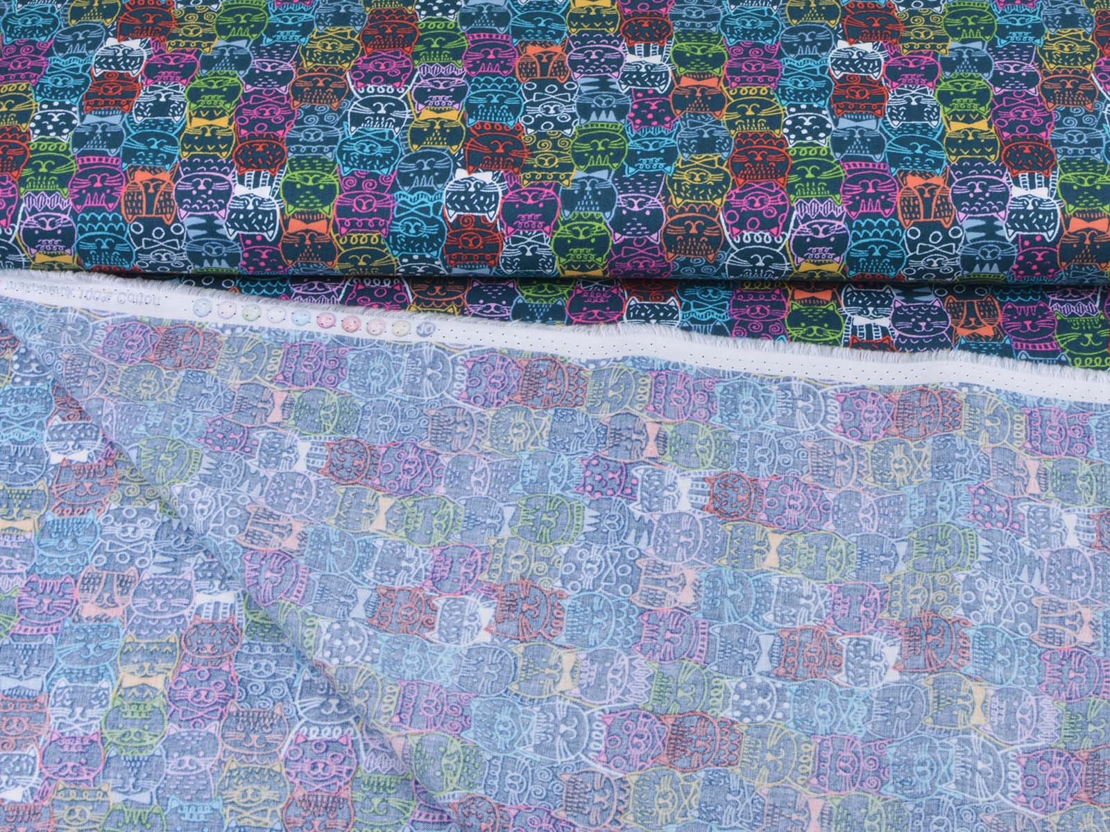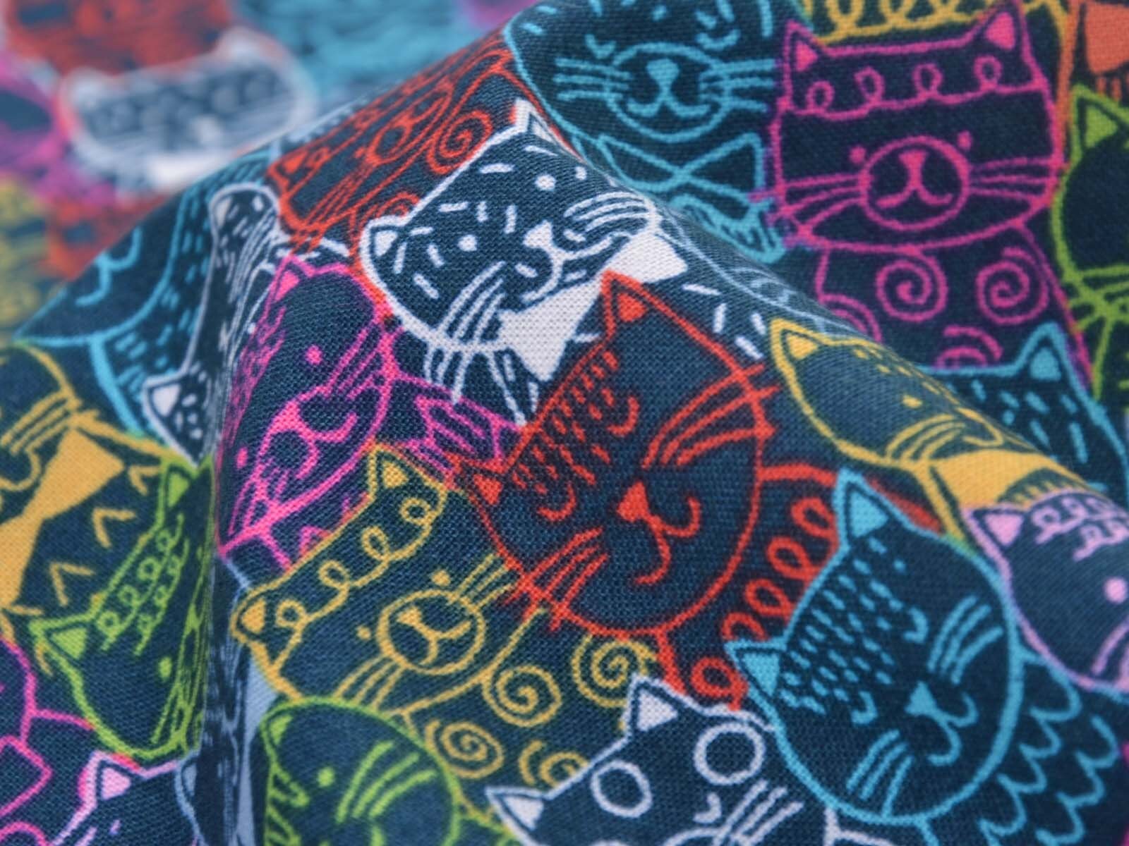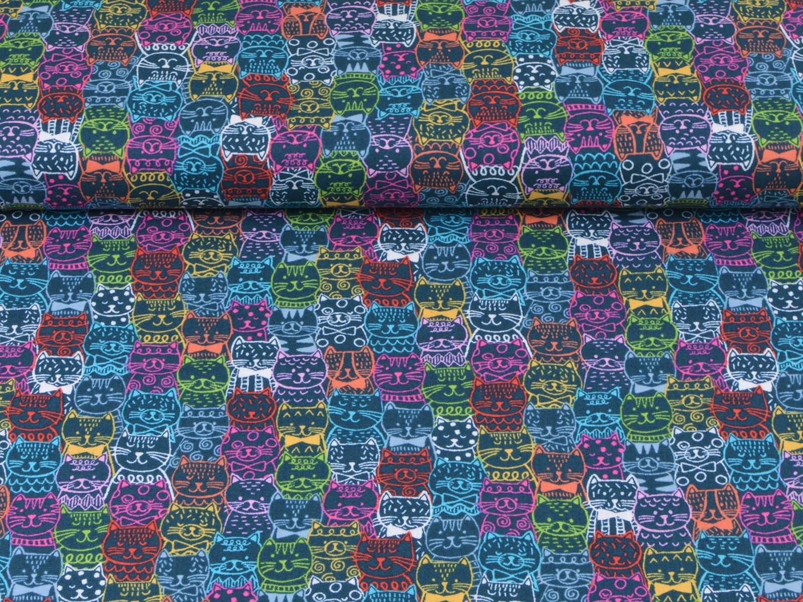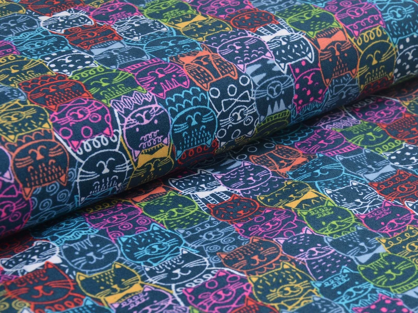 Webware aus Baumwolle von Makower mit Katzengesichtern in blau, gelb, grün, weiß und rot. Der Stoff fühlt sich glatt an. Er eignet sich wunderbar zum Nähen von Taschen, Kissen und zum Patchworken.