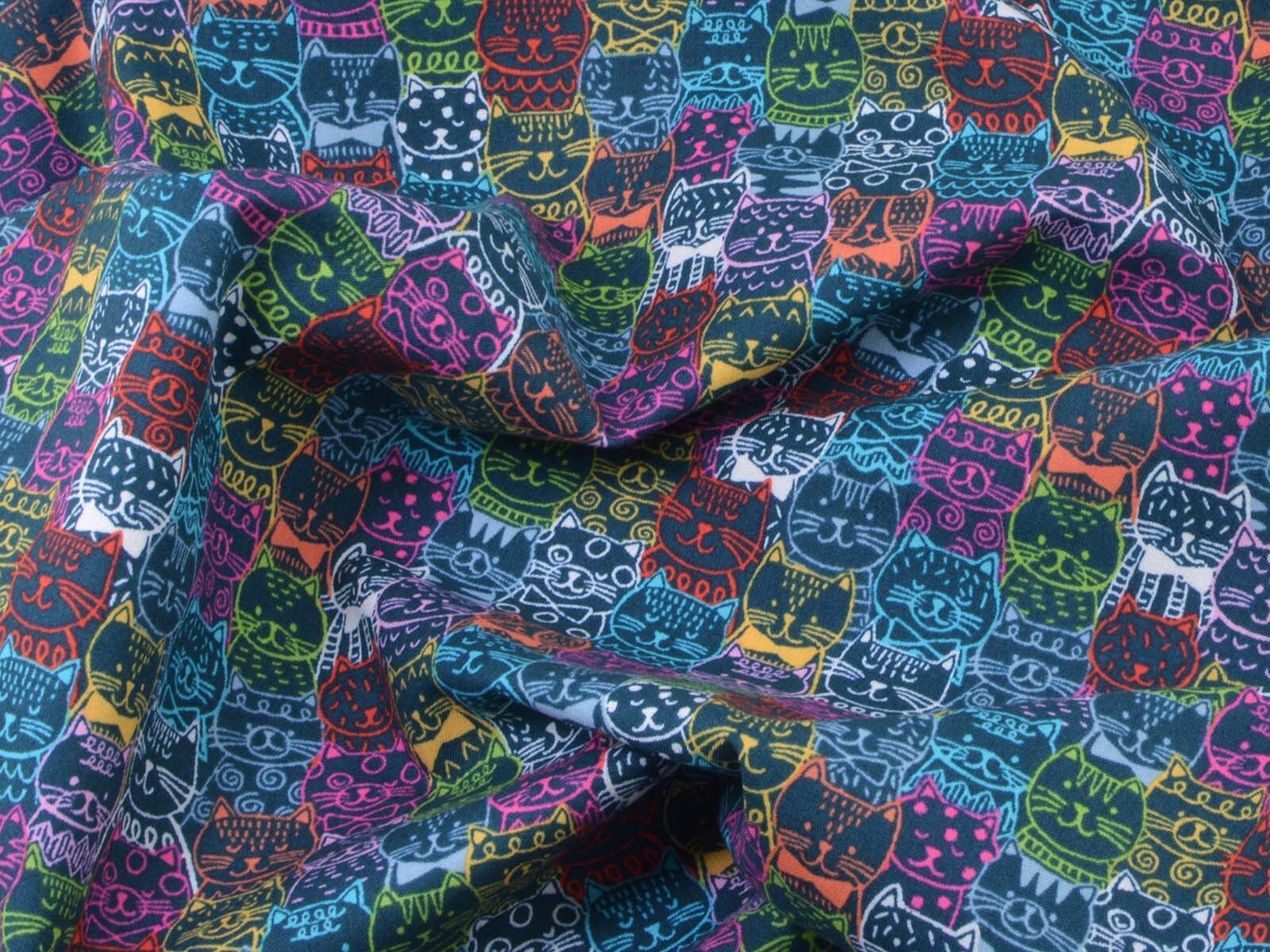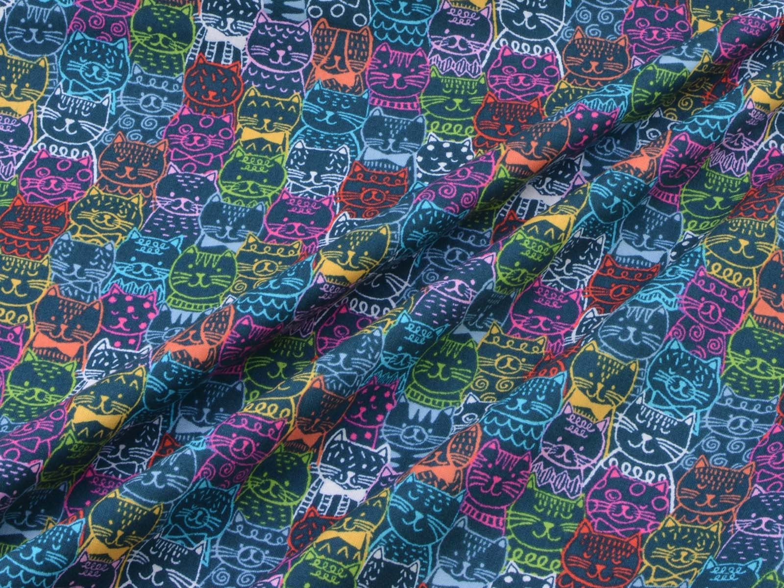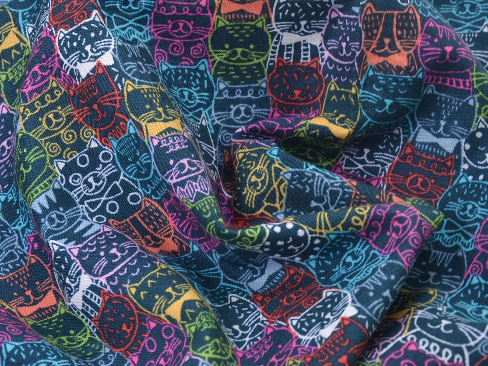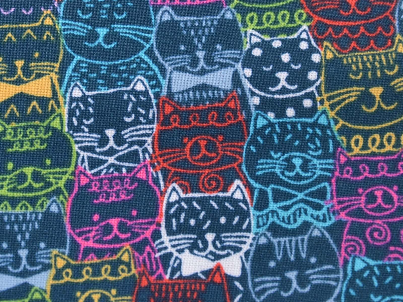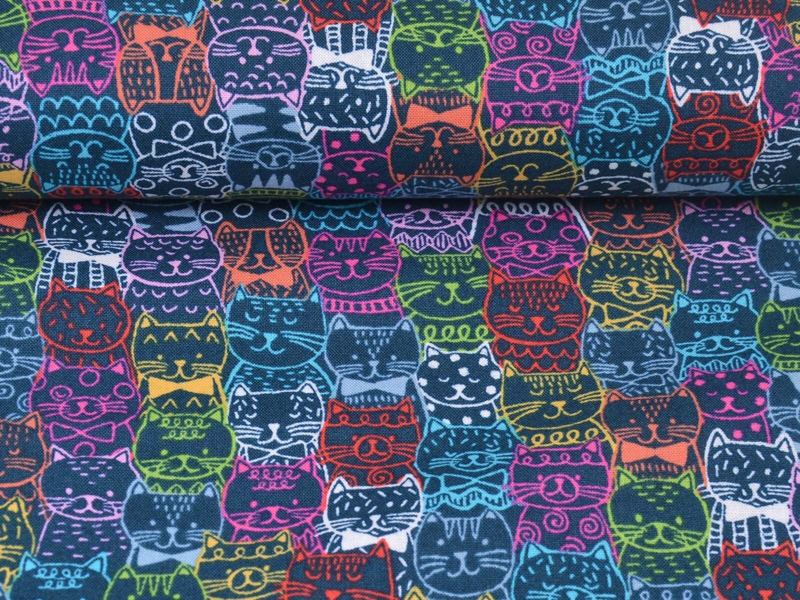 Webware aus Baumwolle von Makower mit Katzengesichtern in blau, gelb, grün, weiß und rot. Der Stoff fühlt sich glatt an. Er eignet sich wunderbar zum Nähen von Taschen, Kissen und zum Patchworken.