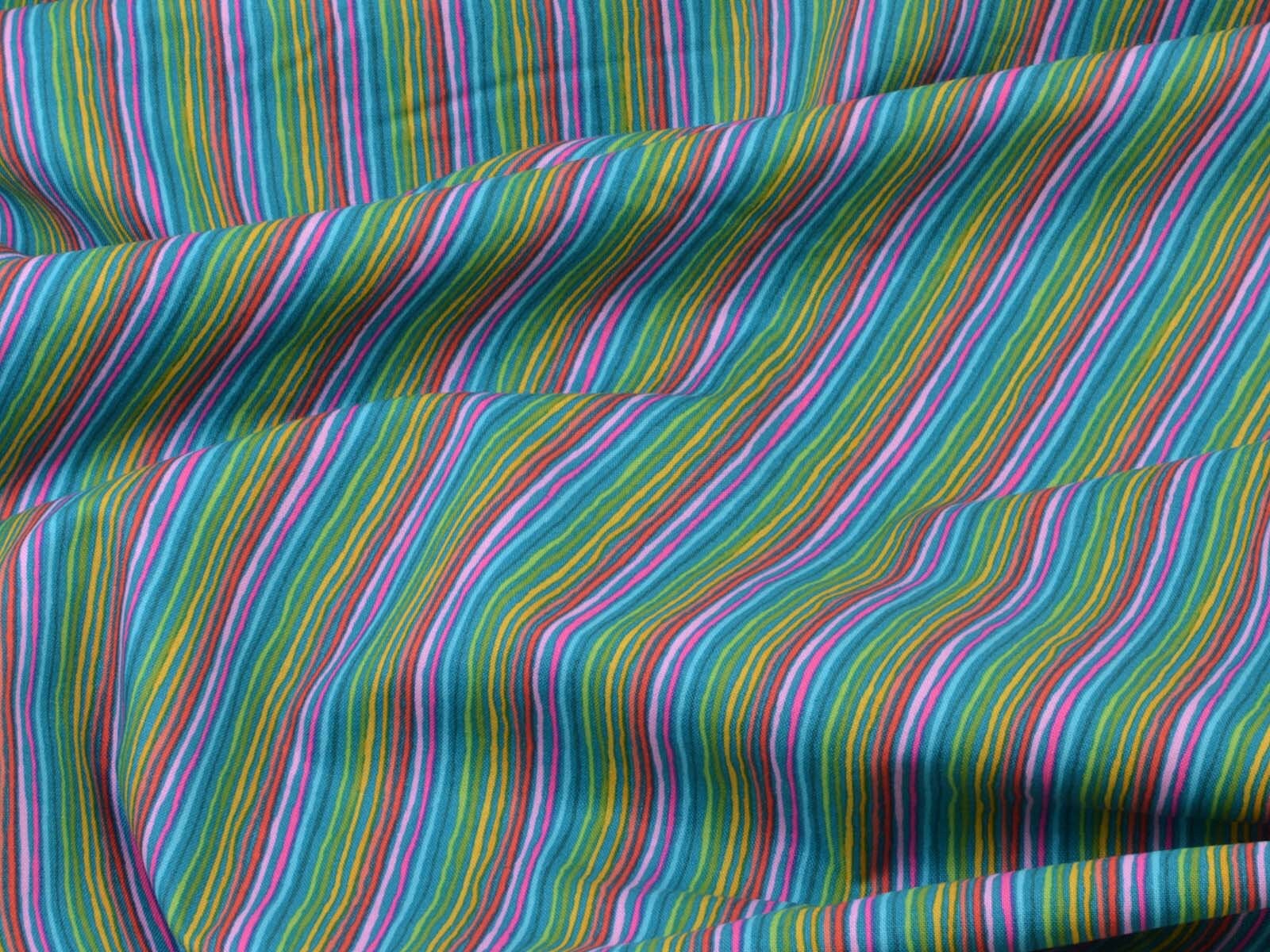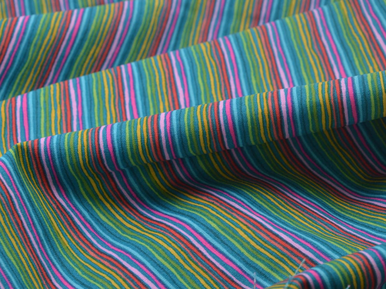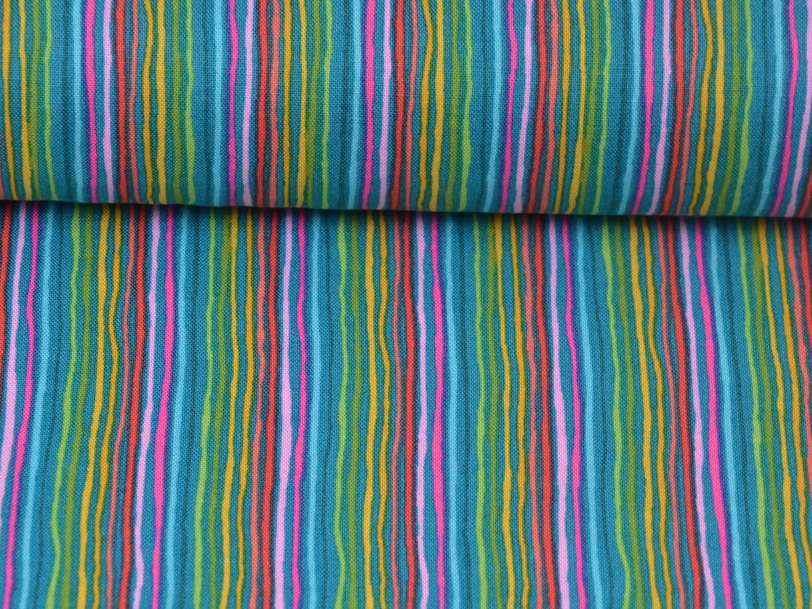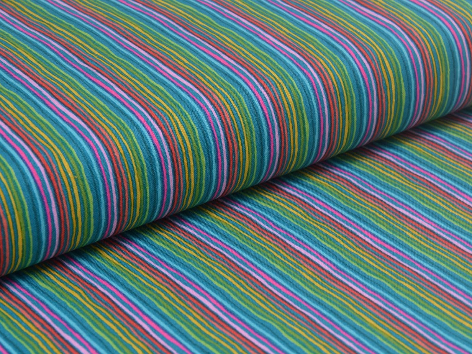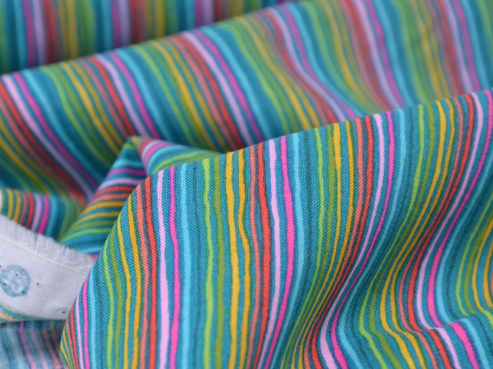 Webware aus Baumwolle von Makower mit Streifen in rosa, pink, blau, grün, gelb und rot. Der Stoff fühlt sich glatt an. Er eignet sich wunderbar zum Nähen von Taschen, Kissen und zum Patchworken.