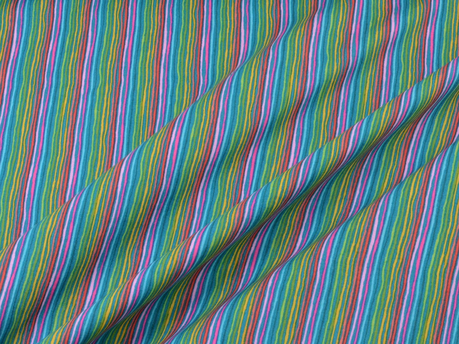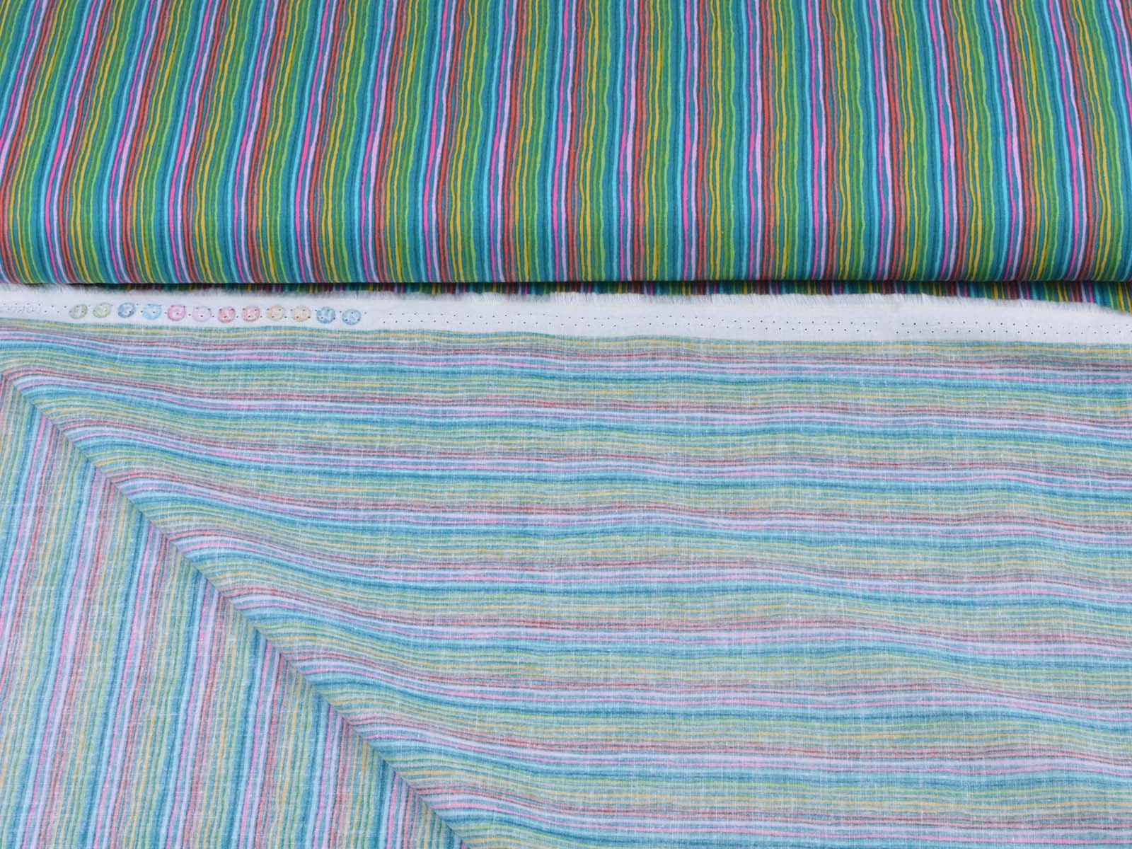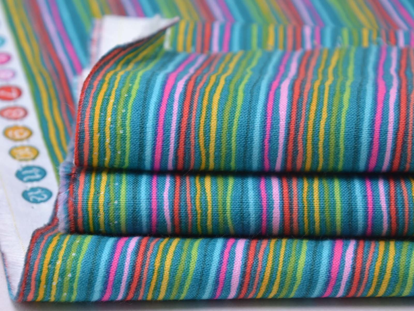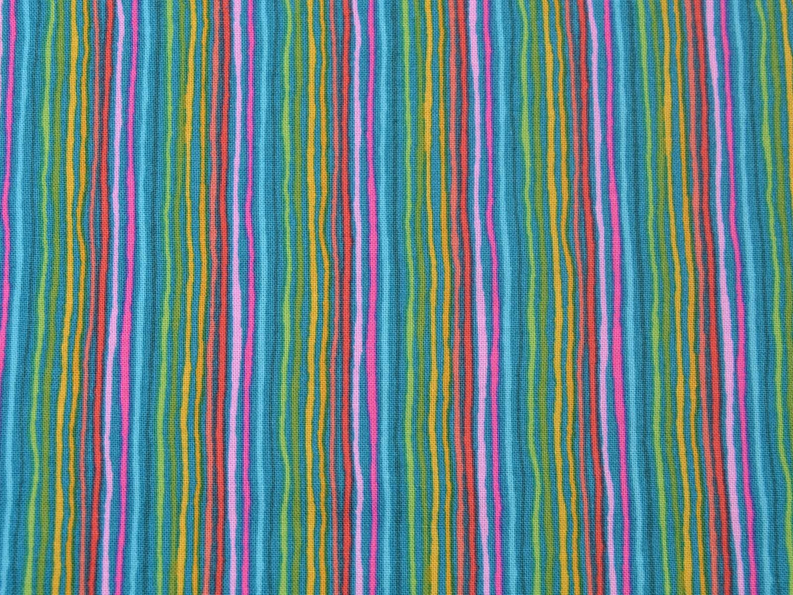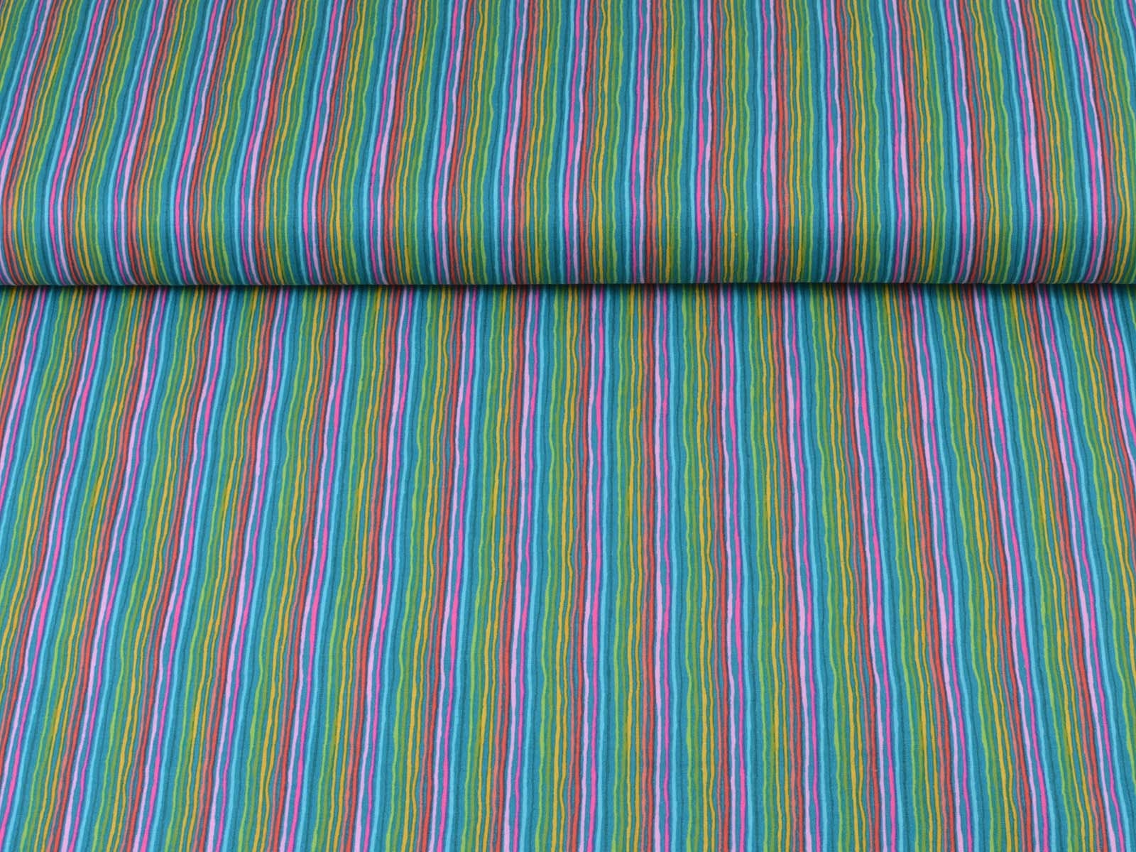 Webware aus Baumwolle von Makower mit Streifen in rosa, pink, blau, grün, gelb und rot. Der Stoff fühlt sich glatt an. Er eignet sich wunderbar zum Nähen von Taschen, Kissen und zum Patchworken.
