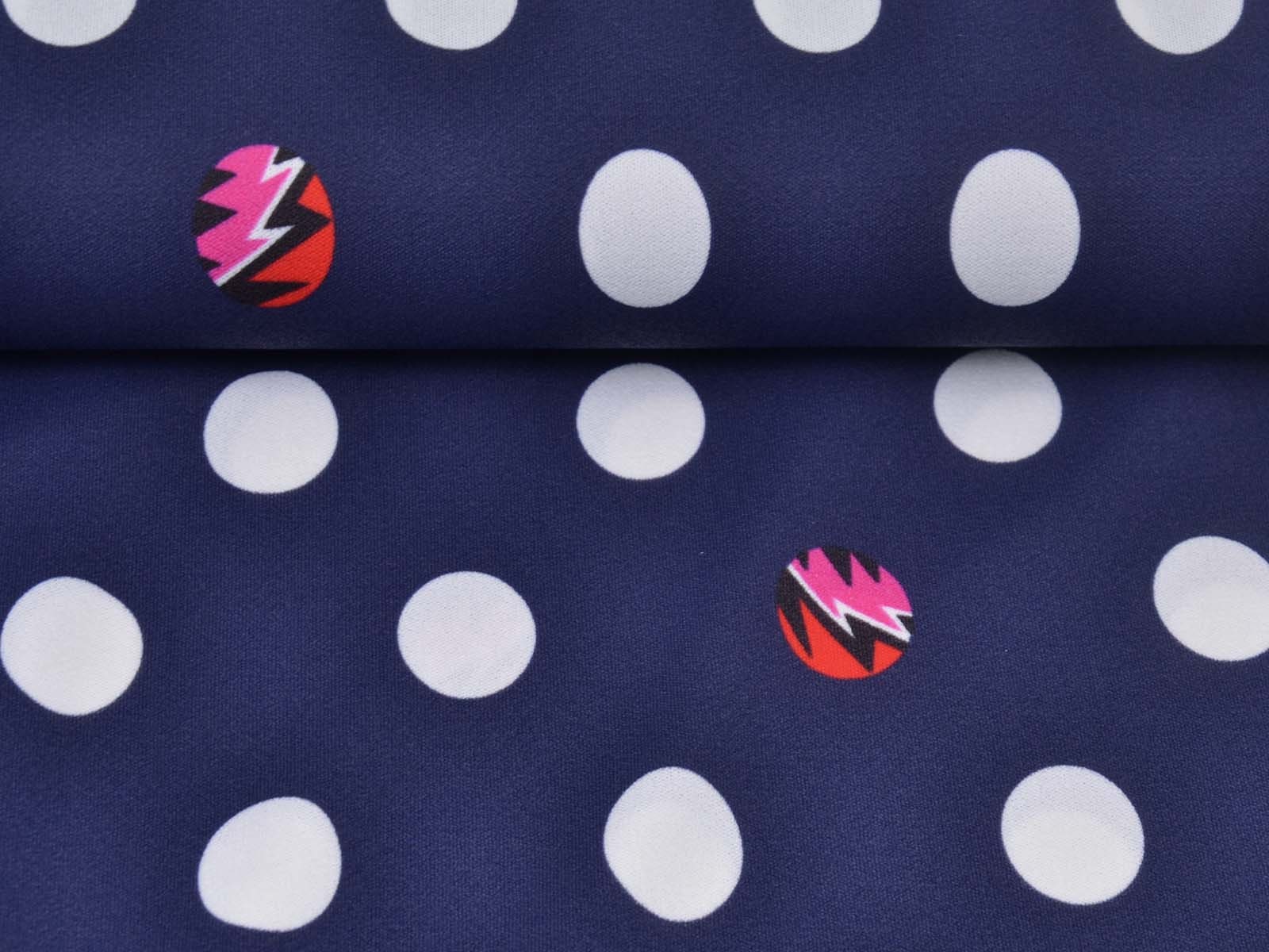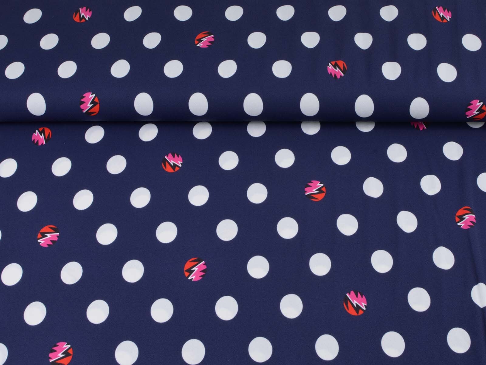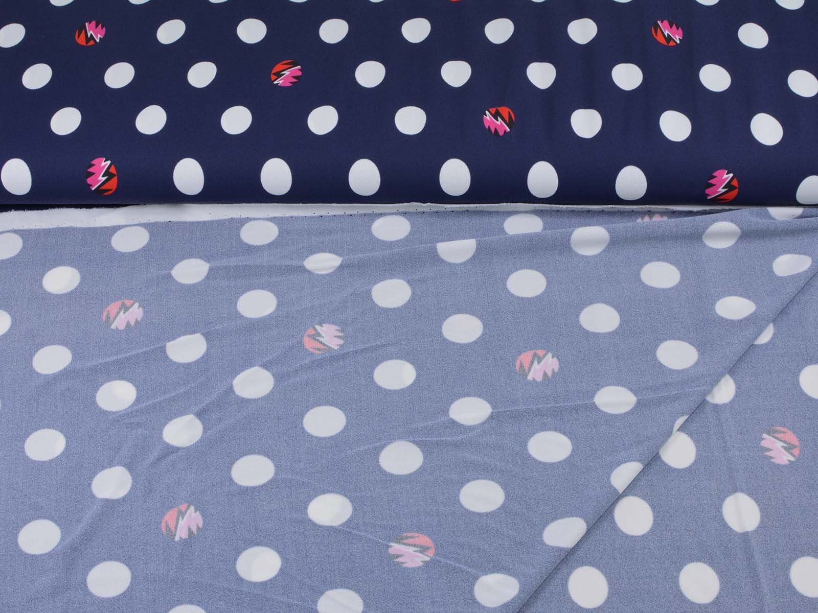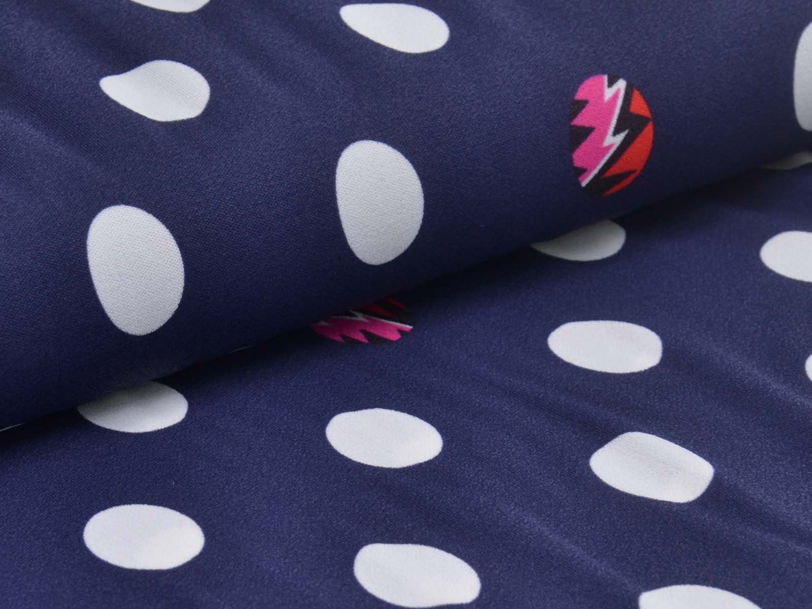 Jersey aus Viskose auch kalte Viskose genannt. Der Stoff ist dunkelblau mit weißen Punkten. Kalte Viskose fühlt sich kühlend an. Der Stoff ist schwer und hat einen fließenden Fall. Er eignet sich zum Nähen von T-Shirts, Kleidern und vielem mehr.