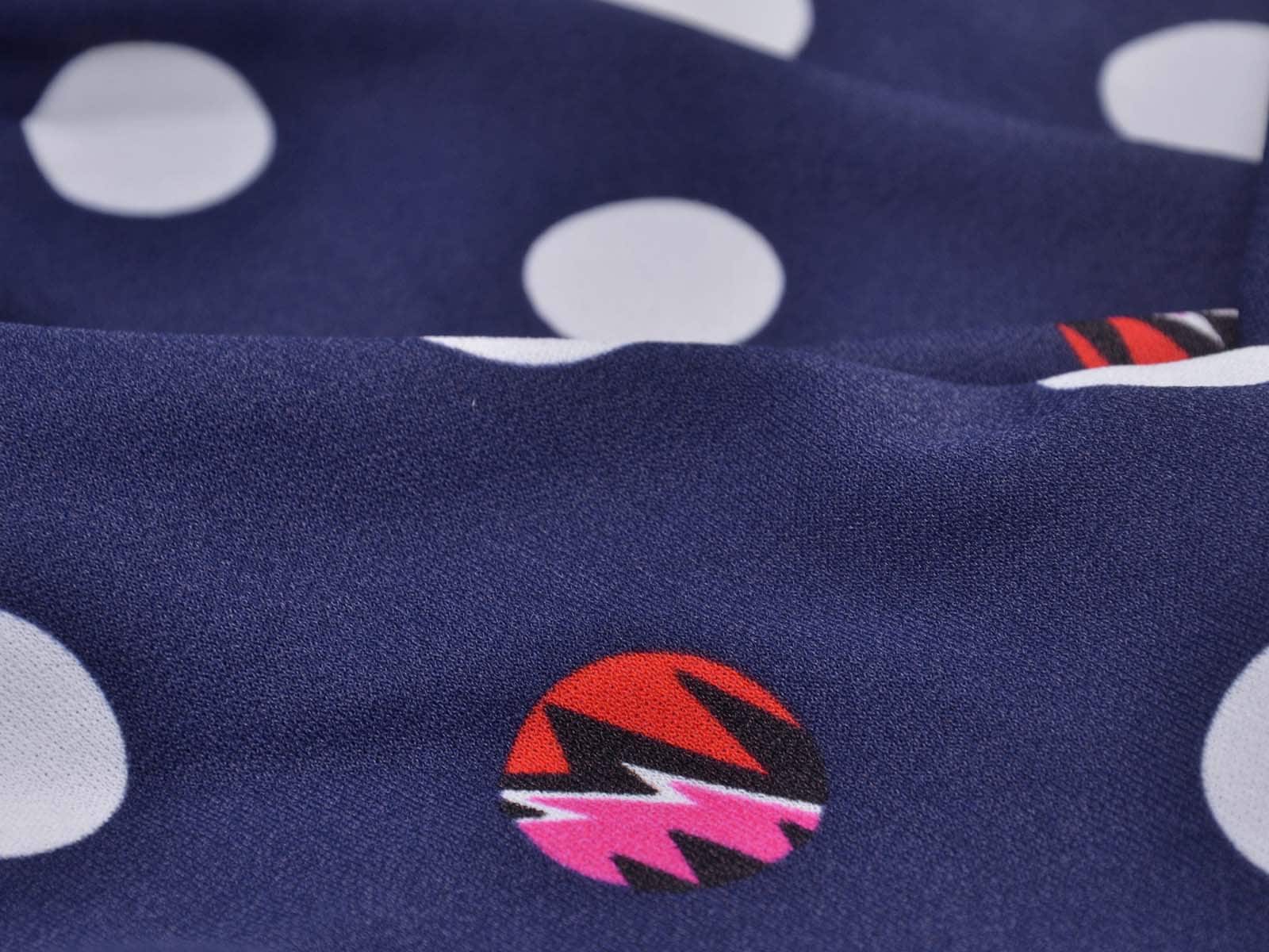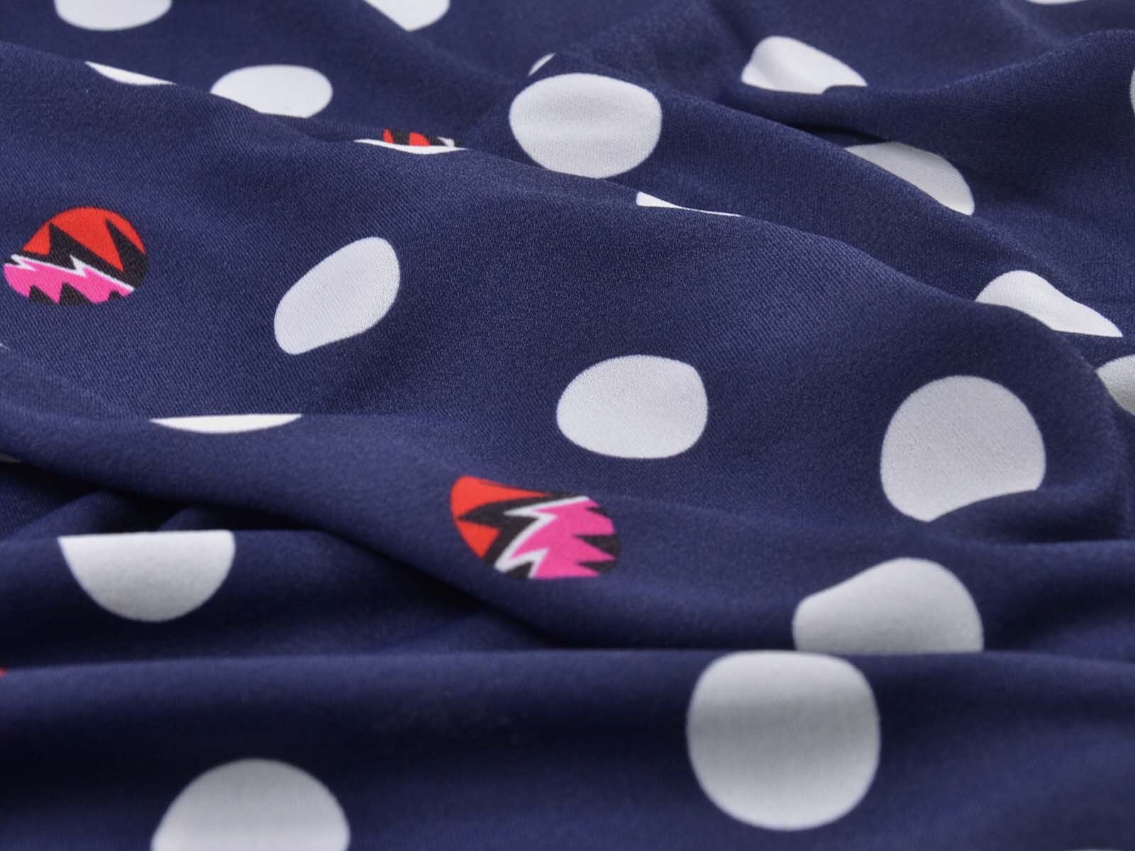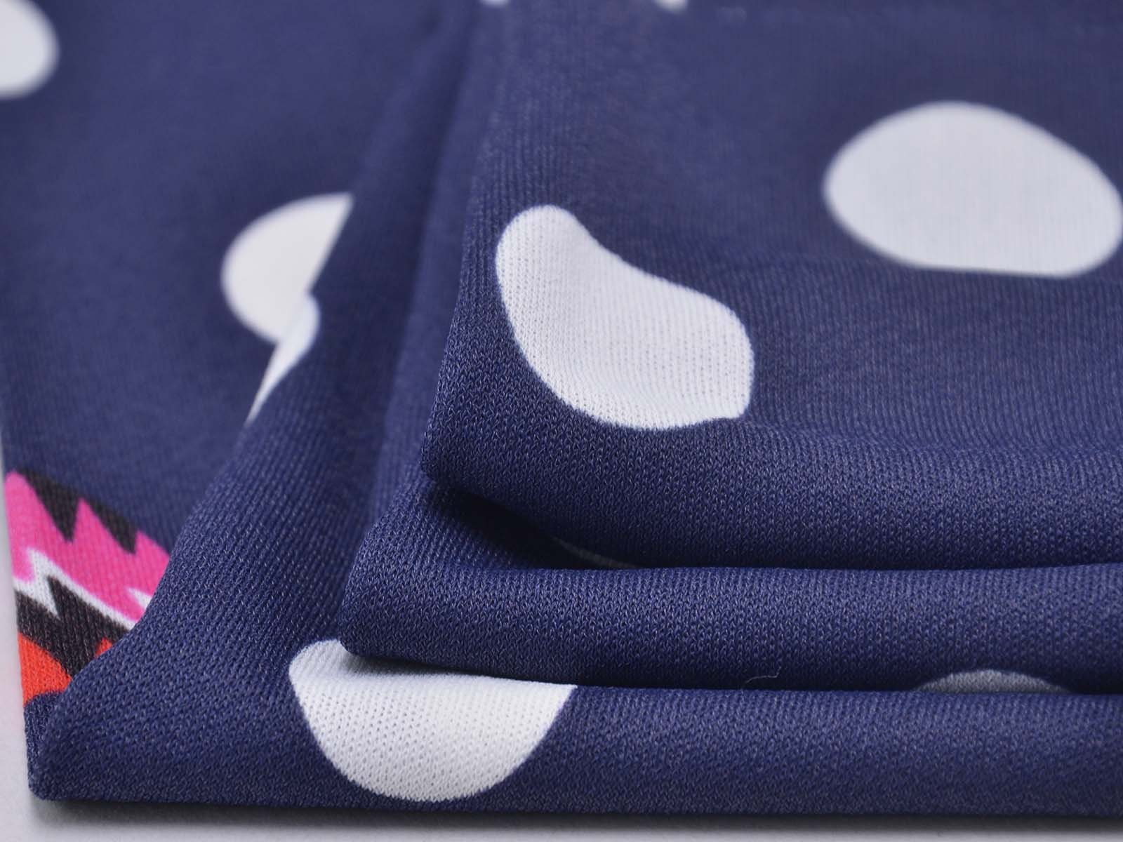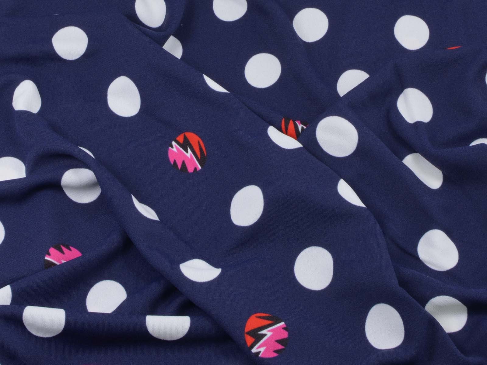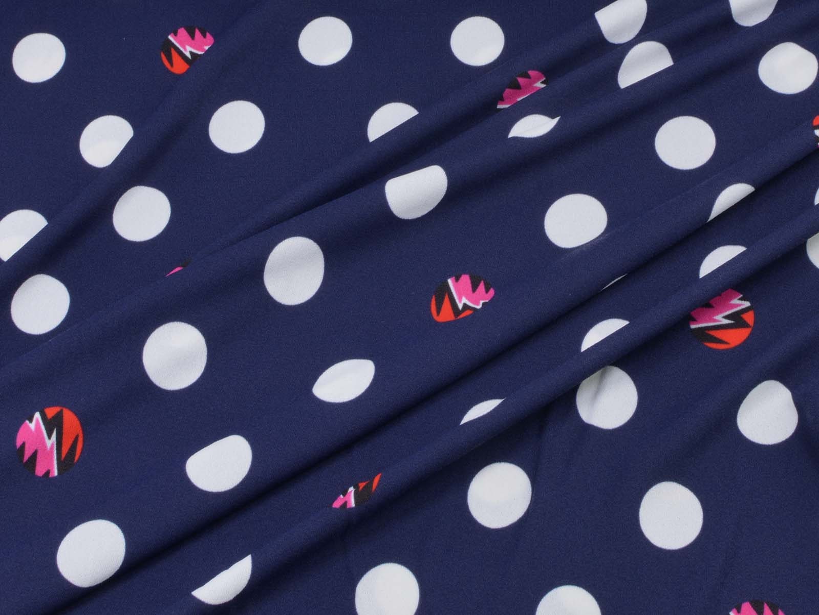 Jersey aus Viskose auch kalte Viskose genannt. Der Stoff ist dunkelblau mit weißen Punkten. Kalte Viskose fühlt sich kühlend an. Der Stoff ist schwer und hat einen fließenden Fall. Er eignet sich zum Nähen von T-Shirts, Kleidern und vielem mehr.