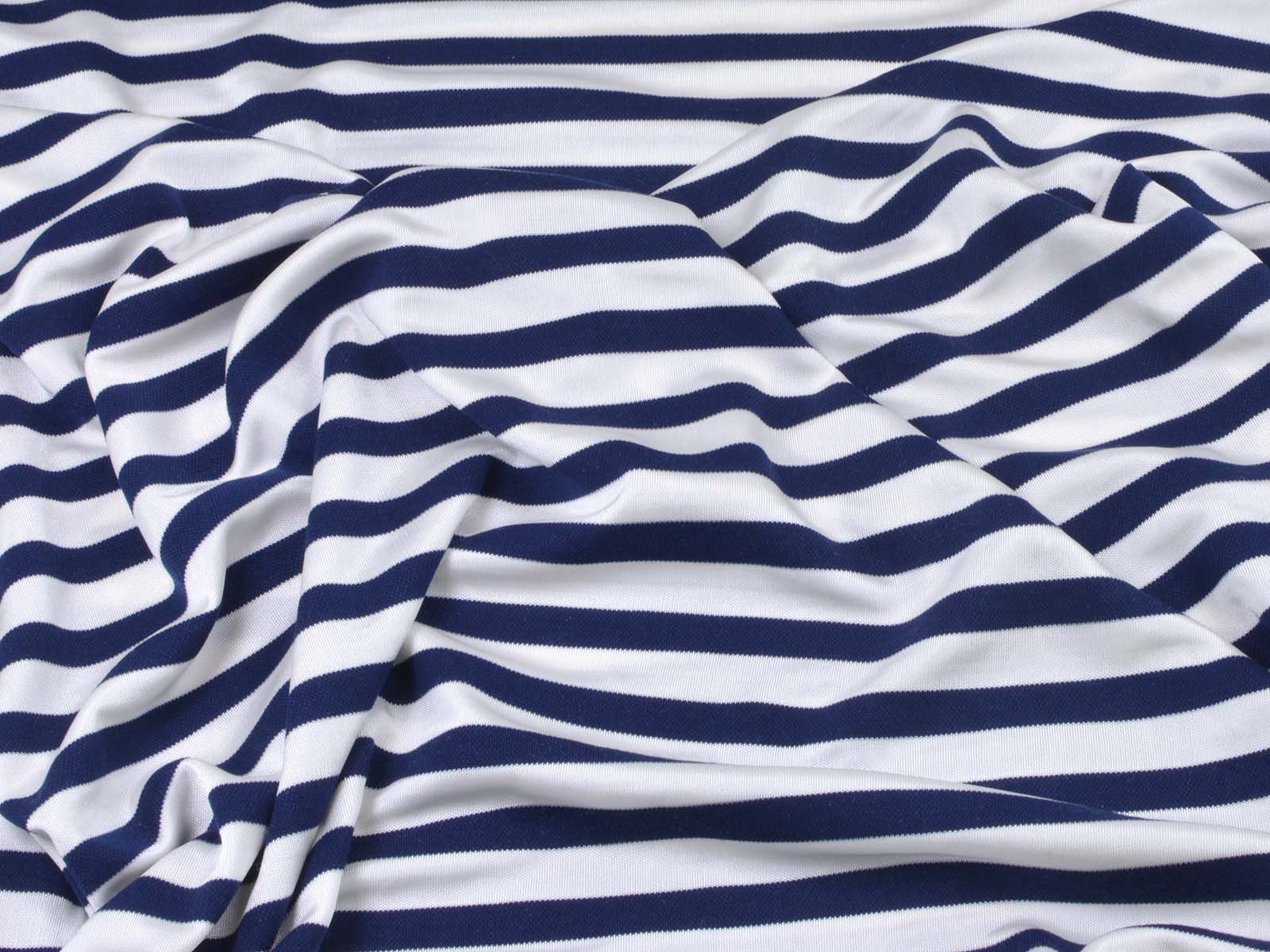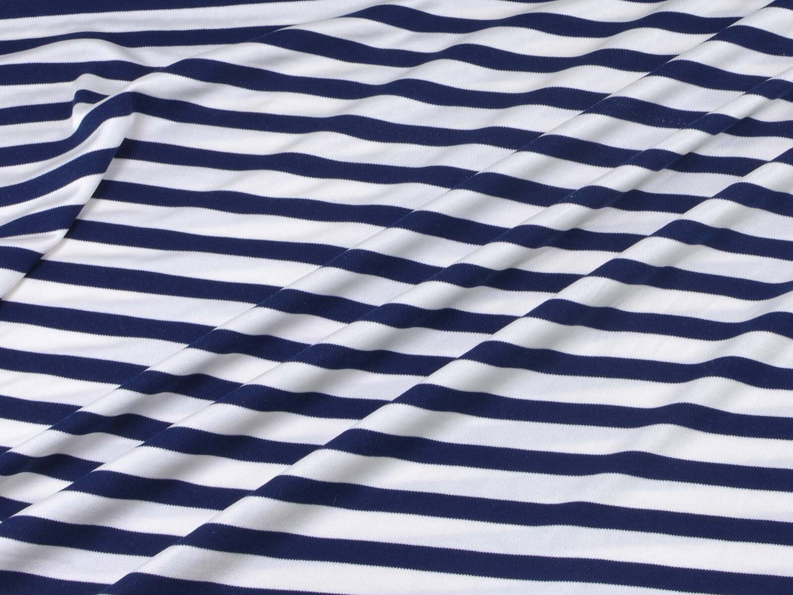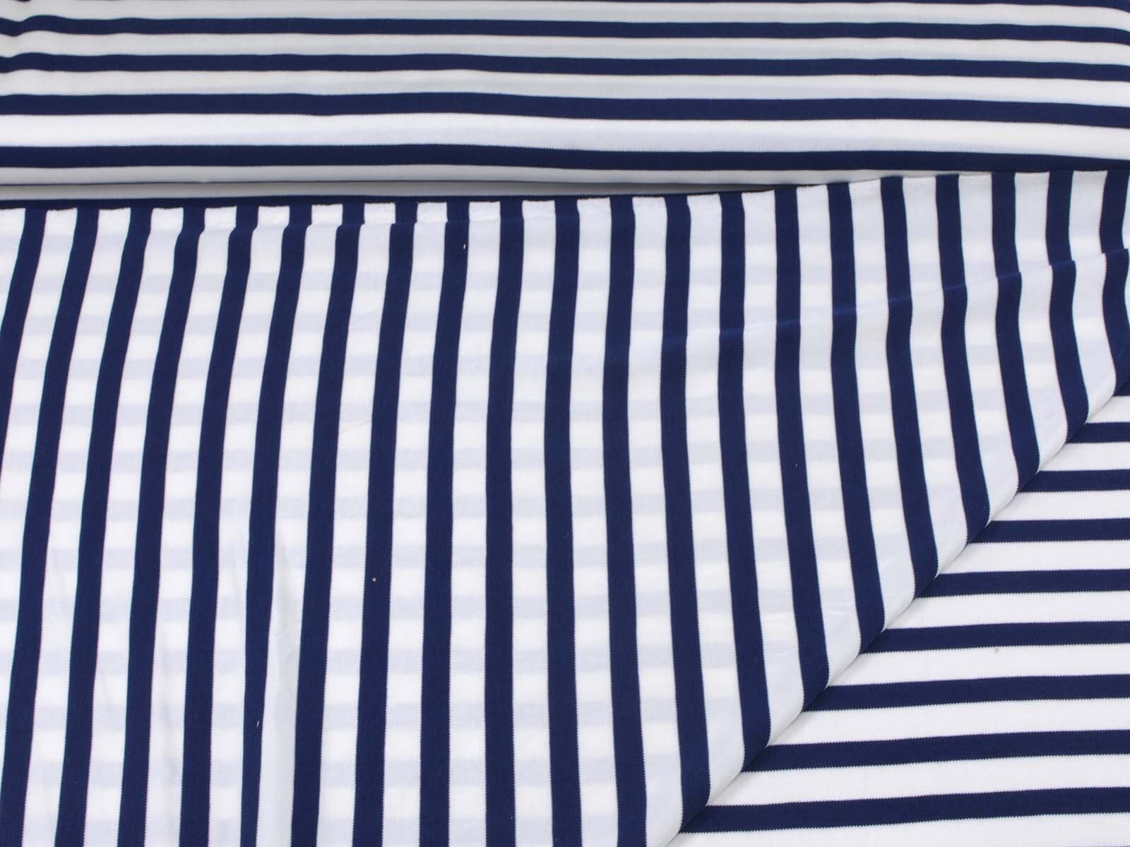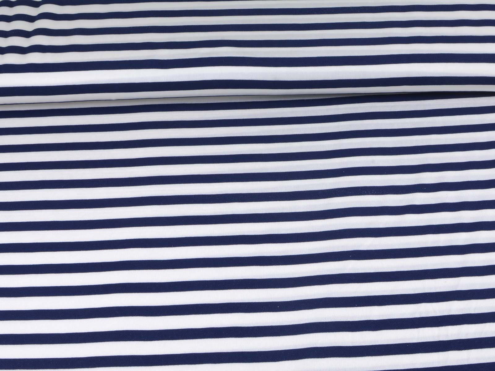 Dünner Jersey aus 100% Viskose. Der Stoff ist glatt, gestreift und hat einen fließenden Fall. Der weiße Streifen ist ca. 1,4 cm breit, der blaue Streifen ist ca. 1,1 cm breit. Nähe dir aus dem Stoff tolle Sommershirts, fließende Kleider und vieles mehr.