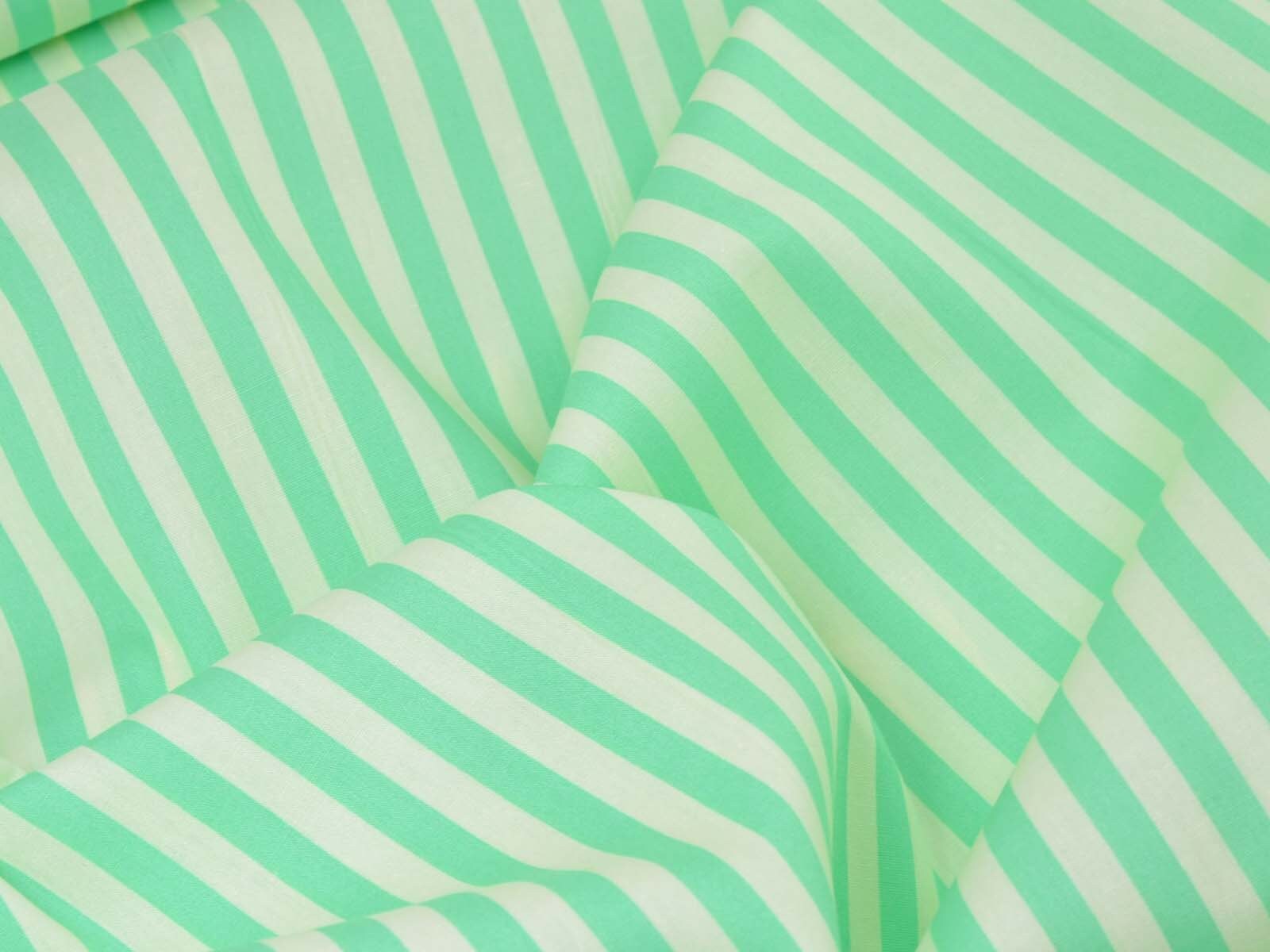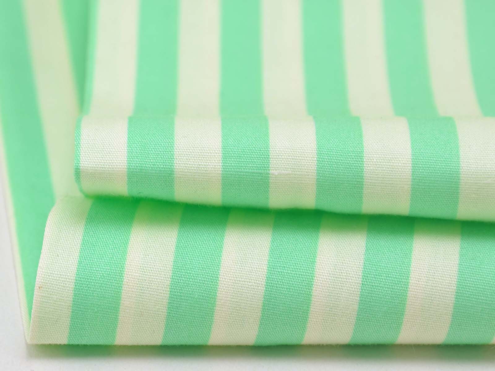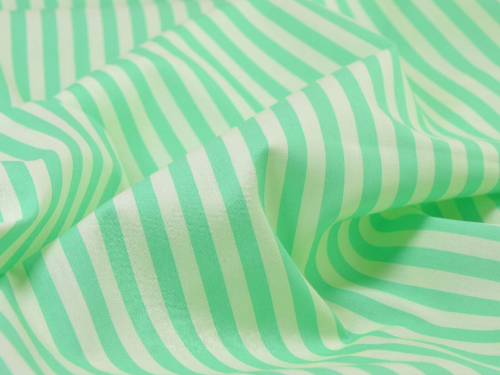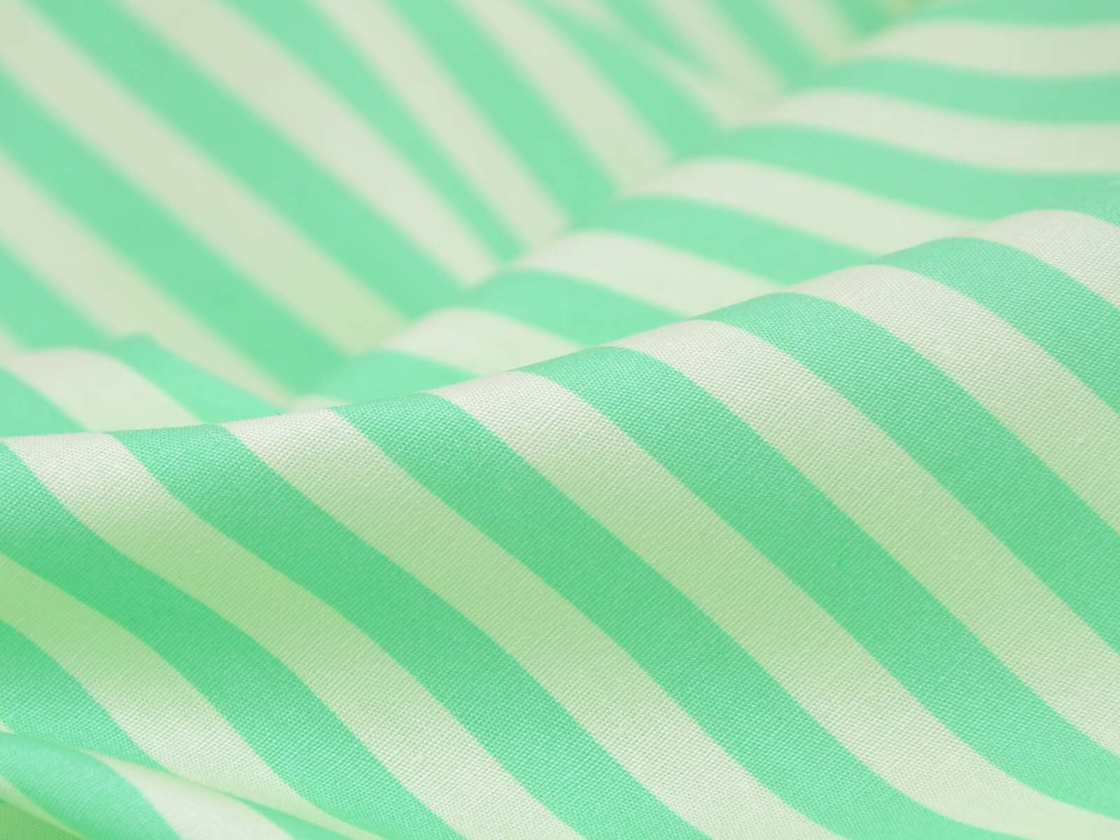 Popeline aus 100% Baumwolle mit grünen und creme-weißen Streifen. Das ist der Originalstoff für das Modell „Christine“ aus der Fibre Mood Nr. 29. Ein Streifen ist ca. 7 mm breit. Der Stoff fühlt sich glatt an und eignet sich wunderbar zum Nähen von Sommerkleidern, Röcken, leichten Hosen, Shorts und vielem mehr.