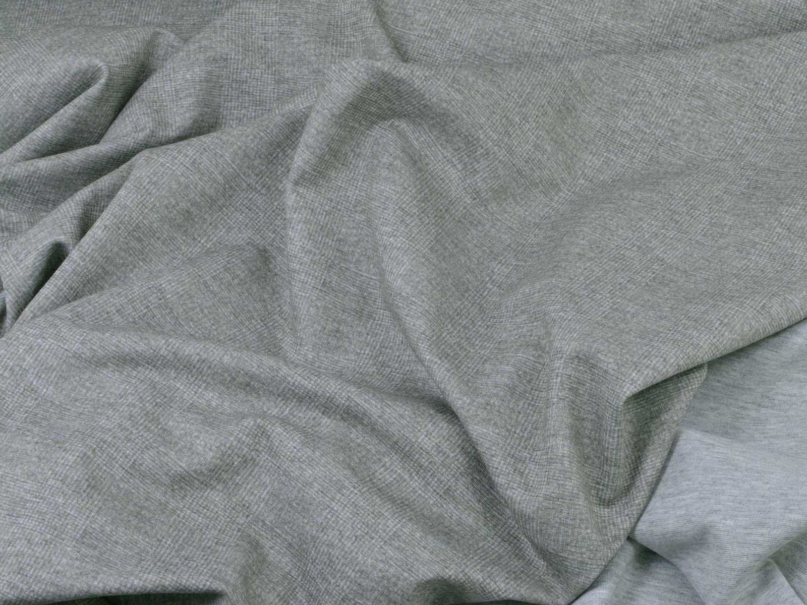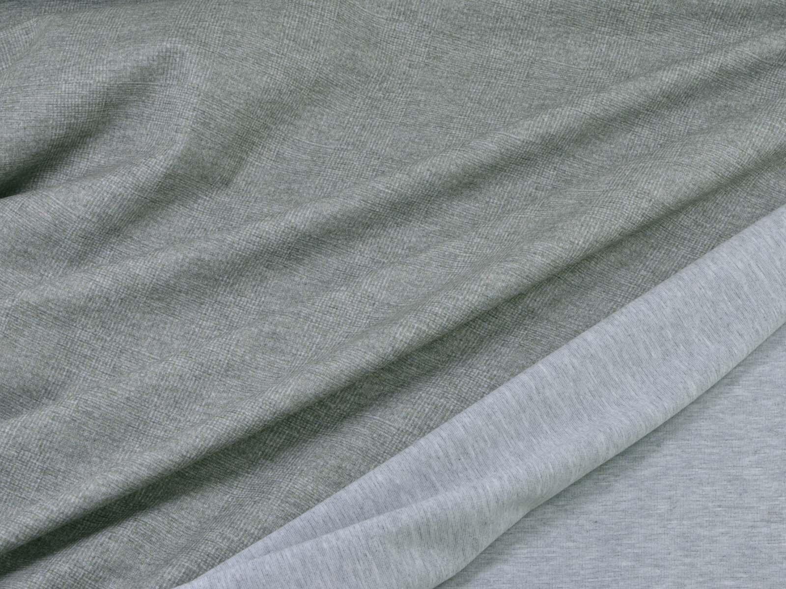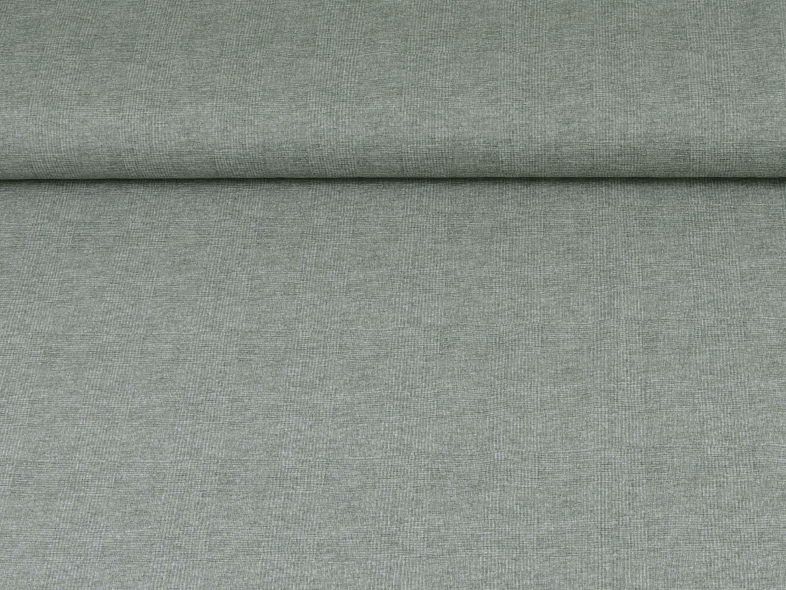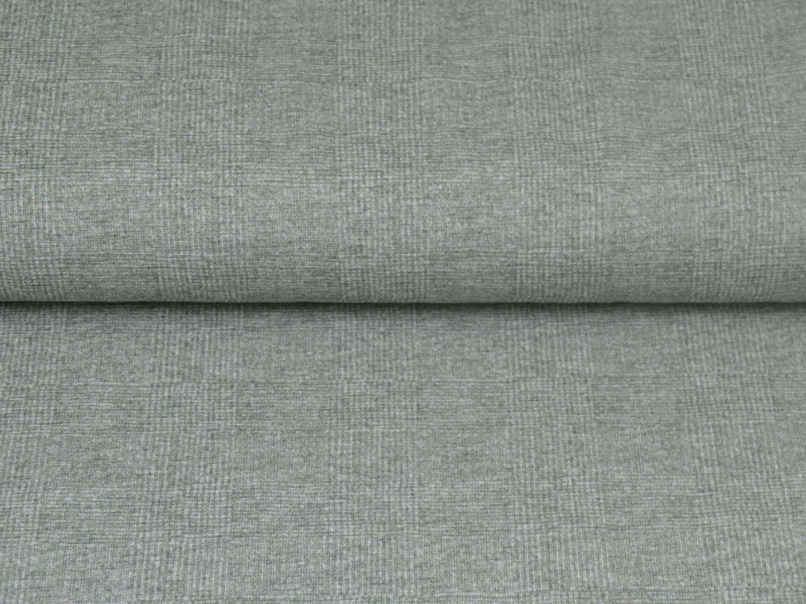 Romanit Jersey aus Baumwolle in grau, grün mit Karos. Der Stoff ist beidseitig verwendbar, die andere Seite ist hellgrau meliert. Der Stoff ist glatt, fest und mittelschwer. Er eignet sich wunderbar zum Nähen von engen Kleidern, engen Röcken, modernen Blazern, gemütlichen Hosen und vielem mehr.