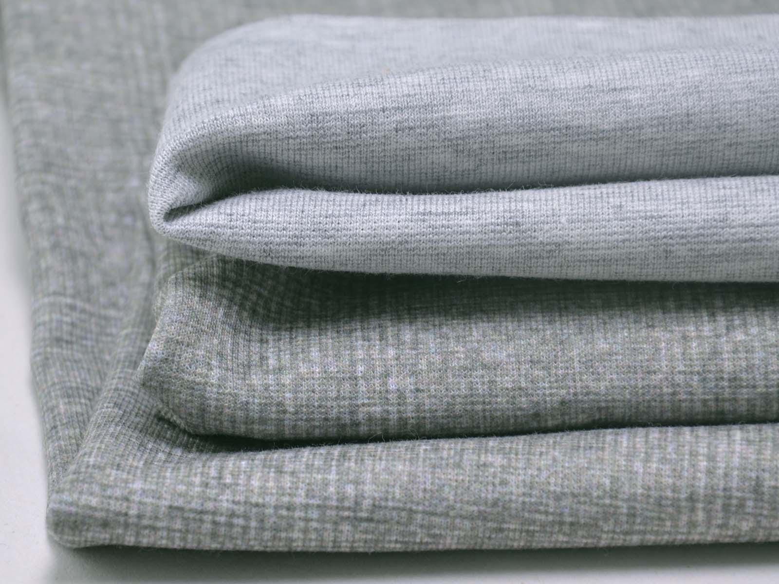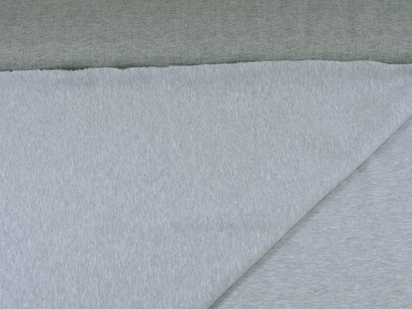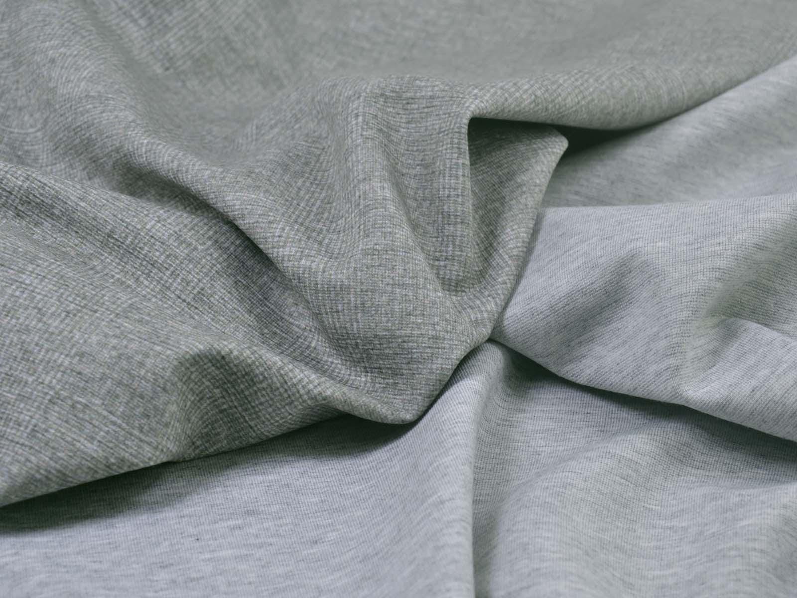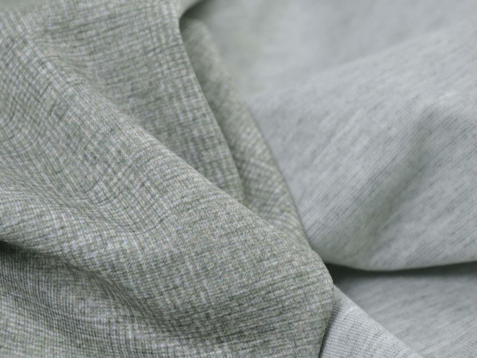 Romanit Jersey aus Baumwolle in grau, grün mit Karos. Der Stoff ist beidseitig verwendbar, die andere Seite ist hellgrau meliert. Der Stoff ist glatt, fest und mittelschwer. Er eignet sich wunderbar zum Nähen von engen Kleidern, engen Röcken, modernen Blazern, gemütlichen Hosen und vielem mehr.
