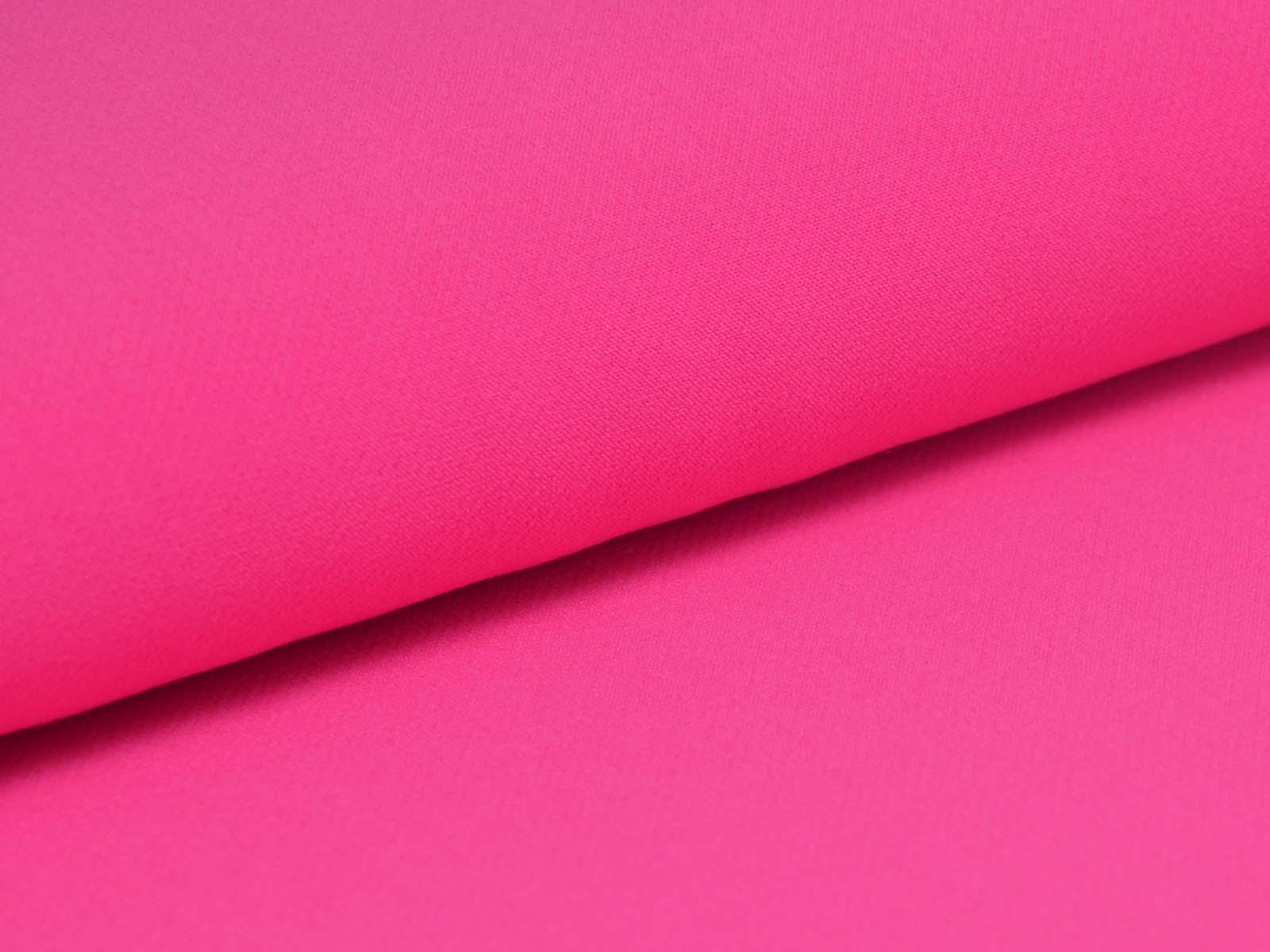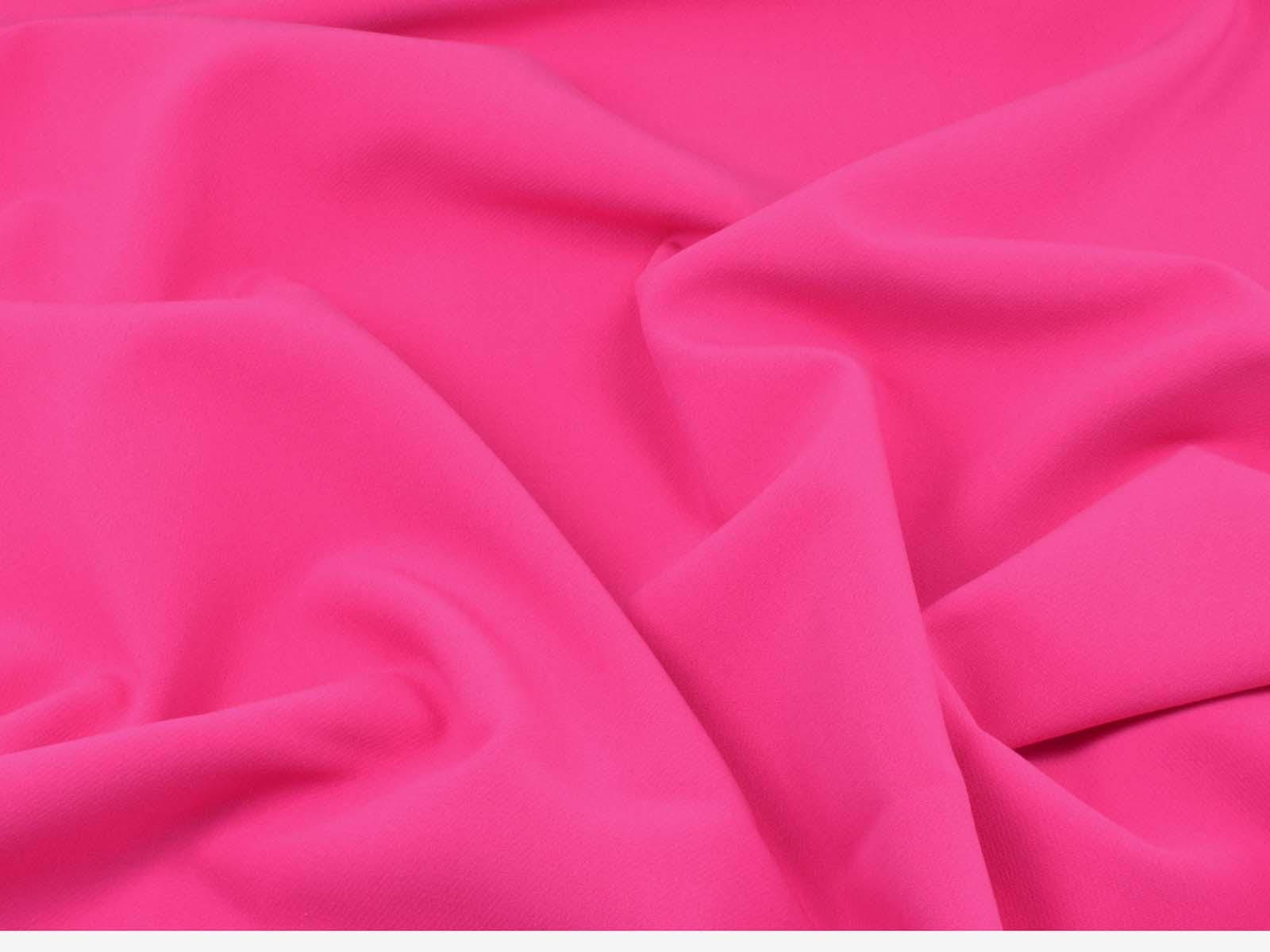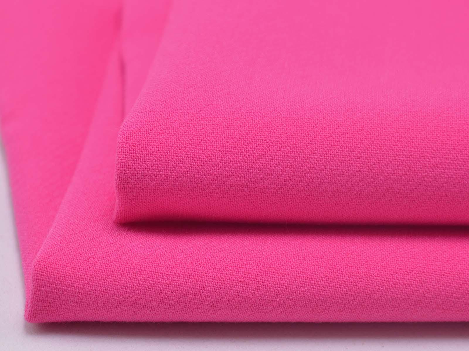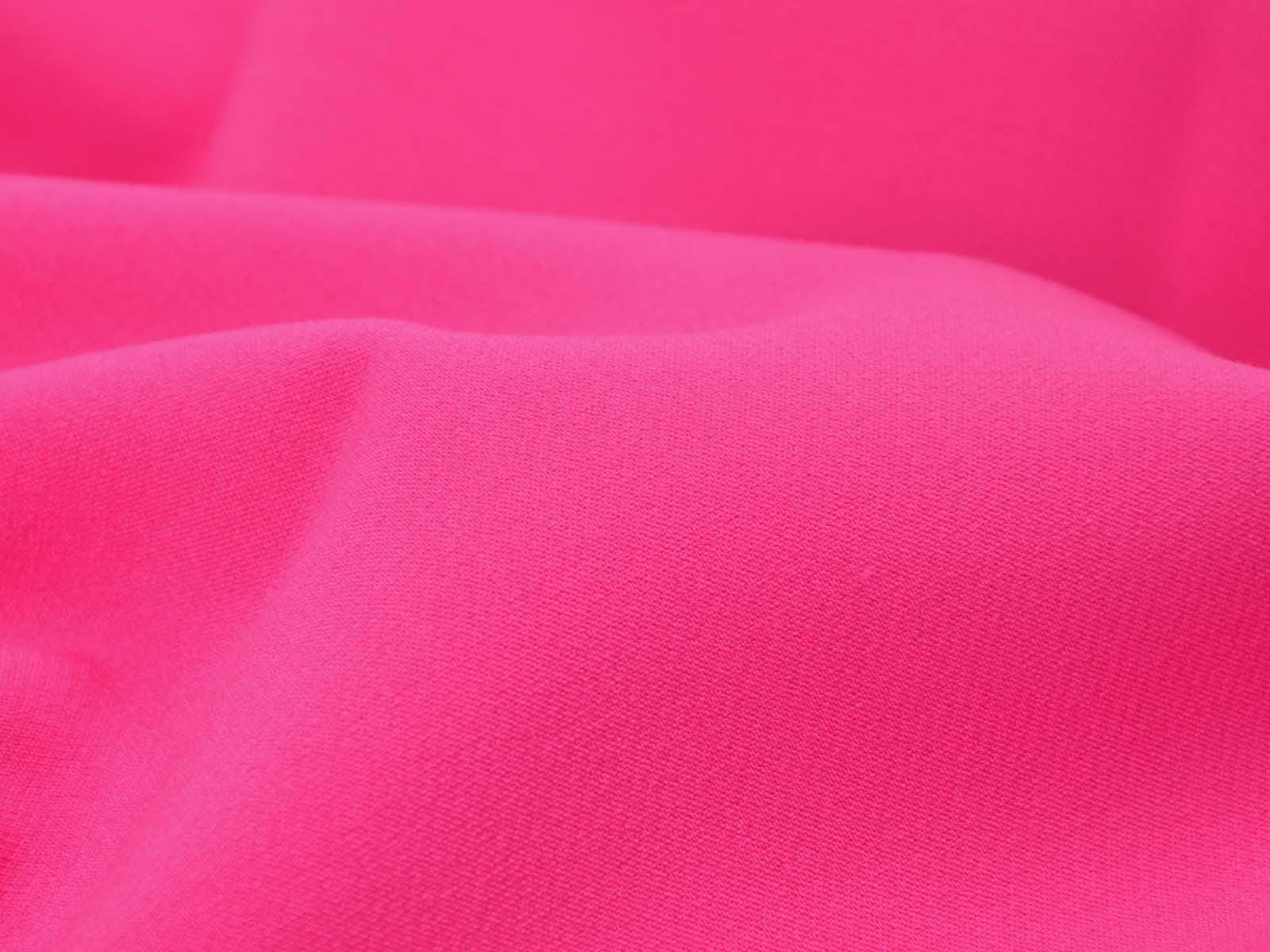 Woven fabric made of viscose and polyester with stretch in solid pink. The fabric is medium-thick, medium-weight, smooth, and bi-stretchy. Use it to sew tight-fitting pants, dresses, and skirts.