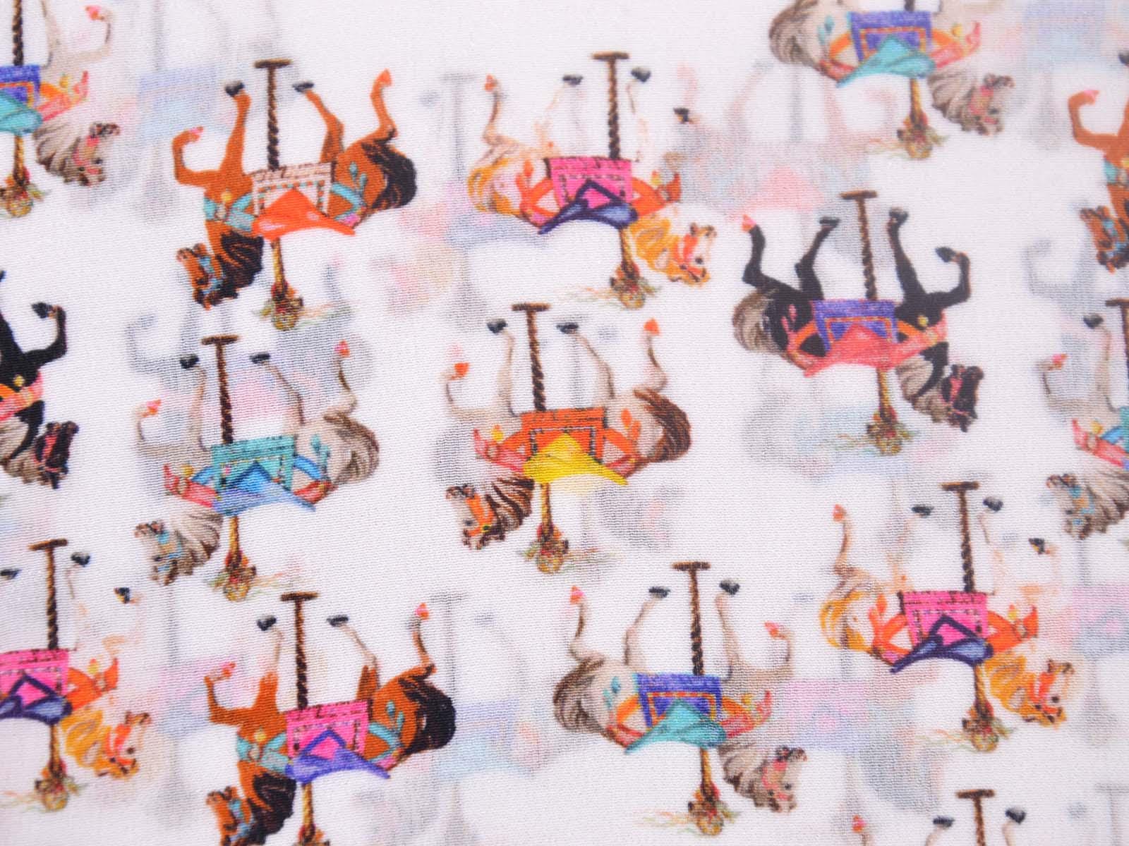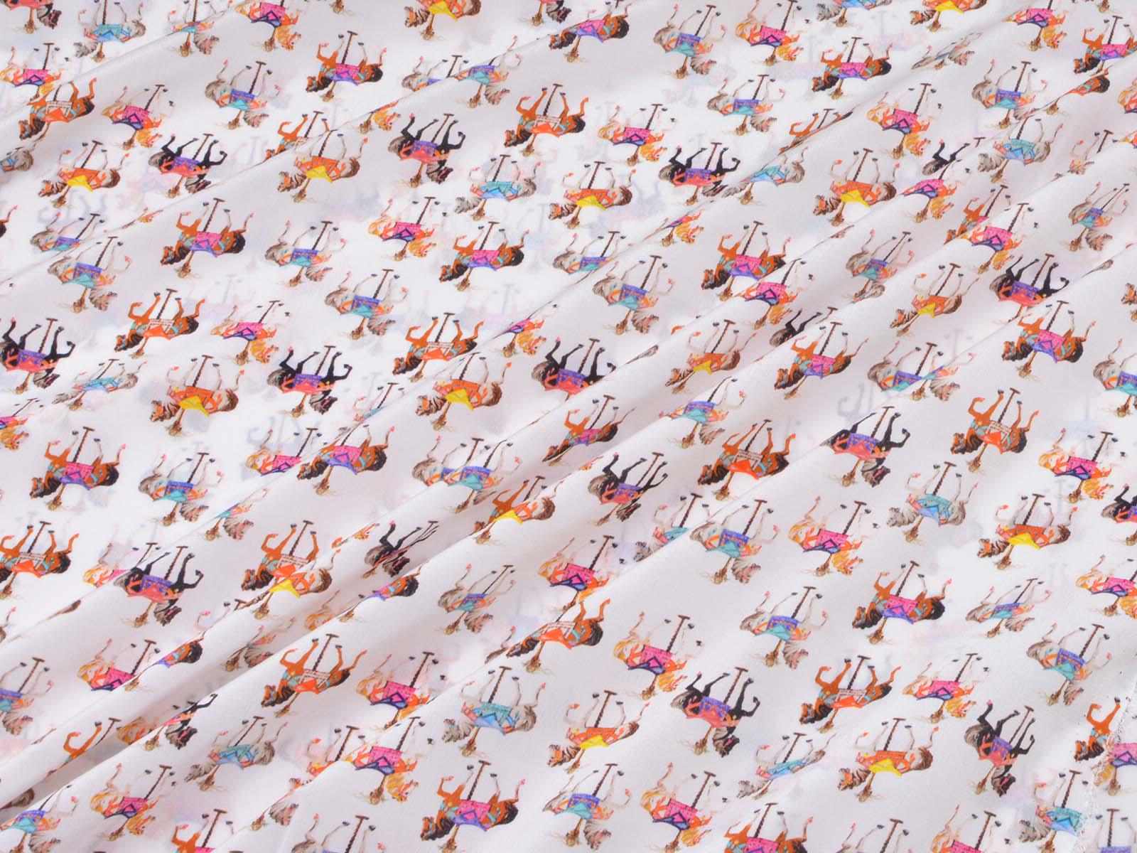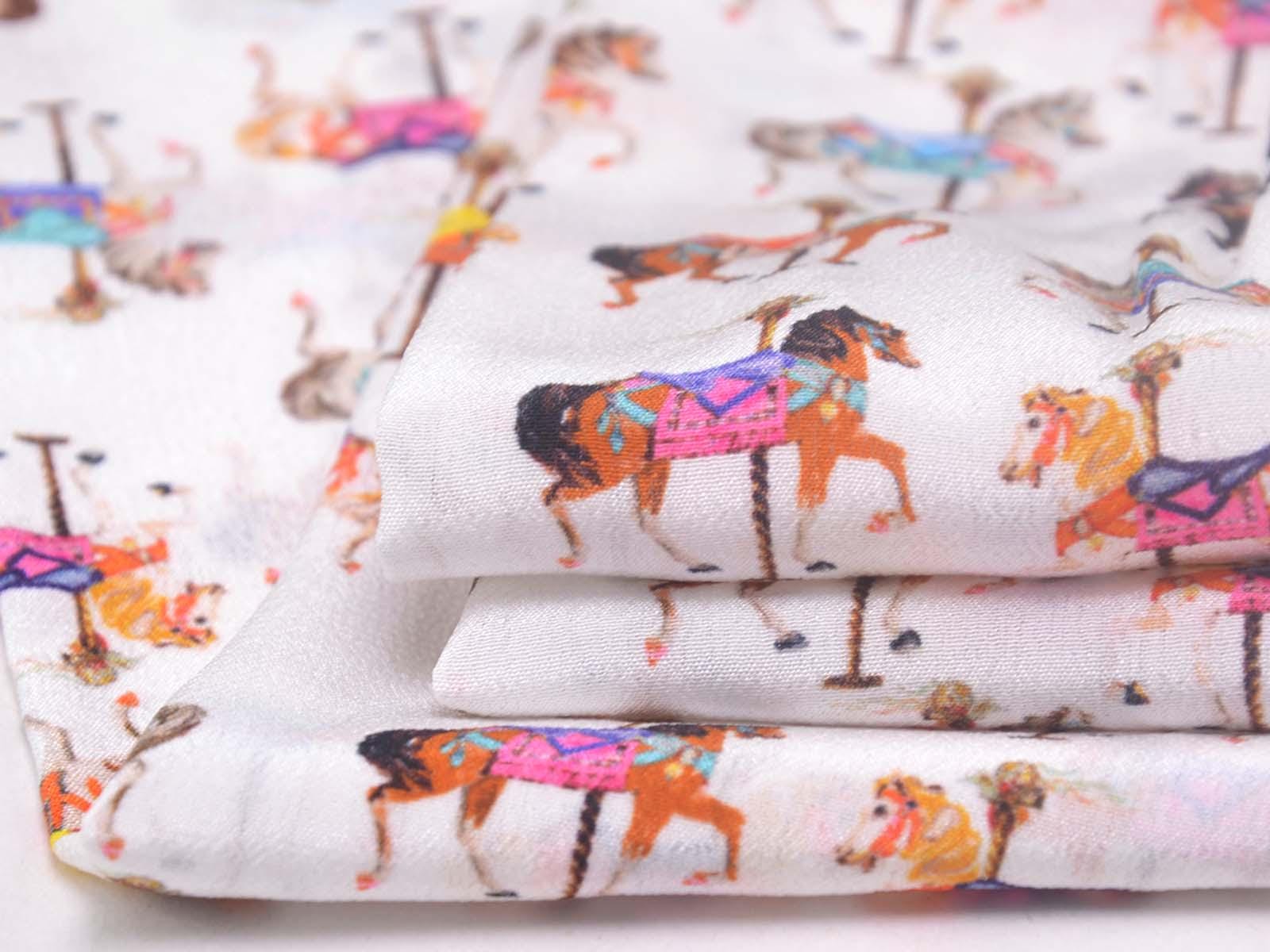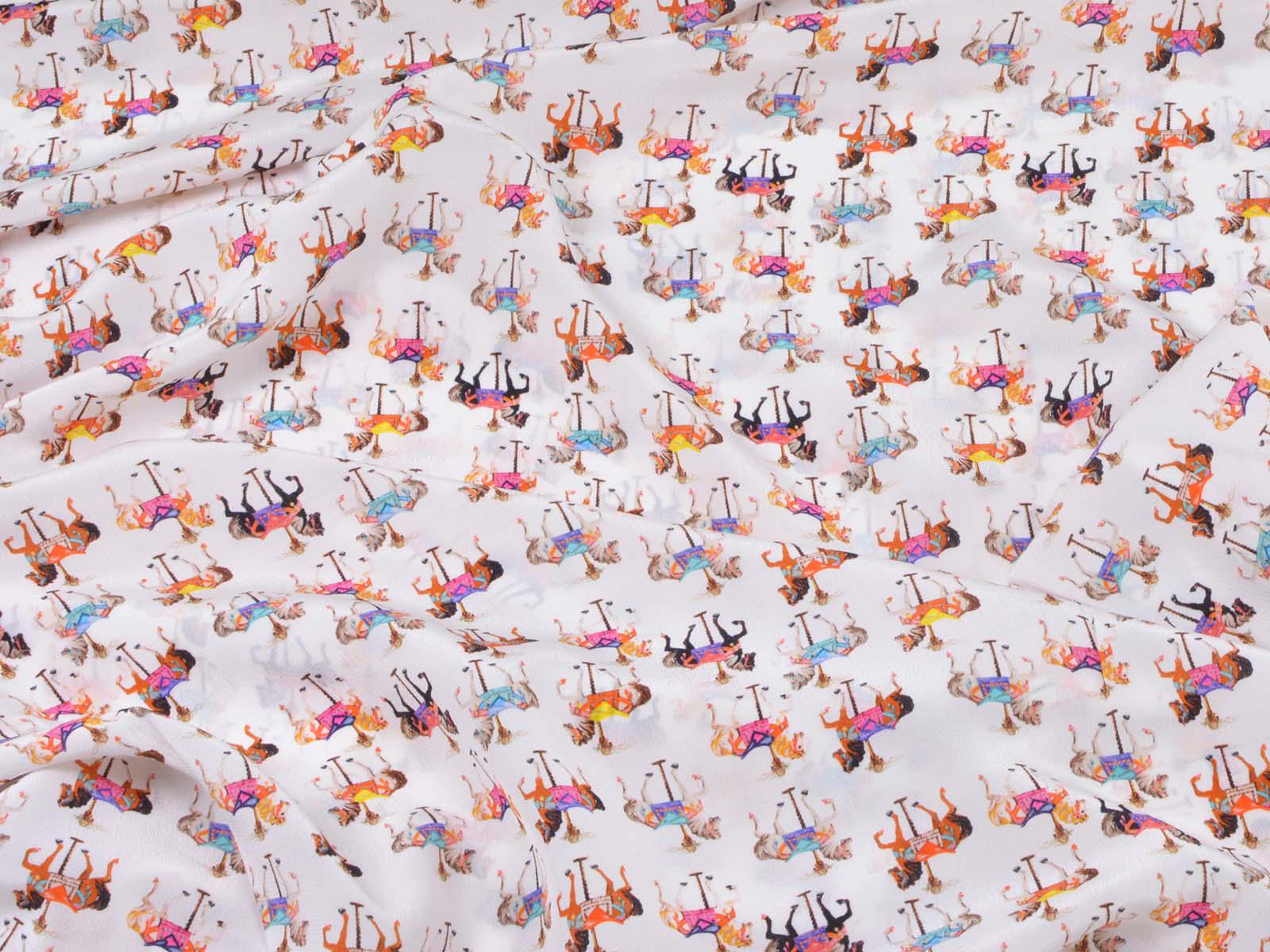 Sehr hochwertige Webware aus reiner Seide. Der Stoff ist super dünn, halb transparent, sehr leicht und fließend. Der Stoff zeigt kleine Pferde, ein Pferd ist ca. 3 cm hoch. Nähe dir aus der Seide tolle Blusen, Kleider, Tücher, Röcke und Tops. Bitte beachte, der Stoff ist durchscheinend.