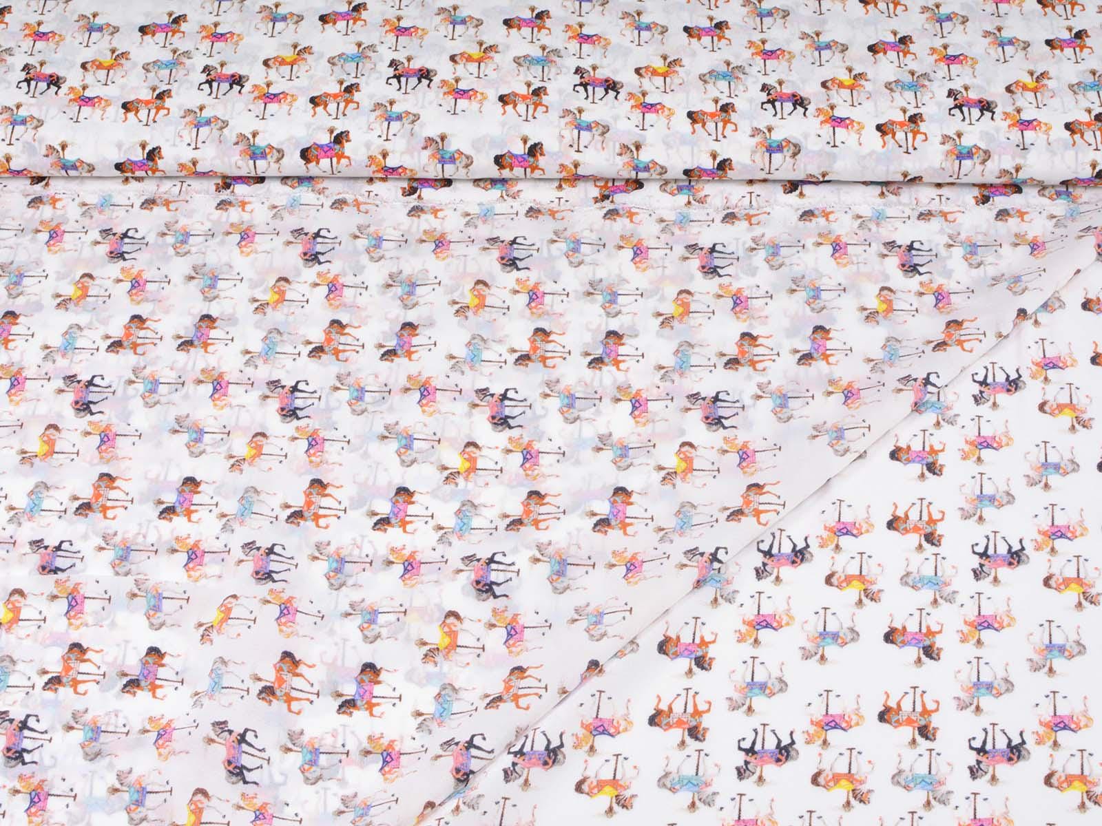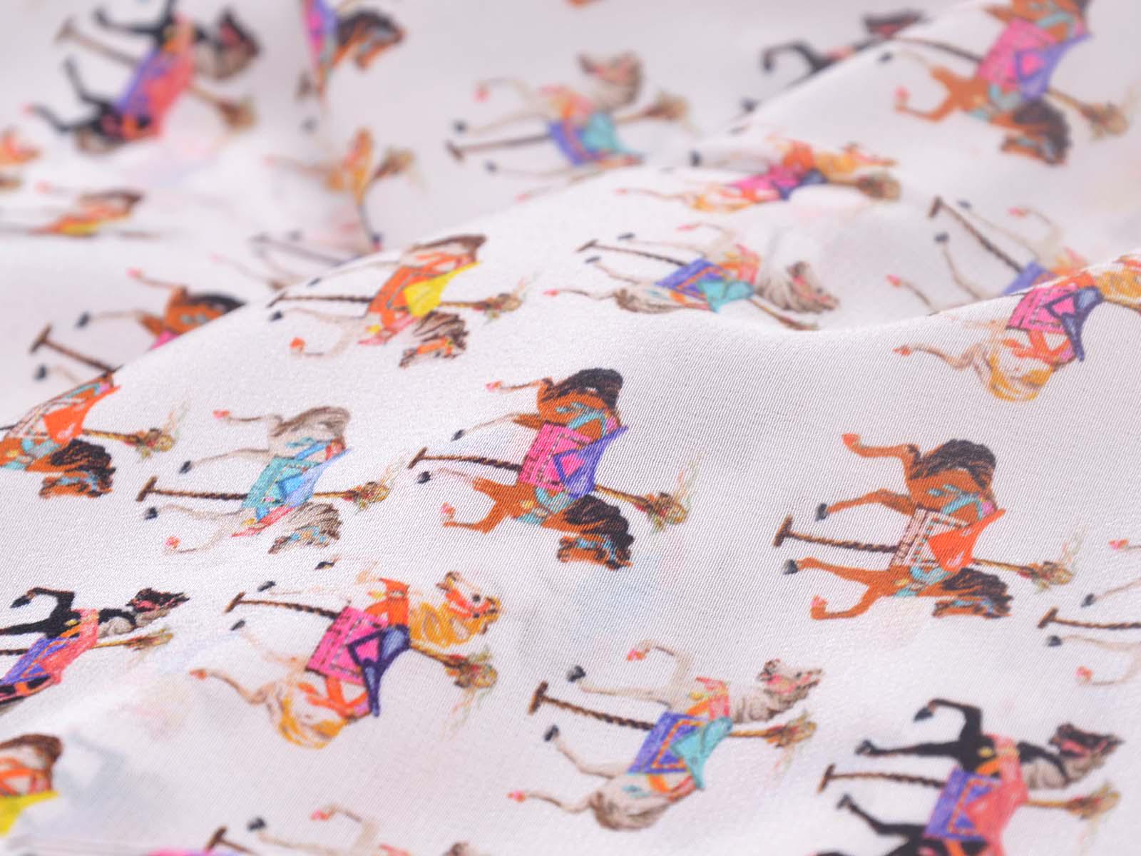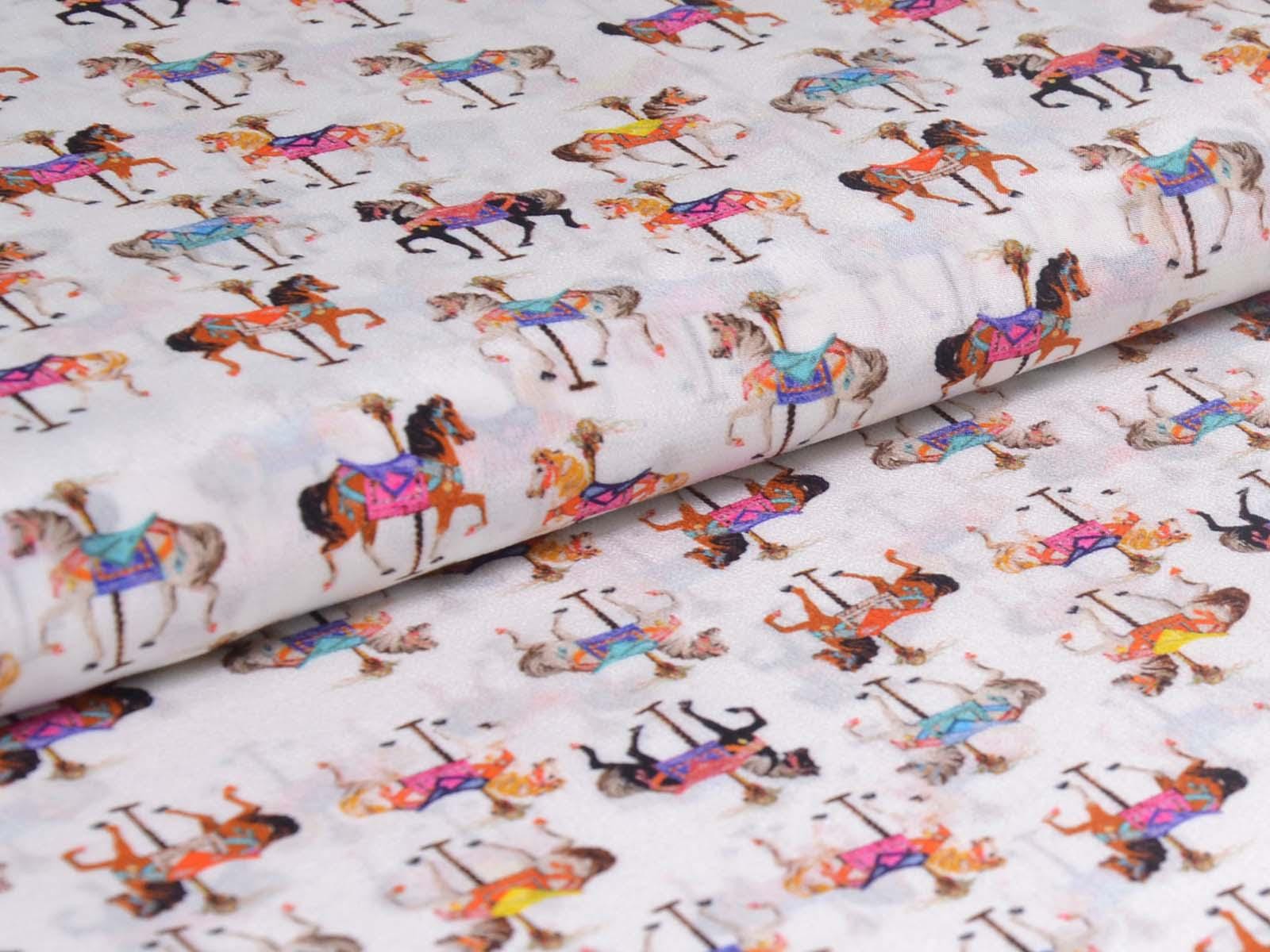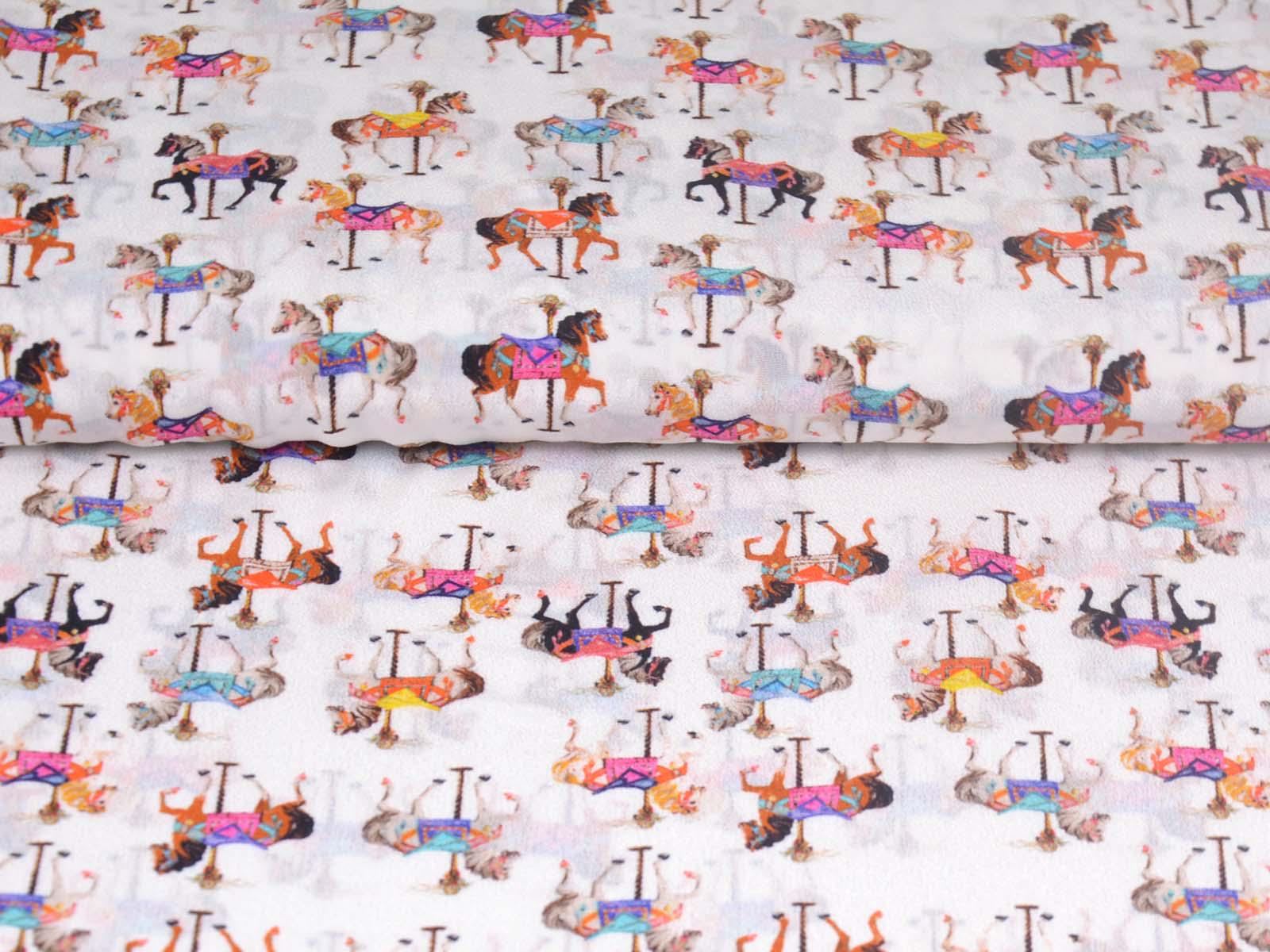 Sehr hochwertige Webware aus reiner Seide. Der Stoff ist super dünn, halb transparent, sehr leicht und fließend. Der Stoff zeigt kleine Pferde, ein Pferd ist ca. 3 cm hoch. Nähe dir aus der Seide tolle Blusen, Kleider, Tücher, Röcke und Tops. Bitte beachte, der Stoff ist durchscheinend.