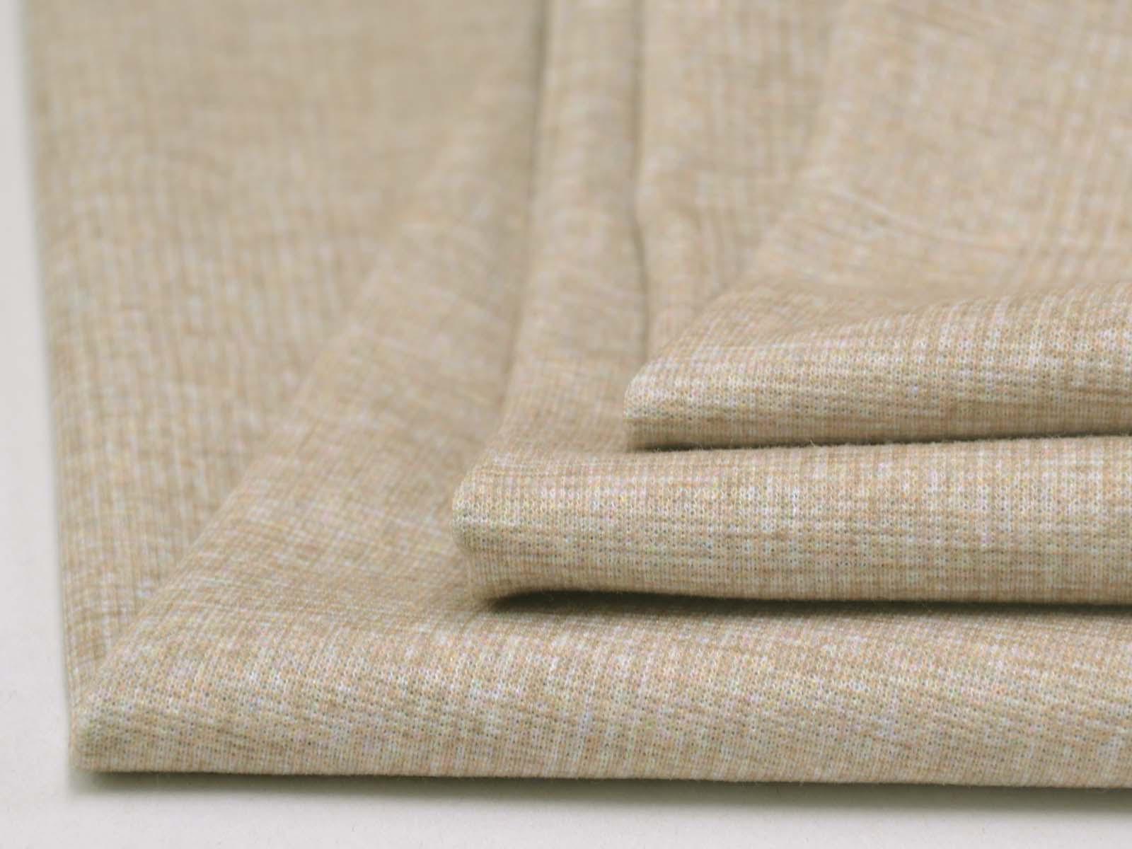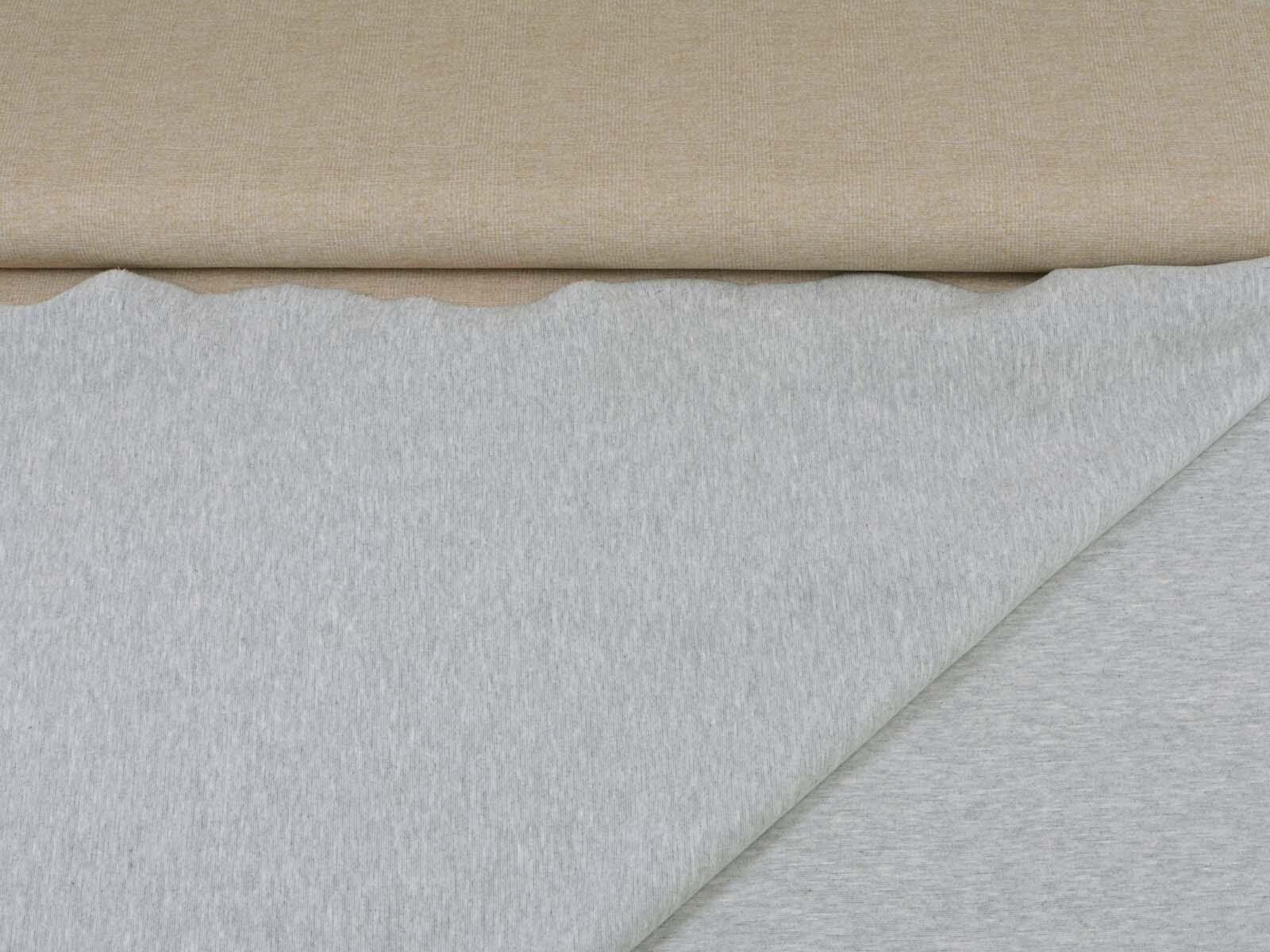 Romanit Jersey aus Baumwolle in beige mit Karos. Der Stoff ist beidseitig verwendbar, die andere Seite ist hellgrau meliert. Der Stoff ist glatt, fest und mittelschwer. Er eignet sich wunderbar zum Nähen von engen Kleidern, engen Röcken, modernen Blazern, gemütlichen Hosen und vielem mehr.