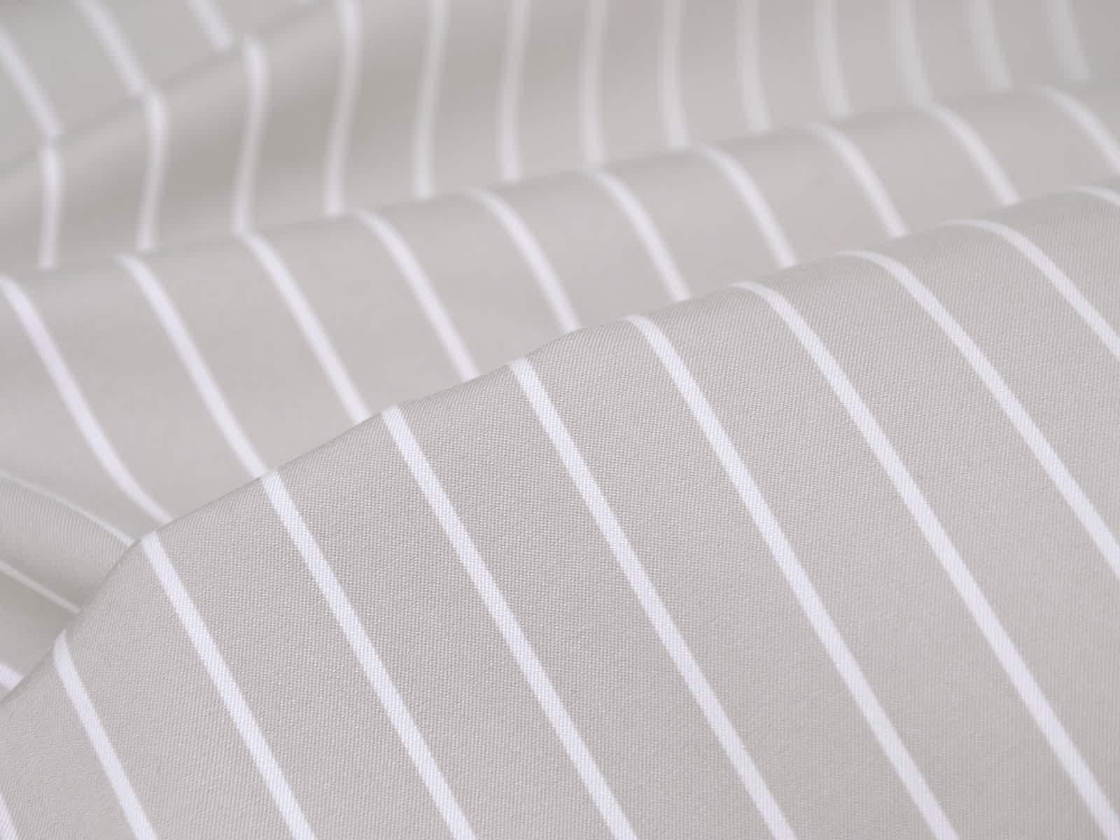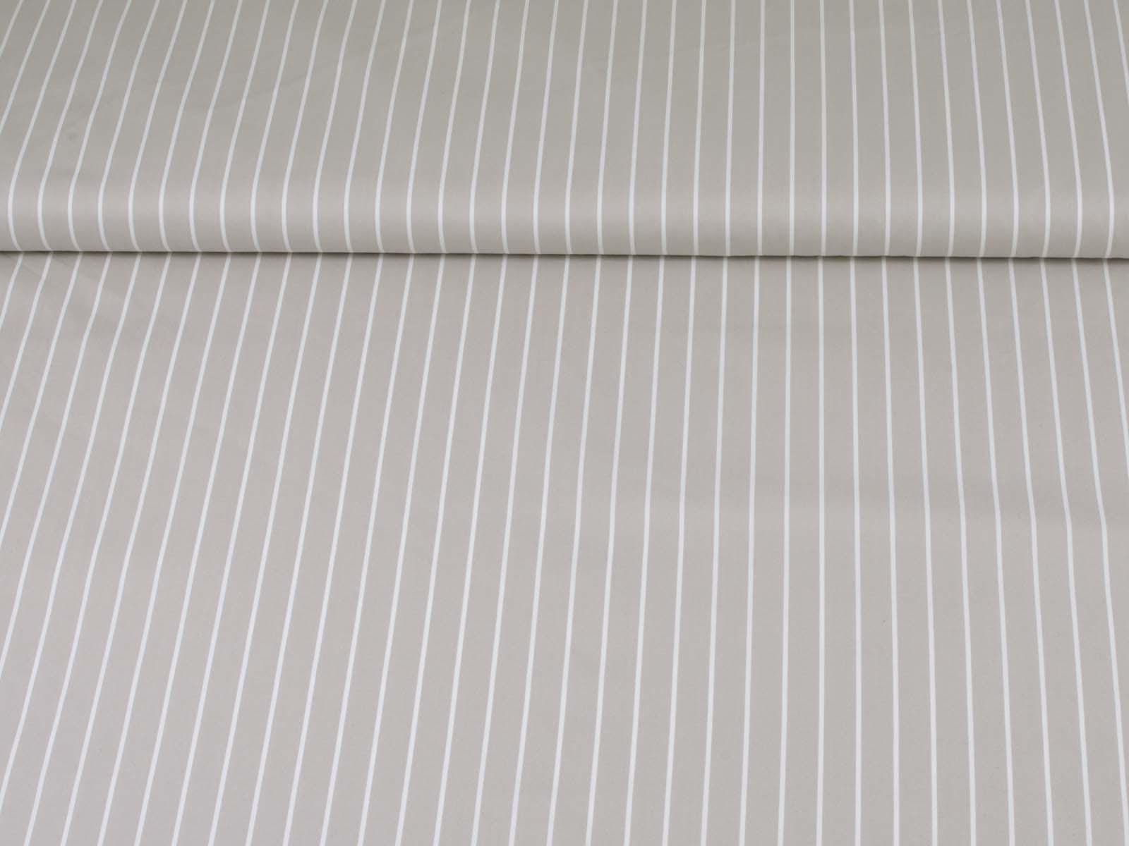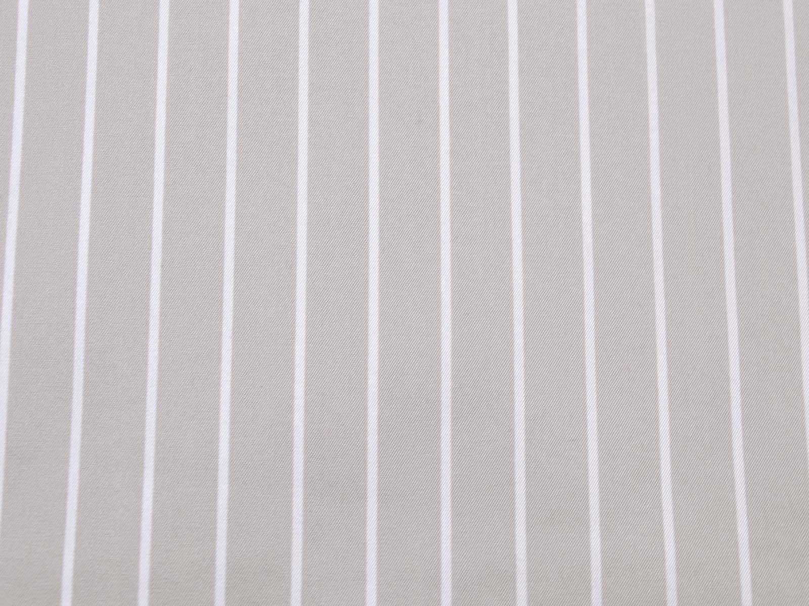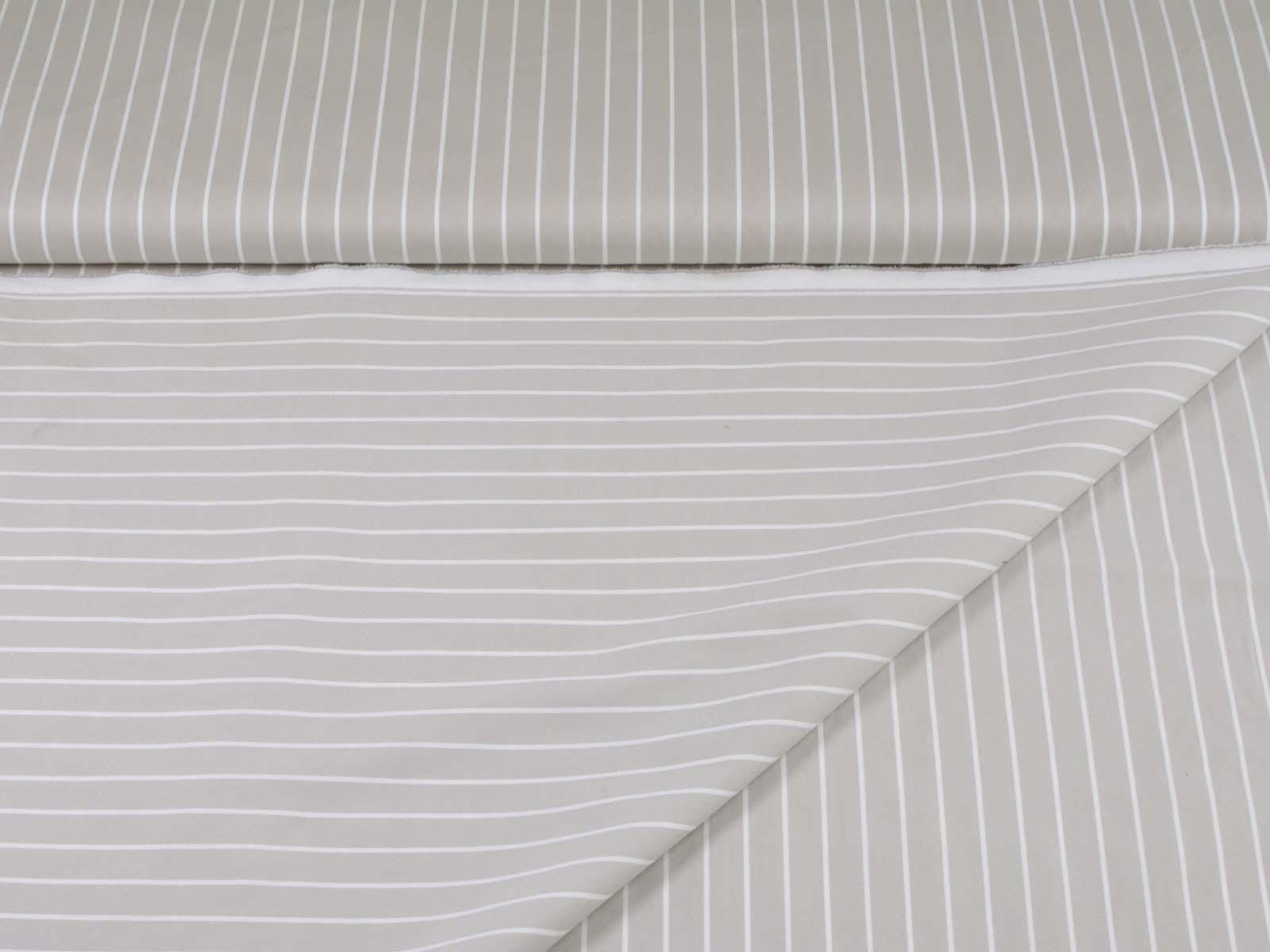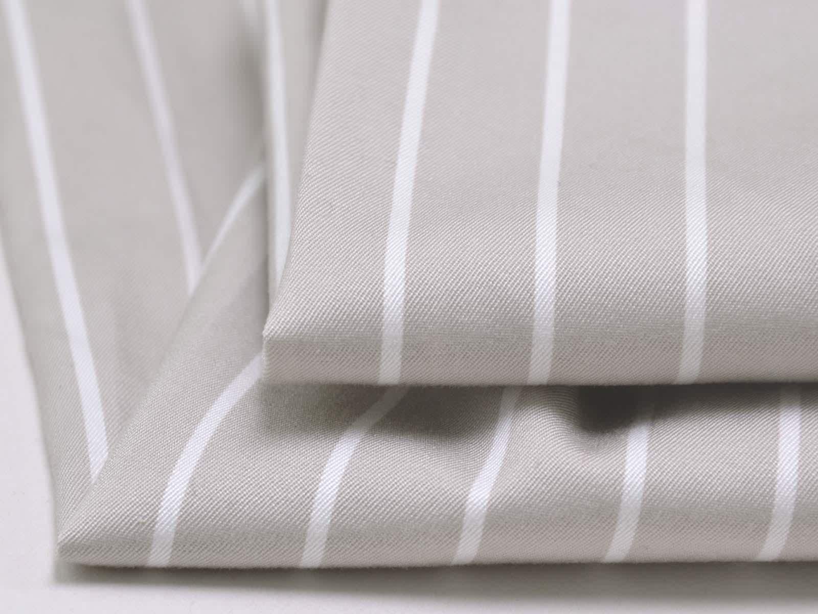 Trouser fabric made of lyocell with polyester and stretch. The fabric is beige with white stripes, each stripe approximately 2 mm wide. It is smooth and perfect for sewing trousers, summer dresses, skirts, and much more.