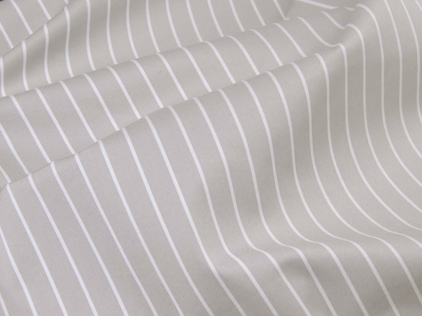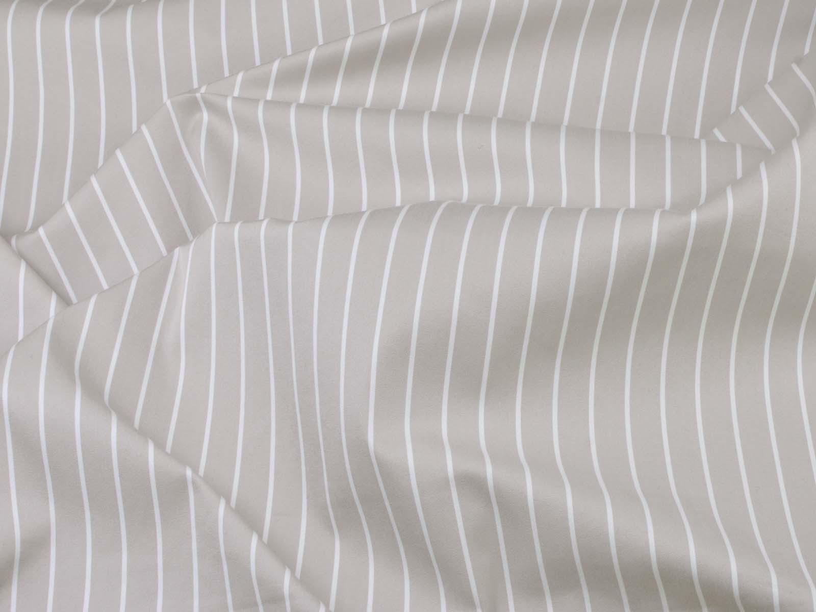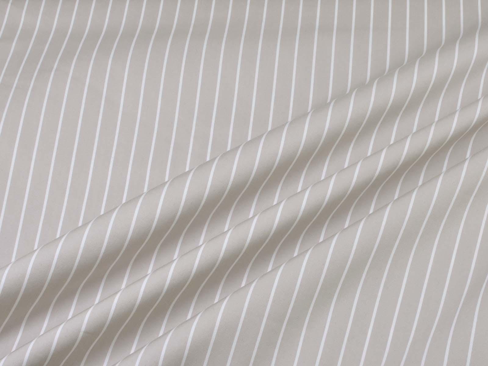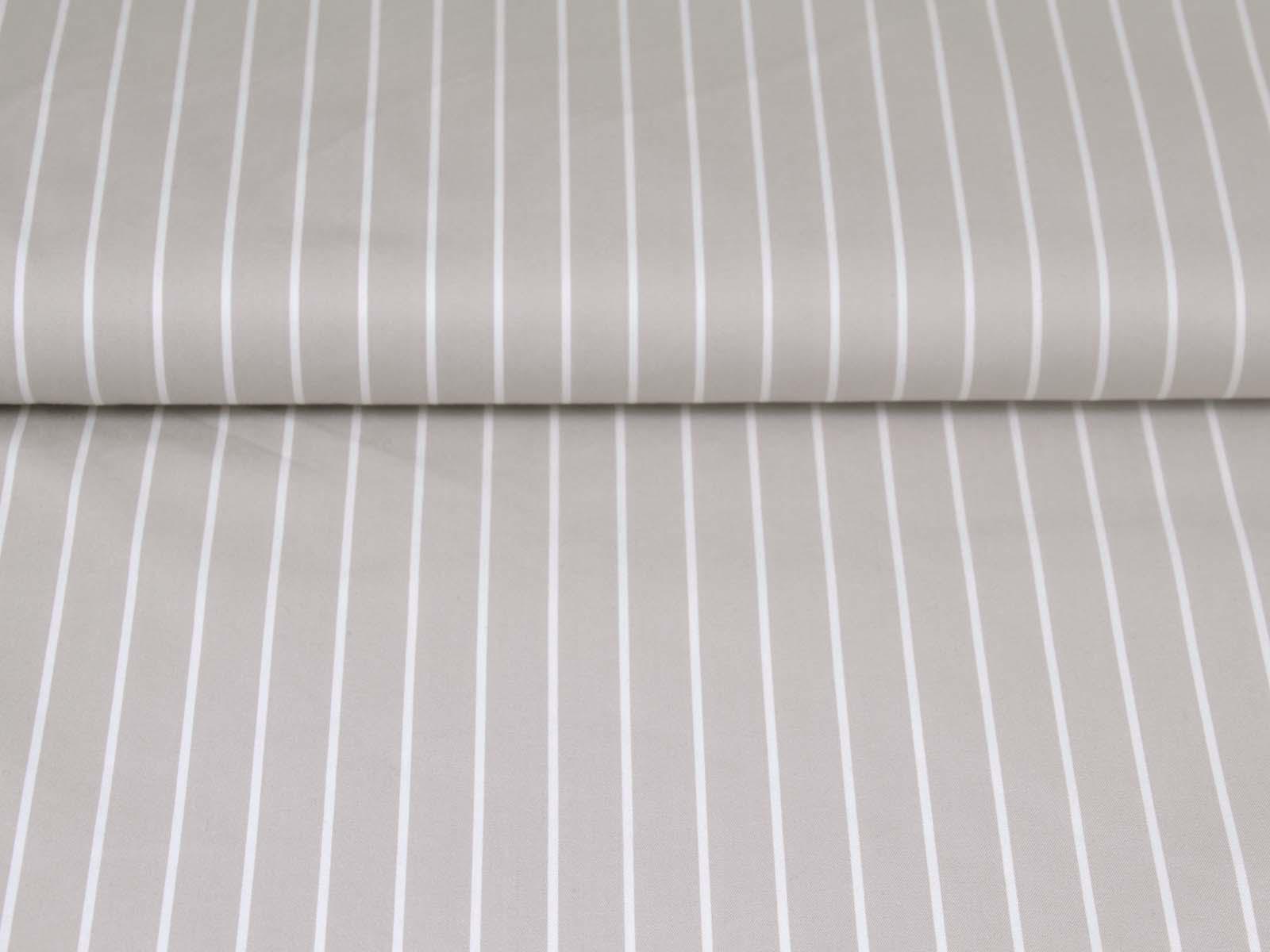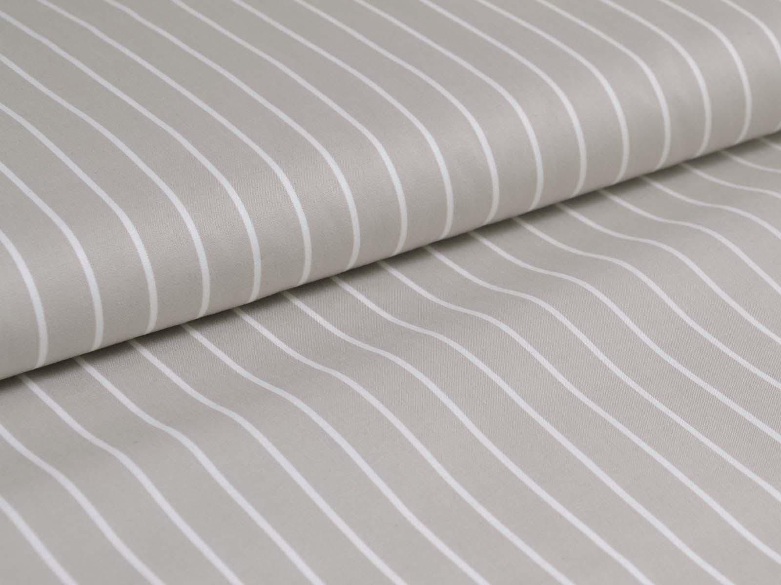 Trouser fabric made of lyocell with polyester and stretch. The fabric is beige with white stripes, each stripe approximately 2 mm wide. It is smooth and perfect for sewing trousers, summer dresses, skirts, and much more.