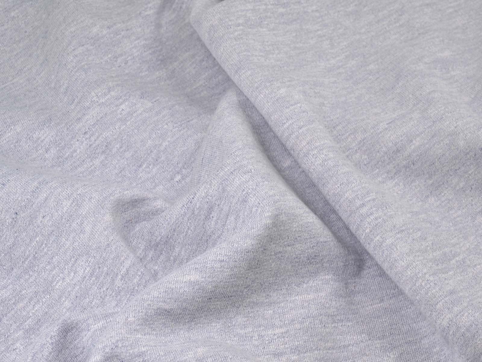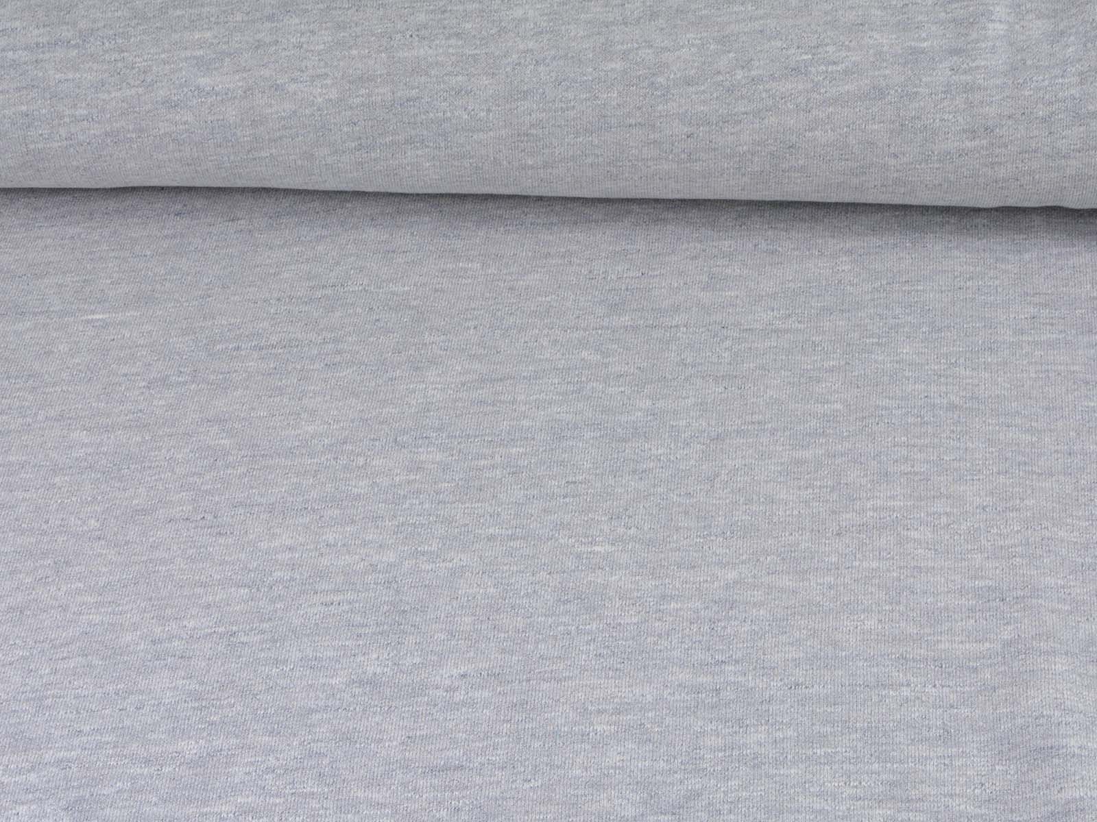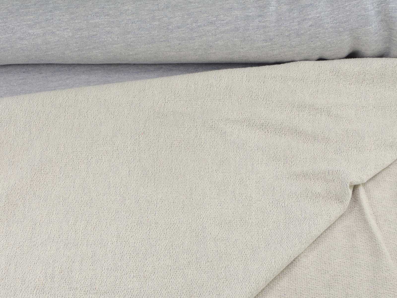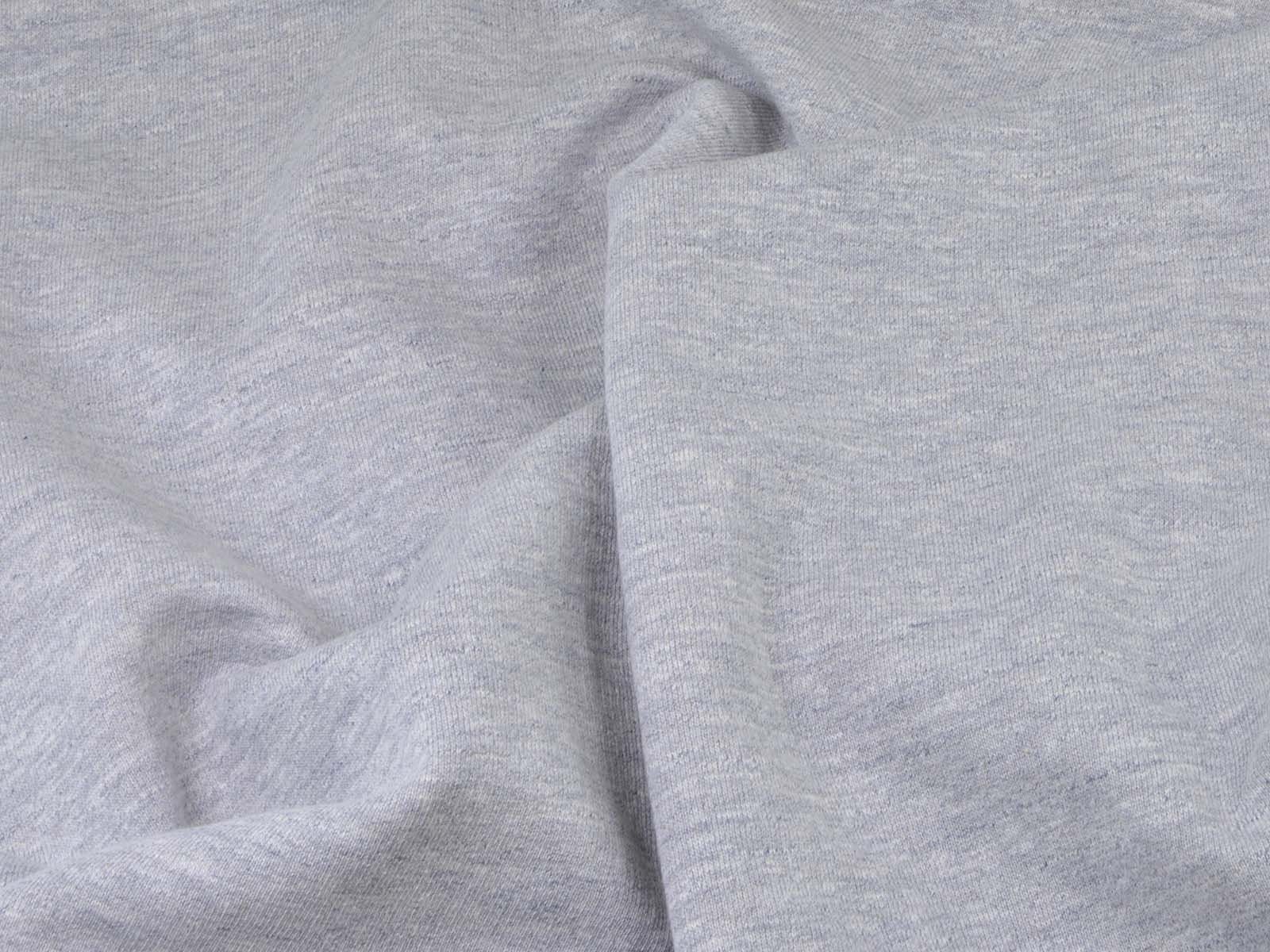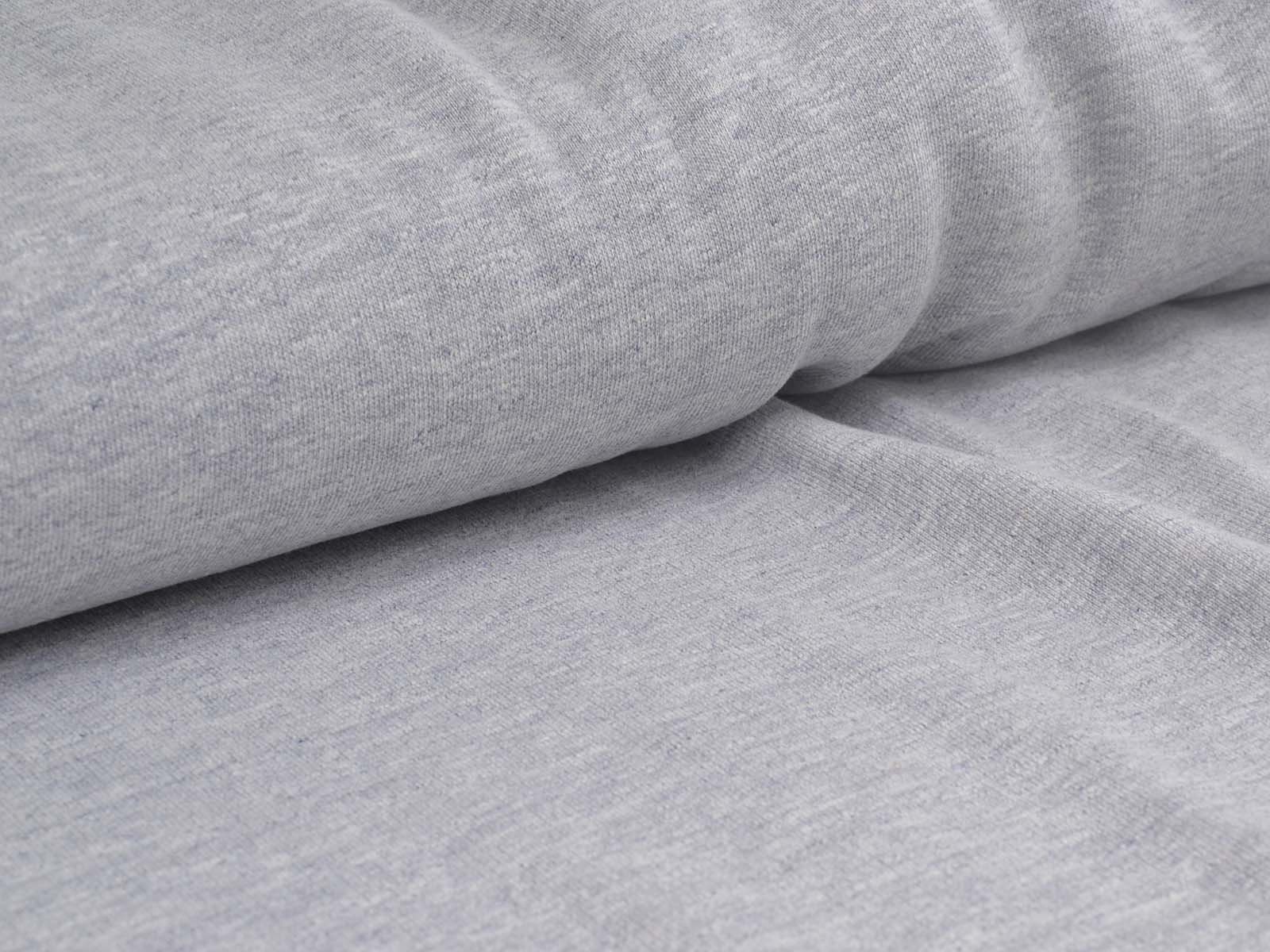 Sommersweat in grau meliert aus 100% Baumwolle made in Italy. Der Stoff ist extra breit. Die rechte Stoffseite ist glatt und die linke Stoffseite zeigt typische Schlingen. Der Stoff eignet sich zum Nähen von Sweatjacken, Pullovern, Jogginghosen und vielem mehr.