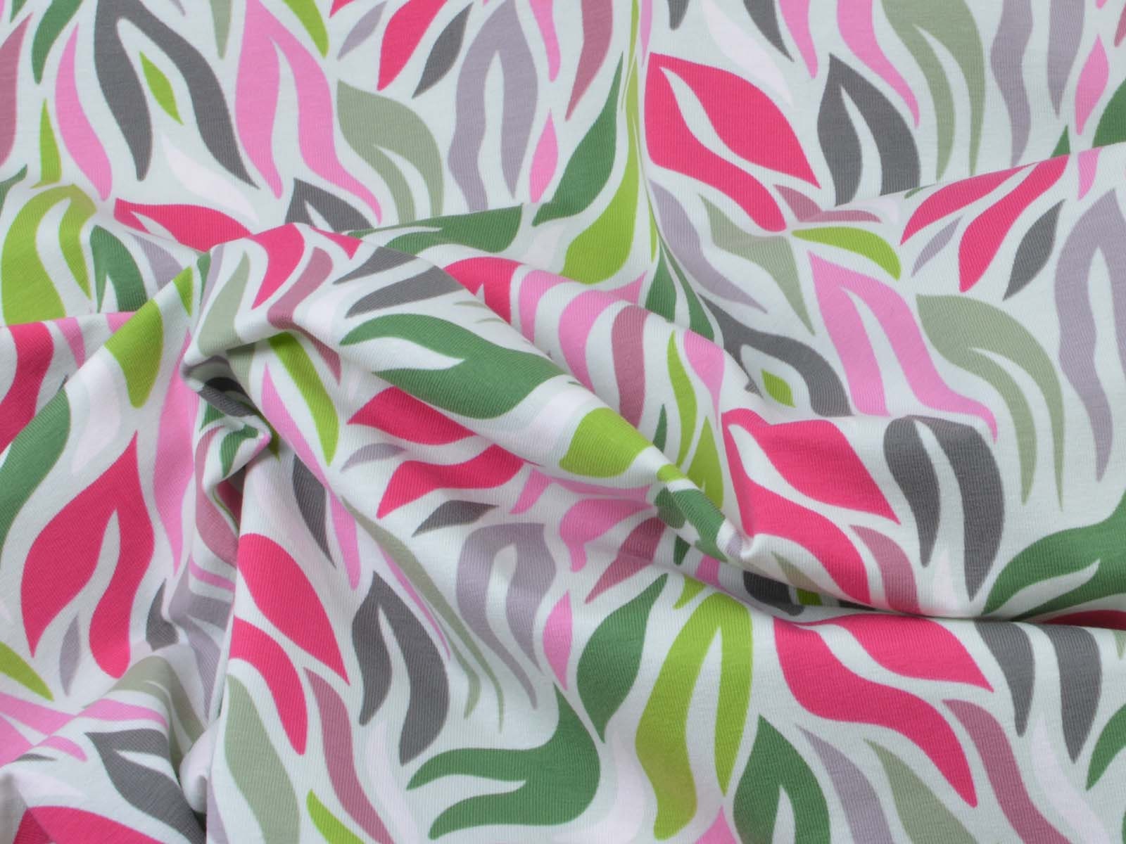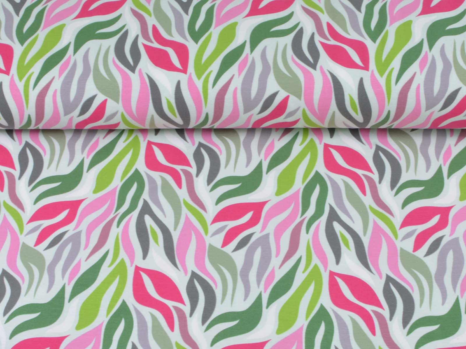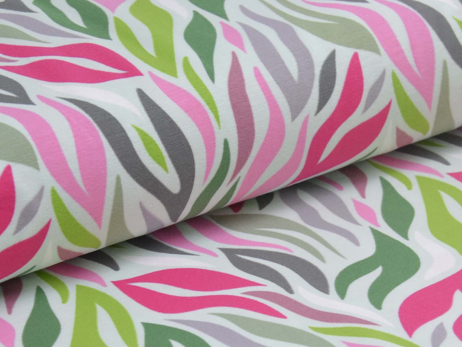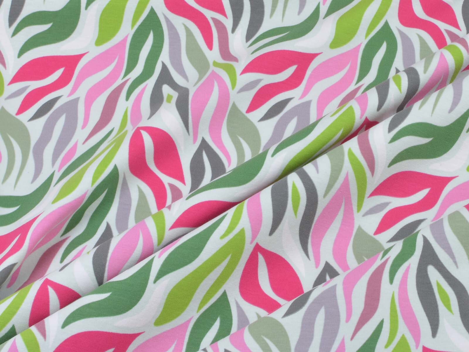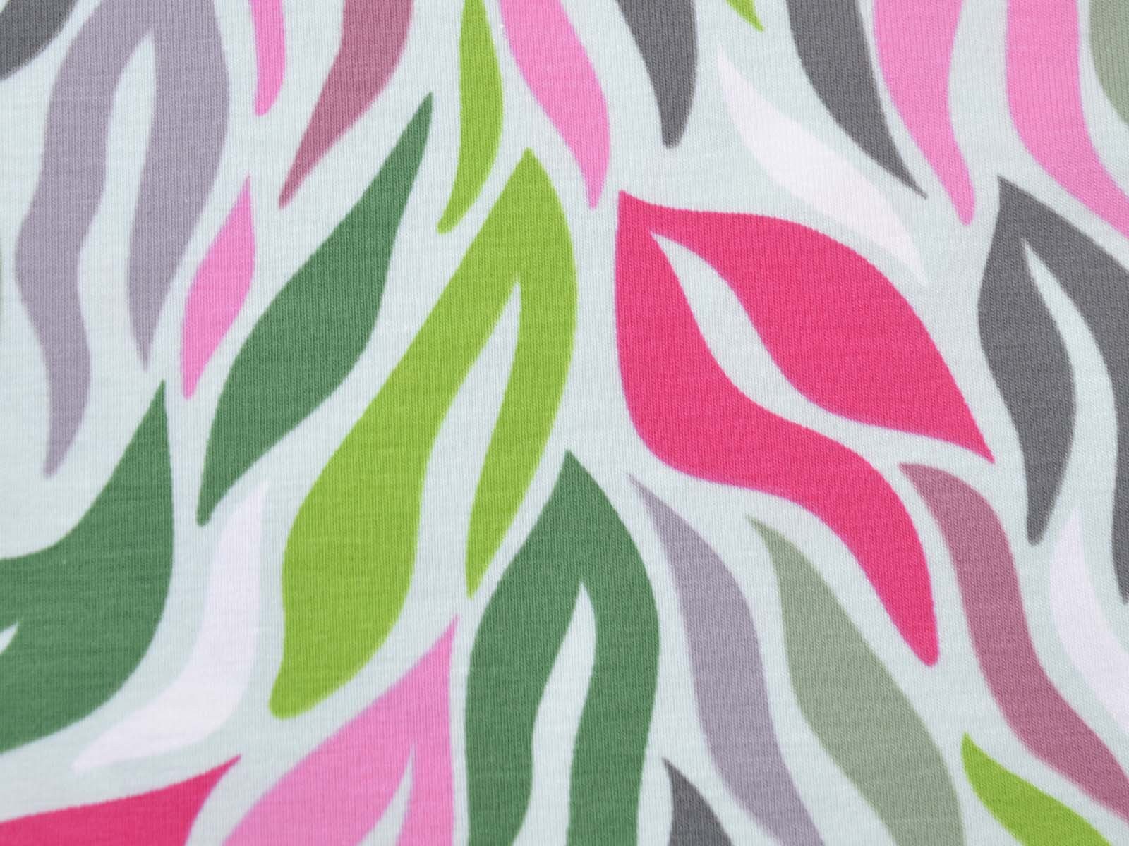 Jersey für Kinder aus Baumwolle made in Italy. Der Stoff mit Blättern ist dünn, glatt, matt und gemustert. Nähe daraus T-Shirts, Leggings, Kleider, Pumphosen und so vieles mehr.
