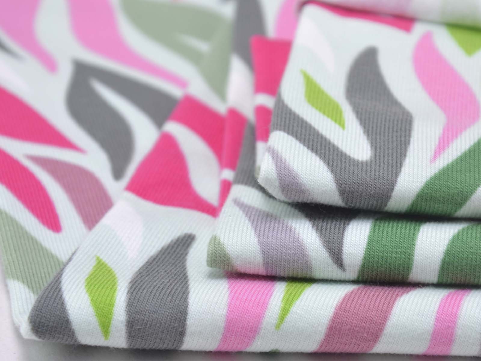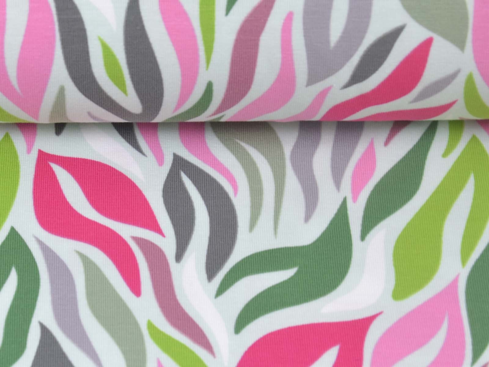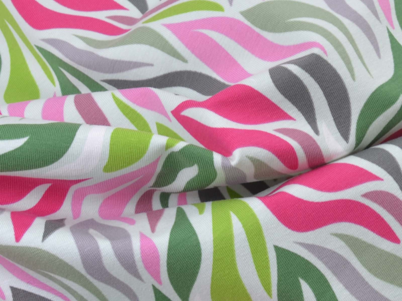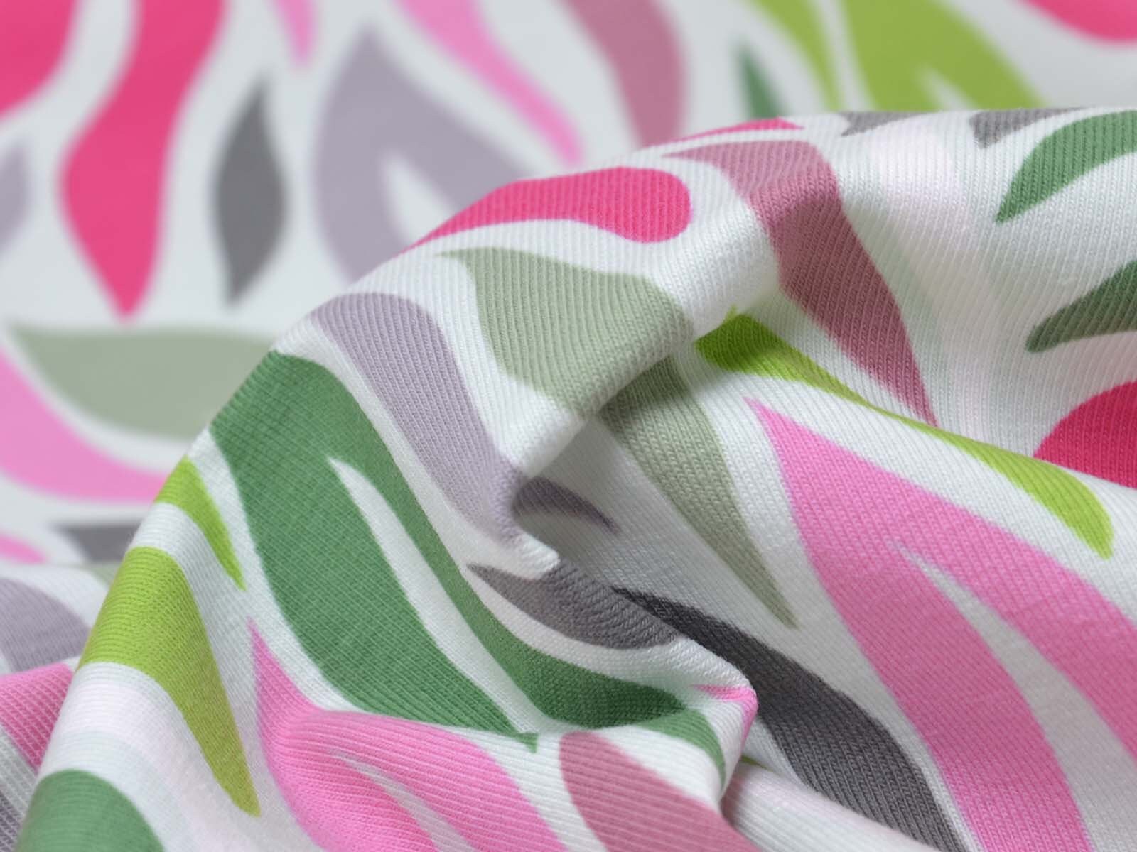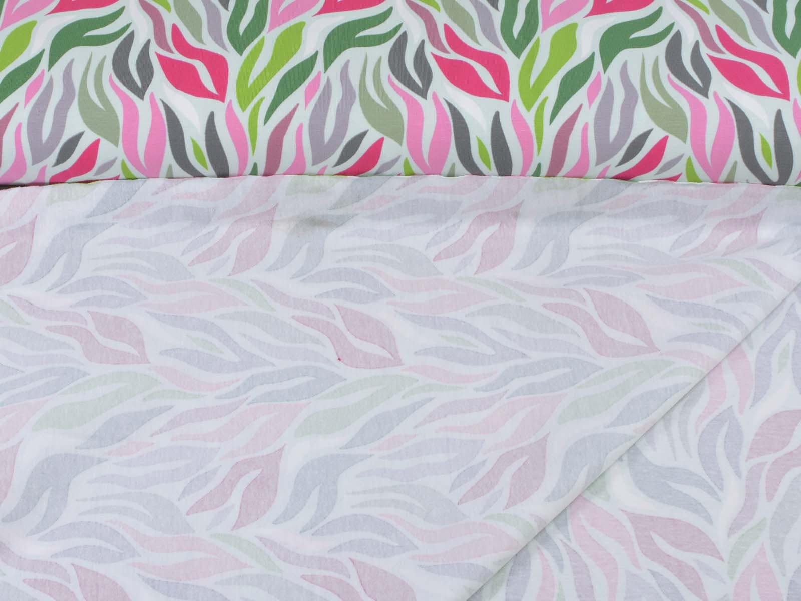 Jersey für Kinder aus Baumwolle made in Italy. Der Stoff mit Blättern ist dünn, glatt, matt und gemustert. Nähe daraus T-Shirts, Leggings, Kleider, Pumphosen und so vieles mehr.