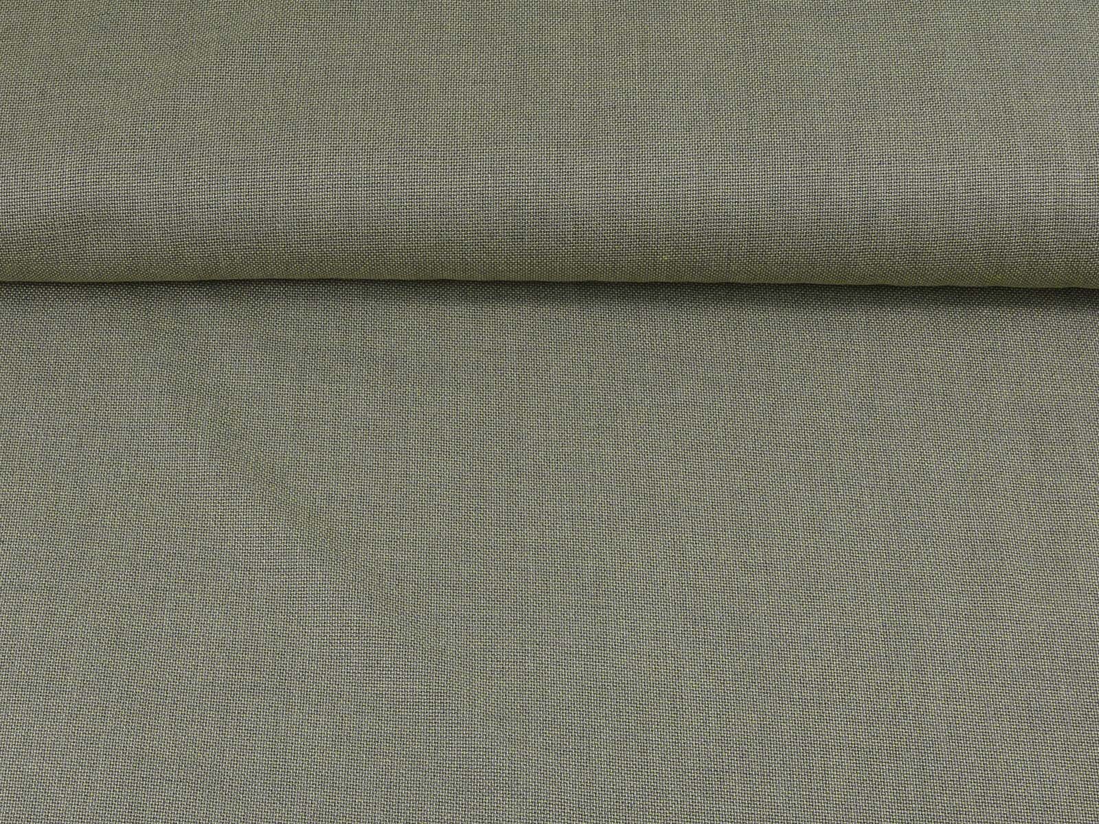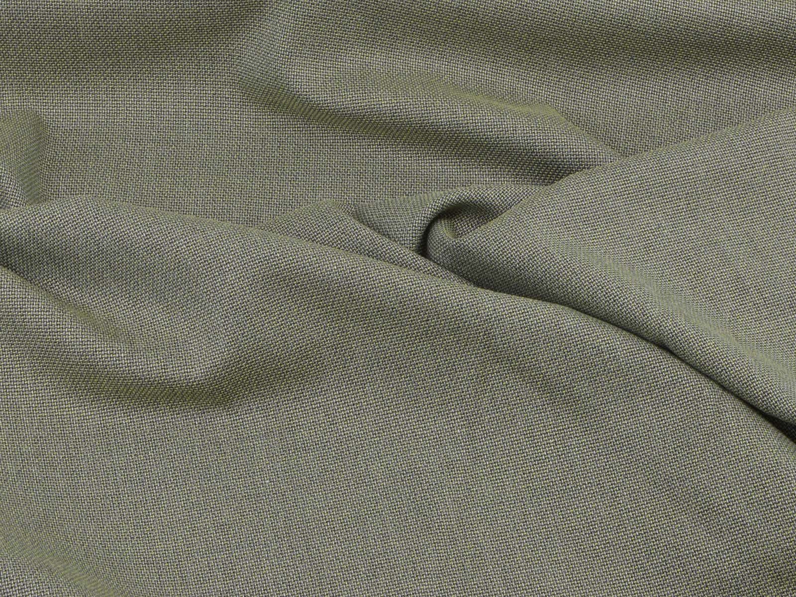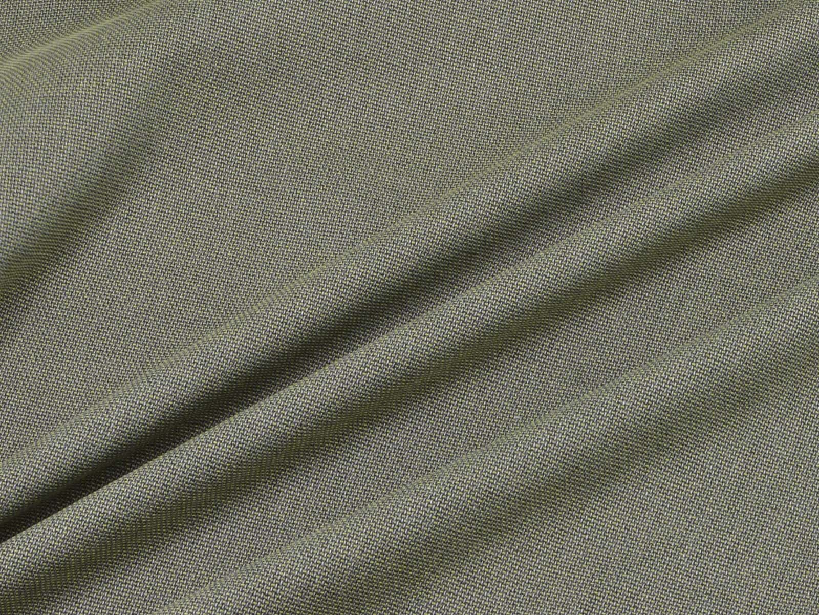 Stretchy olive-green mottled trouser fabric made from bamboo with recycled polyester. The fabric is thin, has a slightly grainy feel, and drapes smoothly. It's perfect for sewing wide-legged trousers, dresses, skirts, and much more.