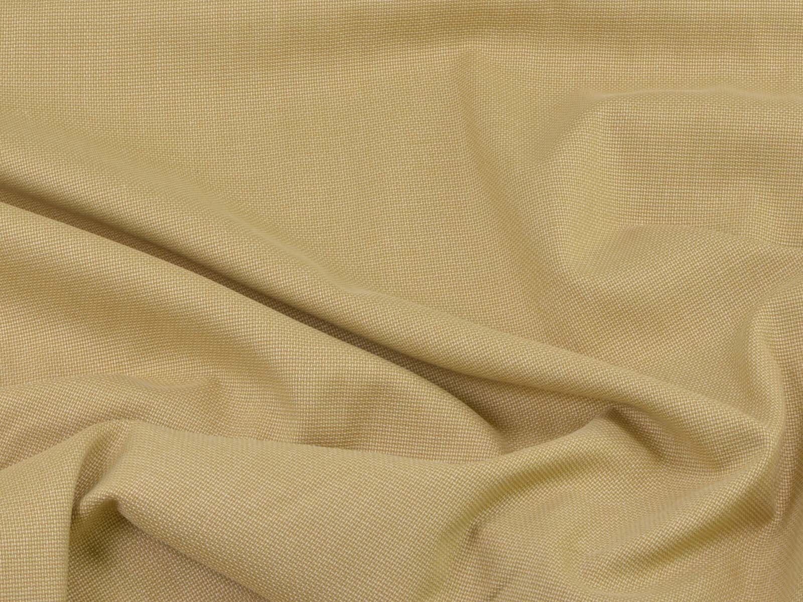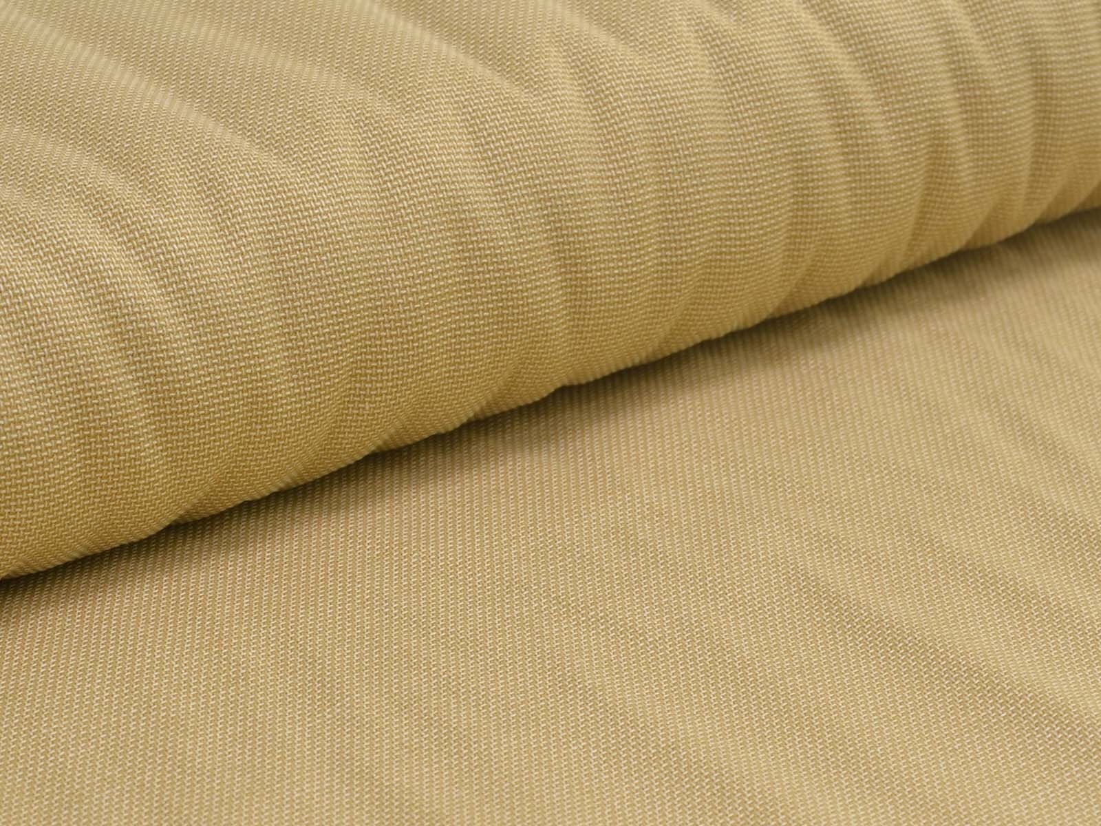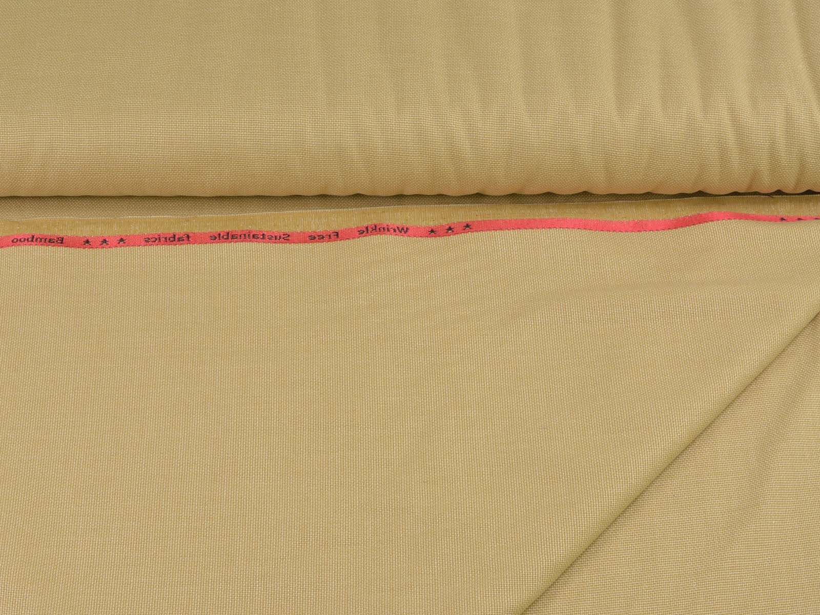Stretchy mustard-yellow mottled trouser fabric made from bamboo with recycled polyester. The fabric is thin, has a slightly grainy feel, and drapes smoothly. It's perfect for sewing wide-legged trousers, dresses, skirts, and much more.