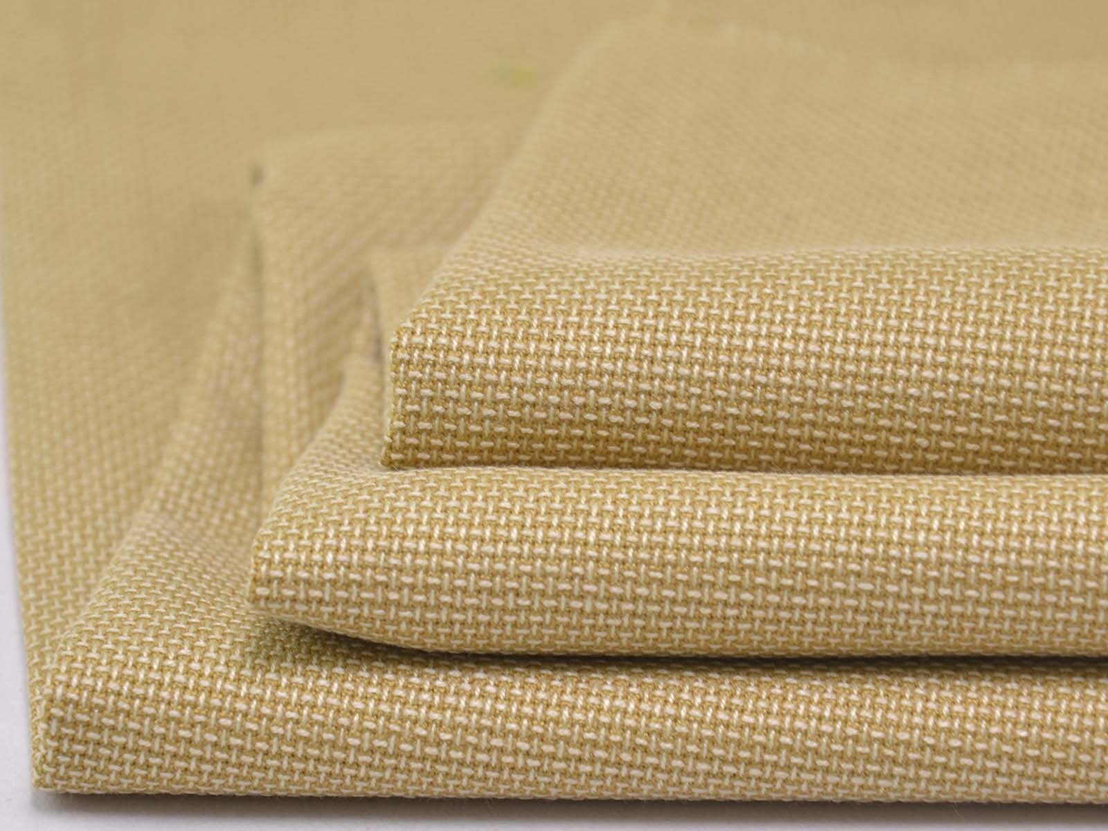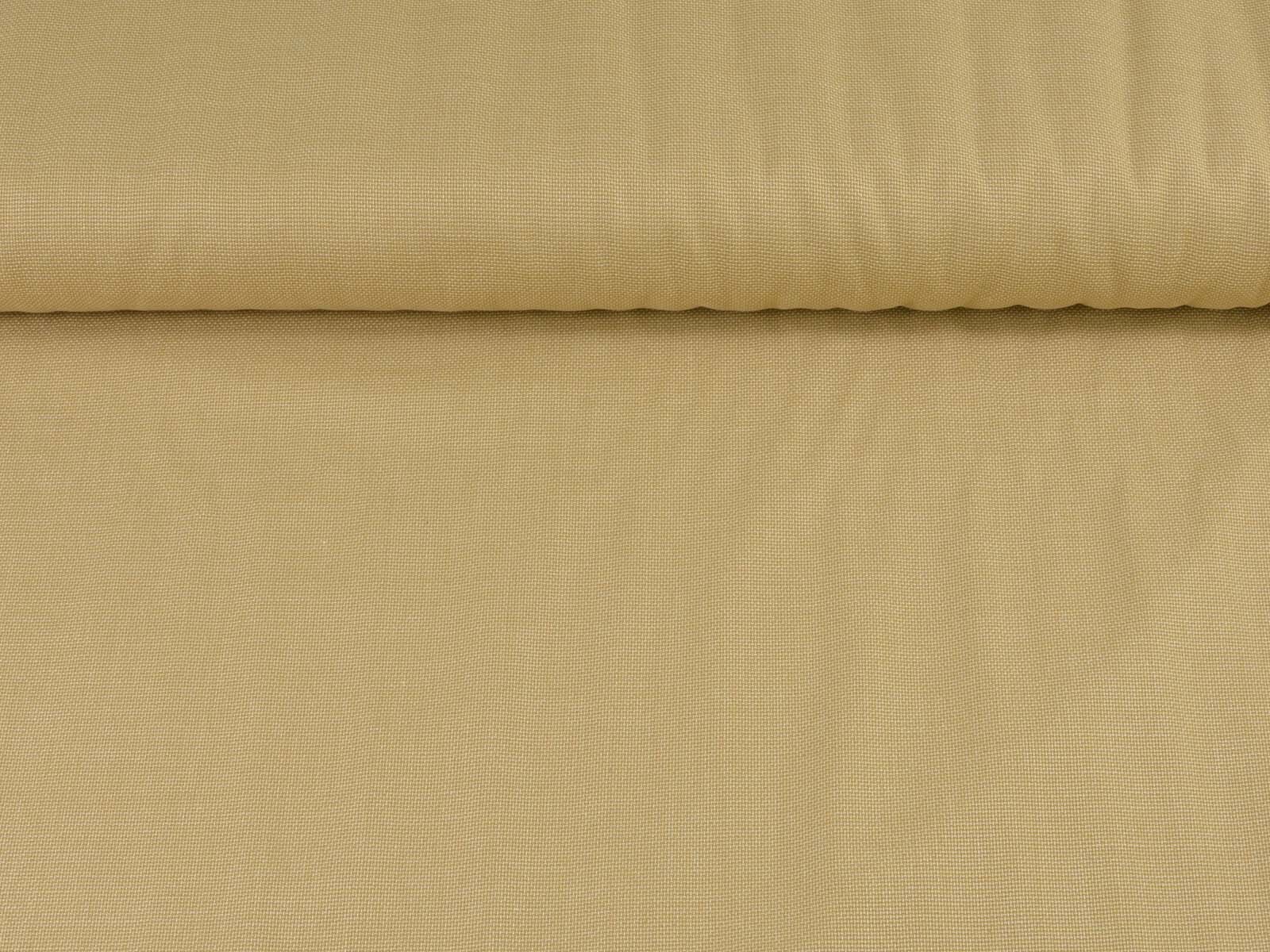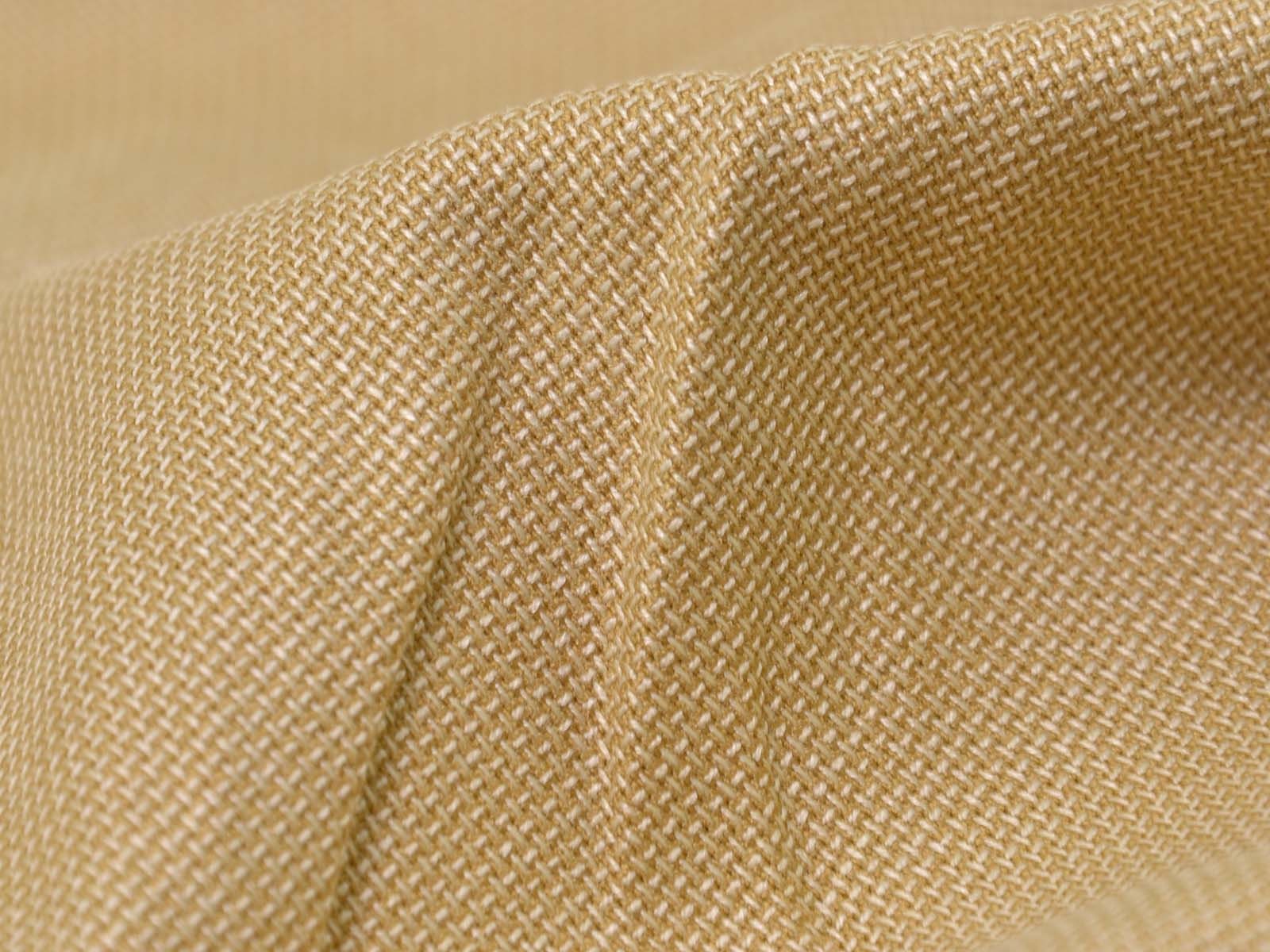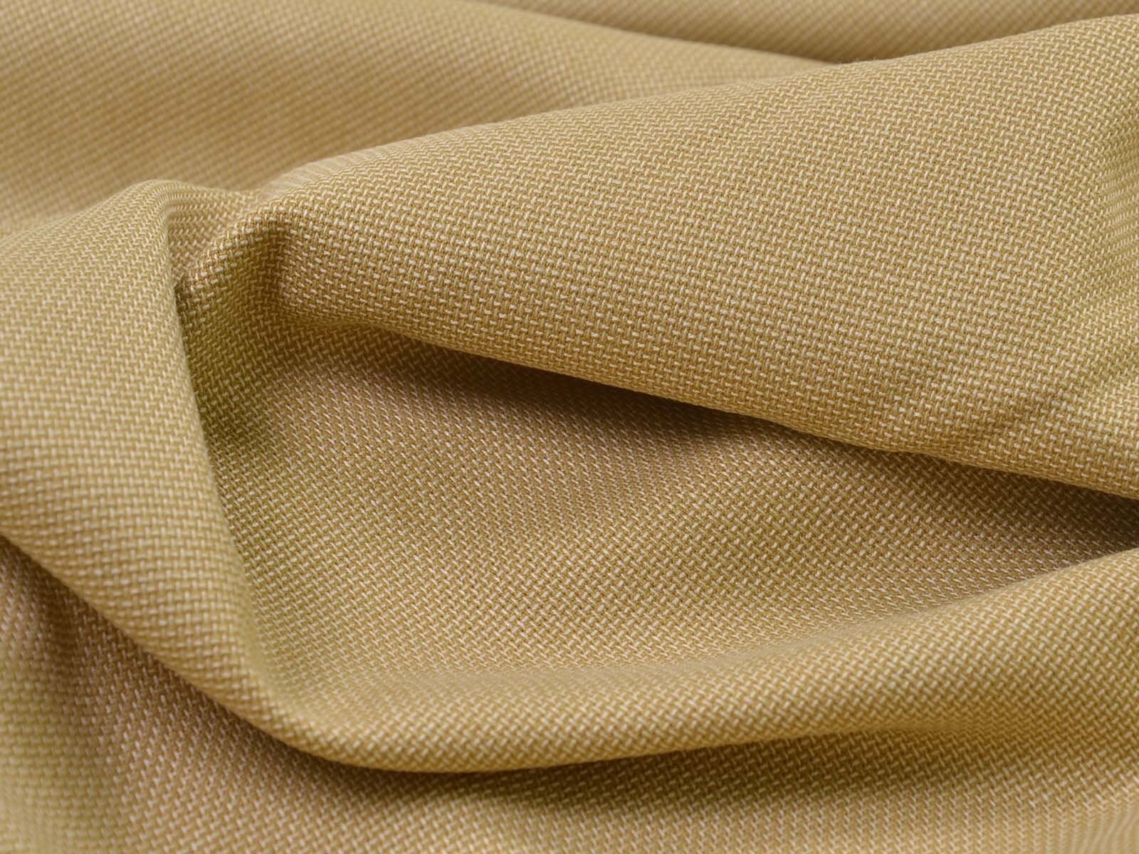Stretchy mustard-yellow mottled trouser fabric made from bamboo with recycled polyester. The fabric is thin, has a slightly grainy feel, and drapes smoothly. It's perfect for sewing wide-legged trousers, dresses, skirts, and much more.