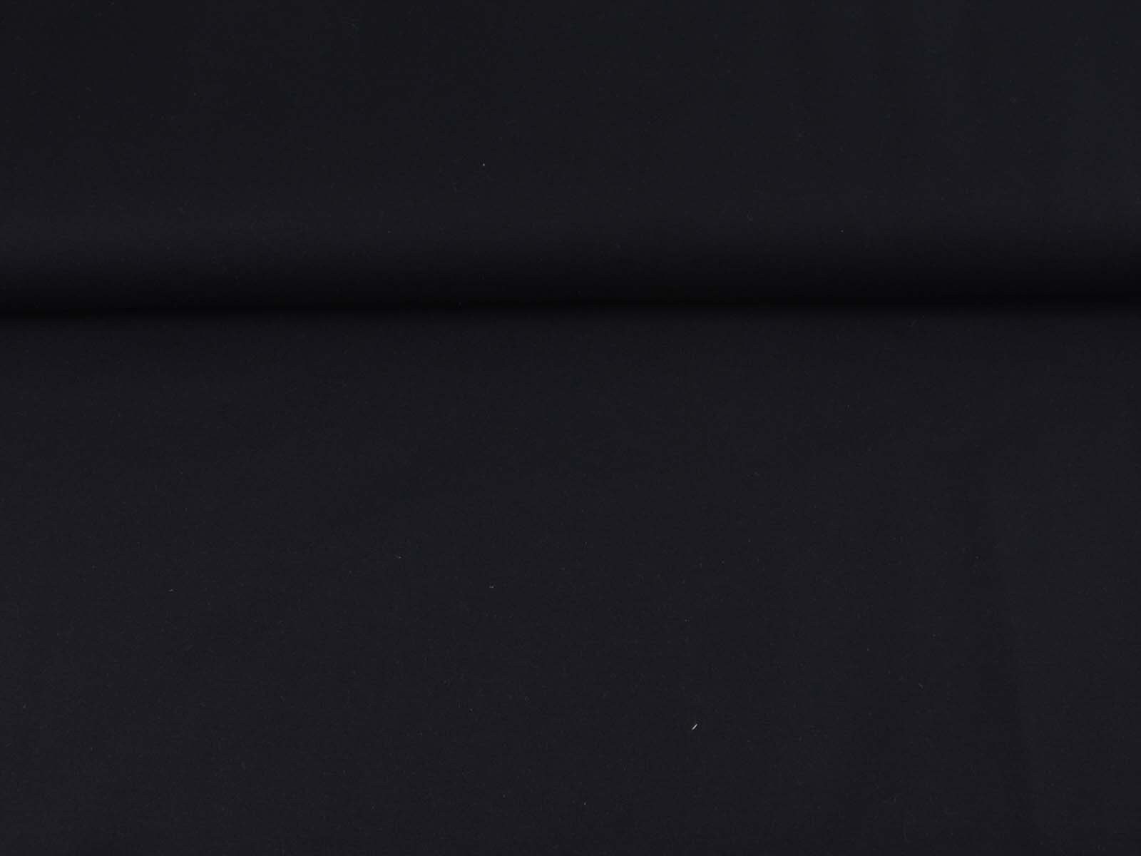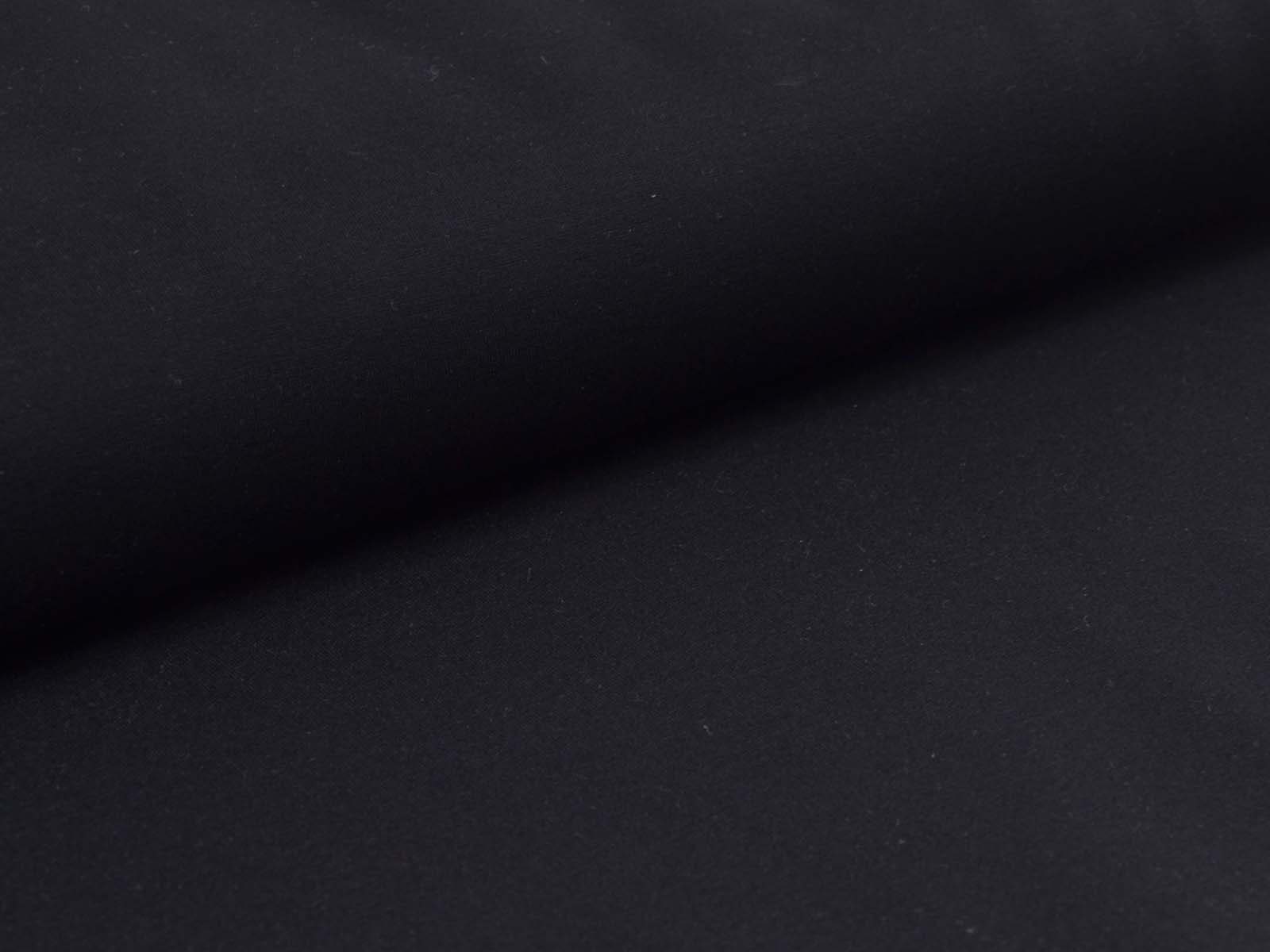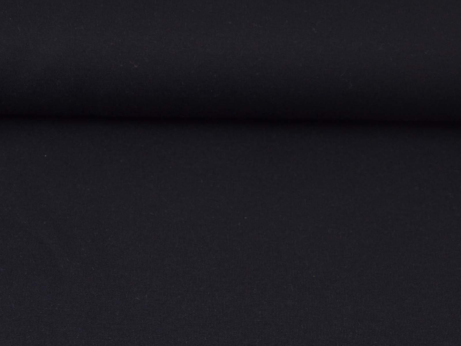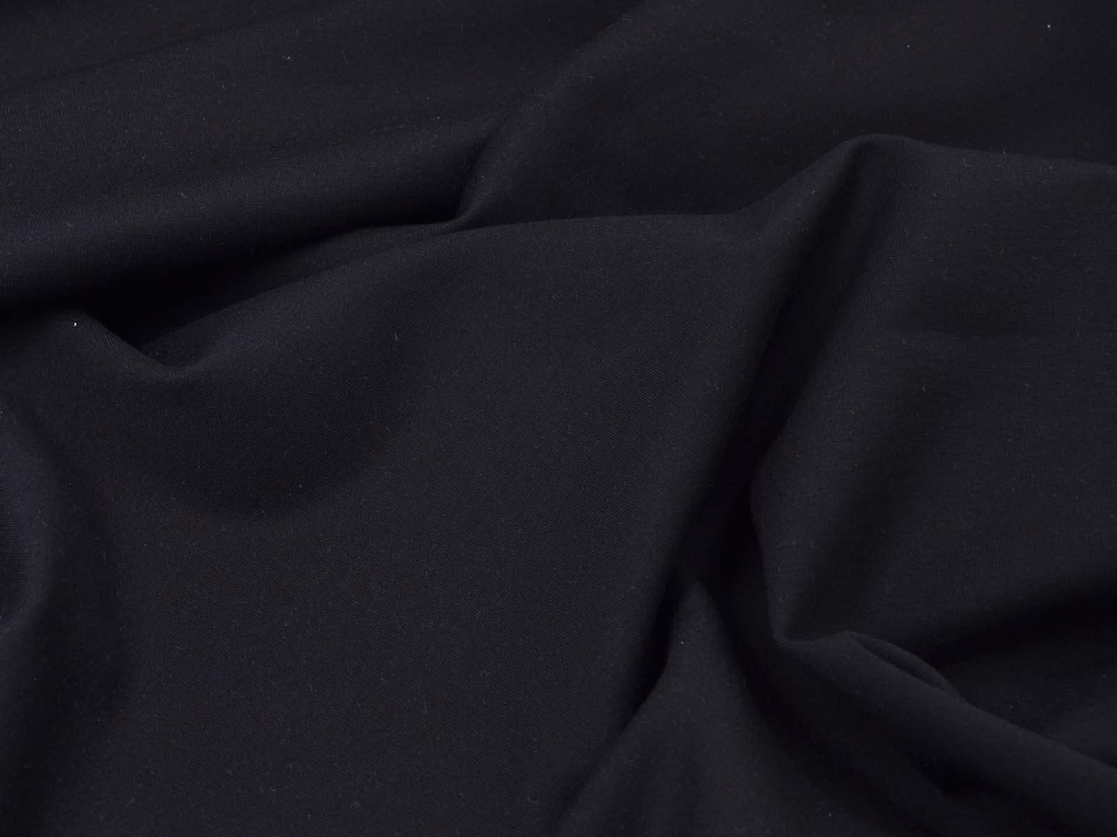 Romanitjersey aus Viskose und Polyamid in uni schwarz. Der Stoff ist glatt, fest, mittelschwer und fühlt sich angenehm auf der Haut an, er knittert wenig. Nähe dir aus ihm T-Shirts, Röcke, Kleider, gemütliche Hosen und vieles mehr.