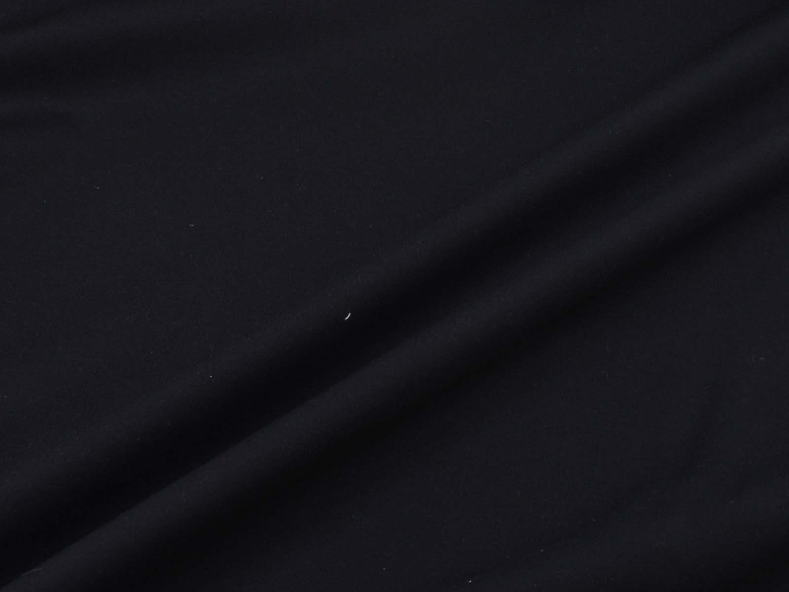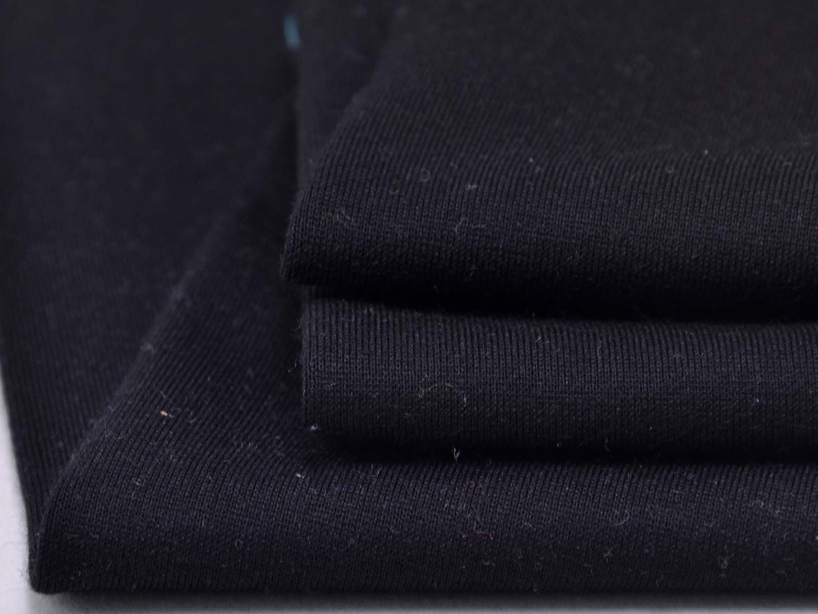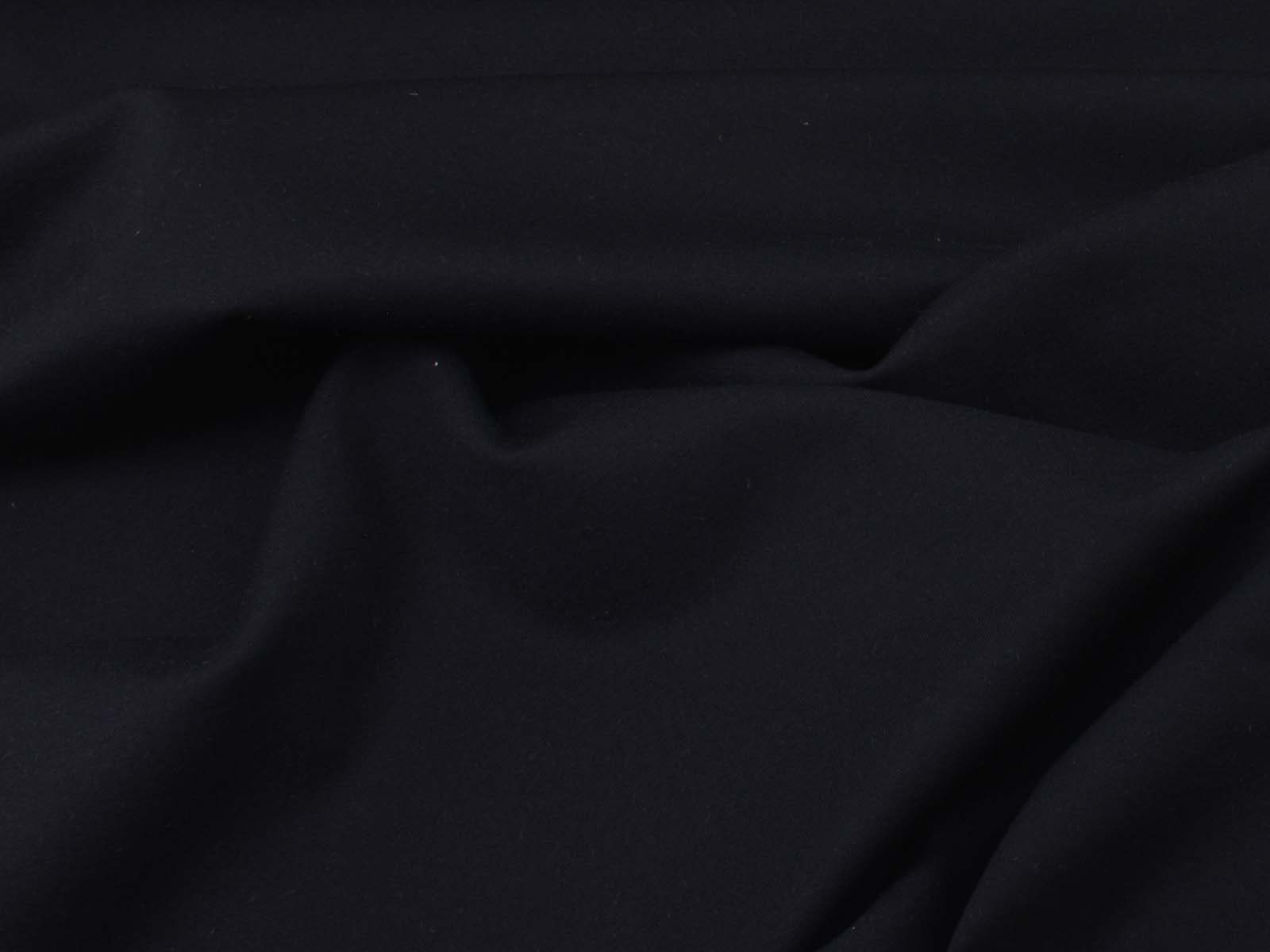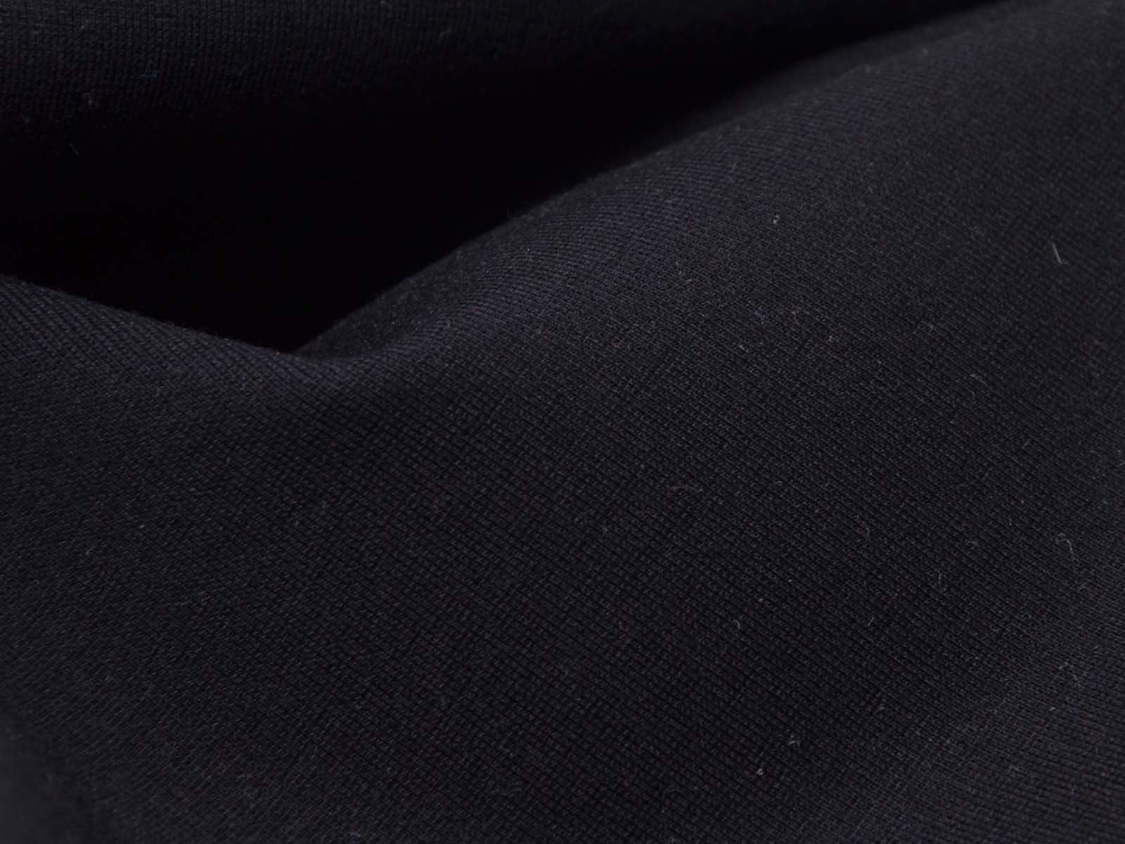 Romanitjersey aus Viskose und Polyamid in uni schwarz. Der Stoff ist glatt, fest, mittelschwer und fühlt sich angenehm auf der Haut an, er knittert wenig. Nähe dir aus ihm T-Shirts, Röcke, Kleider, gemütliche Hosen und vieles mehr.