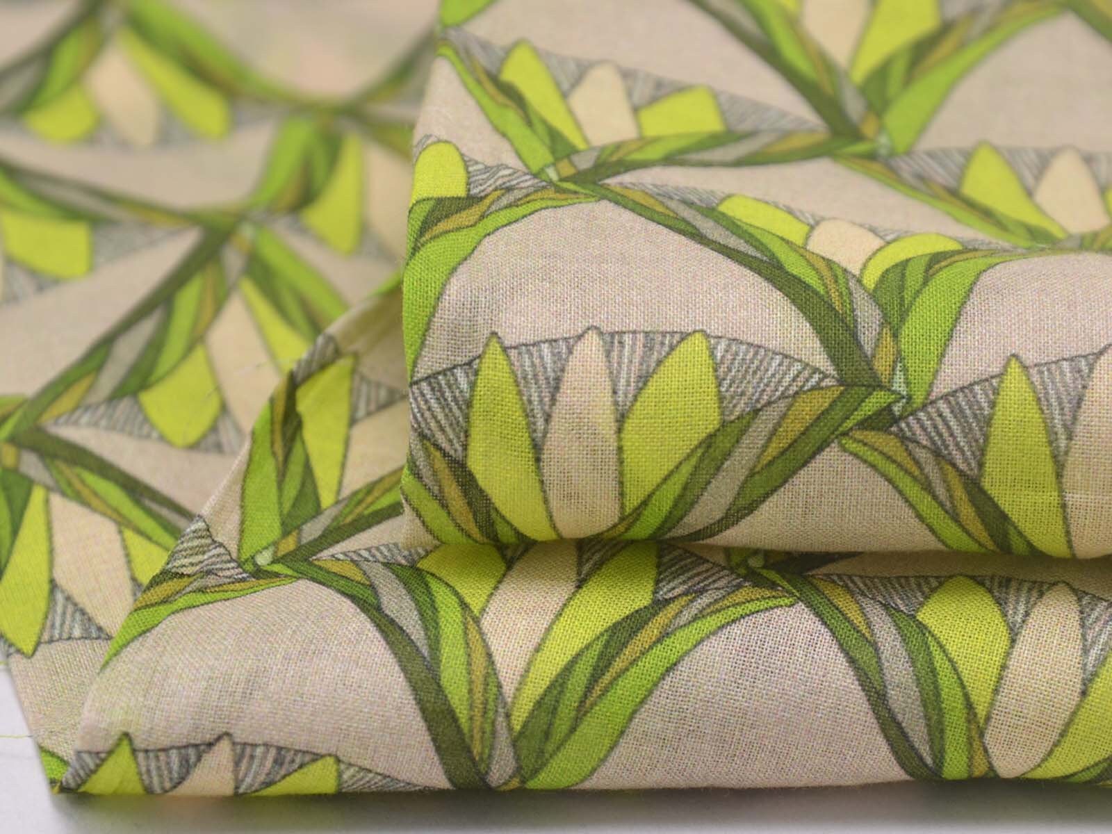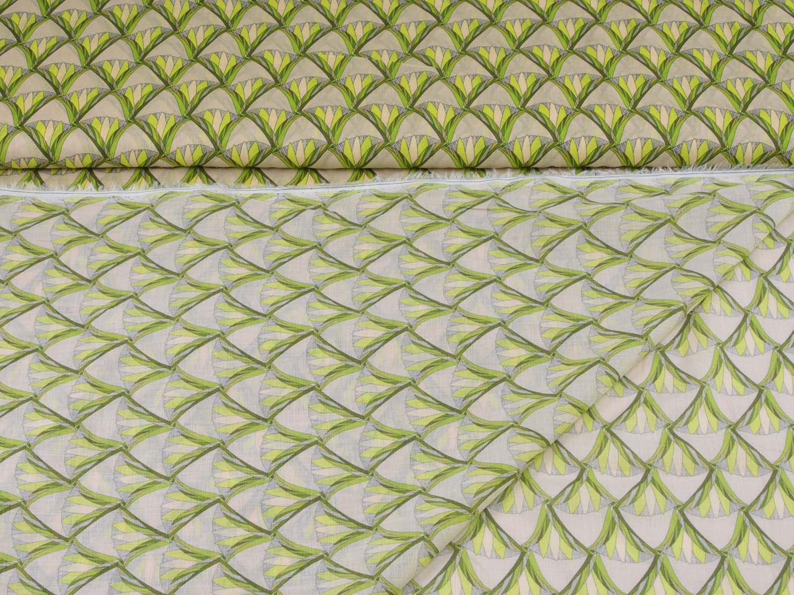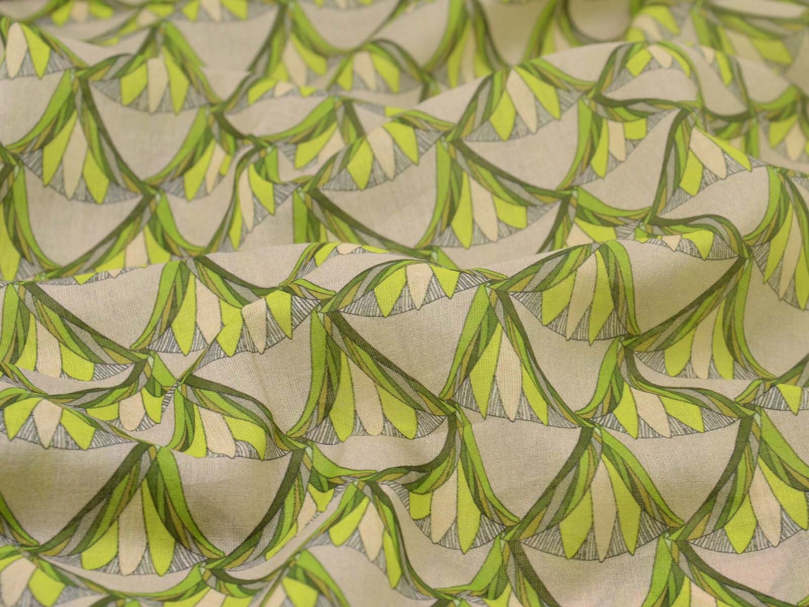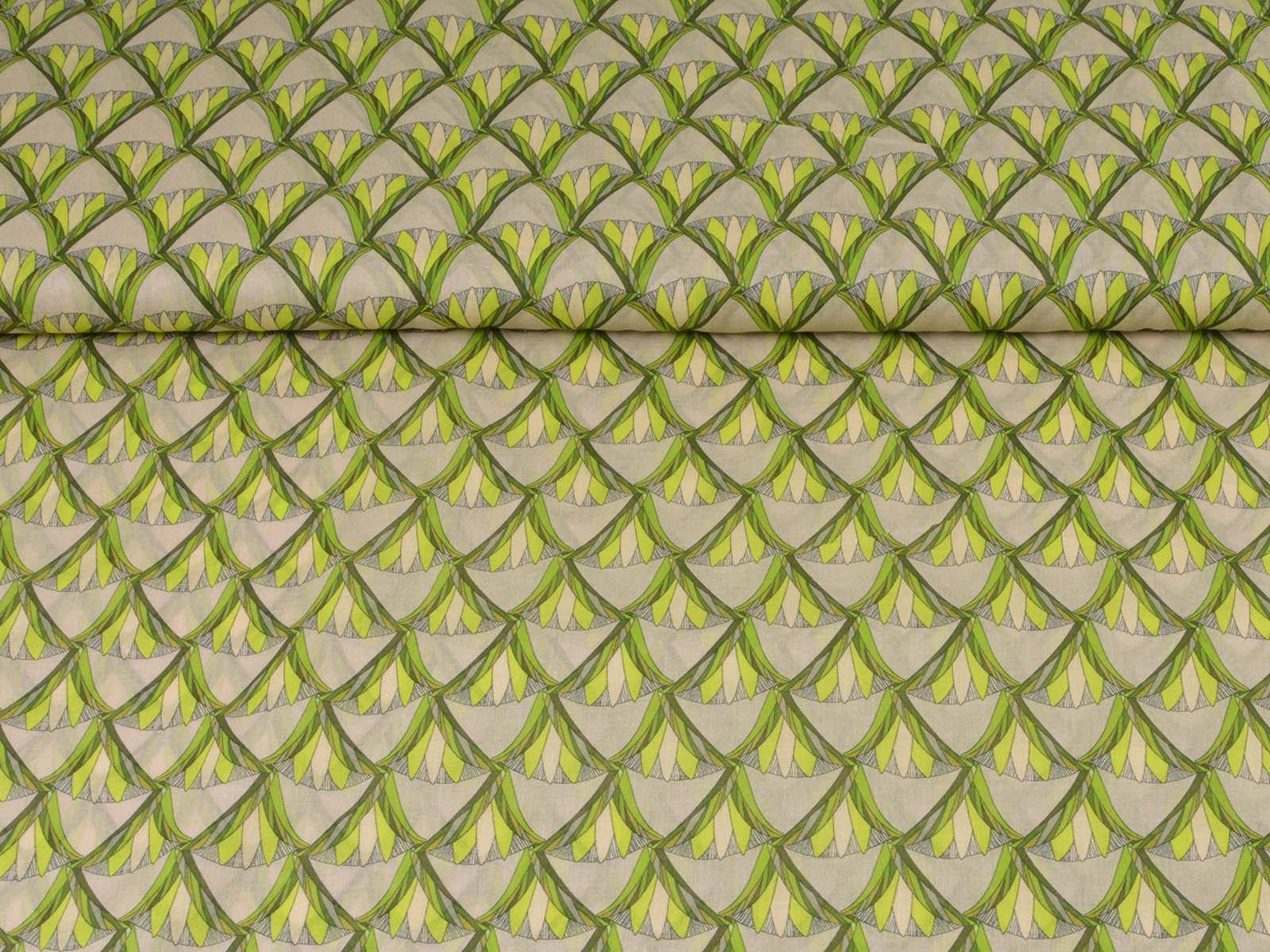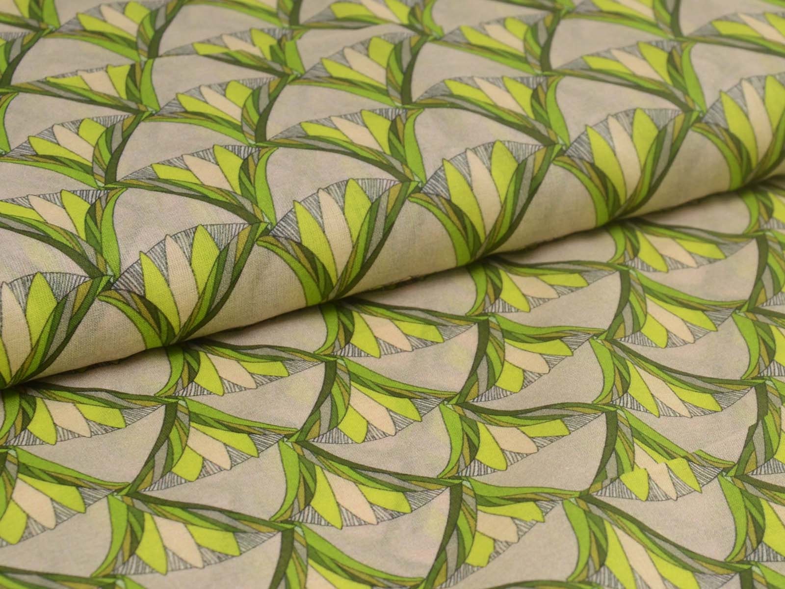 Dünne Webware aus Baumwolle. Der Batist ist sehr dünn, glatt, halb transparent und grün gemustert. Er eignet sich für Sommerblusen, Kleider und Röcke. Eventuell solltest du den Stoff füttern.