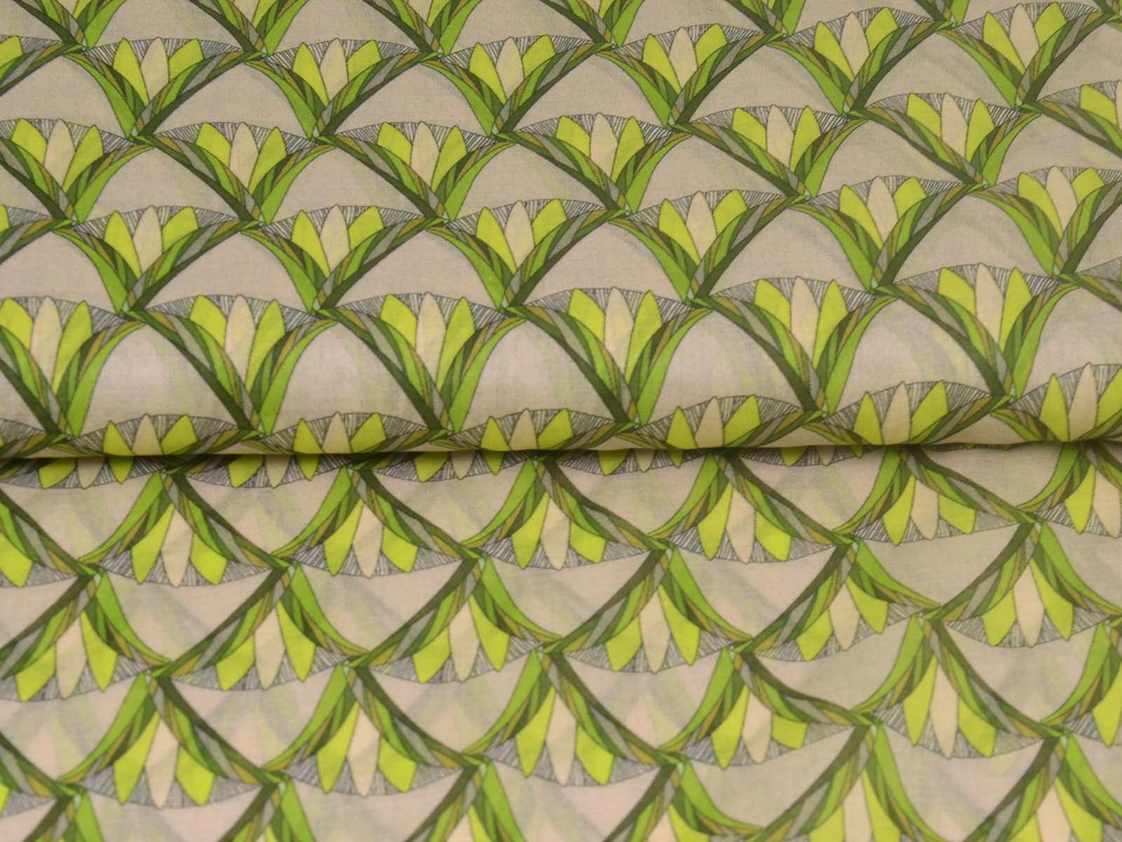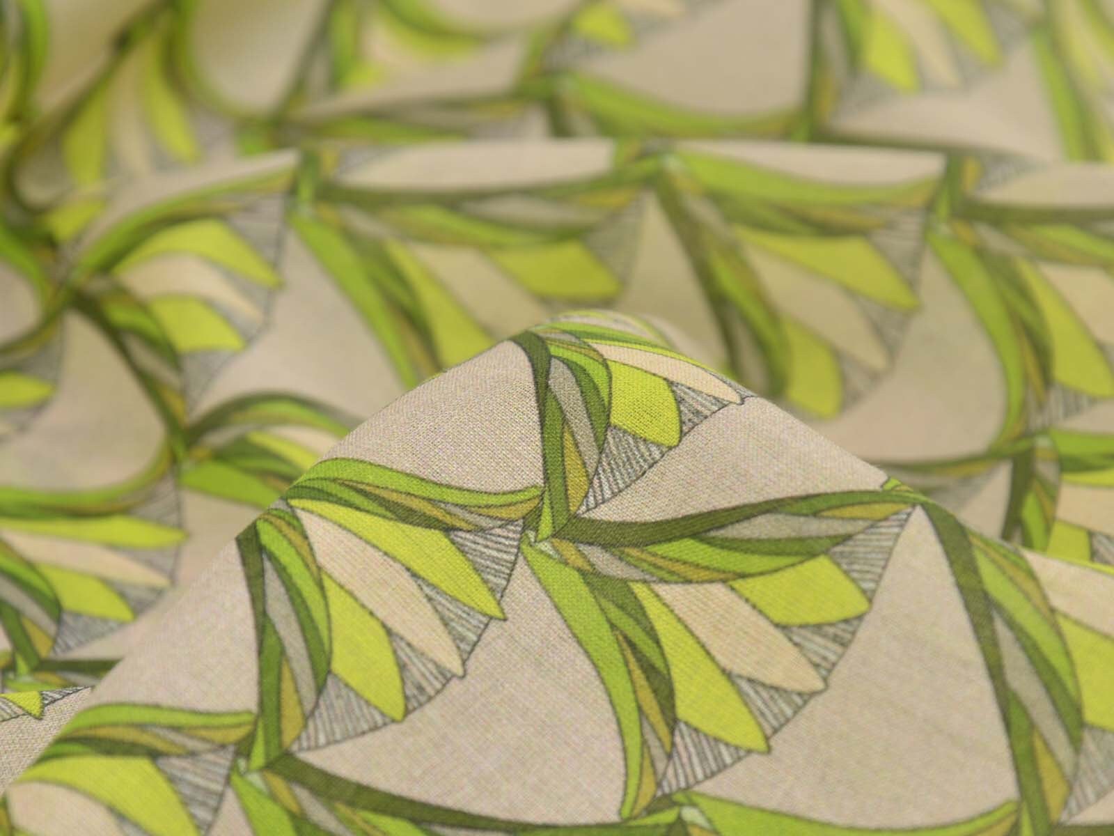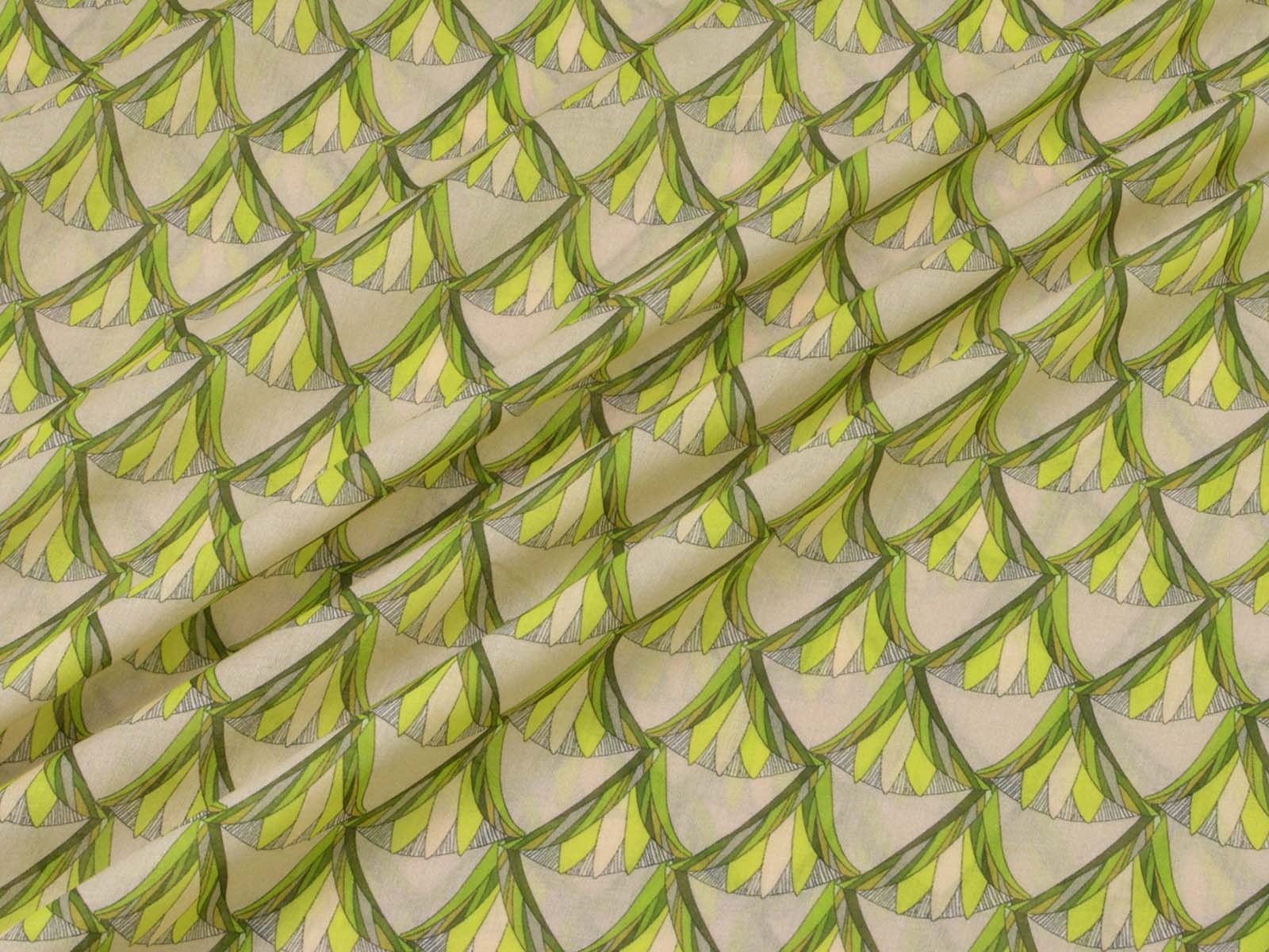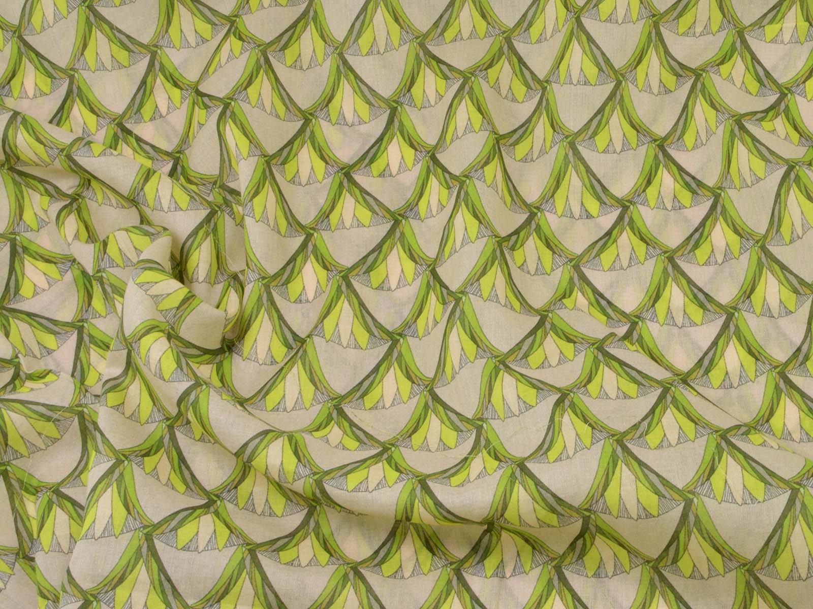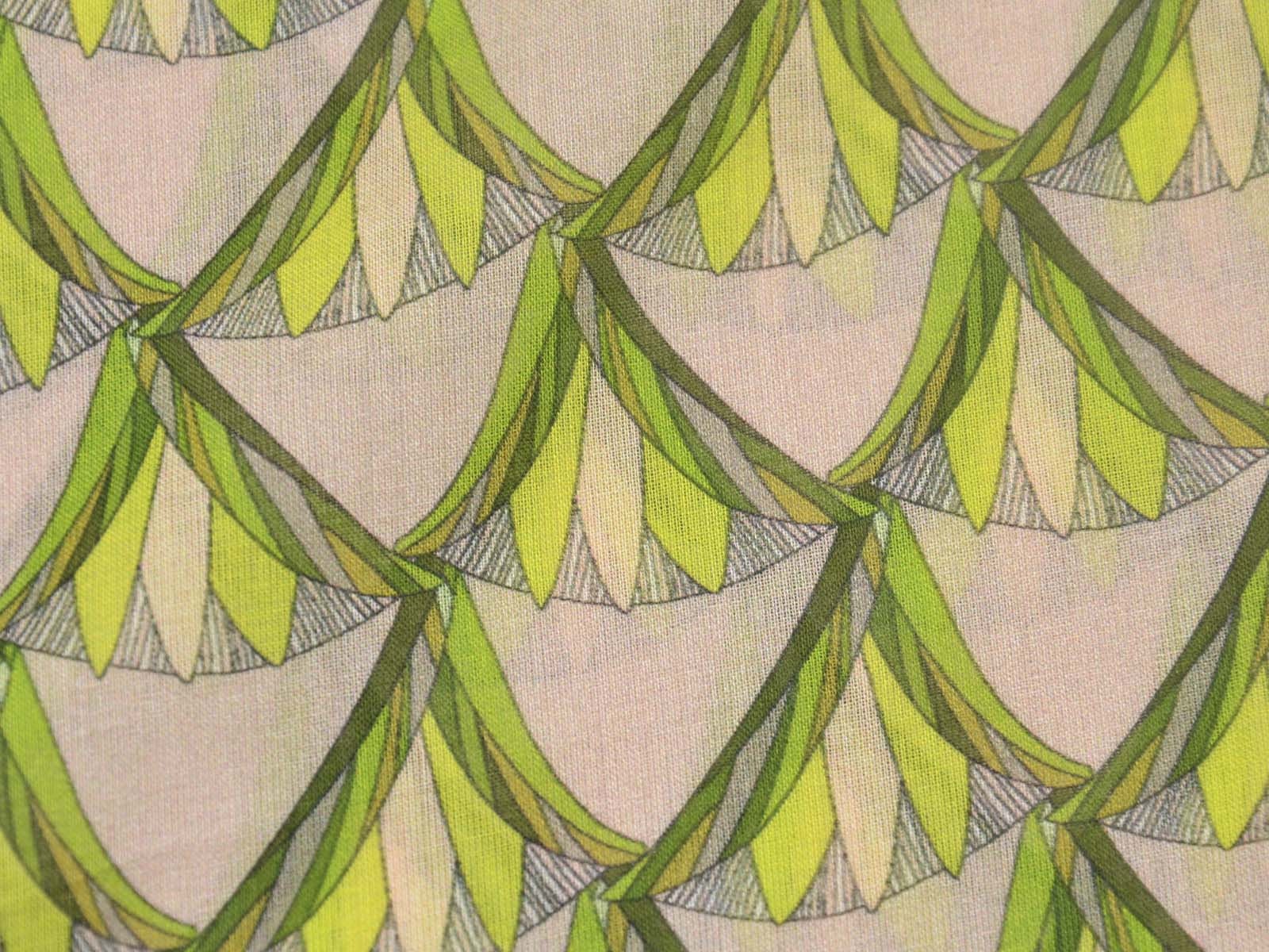 Dünne Webware aus Baumwolle. Der Batist ist sehr dünn, glatt, halb transparent und grün gemustert. Er eignet sich für Sommerblusen, Kleider und Röcke. Eventuell solltest du den Stoff füttern.