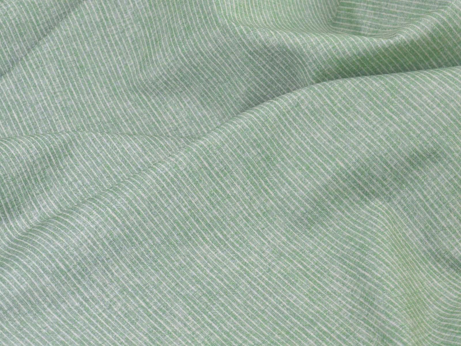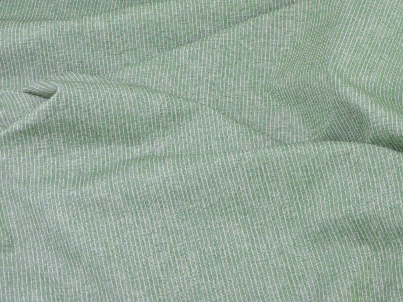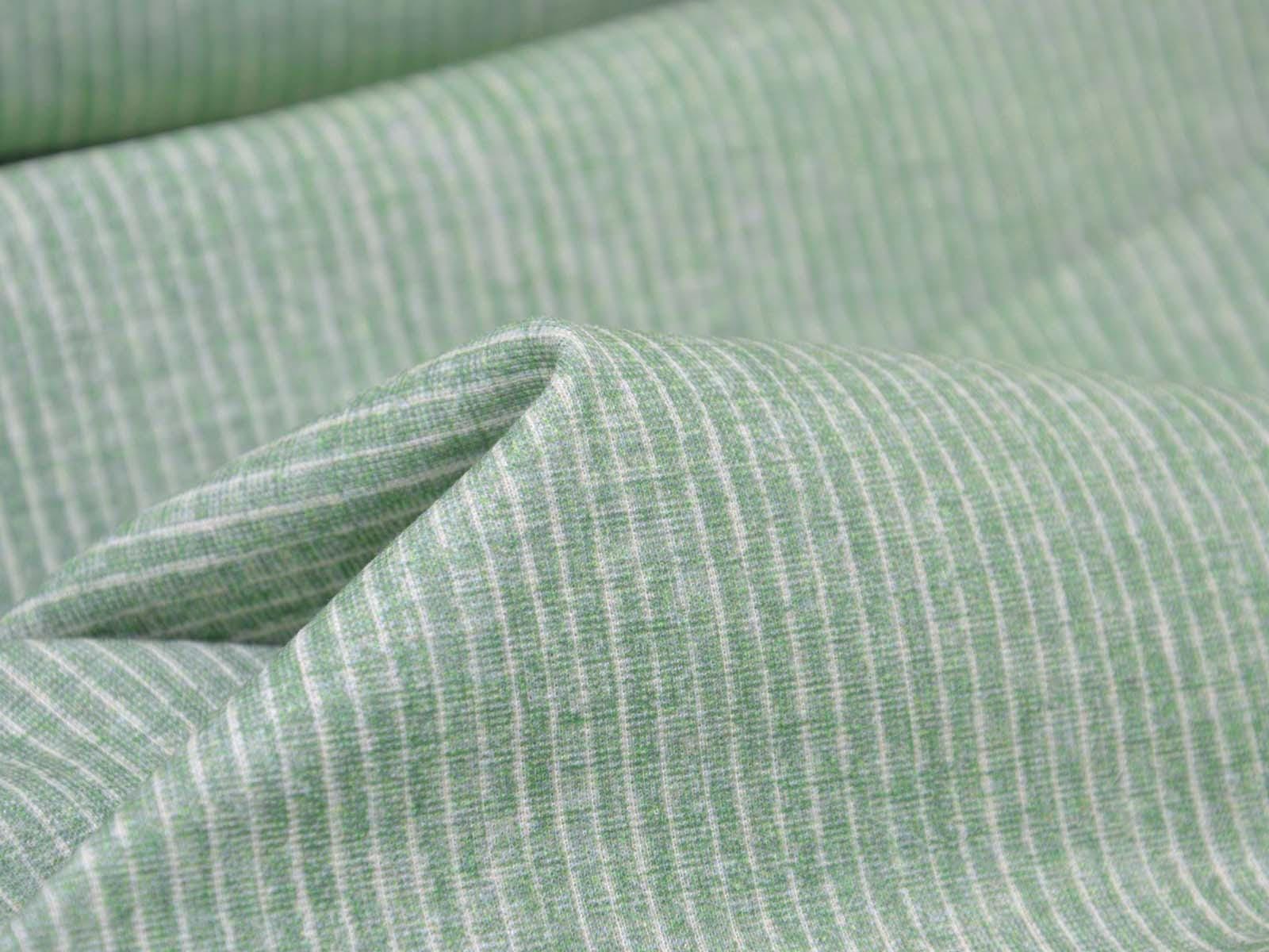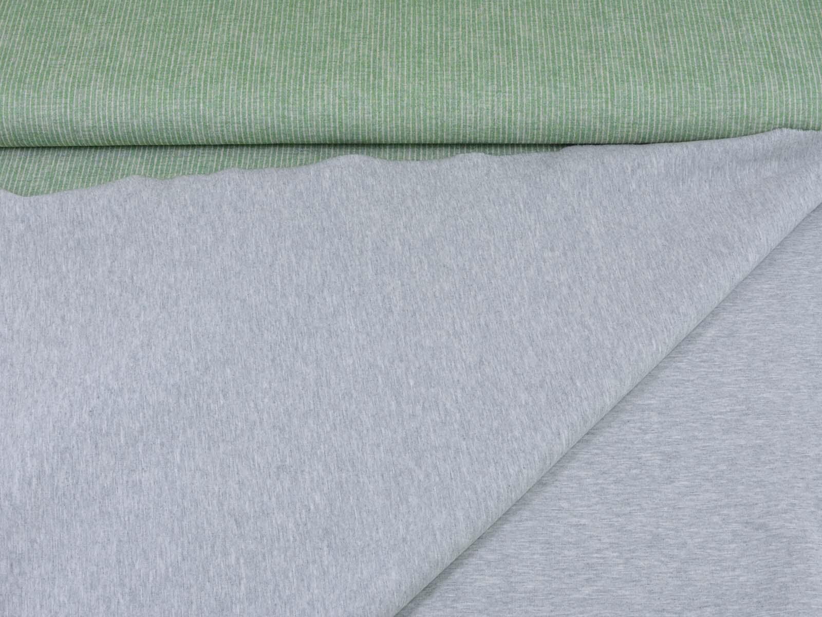 Romanit Jersey aus Viskose in grün mit weißen Streifen. Der Stoff ist beidseitig verwendbar, die andere Seite ist grau meliert. Der Stoff ist glatt, fest und mittelschwer. Er eignet sich wunderbar zum Nähen von engen Kleidern, engen Röcken, modernen Blazern, gemütlichen Hosen und vielem mehr.