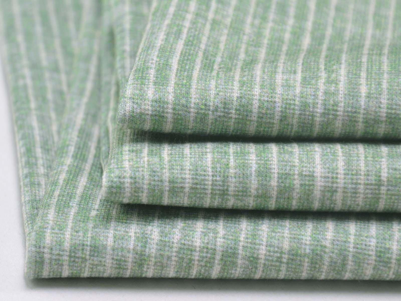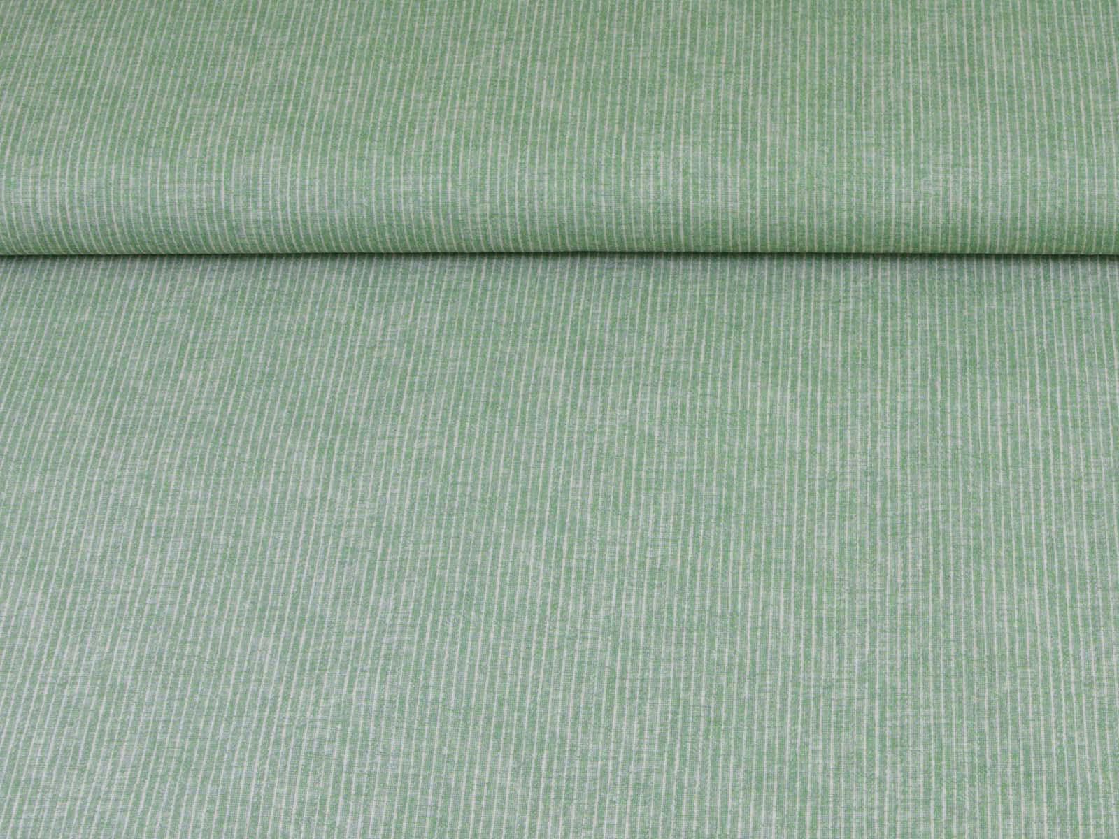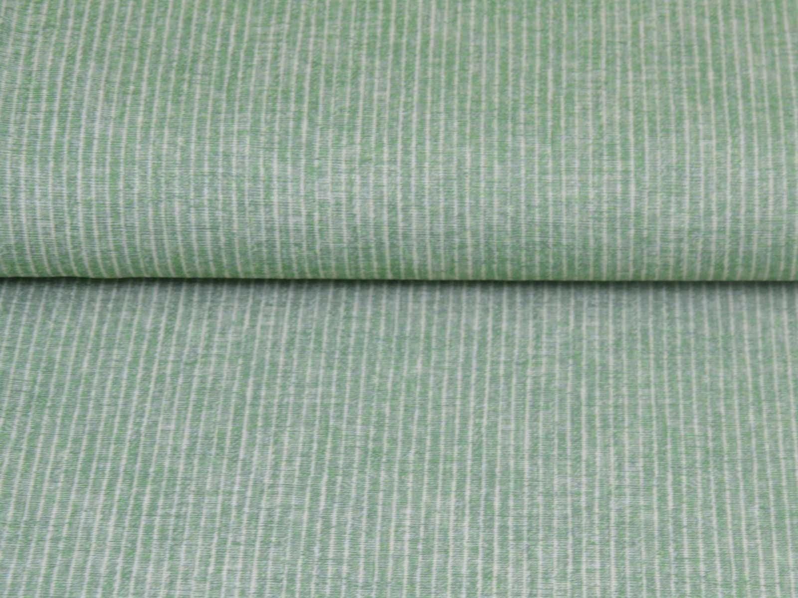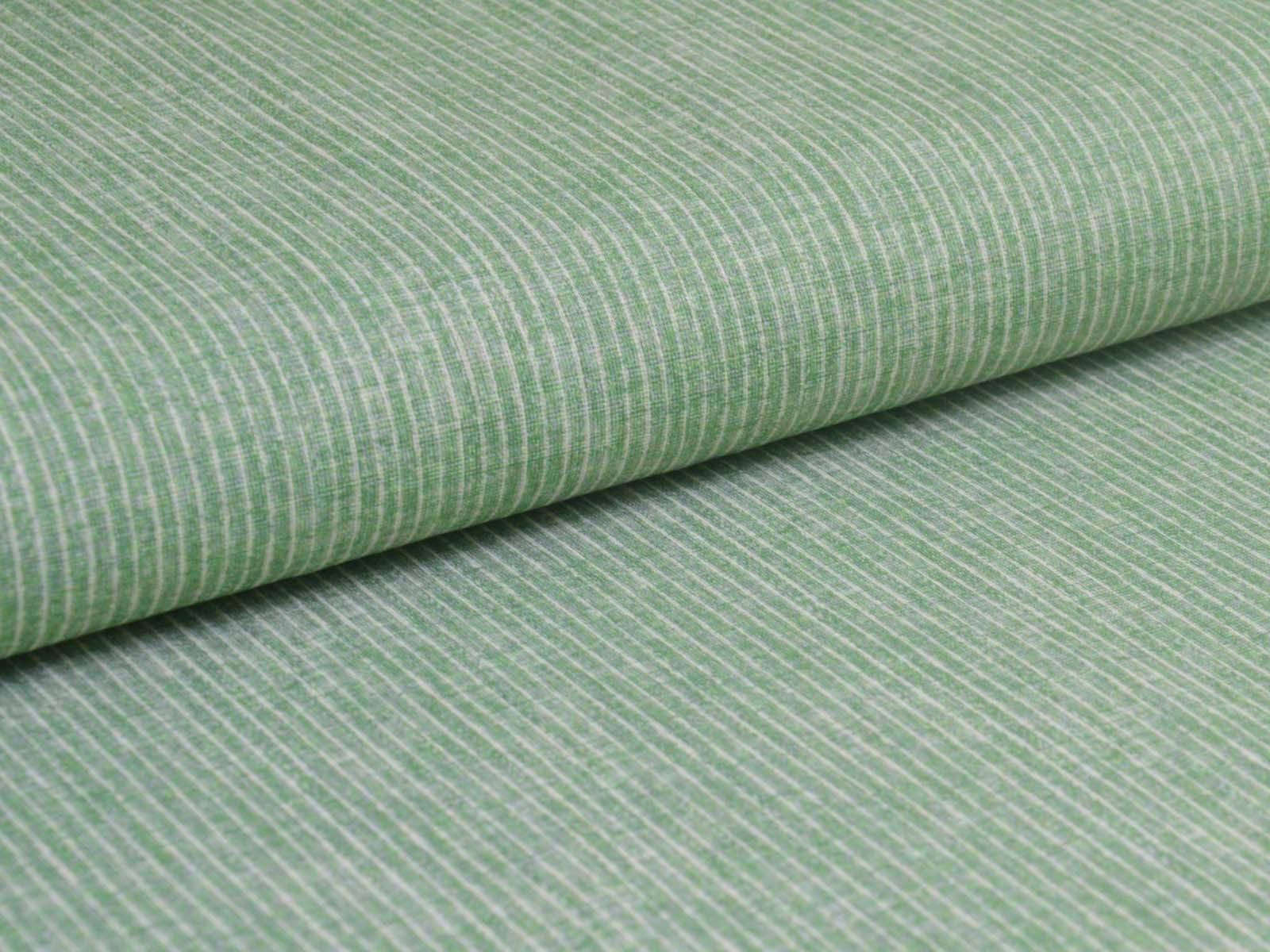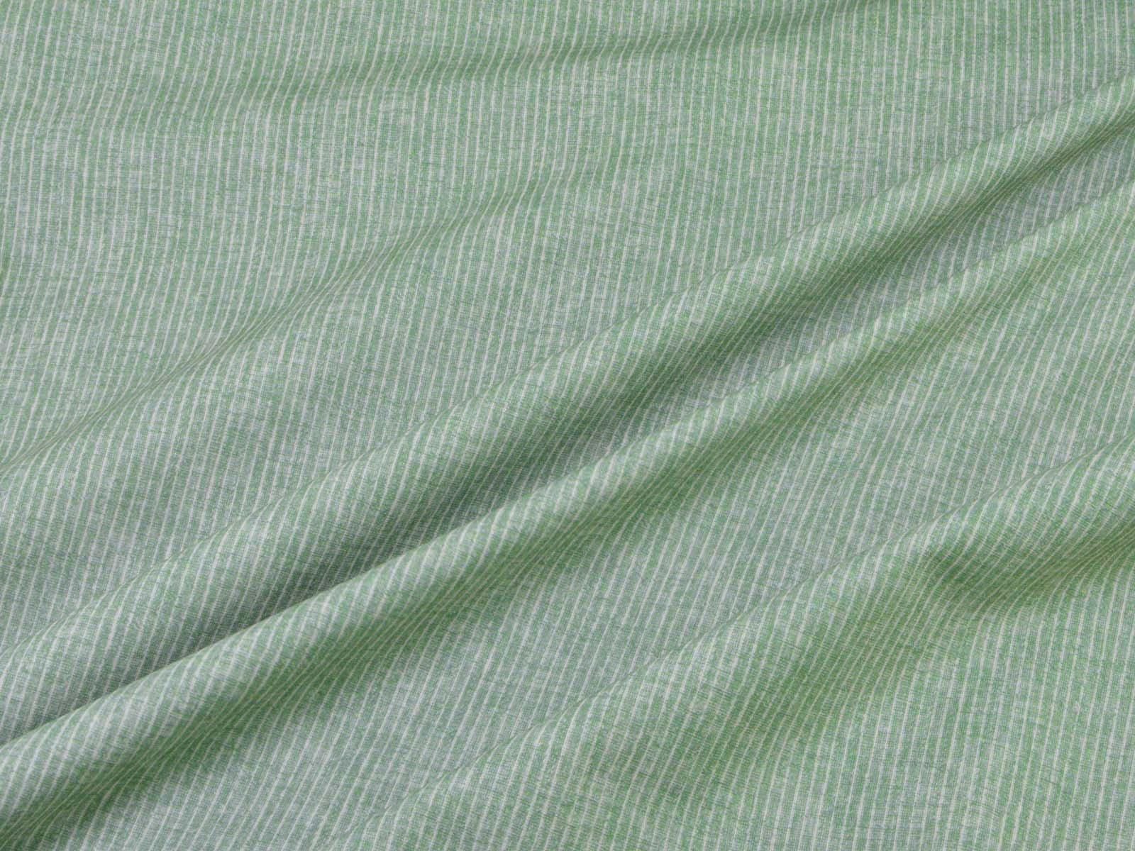 Romanit Jersey aus Viskose in grün mit weißen Streifen. Der Stoff ist beidseitig verwendbar, die andere Seite ist grau meliert. Der Stoff ist glatt, fest und mittelschwer. Er eignet sich wunderbar zum Nähen von engen Kleidern, engen Röcken, modernen Blazern, gemütlichen Hosen und vielem mehr.