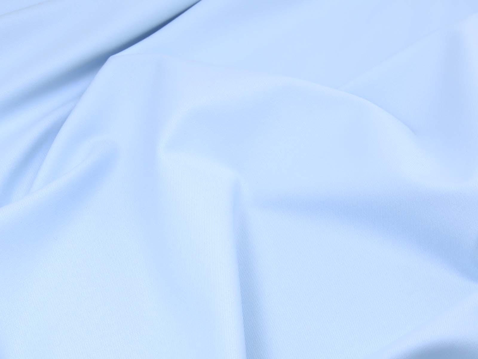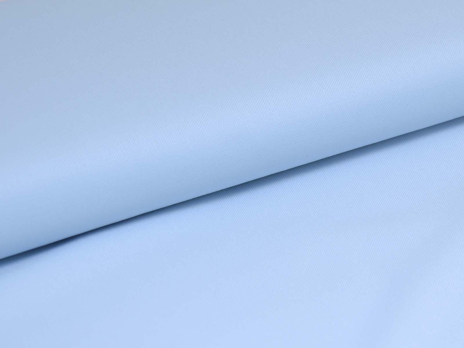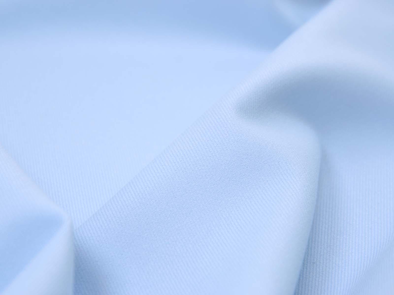 Woven twill fabric made of viscose and polyester with stretch in plain light blue. The fabric is medium-thick, medium-weight, smooth, and bi-stretchy. Use it to sew tight-fitting pants, dresses, and skirts.