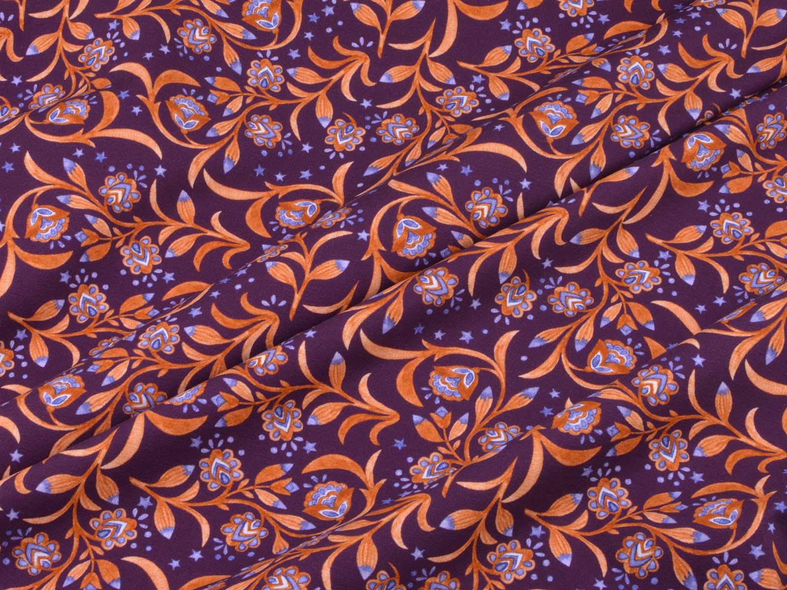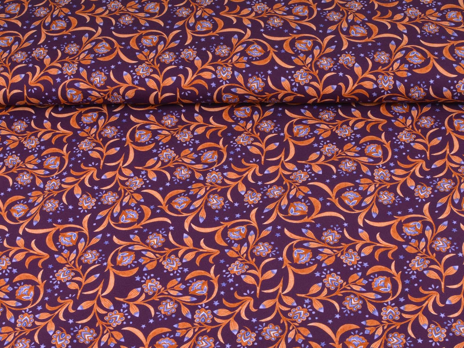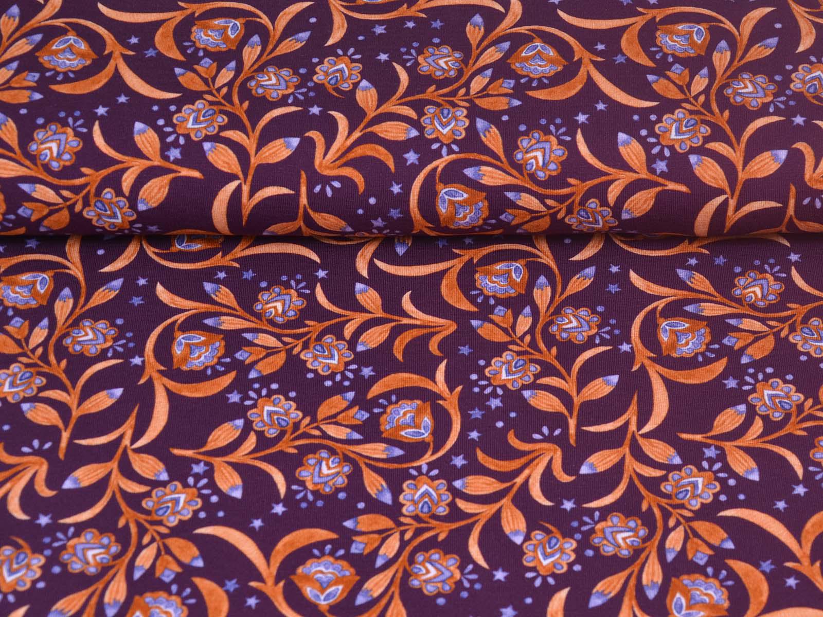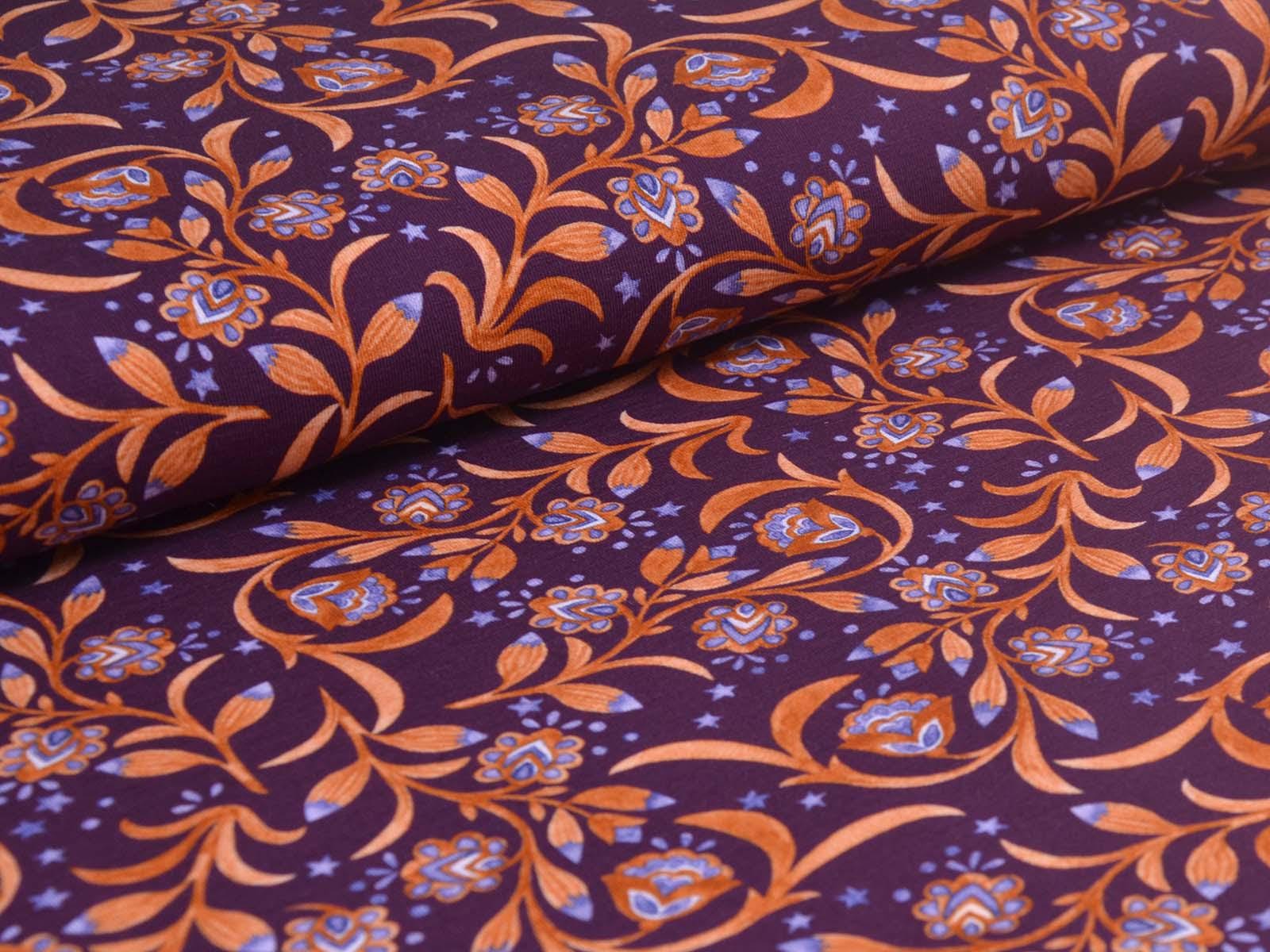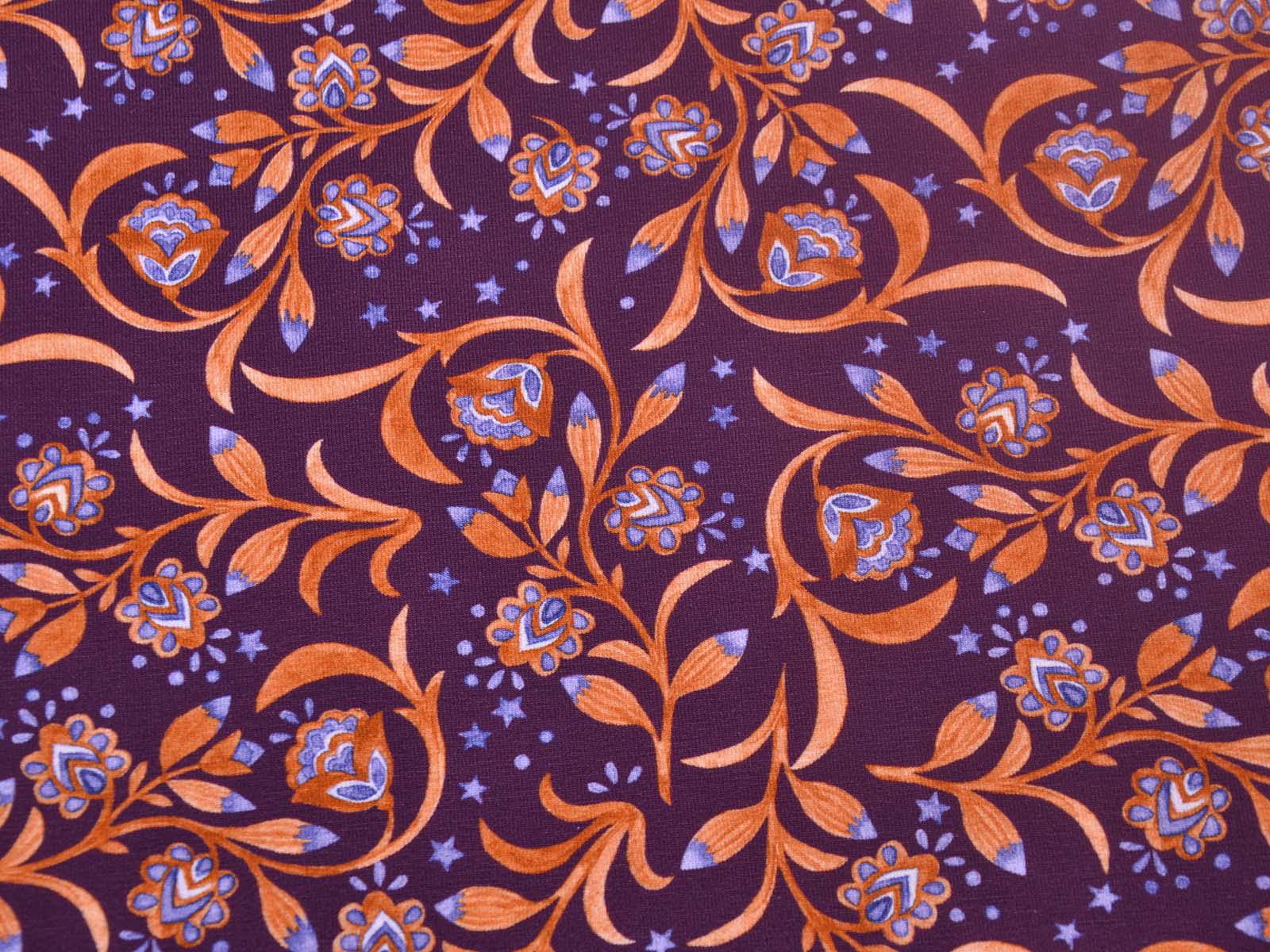 Hochwertiger Jersey aus Baumwolle von Hilco. Der Stoff ist lila mit Blumen, Sternen und Ranken. Der Stoff ist glatt, mittelschwer und angenehm auf der Haut. Er eignet sich zum Nähen von Kleidern, Röcken, T-Shirts, Leggings, Langarmshirts und vielem mehr.