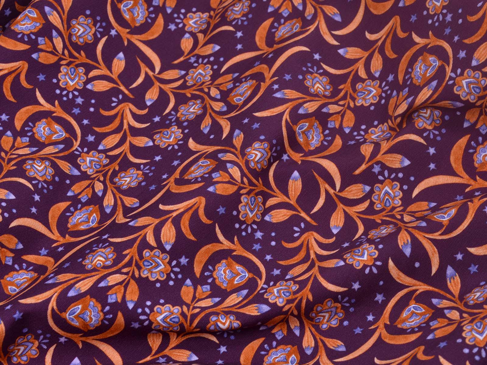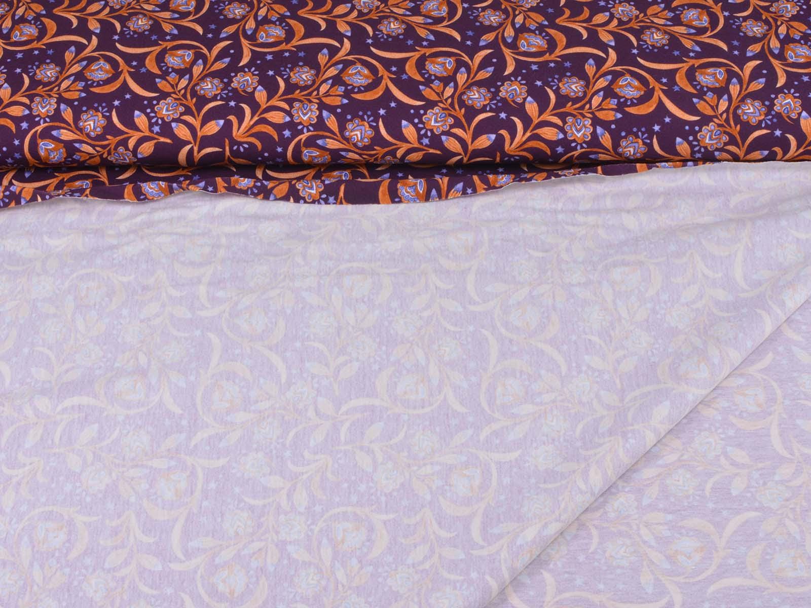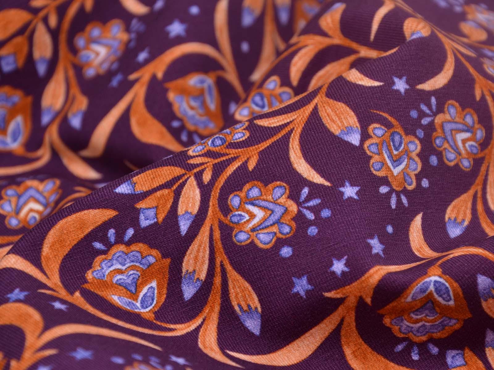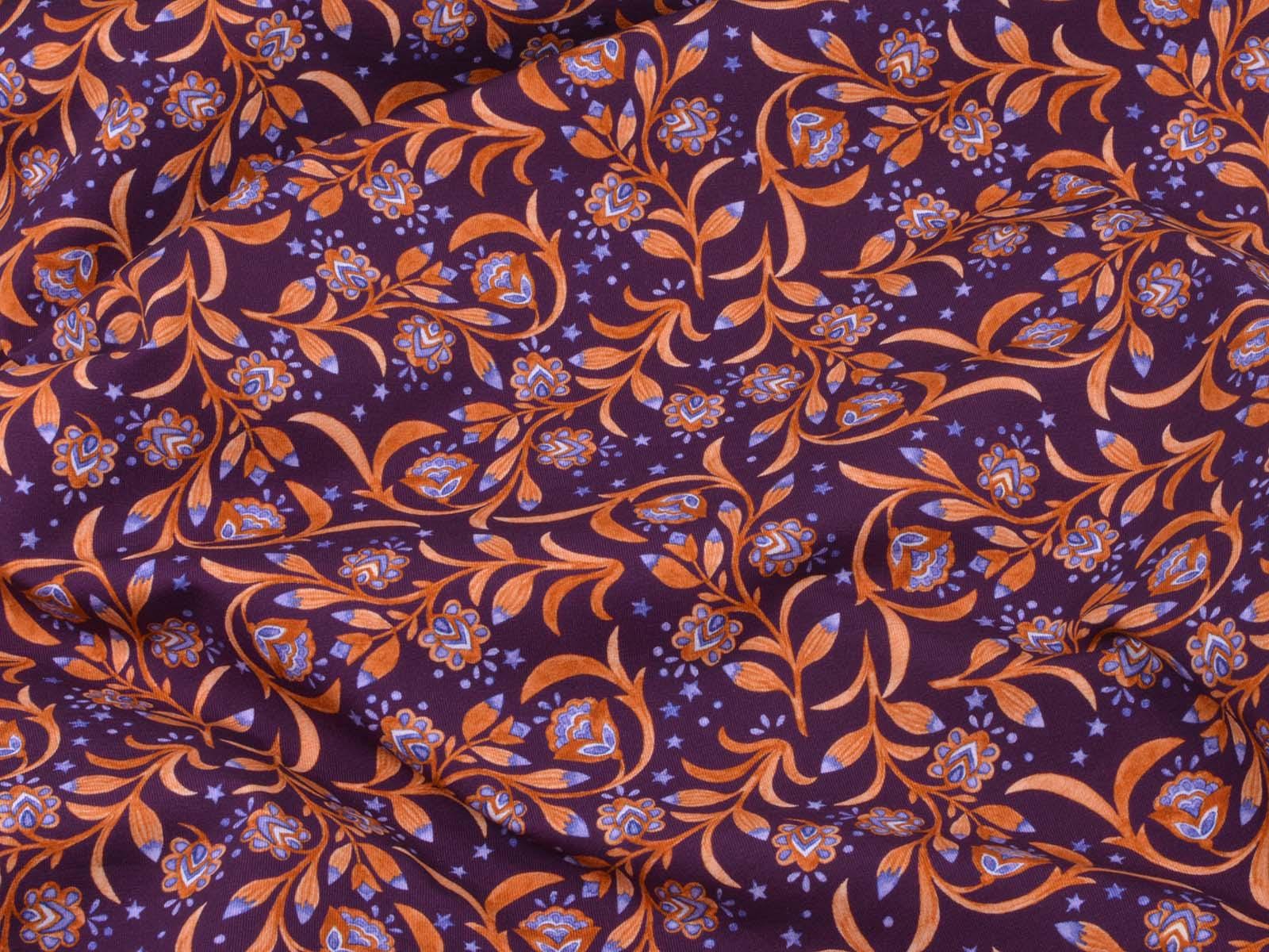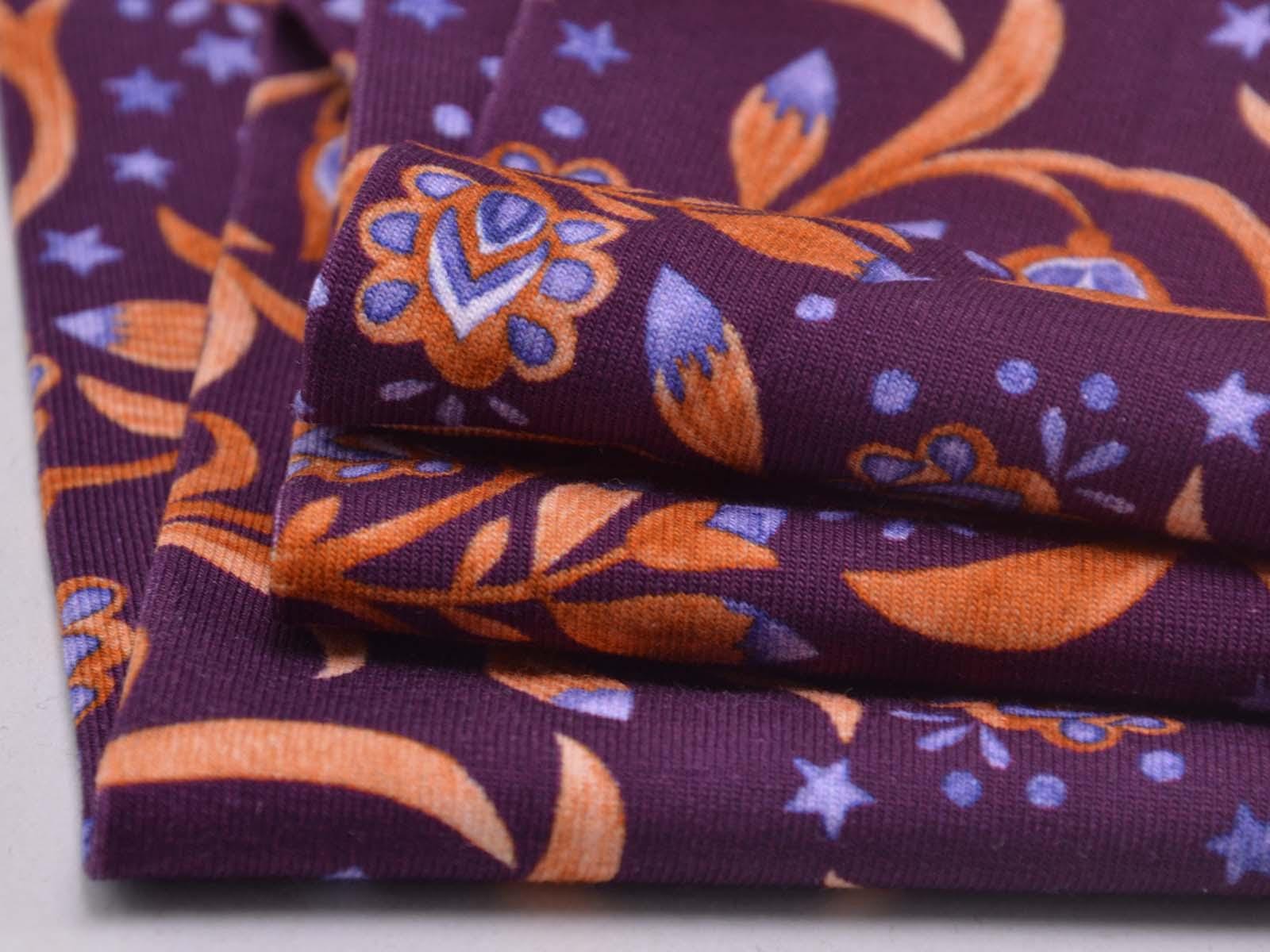 Hochwertiger Jersey aus Baumwolle von Hilco. Der Stoff ist lila mit Blumen, Sternen und Ranken. Der Stoff ist glatt, mittelschwer und angenehm auf der Haut. Er eignet sich zum Nähen von Kleidern, Röcken, T-Shirts, Leggings, Langarmshirts und vielem mehr.