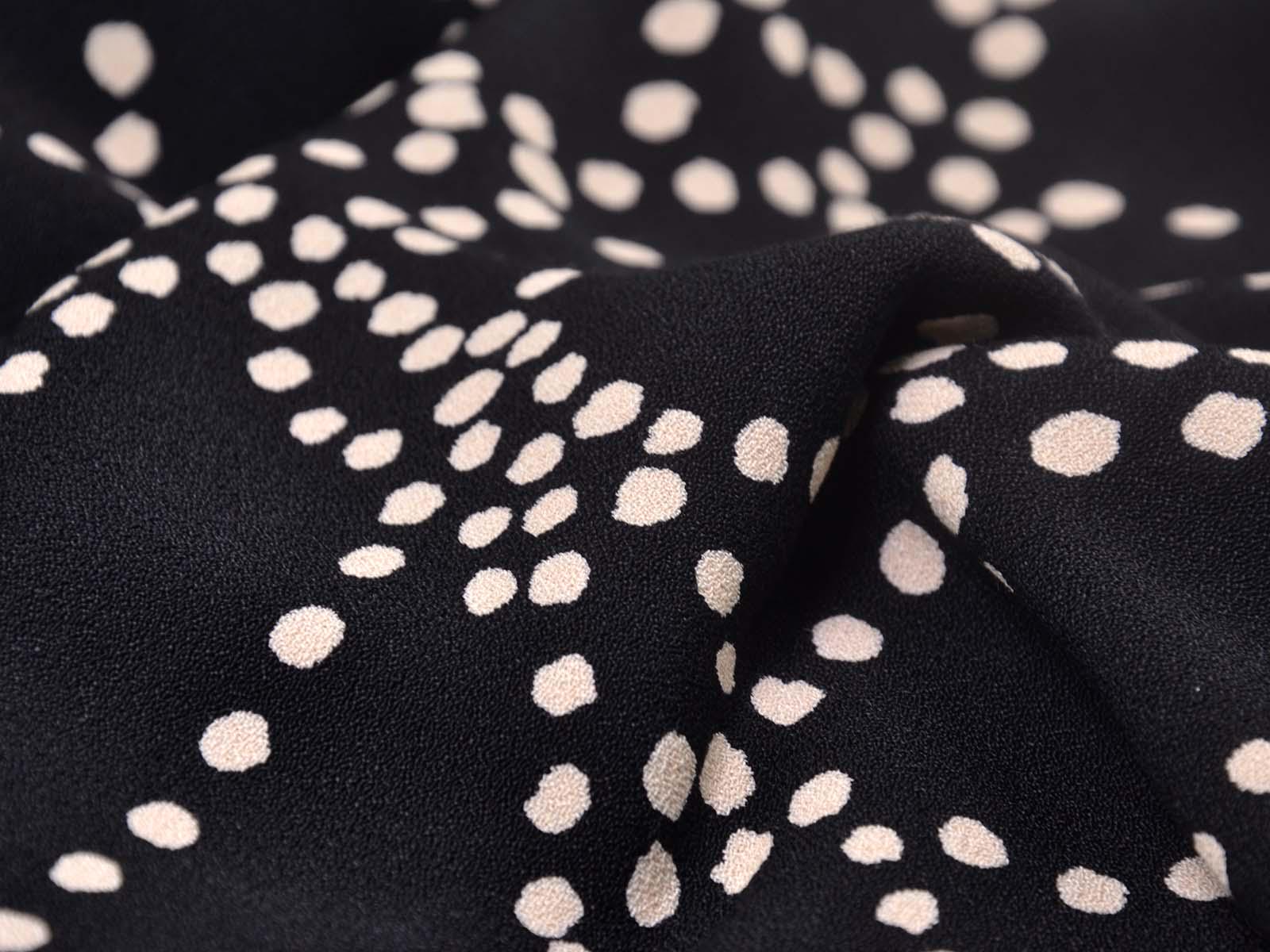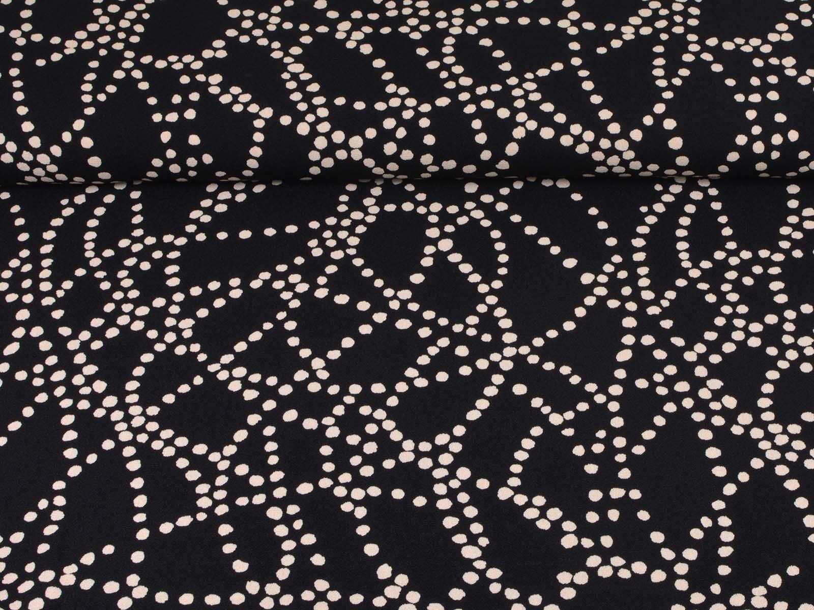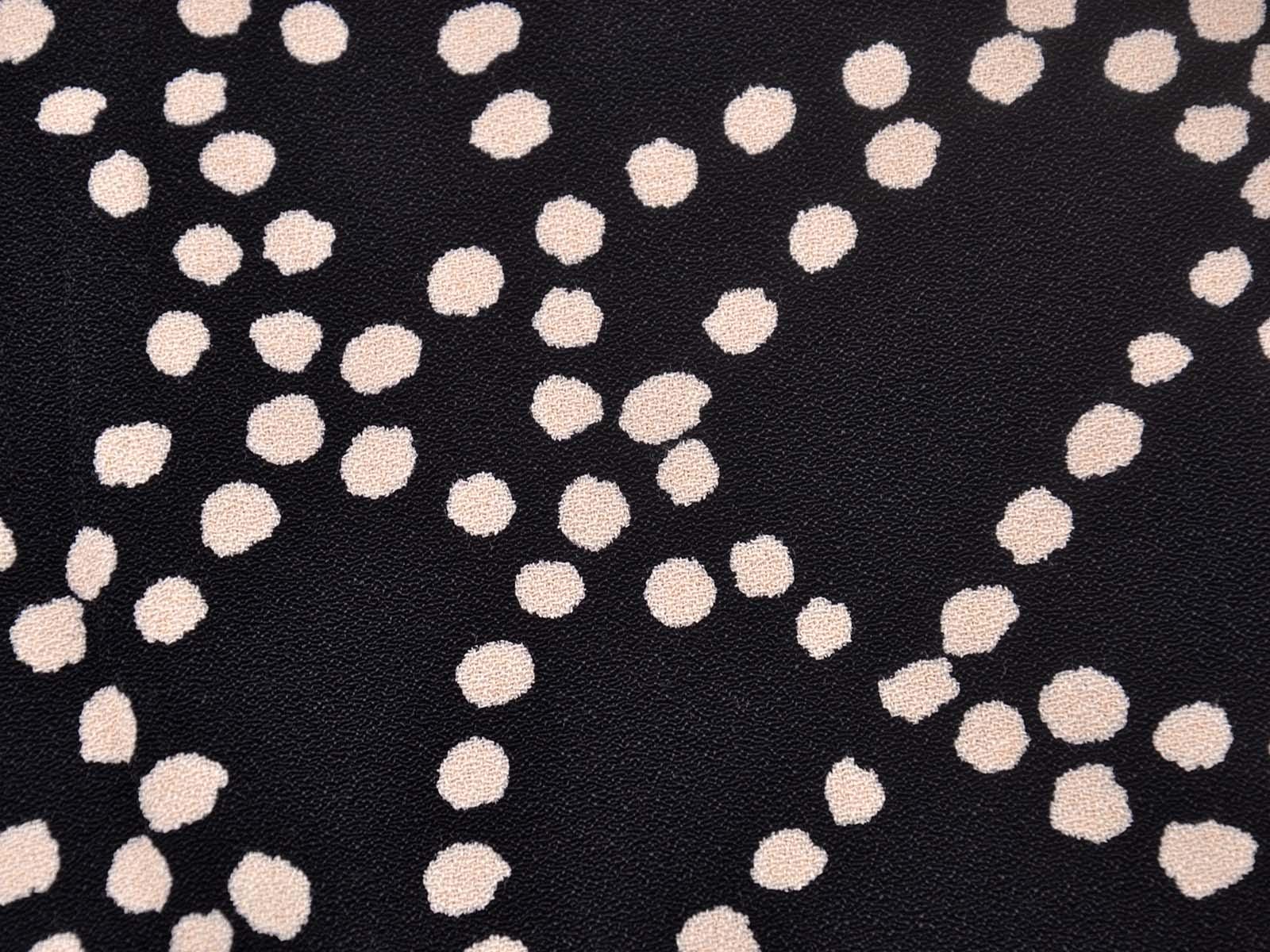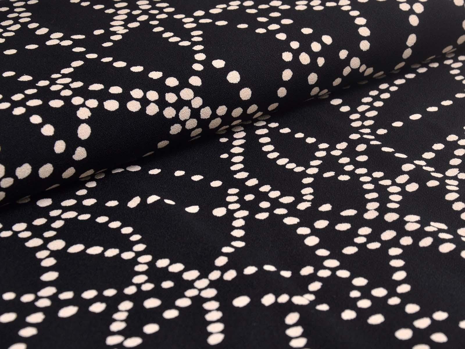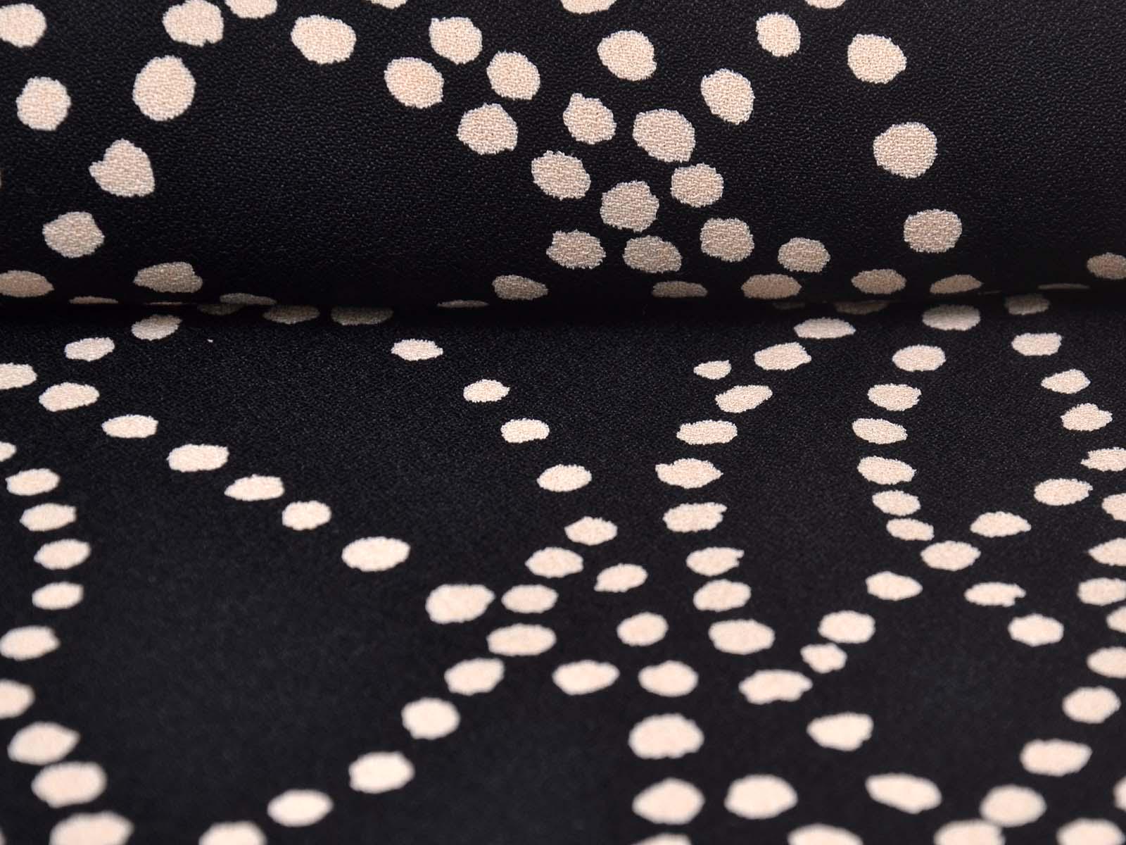 Sehr hochwertige Webware aus Viskose von Hilco. Der Crêpe-Stoff ist schwarz mit beigen Punkten. Die Viskose ist mittelschwer und hat einen eher fließenden Fall. Der Stoff eignet sich zum Nähen von Kleidern, Röcken und Tuniken.
