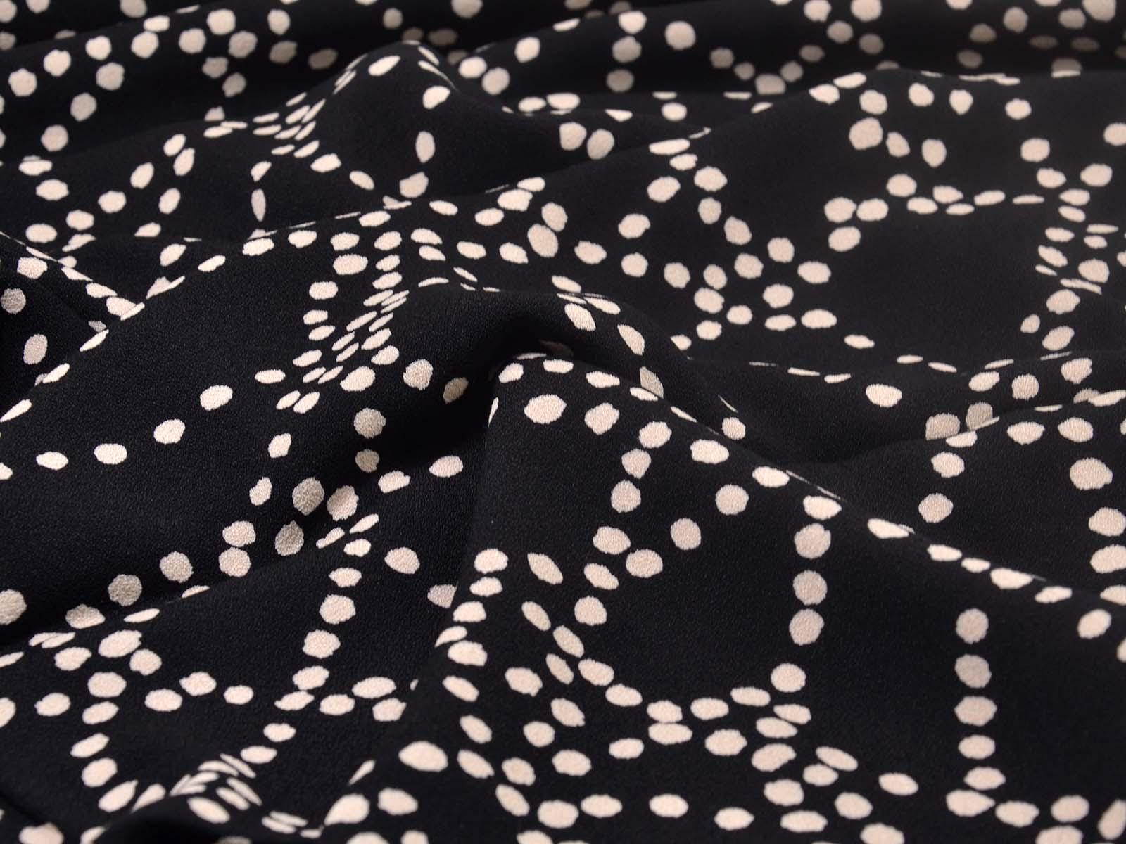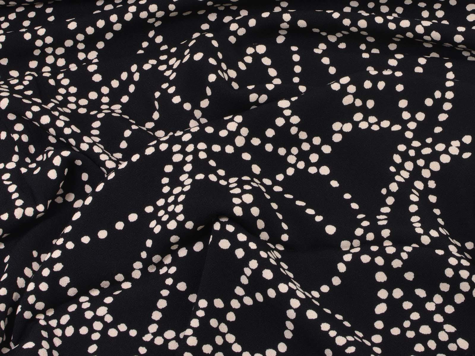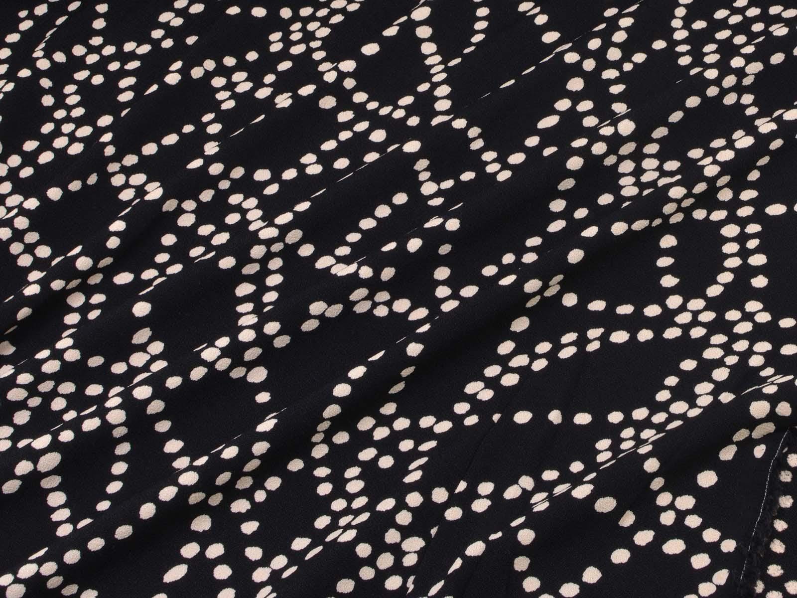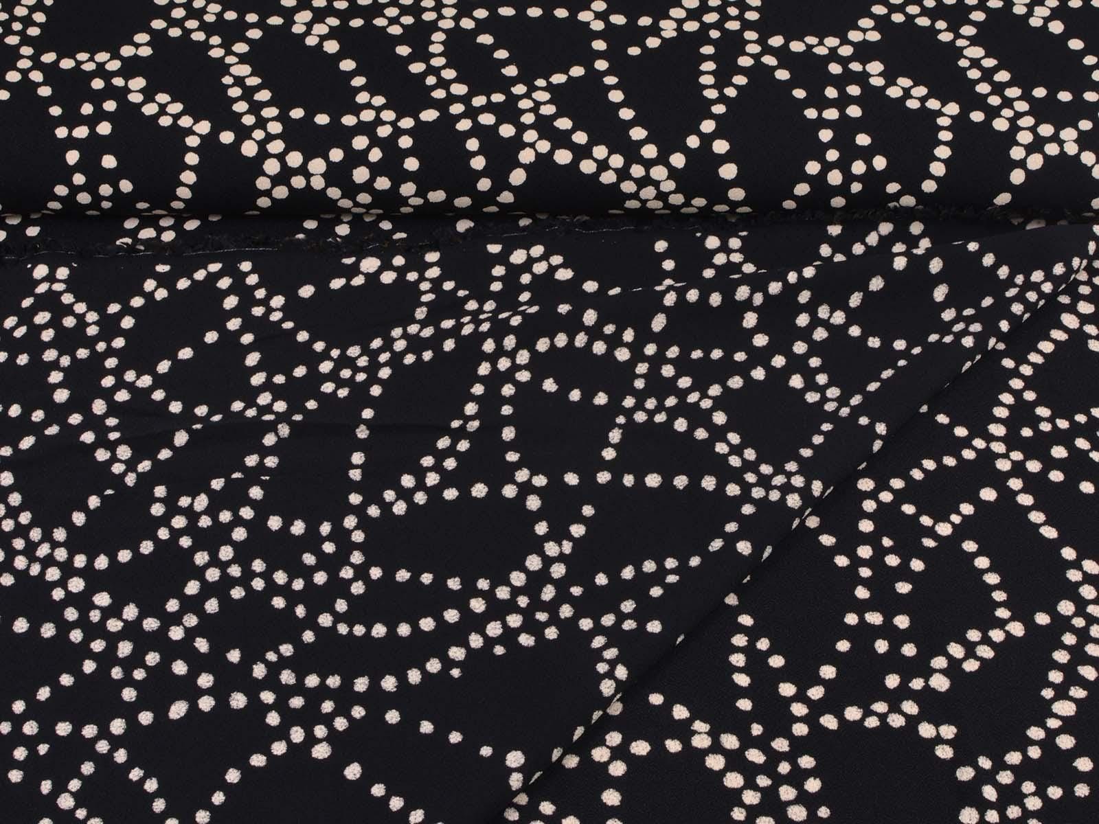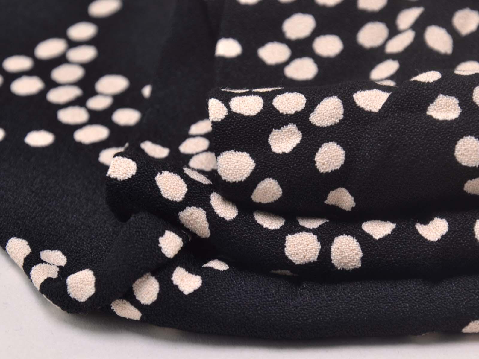 Sehr hochwertige Webware aus Viskose von Hilco. Der Crêpe-Stoff ist schwarz mit beigen Punkten. Die Viskose ist mittelschwer und hat einen eher fließenden Fall. Der Stoff eignet sich zum Nähen von Kleidern, Röcken und Tuniken.