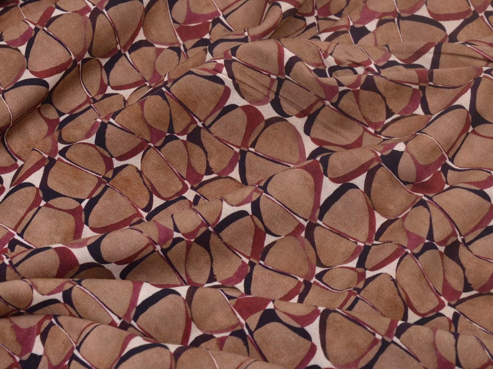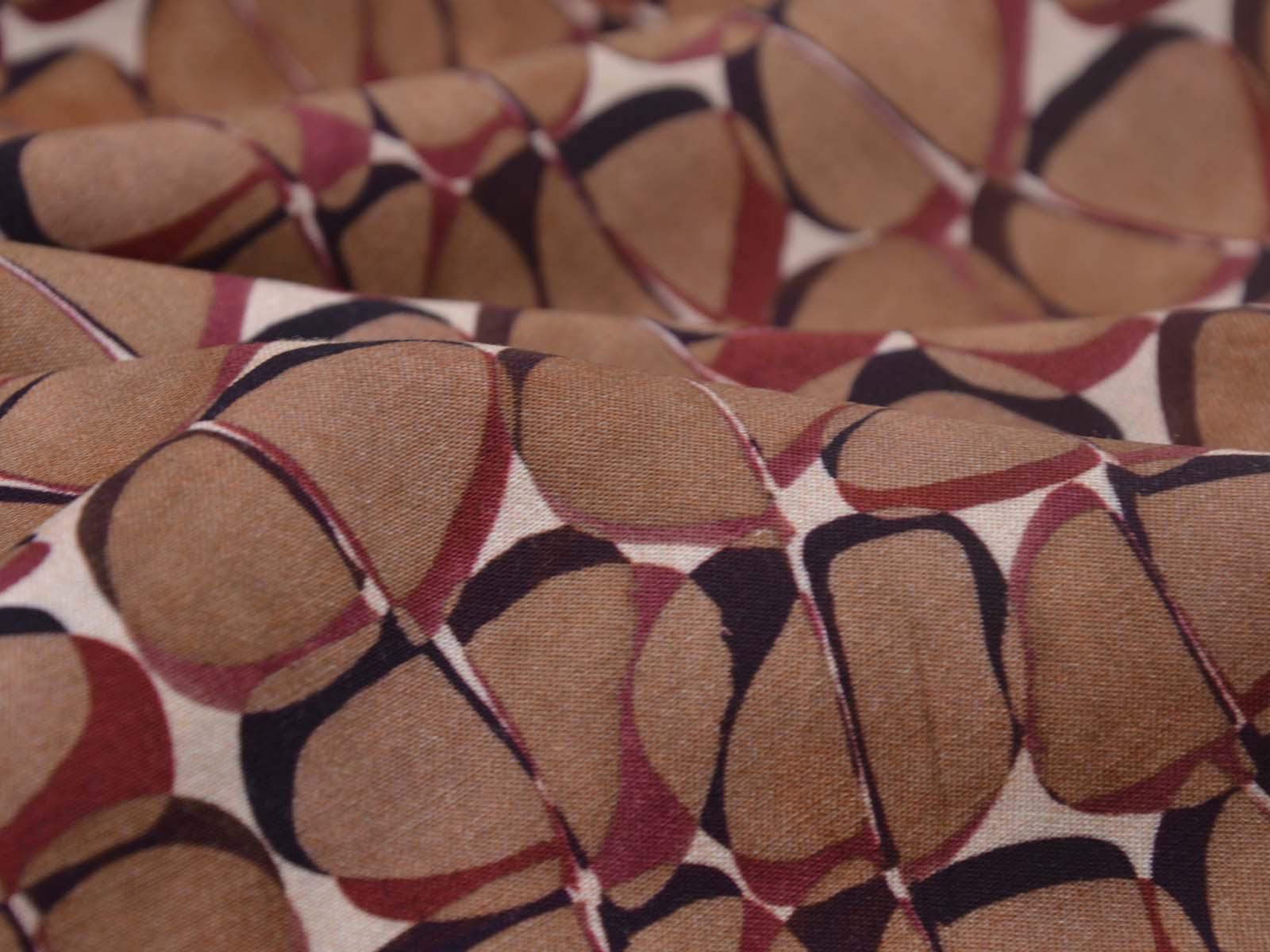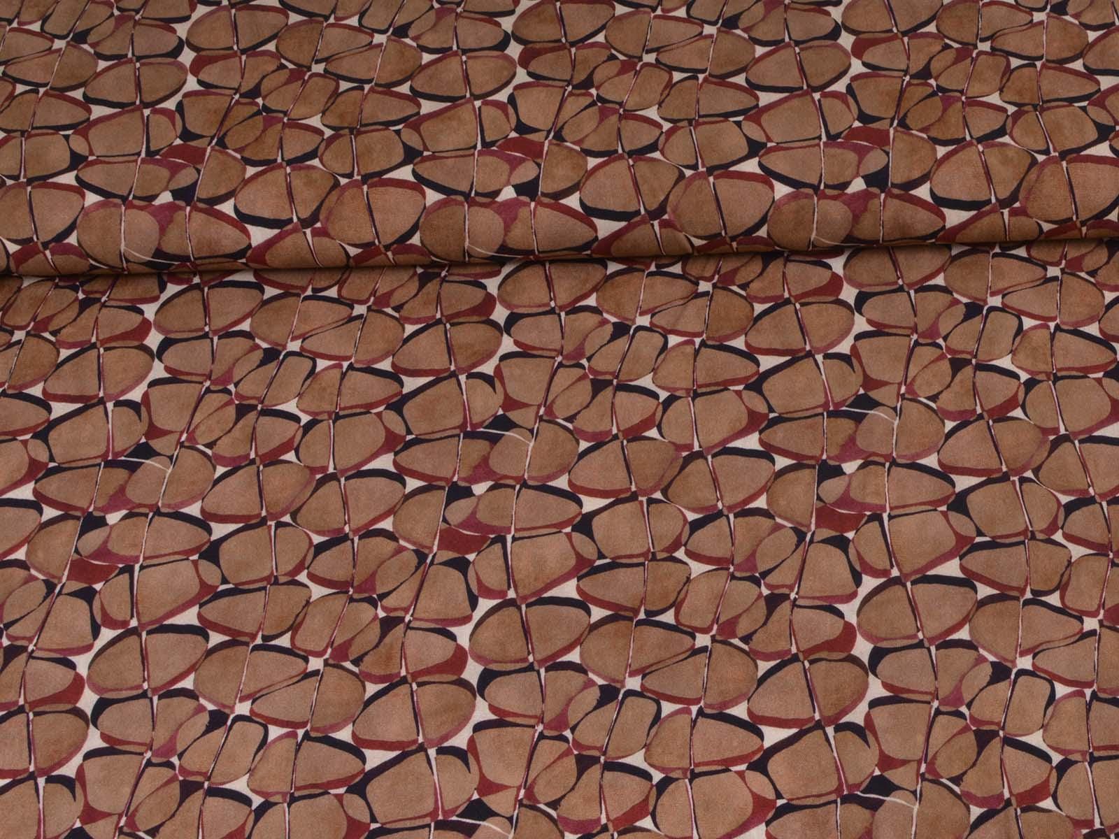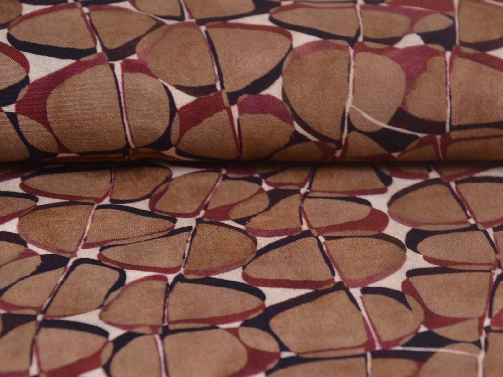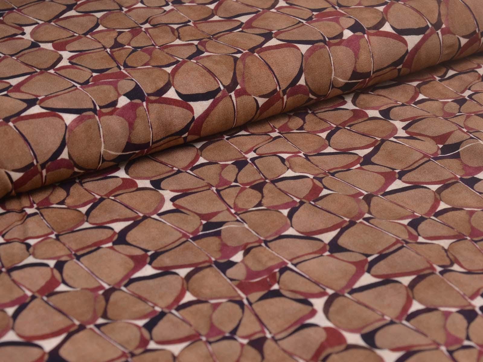 Hochwertige Webware aus Viskose mit Stretch. Der Stoff ist glatt, elastisch, braun gemustert und hat einen eher fließenden Fall. Nähe dir aus dem Stoff Blusen, Tuniken, Kleider und Röcke.