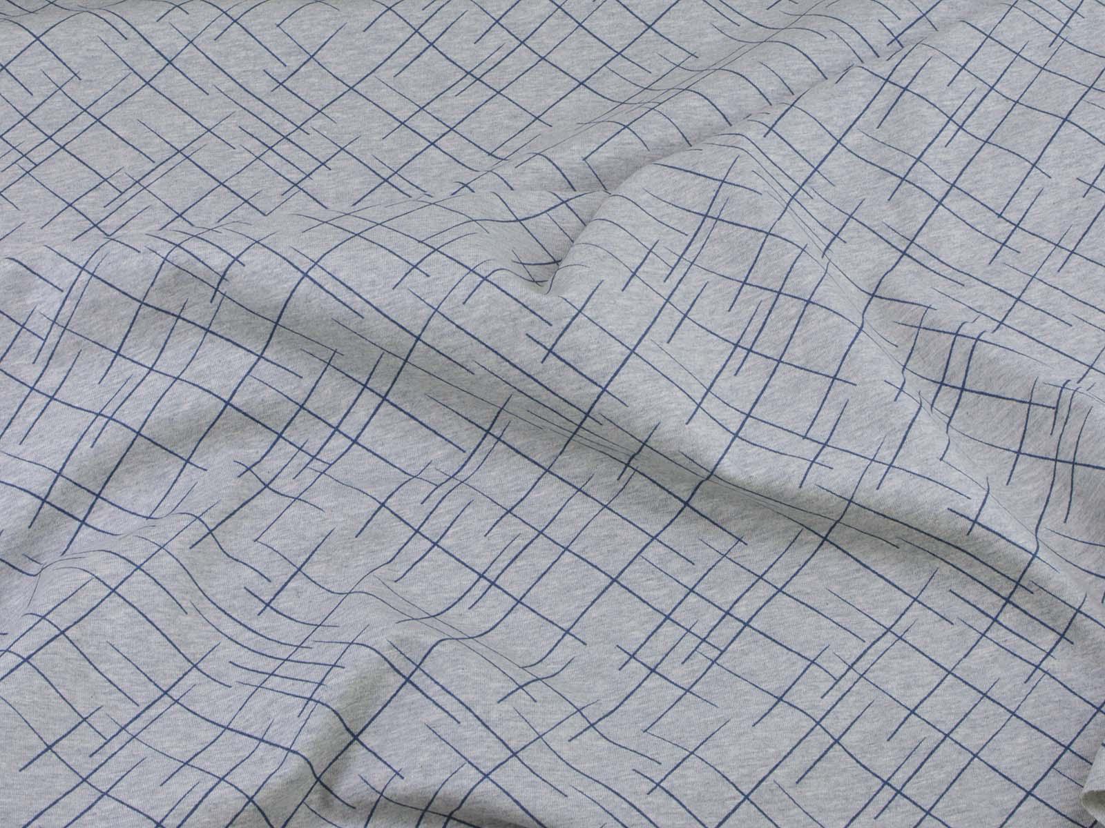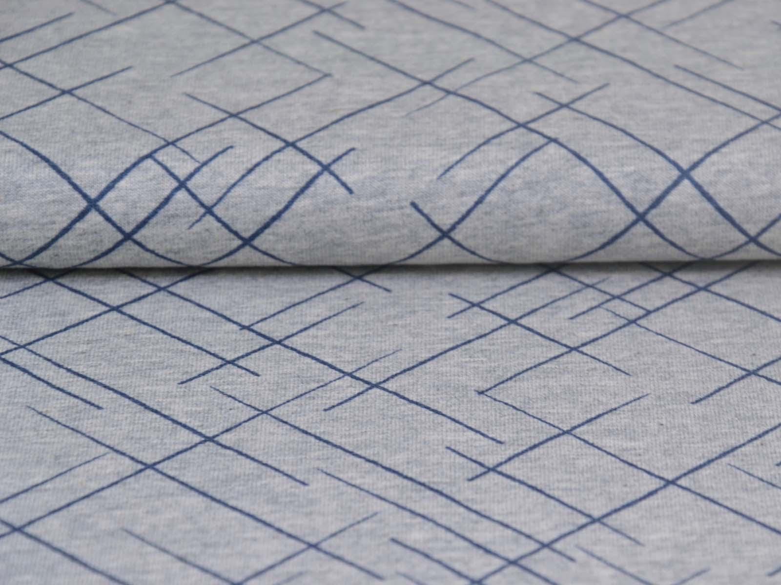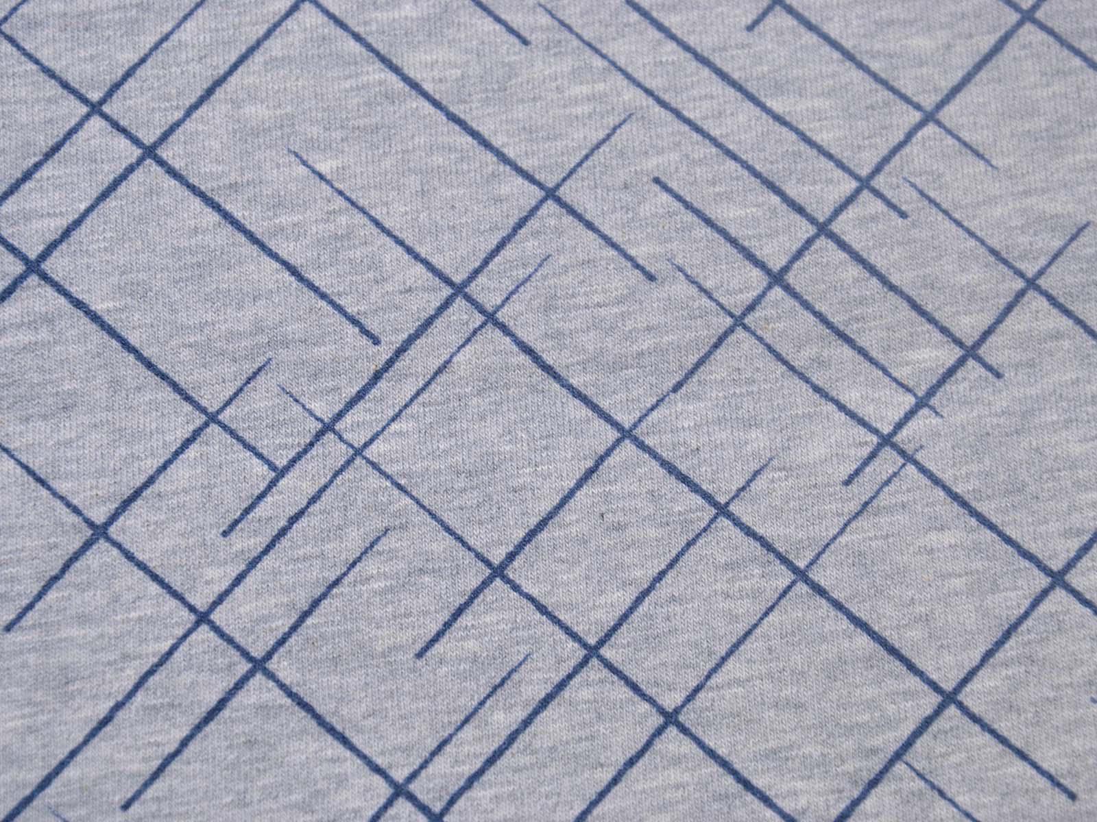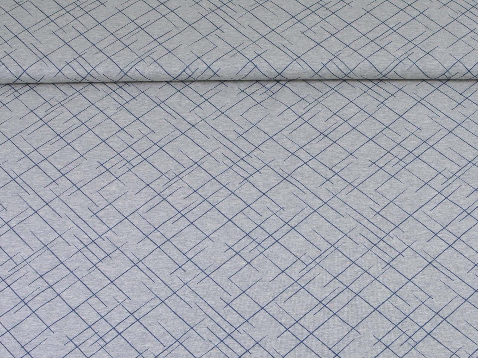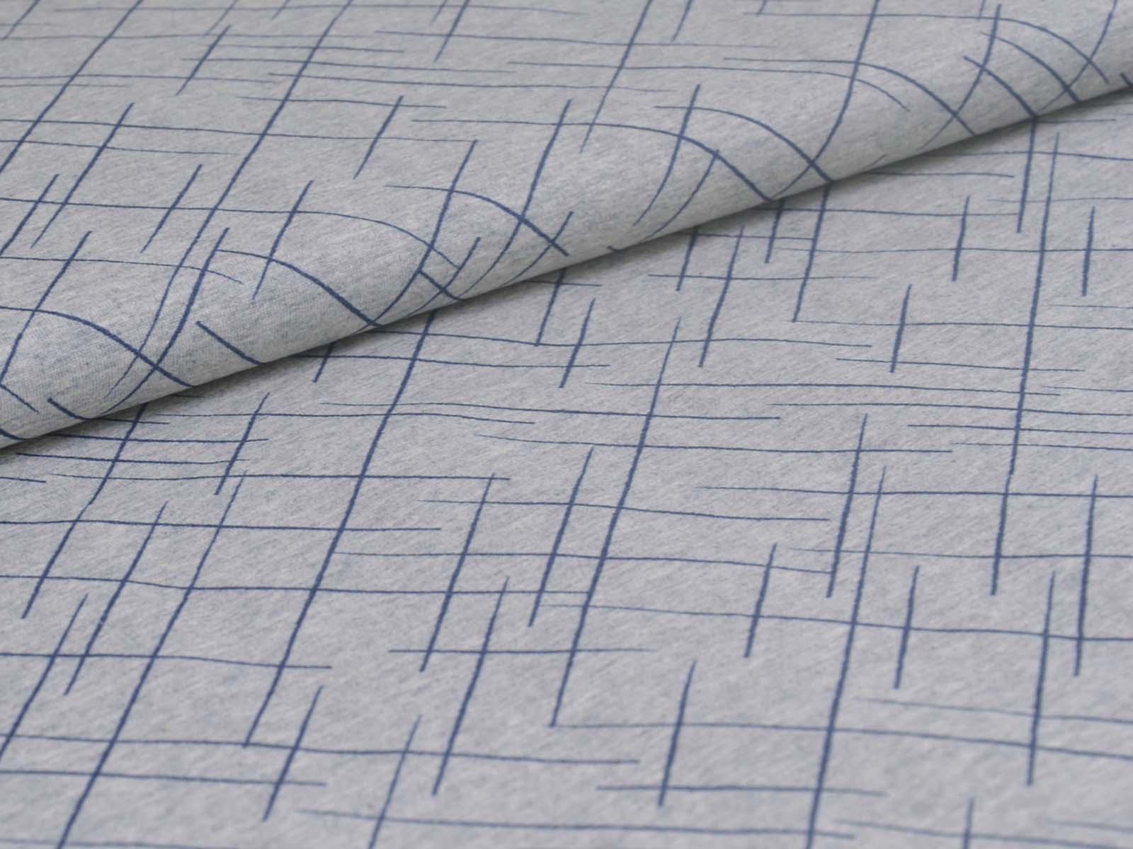 Grauer Baumwolljersey mit dunkelblauen dünnen gekreuzten Strichen. Der Stoff ist glatt und dünn. Er eignet sich wunderbar zum Nähen von T-Shirts, Shorts, Kleidern, Pumphosen und vielem mehr.